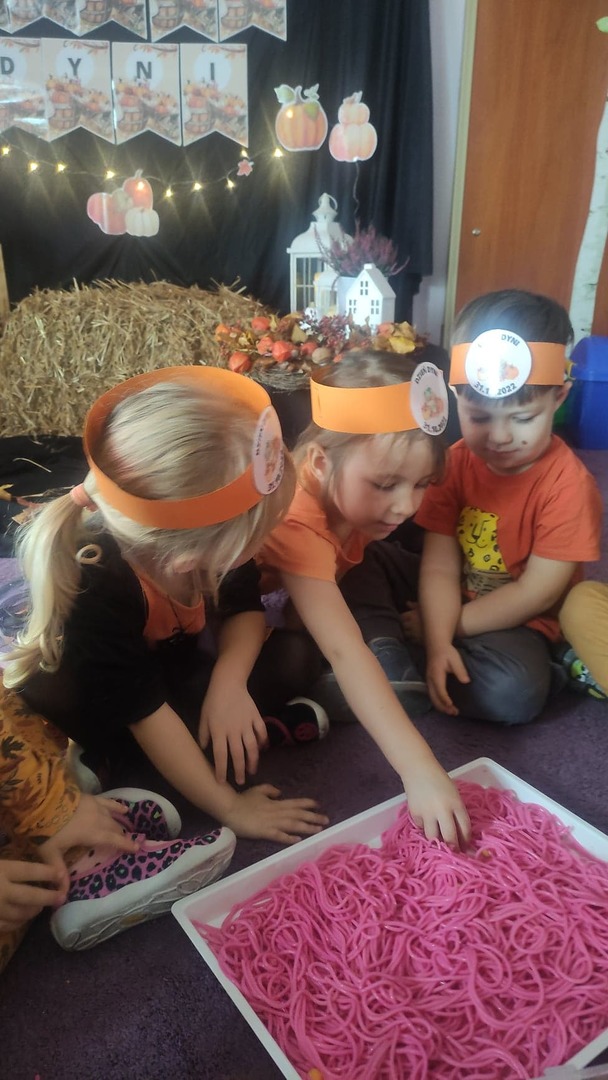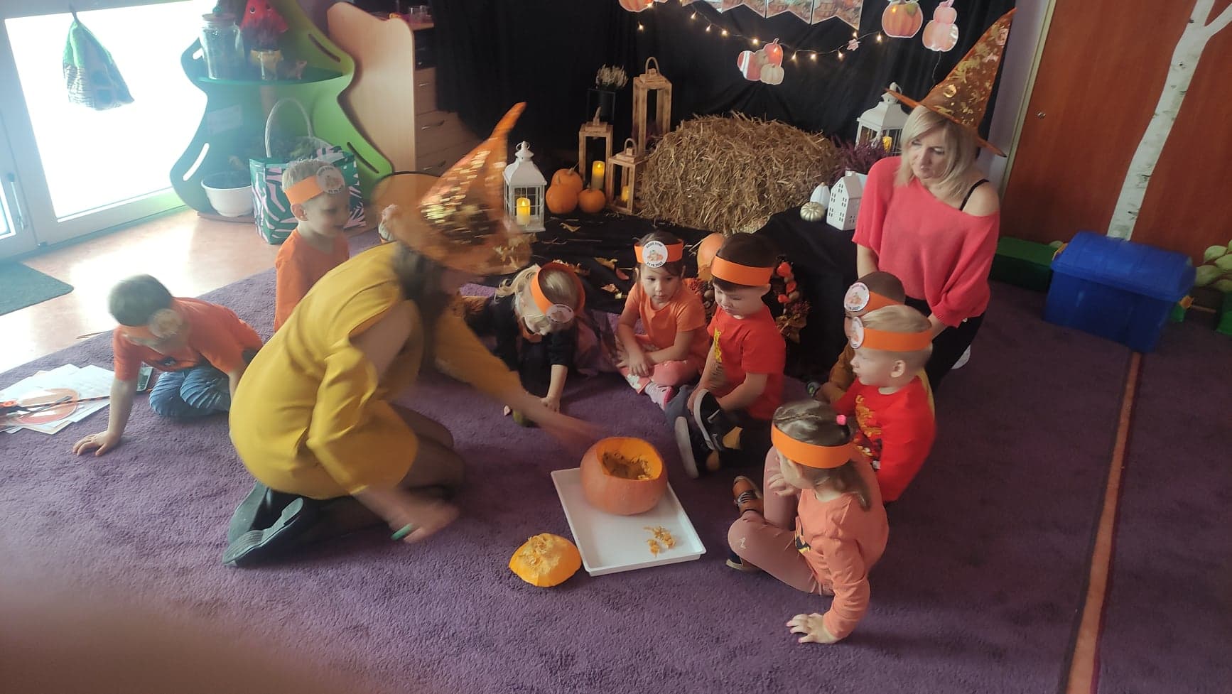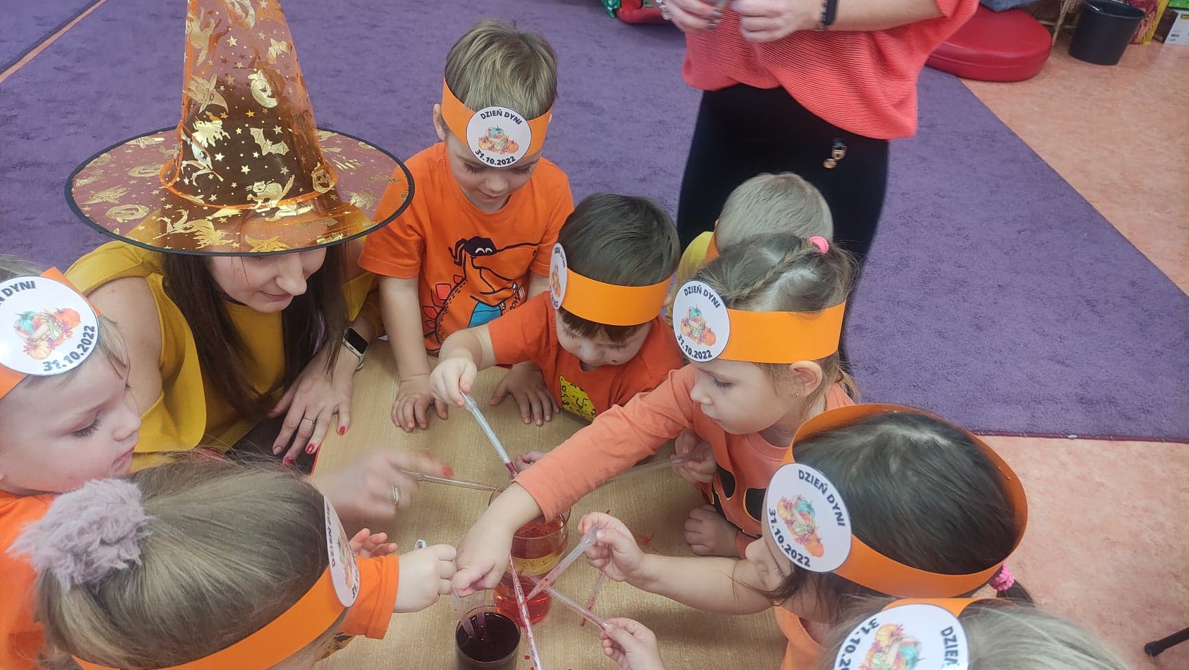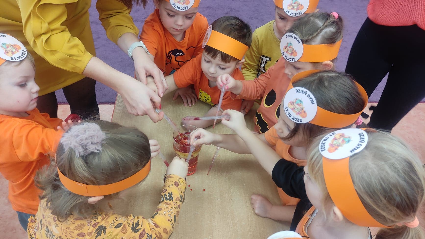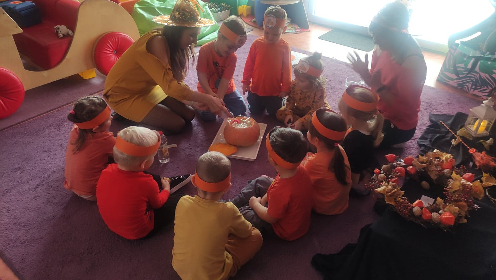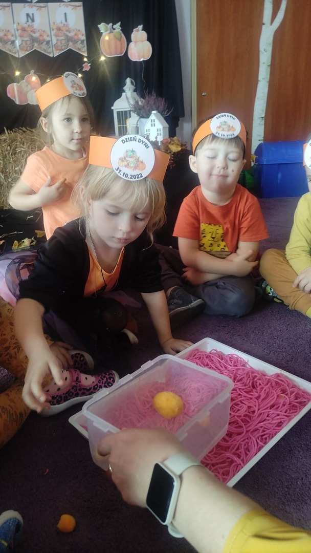 Dynia jest warzywem, które zachwyca swoim wyjątkowym wyglądem i smakiem, a przekonały się o tym Krasnale z naszego przedszkola uczestnicząc 31 października w Święcie Dyni. Tego dnia obowiązywał kolor pomarańczowy w ubiorze. Przedszkolaki mogły oglądać, dotykać różnej wielkości i różnego ubarwienia dynie. Poznały także jej cykl rozwoju:) Dowiedziały się, że dynia jest bardzo zdrowym warzywem i, że można z niej przygotować wiele dań tj.: pieczywo, zupę, dżem, ciasto. Dynia stała się również popularna jako ozdoba przed wejściem do domu. Przedszkolaki odkryły, co ukrywa się w środku dyni i wspólnie z paniami wyciągały pestki. Ponadto panie przygotowały eksperymenty tj. wybuchowa dynia, lampa lawa oraz zabawy sensoryczne z zabarwionym makaronem. Ogromną atrakcją była również ścianka do zdjęć, z dynią w rolu głównej oczywiście. Ten dzień był przepełniony zajęciami plastycznymi, zabawami i tańcami. A zwieńczeniem były pyszne placuszki dyniowe, które przygotowały panie na kucharki na obiad.