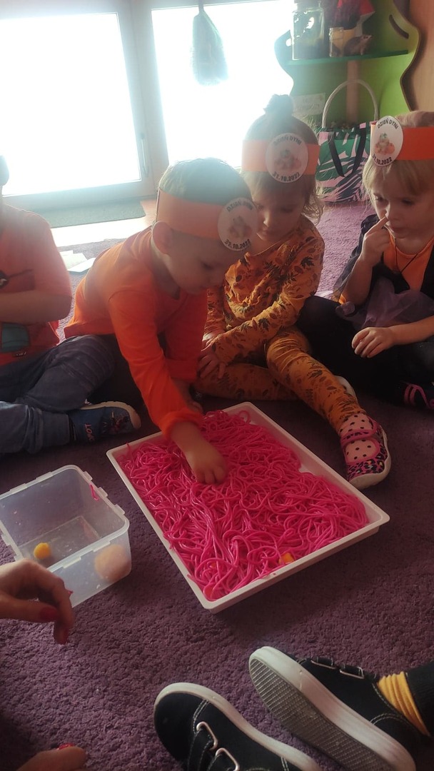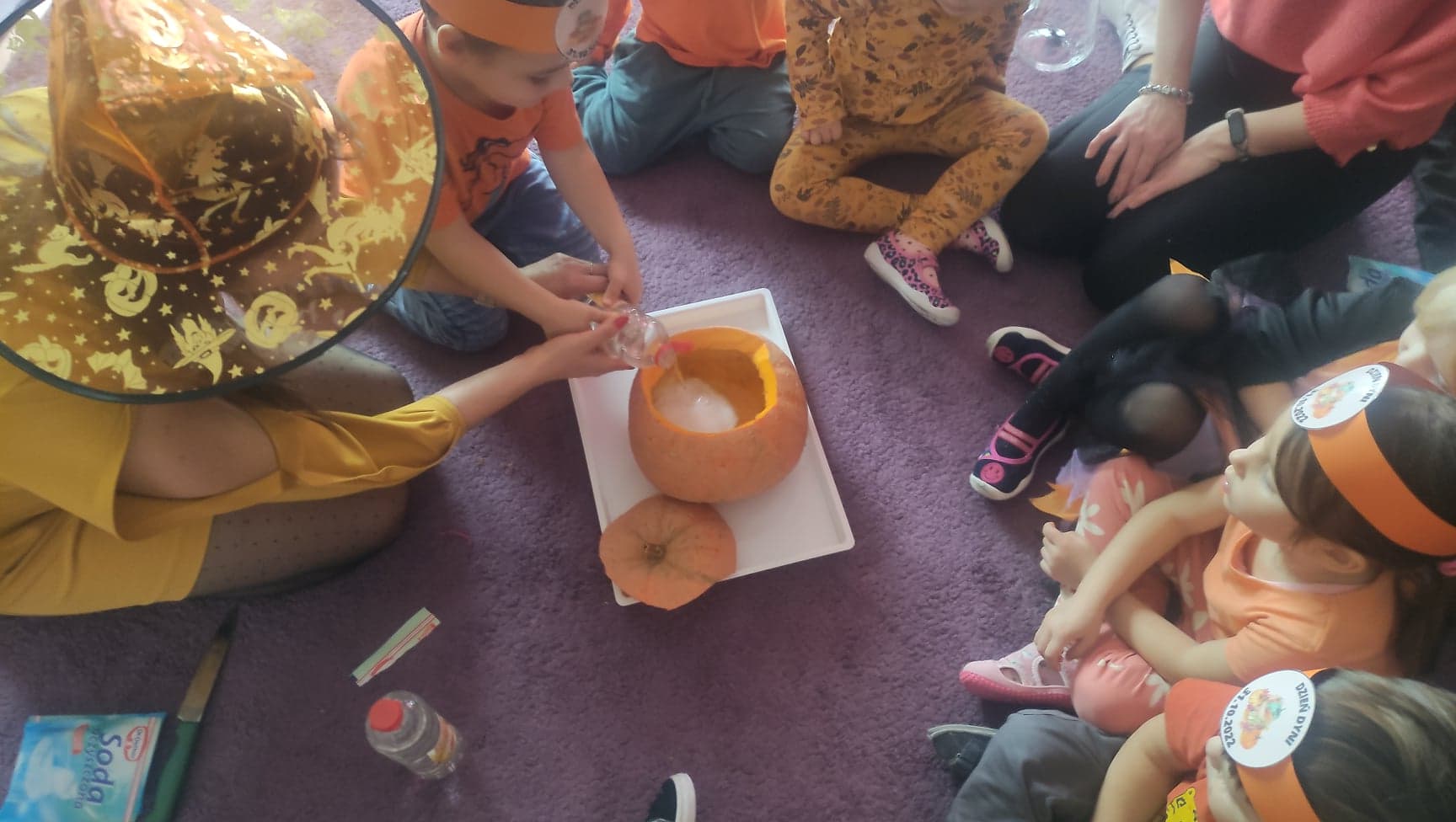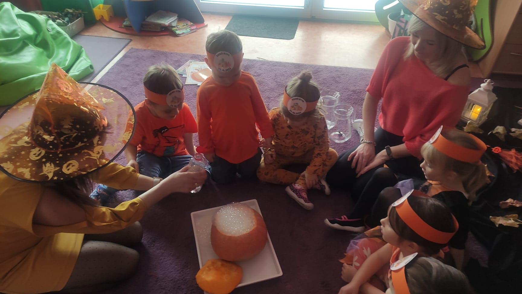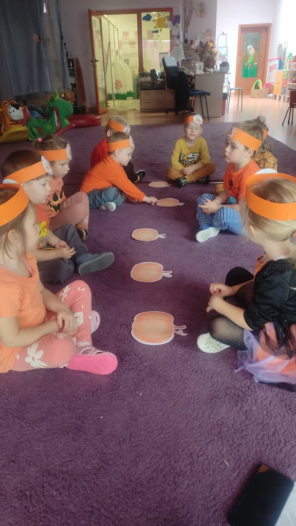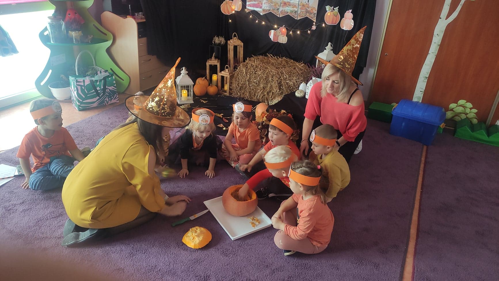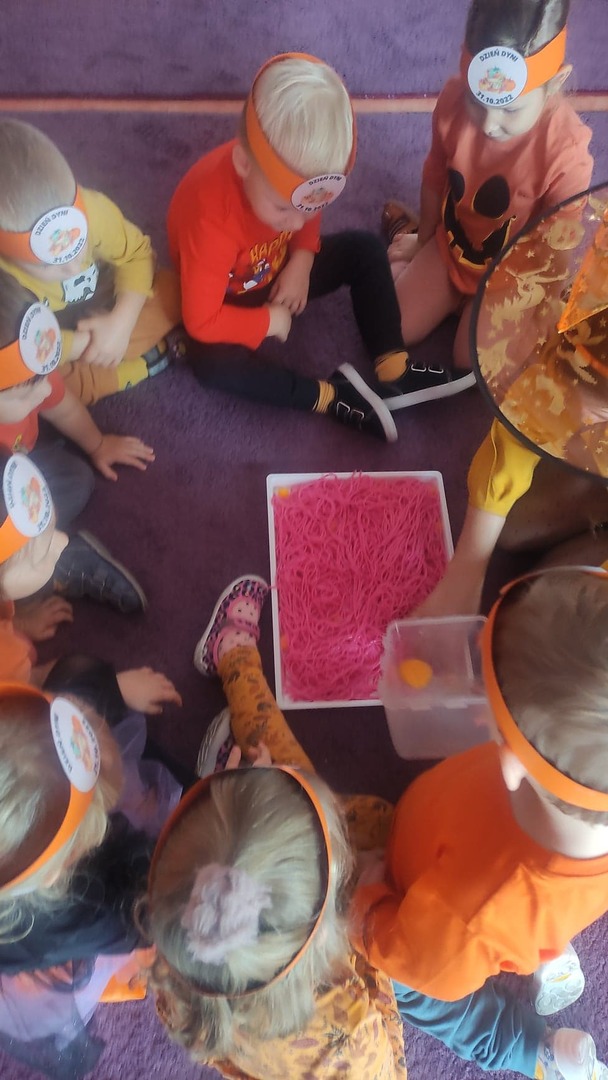 Dynia jest warzywem, które zachwyca swoim wyjątkowym wyglądem i smakiem, a przekonały się o tym Krasnale z naszego przedszkola uczestnicząc 31 października w Święcie Dyni. Tego dnia obowiązywał kolor pomarańczowy w ubiorze. Przedszkolaki mogły oglądać, dotykać różnej wielkości i różnego ubarwienia dynie. Poznały także jej cykl rozwoju:) Dowiedziały się, że dynia jest bardzo zdrowym warzywem i, że można z niej przygotować wiele dań tj.: pieczywo, zupę, dżem, ciasto. Dynia stała się również popularna jako ozdoba przed wejściem do domu. Przedszkolaki odkryły, co ukrywa się w środku dyni i wspólnie z paniami wyciągały pestki. Ponadto panie przygotowały eksperymenty tj. wybuchowa dynia, lampa lawa oraz zabawy sensoryczne z zabarwionym makaronem. Ogromną atrakcją była również ścianka do zdjęć, z dynią w rolu głównej oczywiście. Ten dzień był przepełniony zajęciami plastycznymi, zabawami i tańcami. A zwieńczeniem były pyszne placuszki dyniowe, które przygotowały panie na kucharki na obiad.