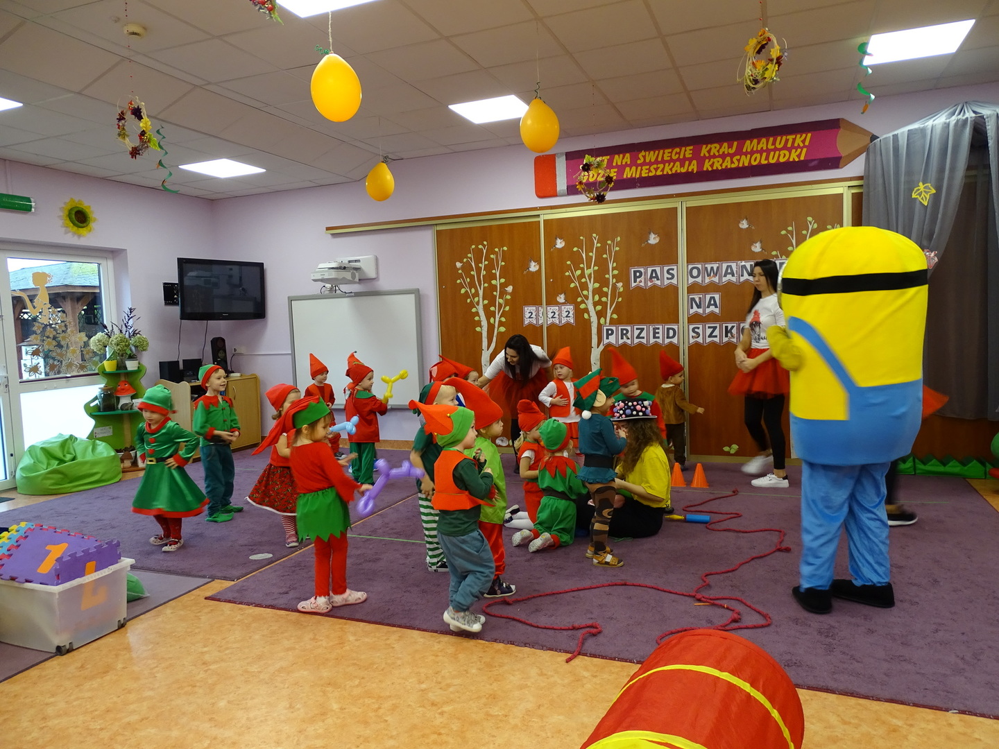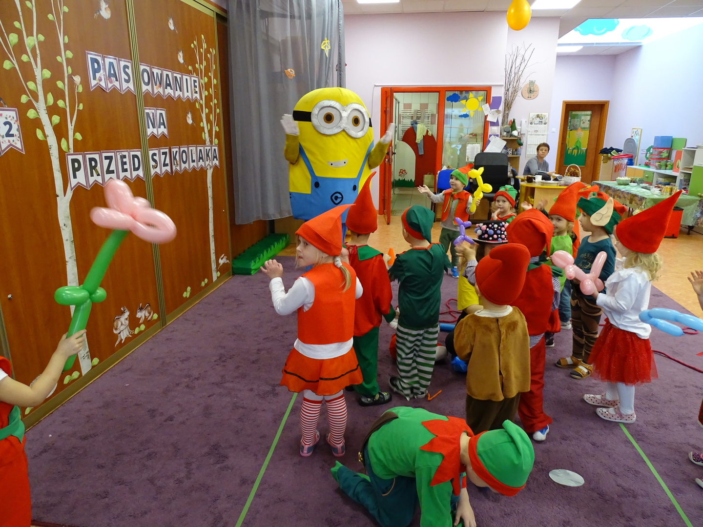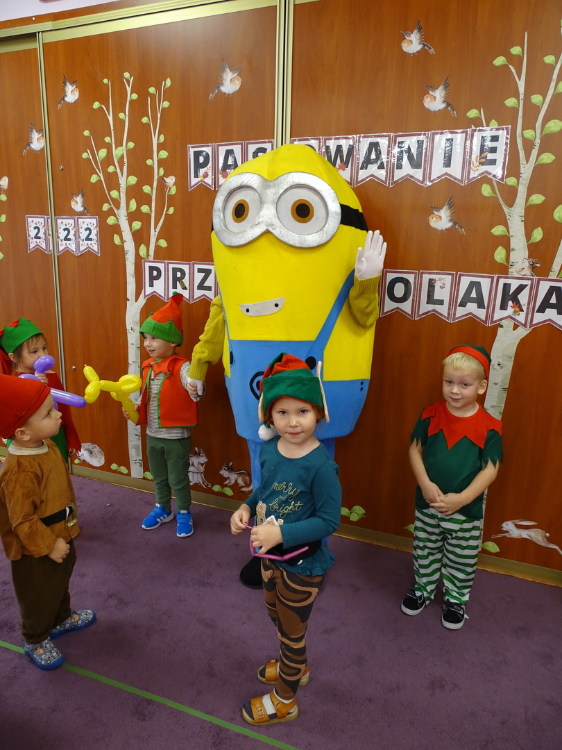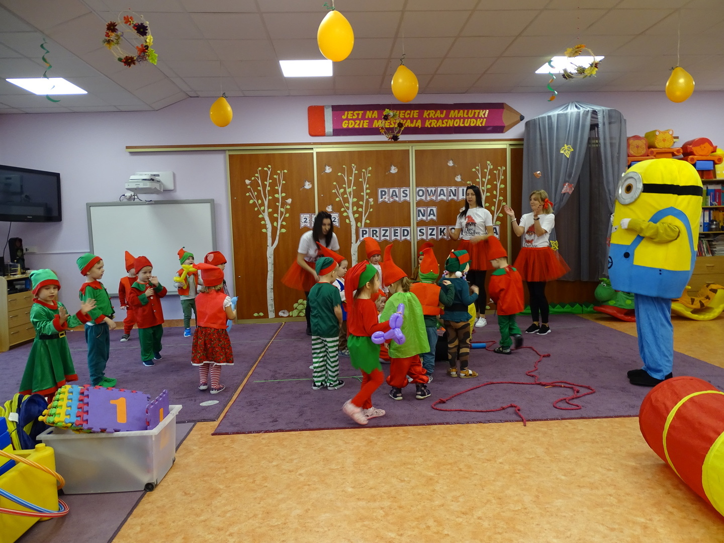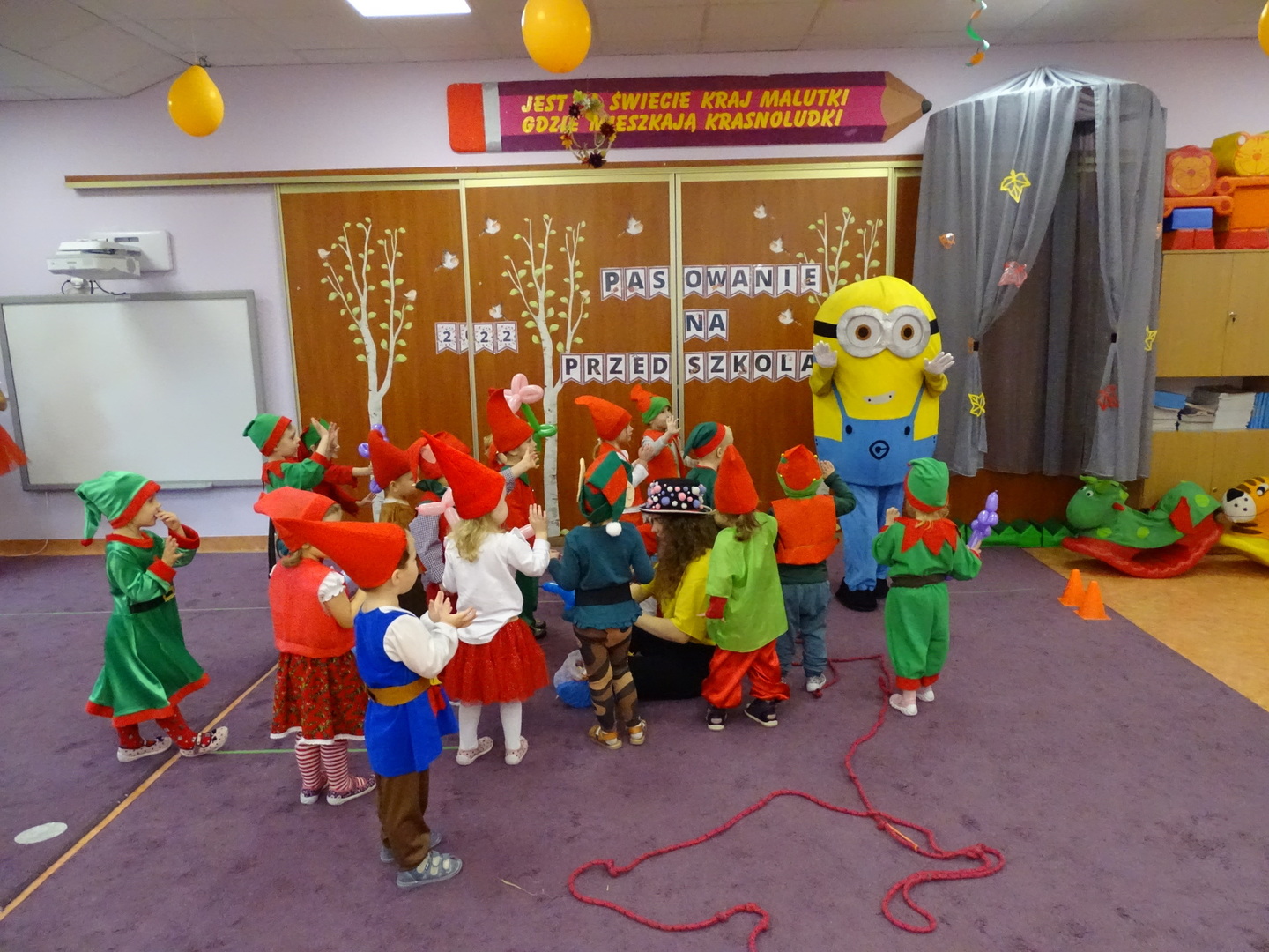 „Pasowanie na przedszkolaka” to pierwsza i jakże wyjątkowa uroczystość w życiu każdego dziecka, które po raz pierwszy rozpoczyna swoją przygodę z edukacją. 16 listopada dzieci z grupy Krasnale oficjalnie zostali przyjęci do grona przedszkolaków. Dla najmłodszych było to ogromne przeżycie, ale dzieci trzymały się bardzo dzielnie. Z uśmiechami na twarzach recytowały wierszyki, śpiewały piosenki, tańczyły. Po części artystycznej, dzieci złożyły ślubowanie, w którym obiecały: zgodnie bawić się w przedszkolu, przychodzić każdego dnia z uśmiechem, słuchać Pani, pomagać kolegom, być dzielnym przedszkolakiem. Następnie Pani Dyrektor za pomocą „czarodziejskiego ołówka” dokonała uroczystego „Aktu pasowania”. Nie zabrakło dyplomów i prezentów dla każdego przedszkolaka. Tuż po pasowaniu, dzieci wesoło bawiły się razem z Animatorkami. Ponadto naszych Krasnali odwiedził bohater bajkowy- Minionek, który ruszył do wspólnej zabawy. Na pewno był to niezapomniany dzień, pełen emocji i miłych wrażeń. Dziękujemy rodzicom za pomoc w przygotowaniu tej pierwszej uroczystości w naszej grupie😃😃