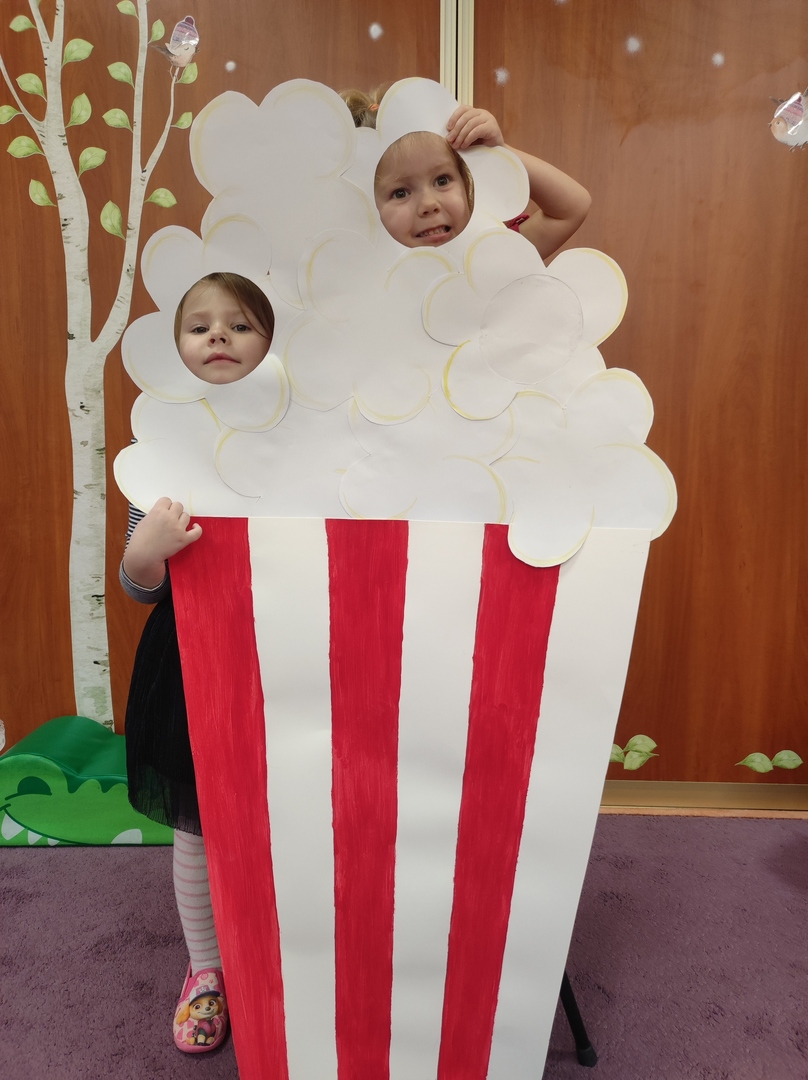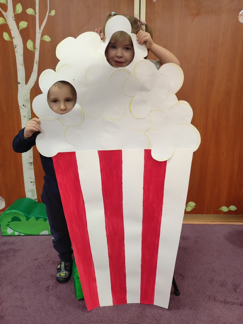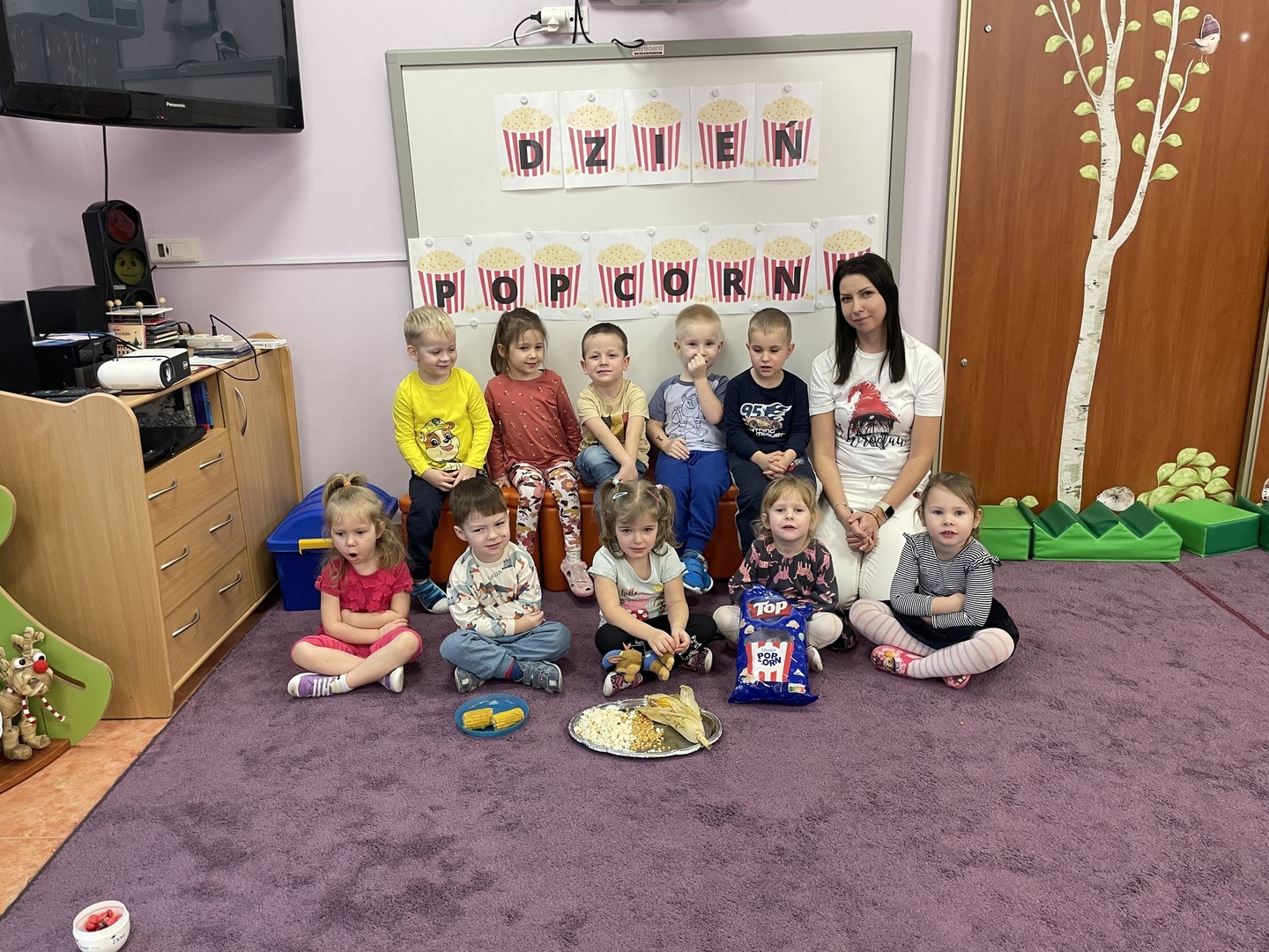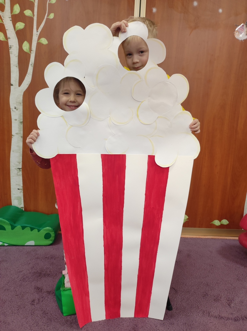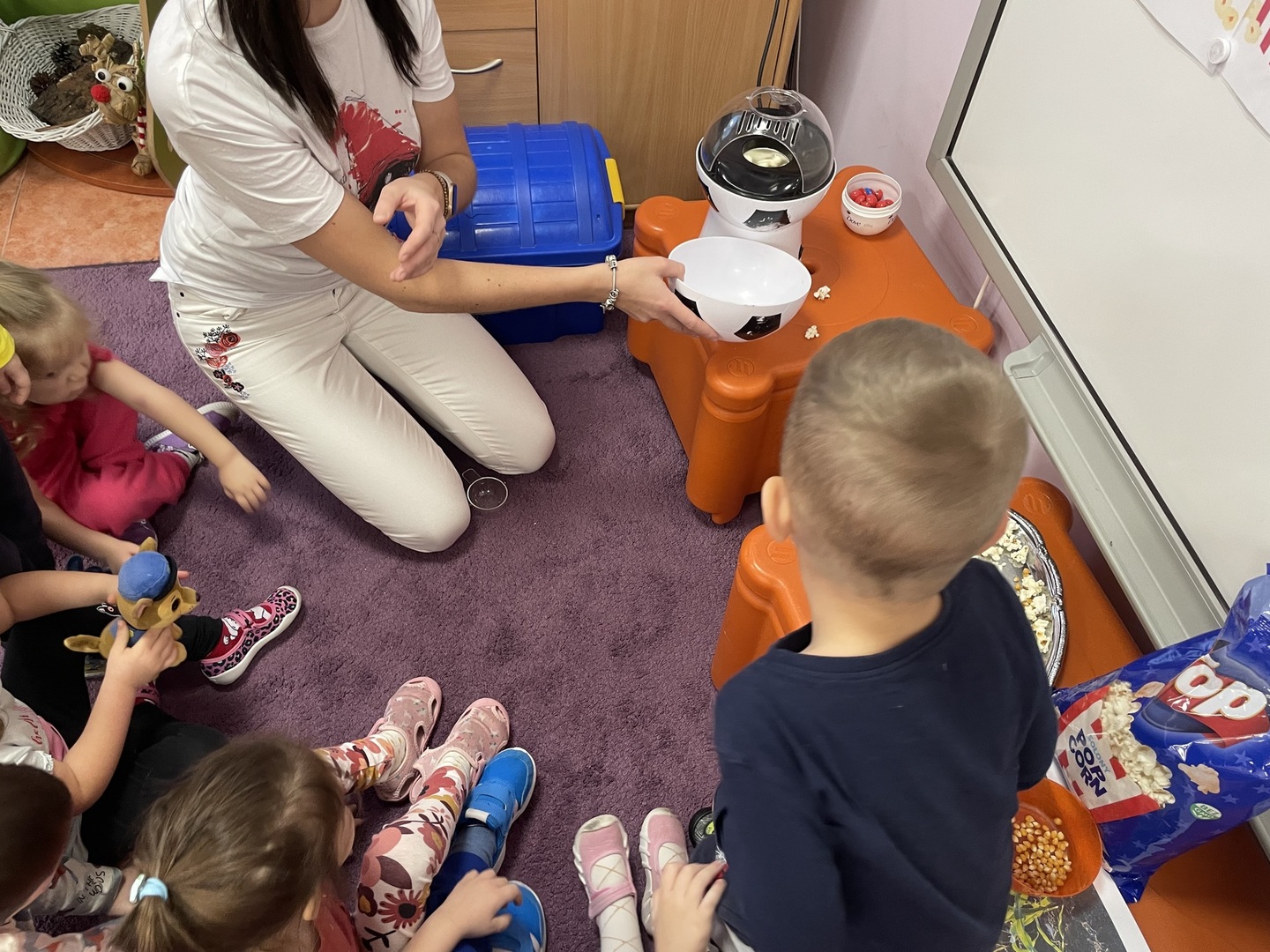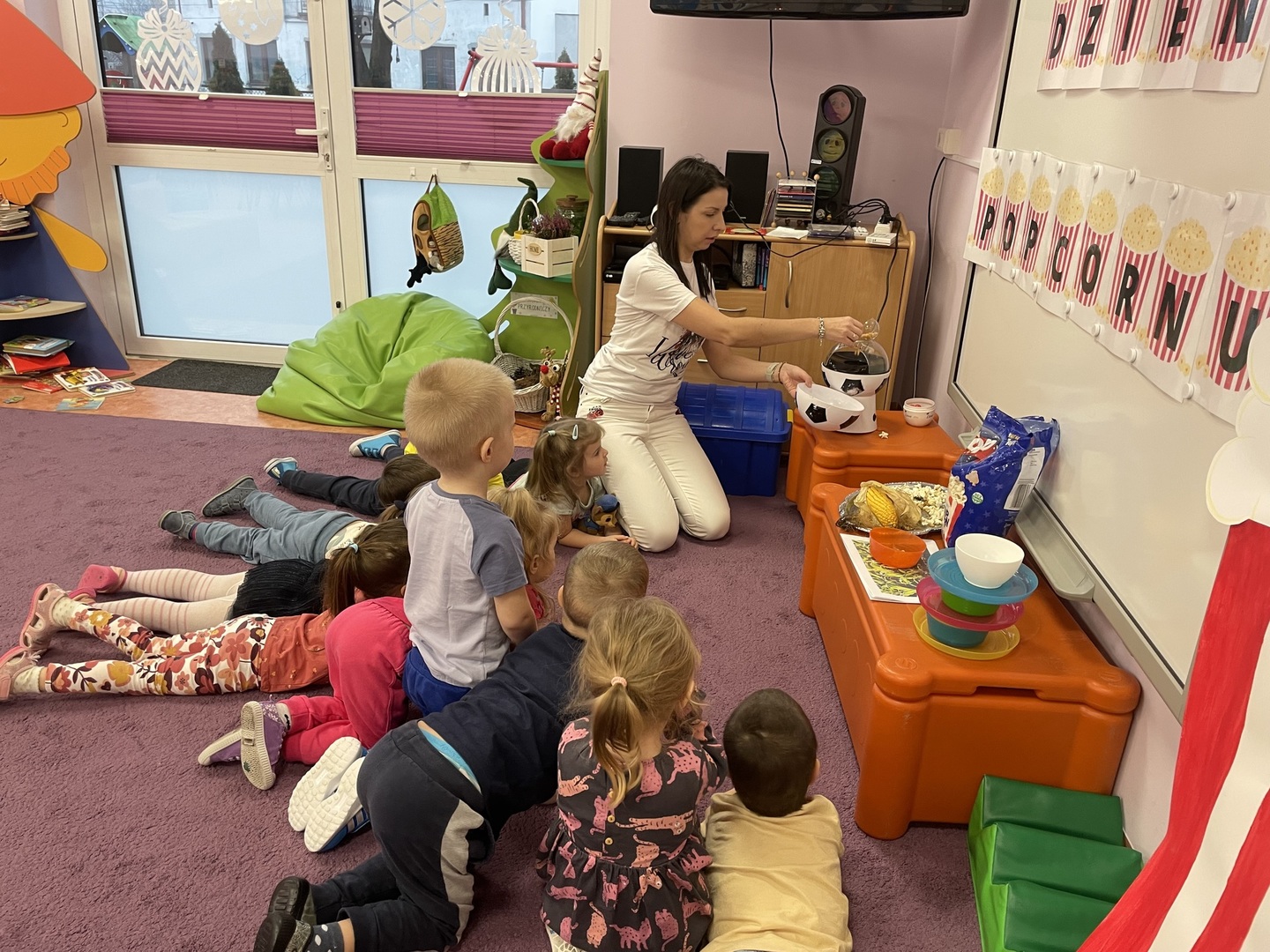 19 stycznia w grupie „Krasnoludki” odbył się Dzień Popcornu. Przedszkolaki dowiedziały się jak powstaje ten przysmak. Mogły na własne oczy zobaczyć, dotknąć ziarna oraz kolbę kukurydzy, a także posmakować gotowaną kukurydzę. Obejrzały również krótki film na ten temat tego jak powstaje popcorn oraz zrobiły go samodzielnie w specjalnej maszynie do popcornu. Świetnie również dały sobie radę z segregowaniem ziarenek kukurydzy i popcornu. Jednak największą atrakcją była wycieczka do kina. Każdy dzielny przedszkolak mógł samodzielnie kupić bilet na seans pt. "Nowe przygody Kubusia Puchatka", popcorn oraz soczek. Było fantastycznie! Na koniec każdy wykonał pamiątkowe zdjęcie w "popcornowej fotobudce".