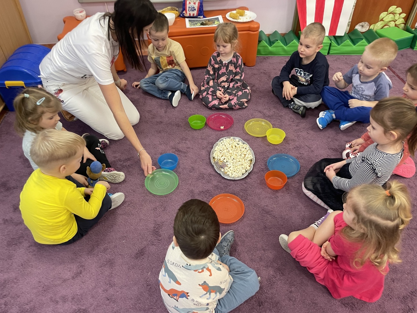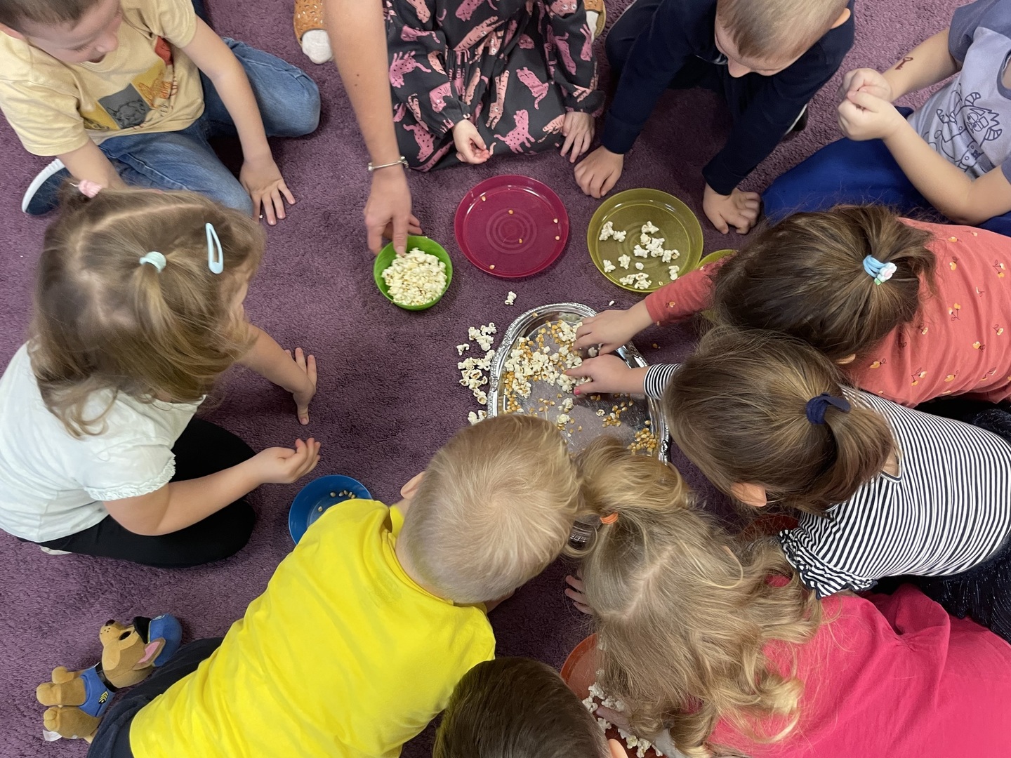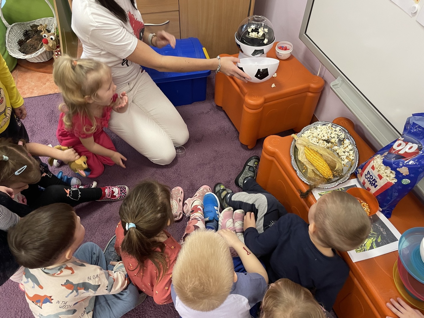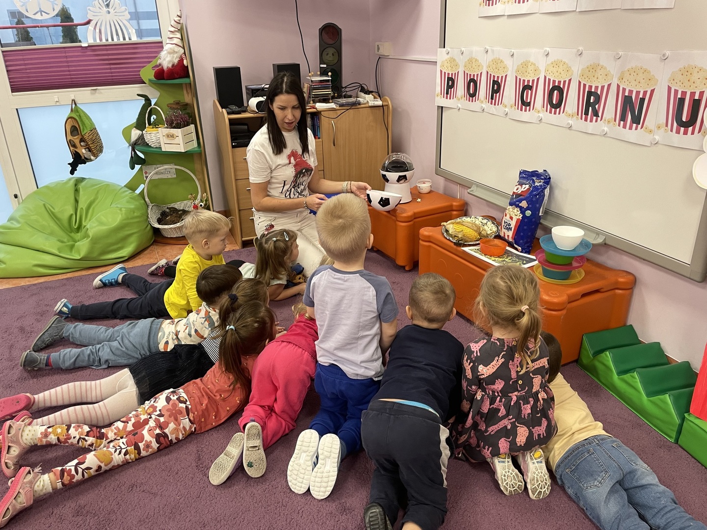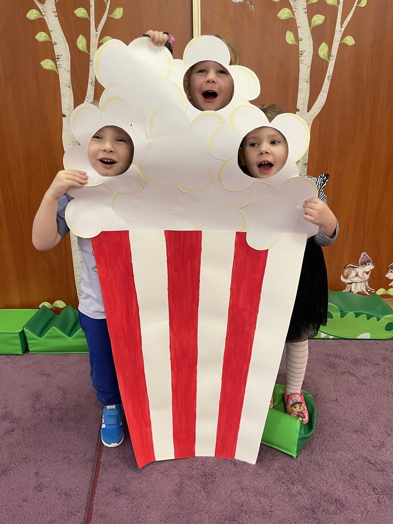 19 stycznia w grupie „Krasnoludki” odbył się Dzień Popcornu. Przedszkolaki dowiedziały się jak powstaje ten przysmak. Mogły na własne oczy zobaczyć, dotknąć ziarna oraz kolbę kukurydzy, a także posmakować gotowaną kukurydzę. Obejrzały również krótki film na ten temat tego jak powstaje popcorn oraz zrobiły go samodzielnie w specjalnej maszynie do popcornu. Świetnie również dały sobie radę z segregowaniem ziarenek kukurydzy i popcornu. Jednak największą atrakcją była wycieczka do kina. Każdy dzielny przedszkolak mógł samodzielnie kupić bilet na seans pt. "Nowe przygody Kubusia Puchatka", popcorn oraz soczek. Było fantastycznie! Na koniec każdy wykonał pamiątkowe zdjęcie w "popcornowej fotobudce".
