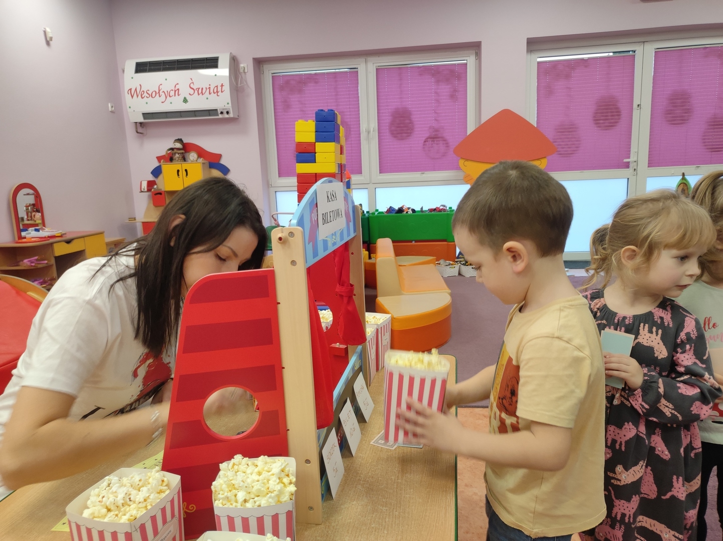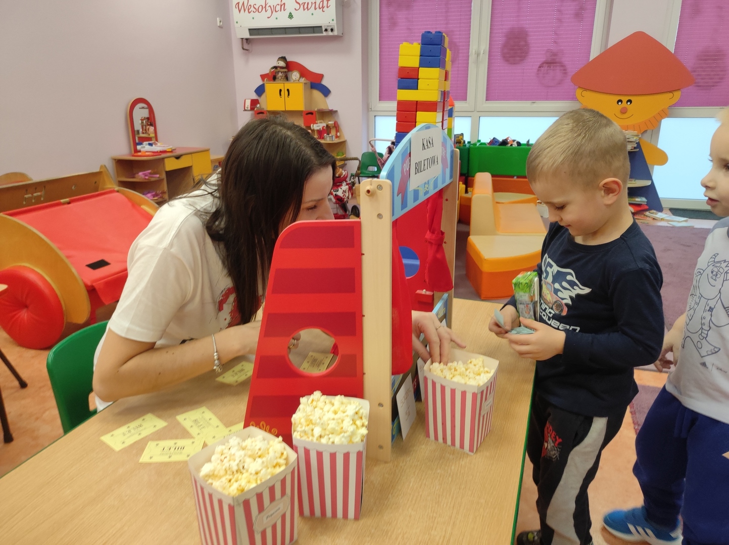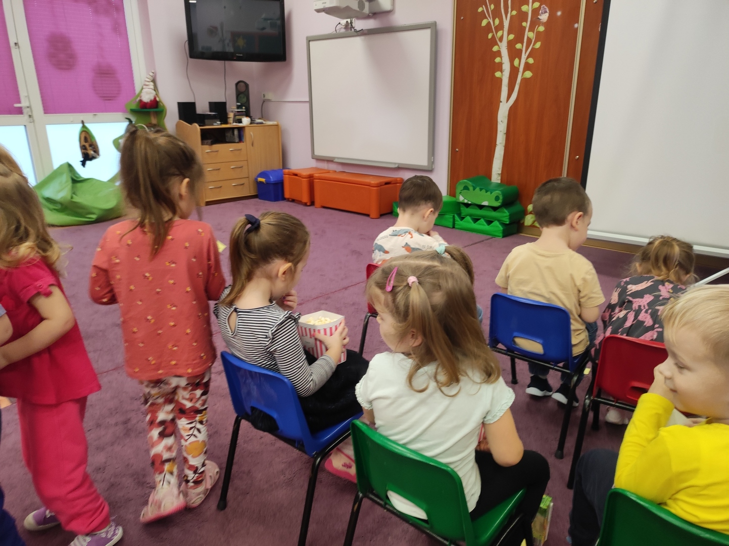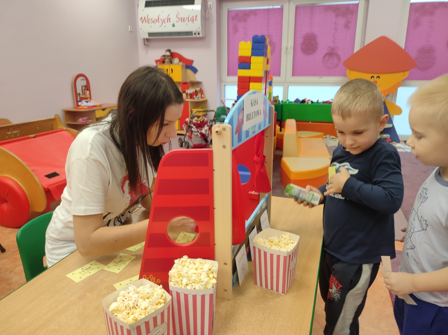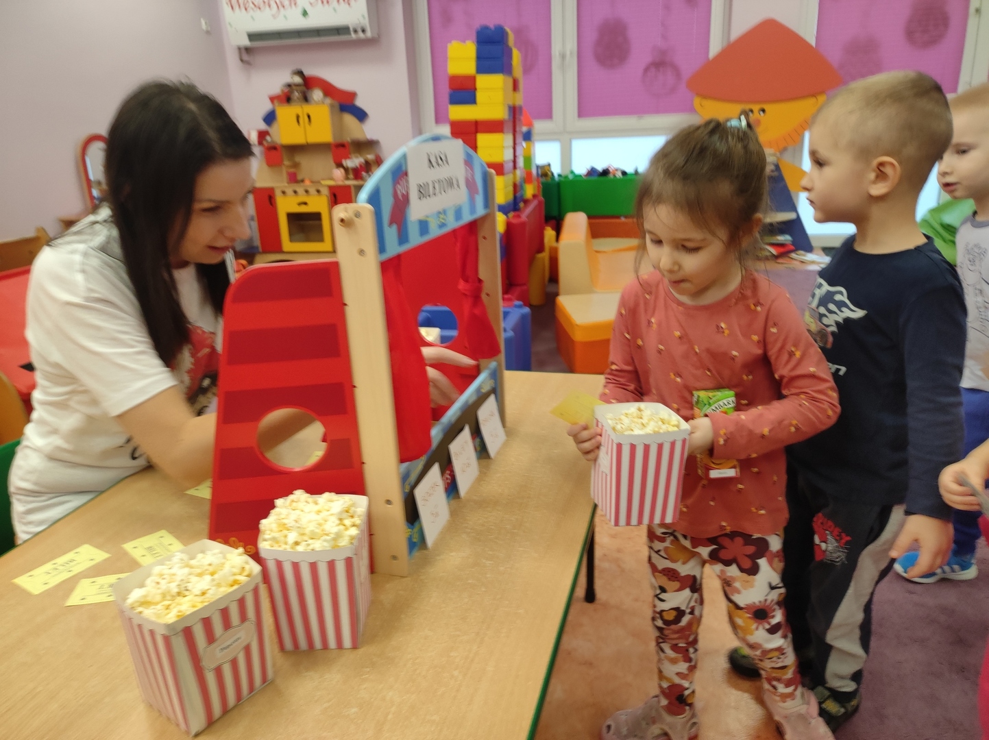19 stycznia w grupie „Krasnoludki” odbył się Dzień Popcornu. Przedszkolaki dowiedziały się jak powstaje ten przysmak. Mogły na własne oczy zobaczyć, dotknąć ziarna oraz kolbę kukurydzy, a także posmakować gotowaną kukurydzę. Obejrzały również krótki film na ten temat tego jak powstaje popcorn oraz zrobiły go samodzielnie w specjalnej maszynie do popcornu. Świetnie również dały sobie radę z segregowaniem ziarenek kukurydzy i popcornu. Jednak największą atrakcją była wycieczka do kina. Każdy dzielny przedszkolak mógł samodzielnie kupić bilet na seans pt. "Nowe przygody Kubusia Puchatka", popcorn oraz soczek. Było fantastycznie! Na koniec każdy wykonał pamiątkowe zdjęcie w "popcornowej fotobudce".
