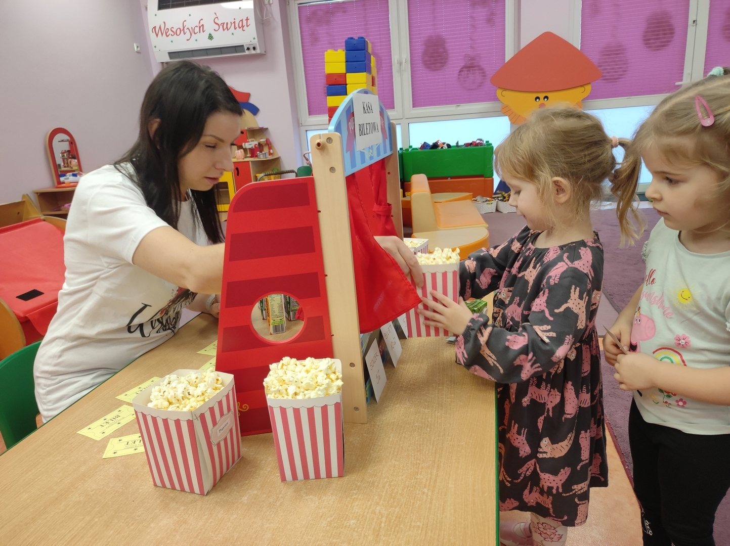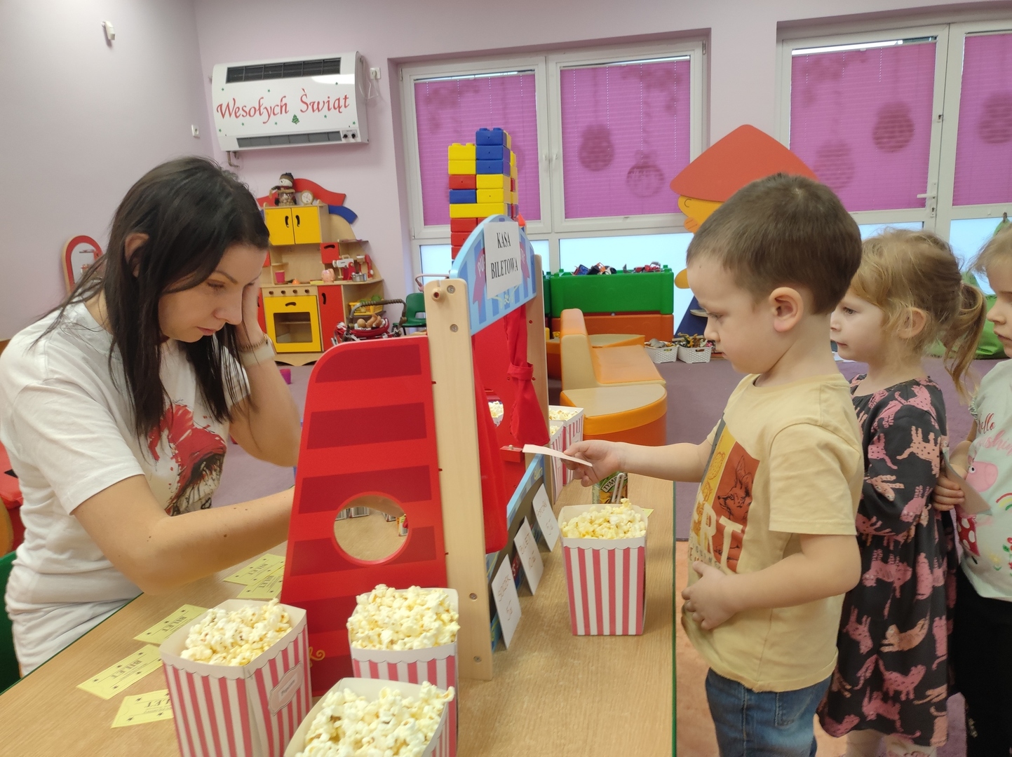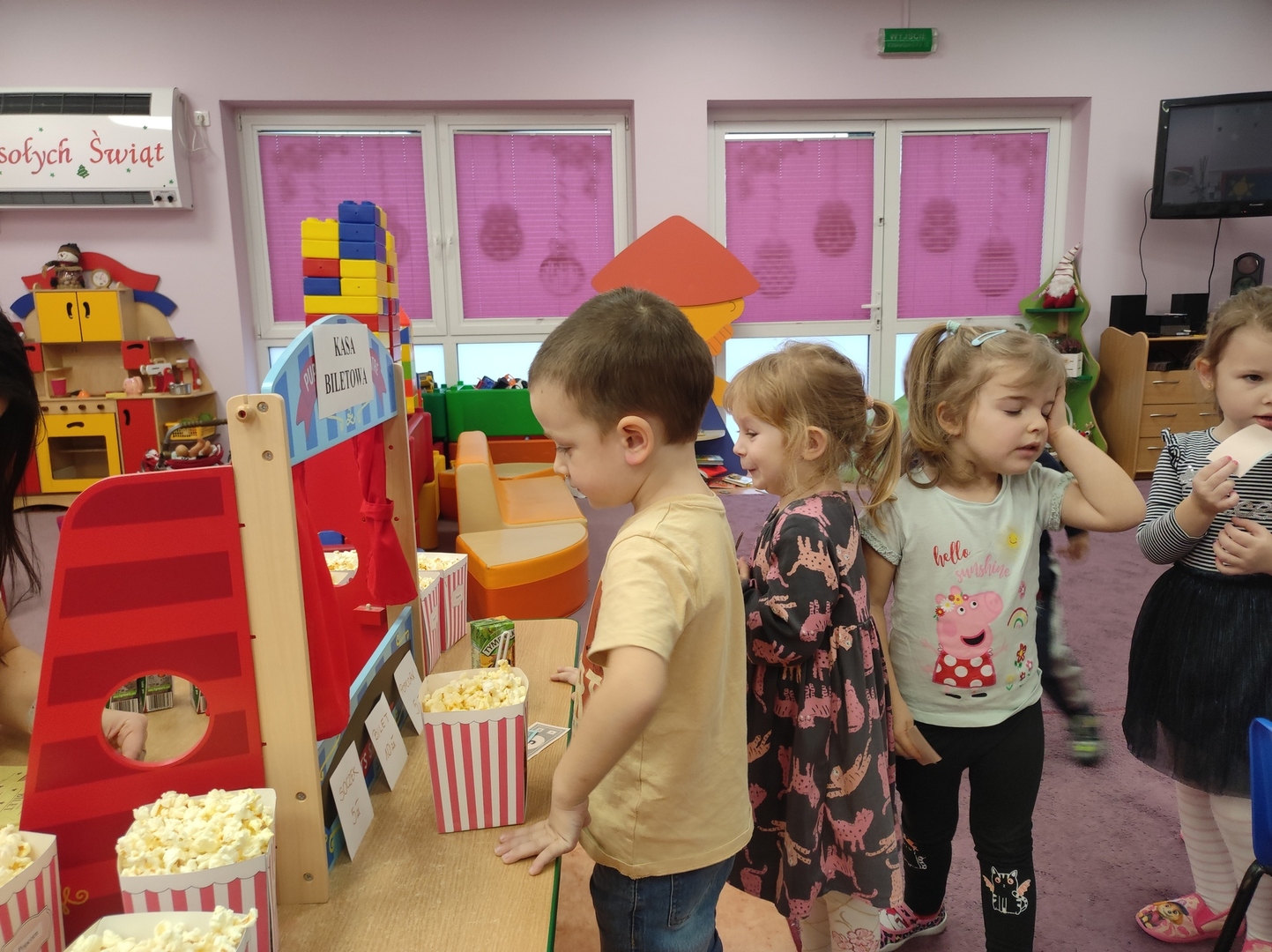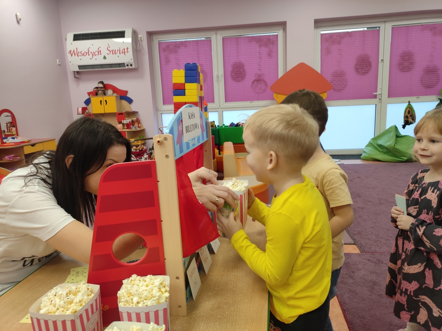 19 stycznia w grupie „Krasnoludki” odbył się Dzień Popcornu. Przedszkolaki dowiedziały się jak powstaje ten przysmak. Mogły na własne oczy zobaczyć, dotknąć ziarna oraz kolbę kukurydzy, a także posmakować gotowaną kukurydzę. Obejrzały również krótki film na ten temat tego jak powstaje popcorn oraz zrobiły go samodzielnie w specjalnej maszynie do popcornu. Świetnie również dały sobie radę z segregowaniem ziarenek kukurydzy i popcornu. Jednak największą atrakcją była wycieczka do kina. Każdy dzielny przedszkolak mógł samodzielnie kupić bilet na seans pt. "Nowe przygody Kubusia Puchatka", popcorn oraz soczek. Było fantastycznie! Na koniec każdy wykonał pamiątkowe zdjęcie w "popcornowej fotobudce".
