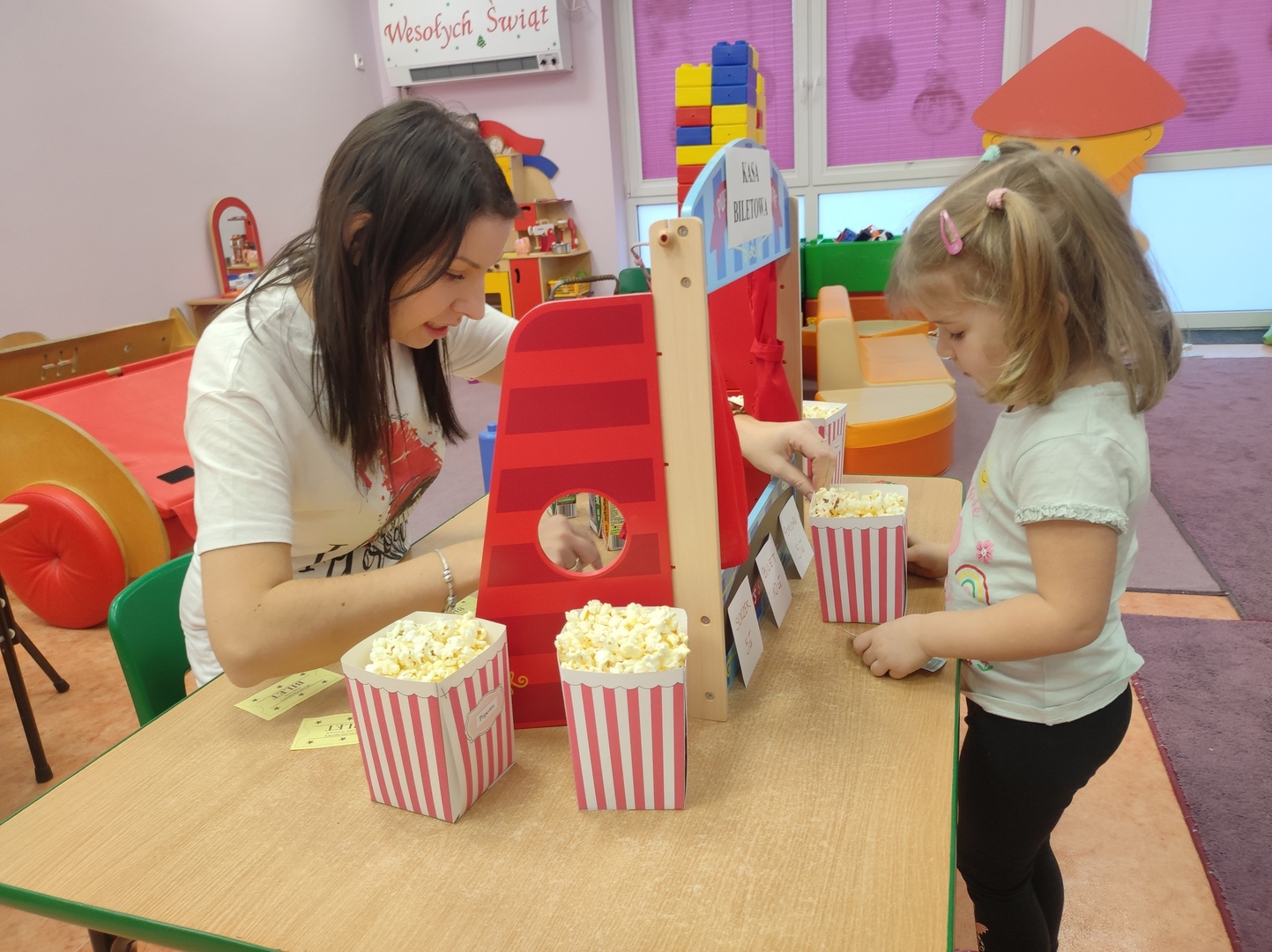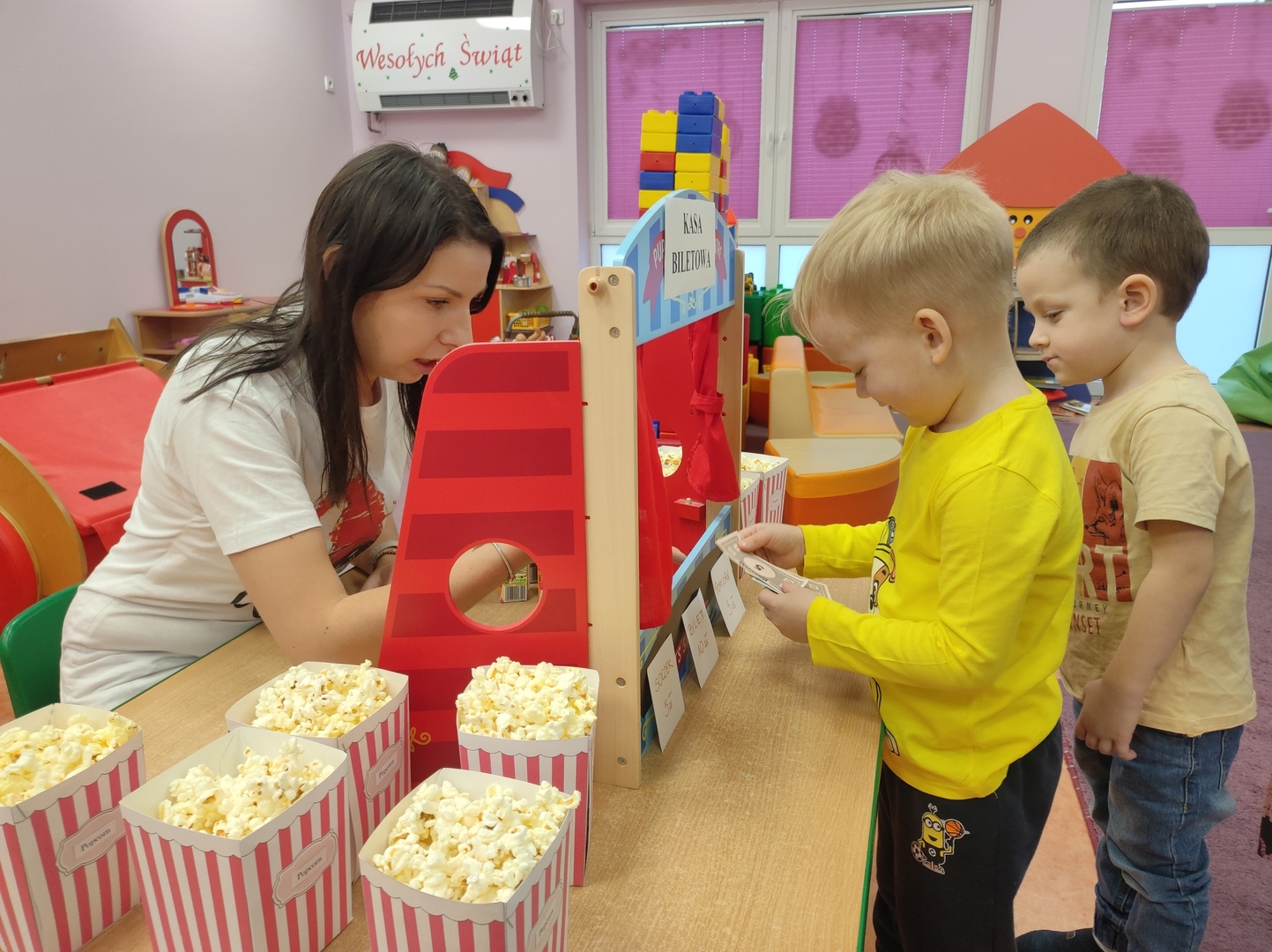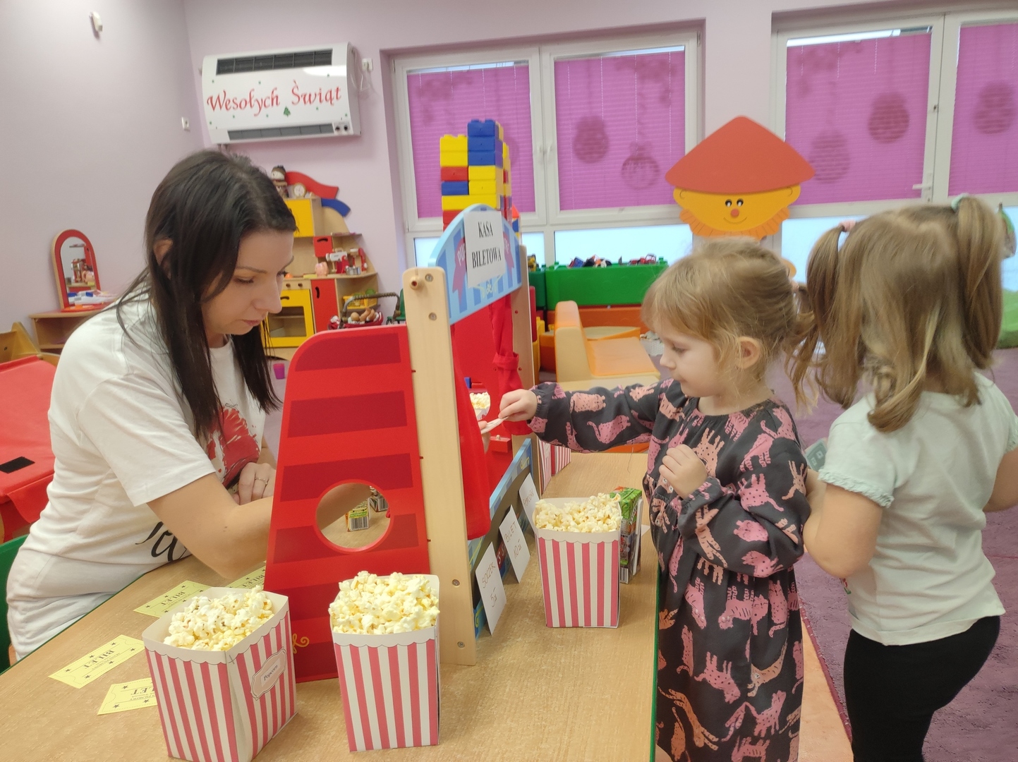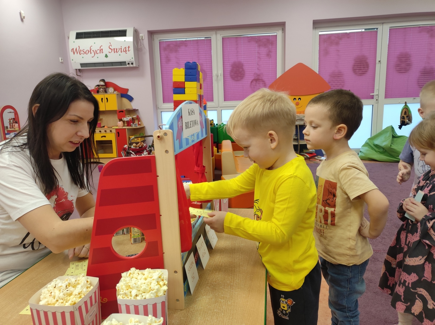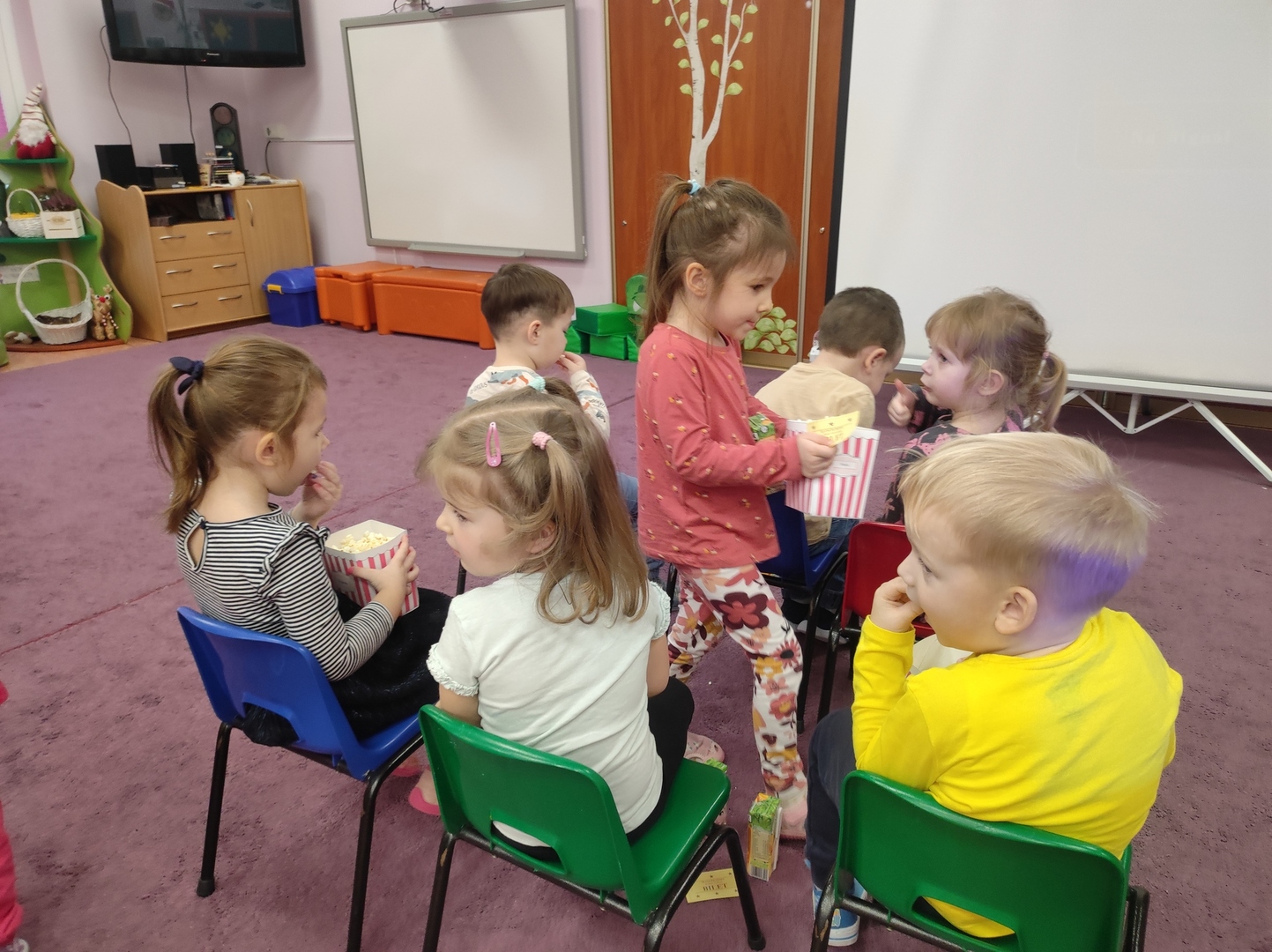 19 stycznia w grupie „Krasnoludki” odbył się Dzień Popcornu. Przedszkolaki dowiedziały się jak powstaje ten przysmak. Mogły na własne oczy zobaczyć, dotknąć ziarna oraz kolbę kukurydzy, a także posmakować gotowaną kukurydzę. Obejrzały również krótki film na ten temat tego jak powstaje popcorn oraz zrobiły go samodzielnie w specjalnej maszynie do popcornu. Świetnie również dały sobie radę z segregowaniem ziarenek kukurydzy i popcornu. Jednak największą atrakcją była wycieczka do kina. Każdy dzielny przedszkolak mógł samodzielnie kupić bilet na seans pt. "Nowe przygody Kubusia Puchatka", popcorn oraz soczek. Było fantastycznie! Na koniec każdy wykonał pamiątkowe zdjęcie w "popcornowej fotobudce".