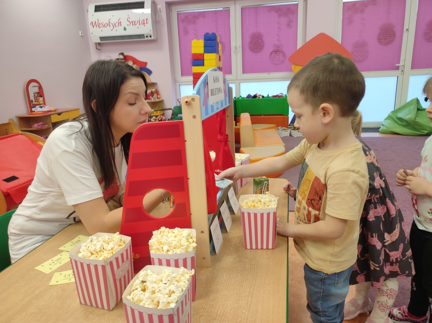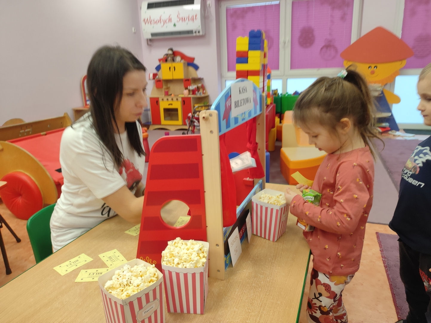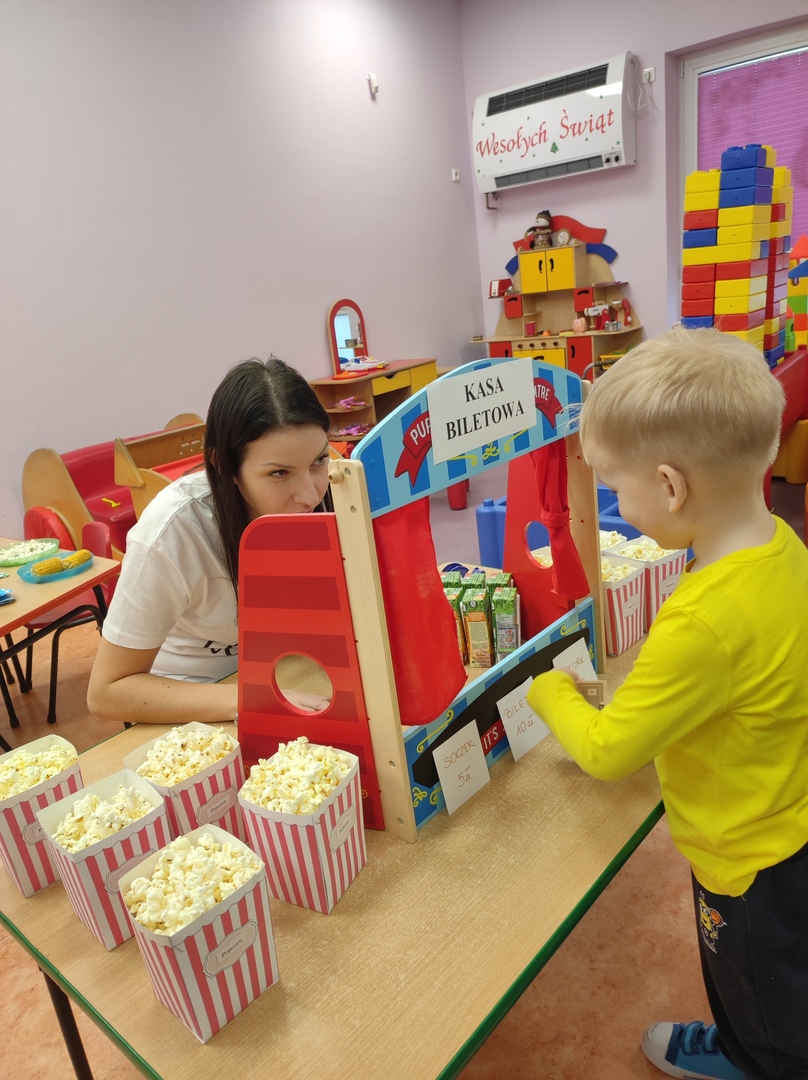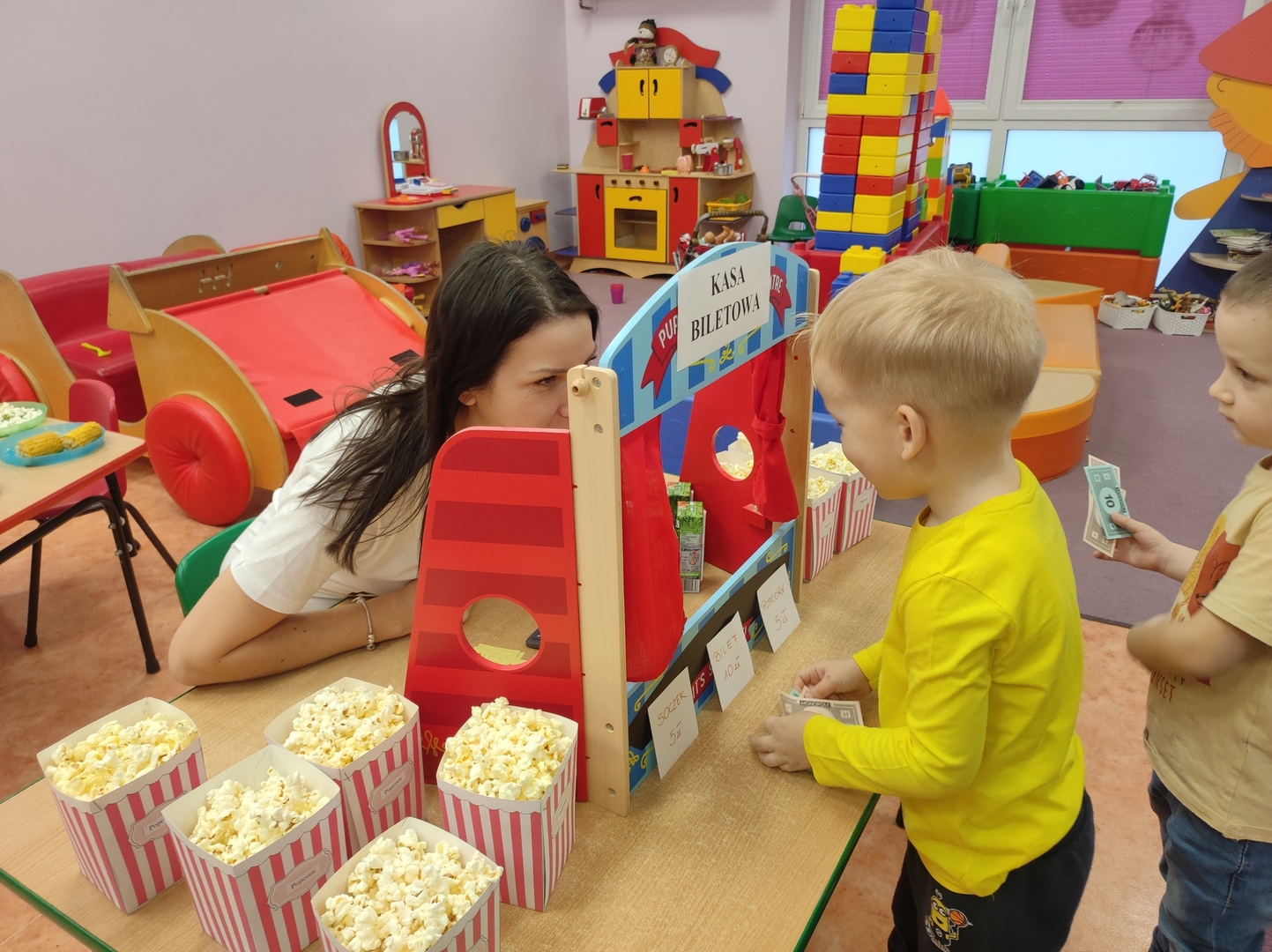19 stycznia w grupie „Krasnoludki” odbył się Dzień Popcornu. Przedszkolaki dowiedziały się jak powstaje ten przysmak. Mogły na własne oczy zobaczyć, dotknąć ziarna oraz kolbę kukurydzy, a także posmakować gotowaną kukurydzę. Obejrzały również krótki film na ten temat tego jak powstaje popcorn oraz zrobiły go samodzielnie w specjalnej maszynie do popcornu. Świetnie również dały sobie radę z segregowaniem ziarenek kukurydzy i popcornu. Jednak największą atrakcją była wycieczka do kina. Każdy dzielny przedszkolak mógł samodzielnie kupić bilet na seans pt. "Nowe przygody Kubusia Puchatka", popcorn oraz soczek. Było fantastycznie! Na koniec każdy wykonał pamiątkowe zdjęcie w "popcornowej fotobudce".