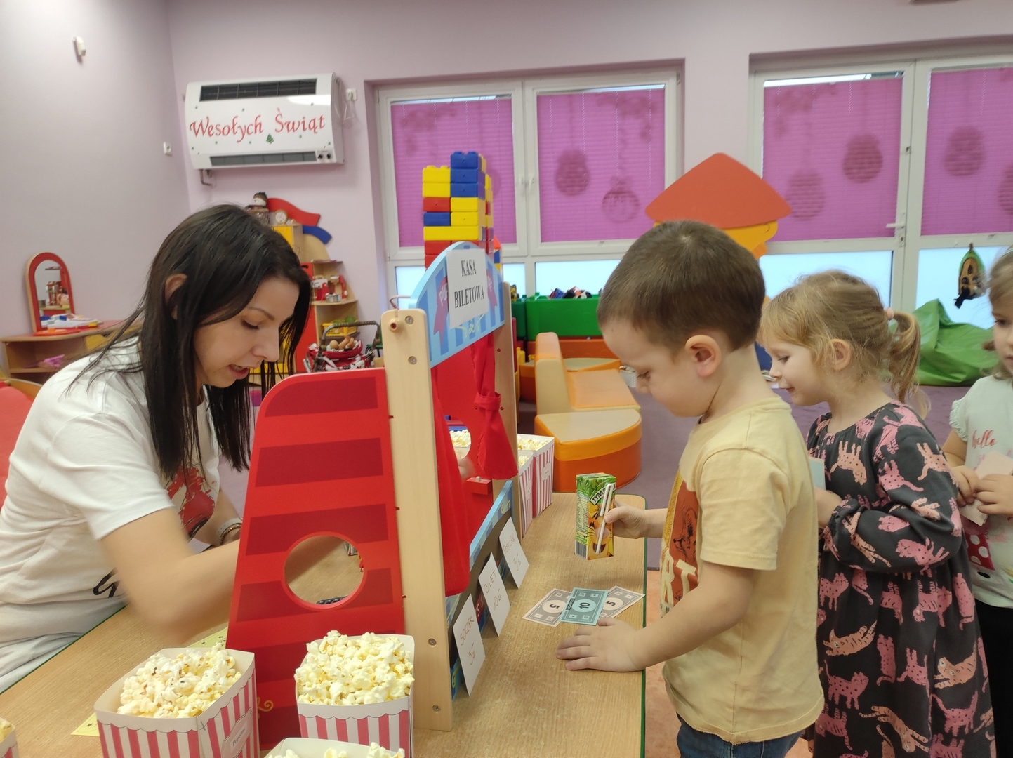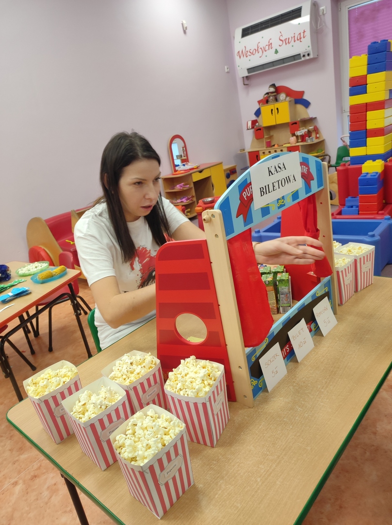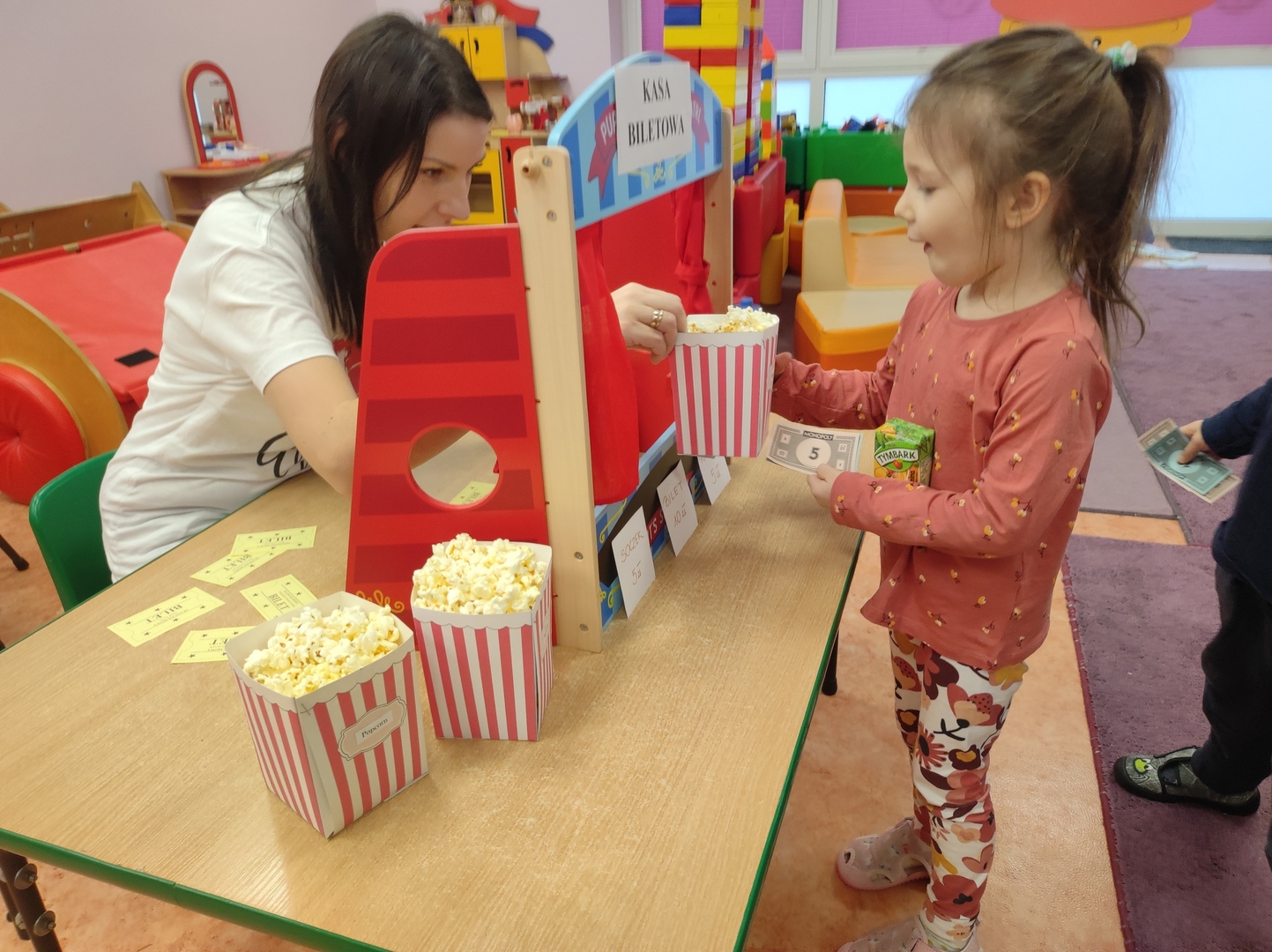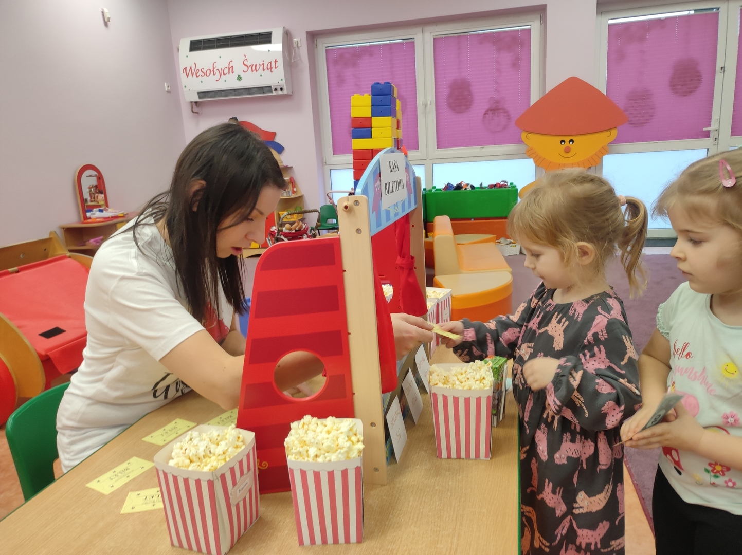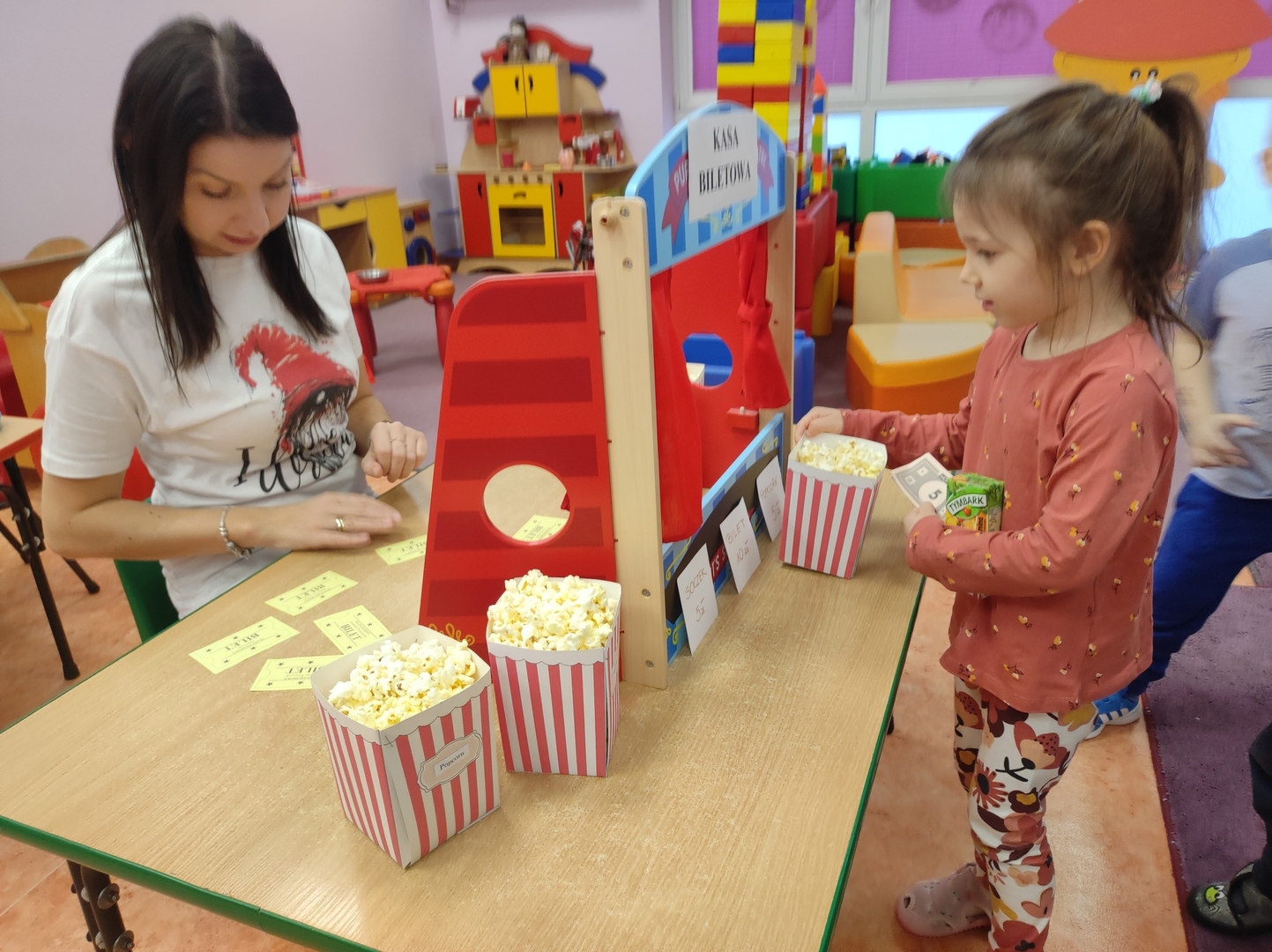 19 stycznia w grupie „Krasnoludki” odbył się Dzień Popcornu. Przedszkolaki dowiedziały się jak powstaje ten przysmak. Mogły na własne oczy zobaczyć, dotknąć ziarna oraz kolbę kukurydzy, a także posmakować gotowaną kukurydzę. Obejrzały również krótki film na ten temat tego jak powstaje popcorn oraz zrobiły go samodzielnie w specjalnej maszynie do popcornu. Świetnie również dały sobie radę z segregowaniem ziarenek kukurydzy i popcornu. Jednak największą atrakcją była wycieczka do kina. Każdy dzielny przedszkolak mógł samodzielnie kupić bilet na seans pt. "Nowe przygody Kubusia Puchatka", popcorn oraz soczek. Było fantastycznie! Na koniec każdy wykonał pamiątkowe zdjęcie w "popcornowej fotobudce".