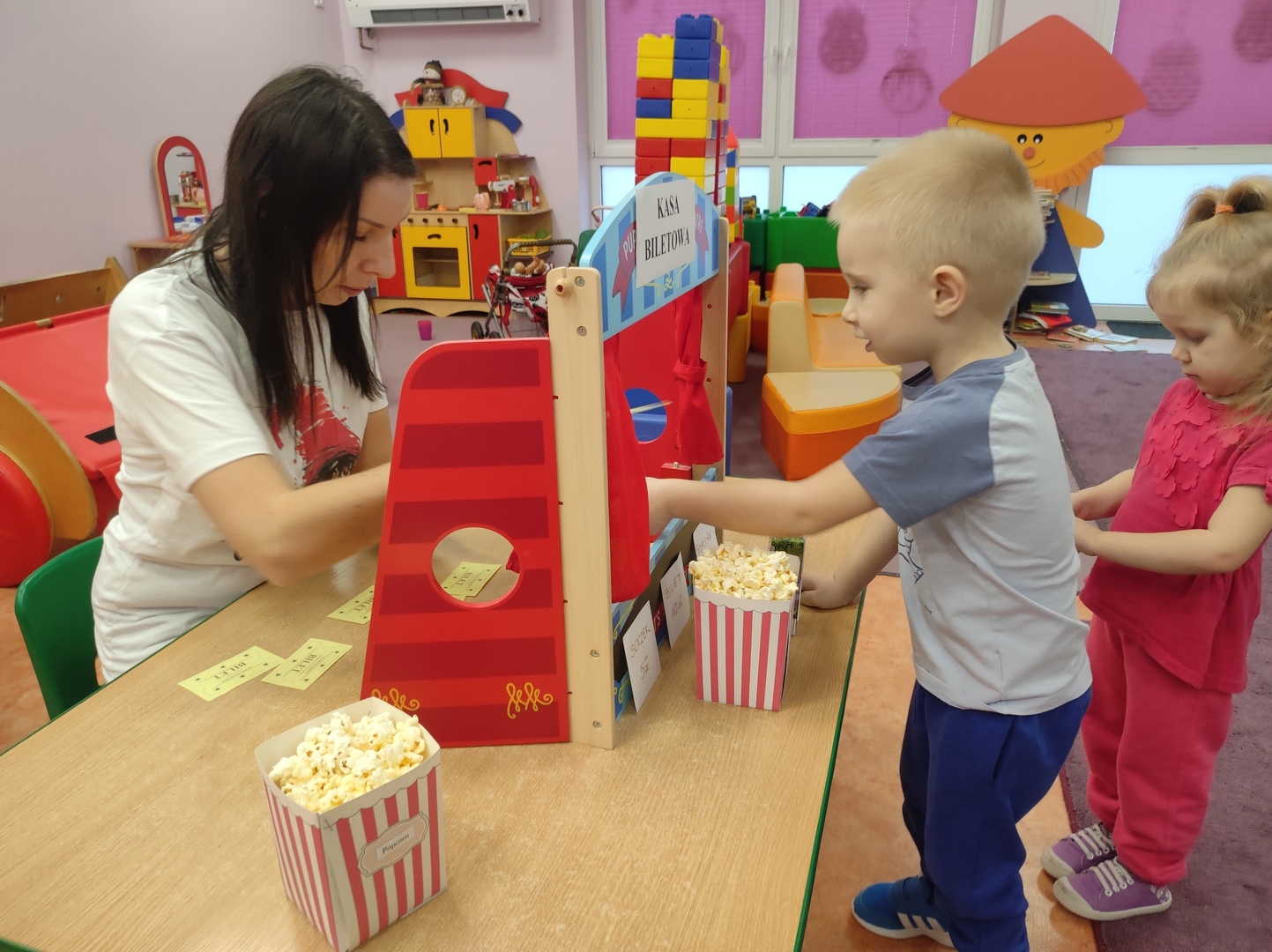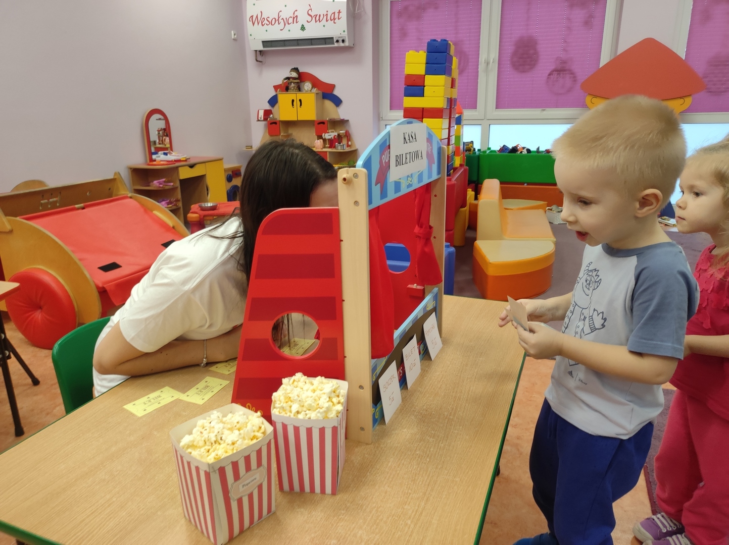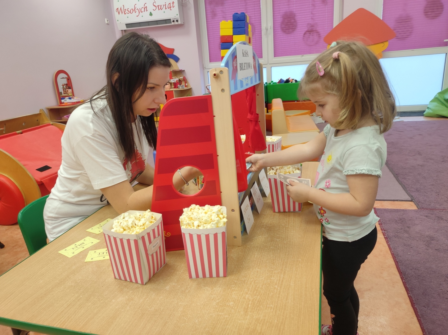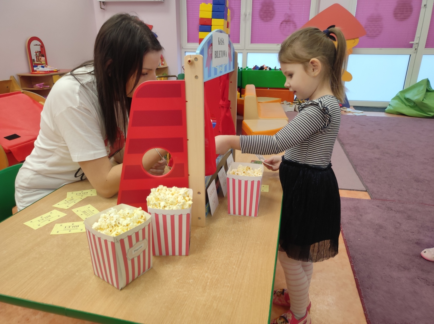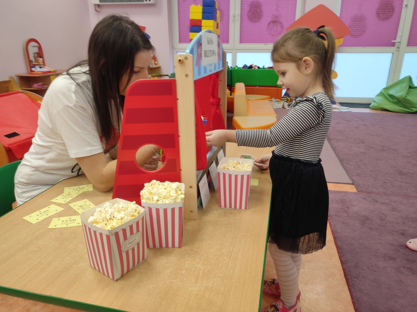 19 stycznia w grupie „Krasnoludki” odbył się Dzień Popcornu. Przedszkolaki dowiedziały się jak powstaje ten przysmak. Mogły na własne oczy zobaczyć, dotknąć ziarna oraz kolbę kukurydzy, a także posmakować gotowaną kukurydzę. Obejrzały również krótki film na ten temat tego jak powstaje popcorn oraz zrobiły go samodzielnie w specjalnej maszynie do popcornu. Świetnie również dały sobie radę z segregowaniem ziarenek kukurydzy i popcornu. Jednak największą atrakcją była wycieczka do kina. Każdy dzielny przedszkolak mógł samodzielnie kupić bilet na seans pt. "Nowe przygody Kubusia Puchatka", popcorn oraz soczek. Było fantastycznie! Na koniec każdy wykonał pamiątkowe zdjęcie w "popcornowej fotobudce".