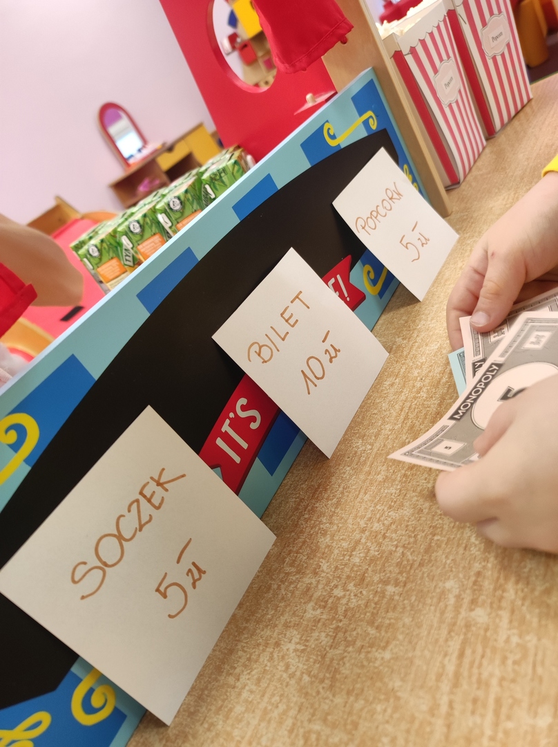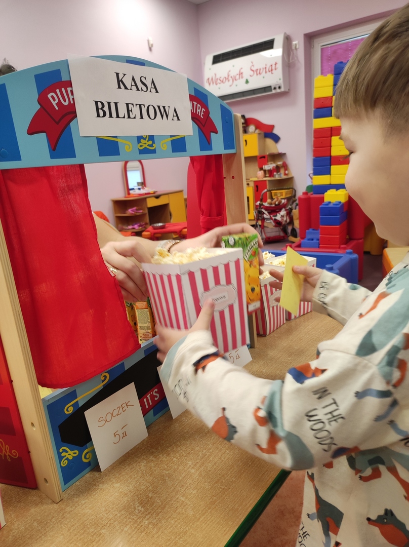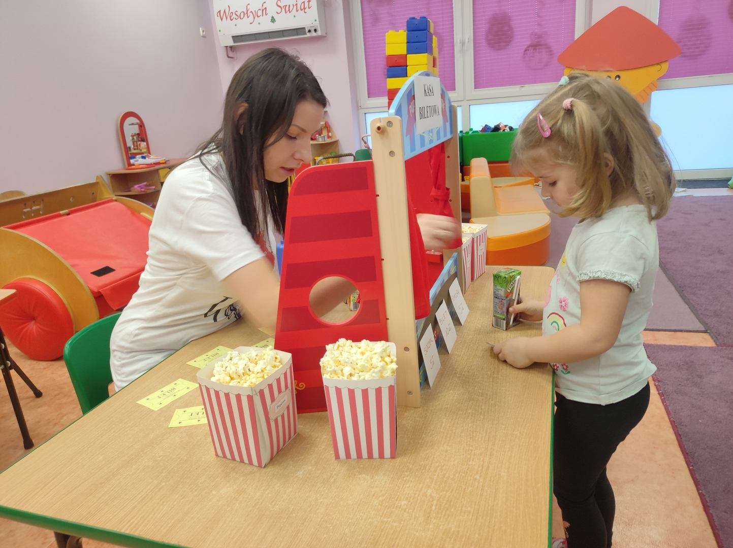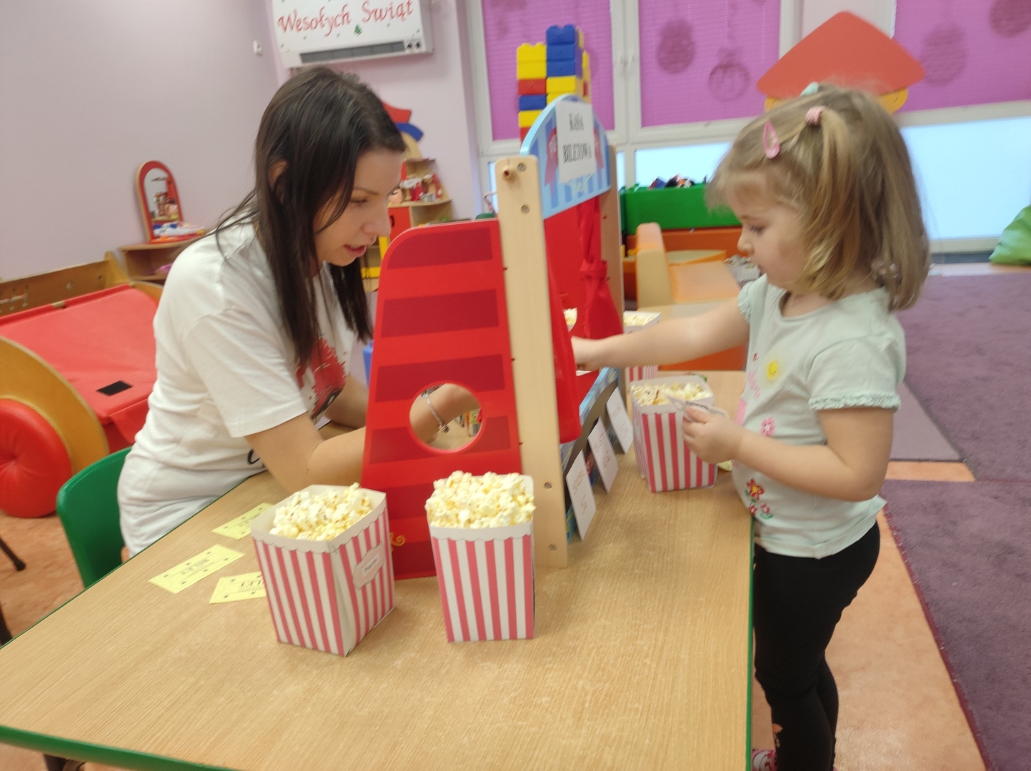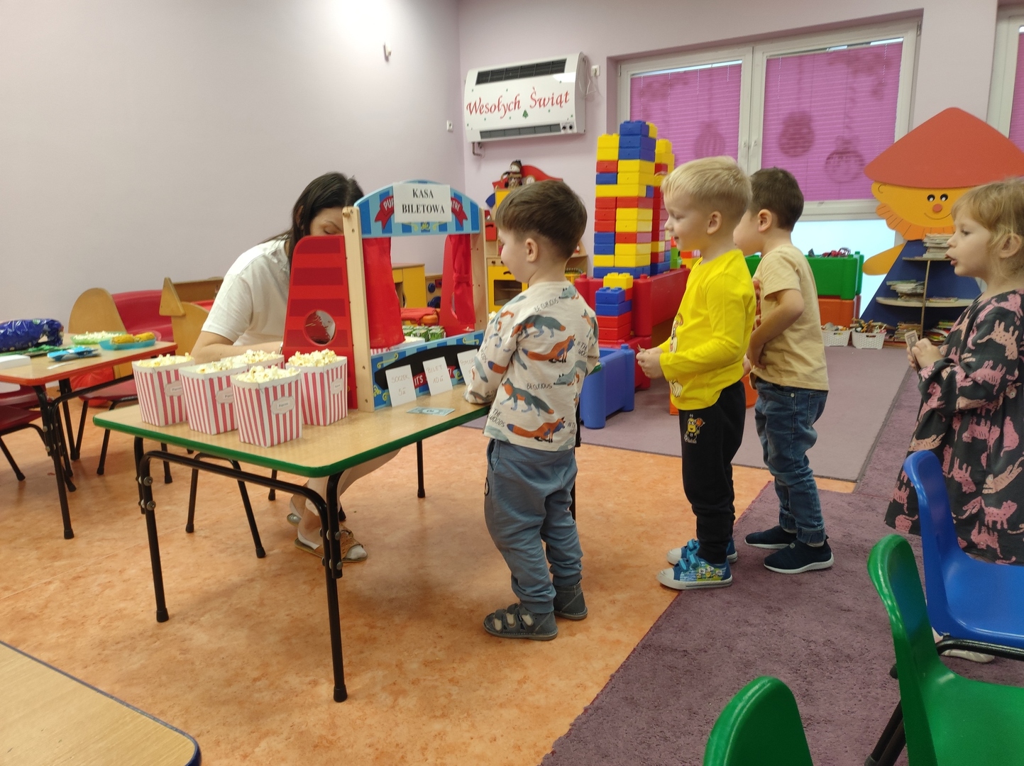 19 stycznia w grupie „Krasnoludki” odbył się Dzień Popcornu. Przedszkolaki dowiedziały się jak powstaje ten przysmak. Mogły na własne oczy zobaczyć, dotknąć ziarna oraz kolbę kukurydzy, a także posmakować gotowaną kukurydzę. Obejrzały również krótki film na ten temat tego jak powstaje popcorn oraz zrobiły go samodzielnie w specjalnej maszynie do popcornu. Świetnie również dały sobie radę z segregowaniem ziarenek kukurydzy i popcornu. Jednak największą atrakcją była wycieczka do kina. Każdy dzielny przedszkolak mógł samodzielnie kupić bilet na seans pt. "Nowe przygody Kubusia Puchatka", popcorn oraz soczek. Było fantastycznie! Na koniec każdy wykonał pamiątkowe zdjęcie w "popcornowej fotobudce".