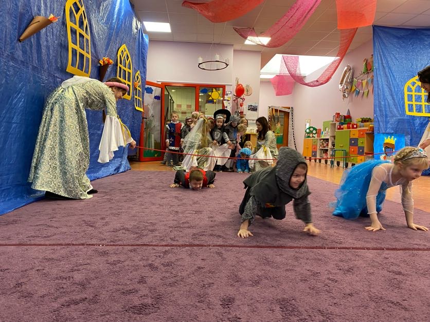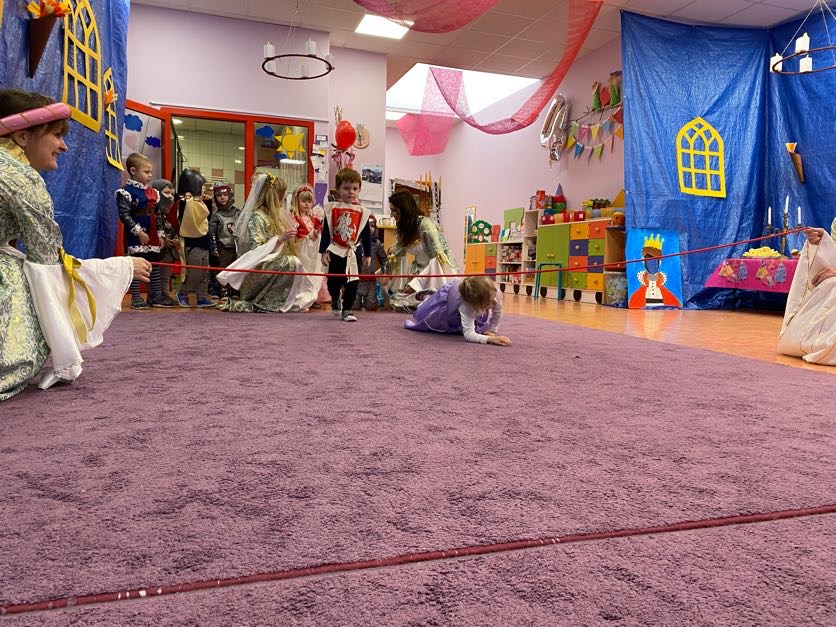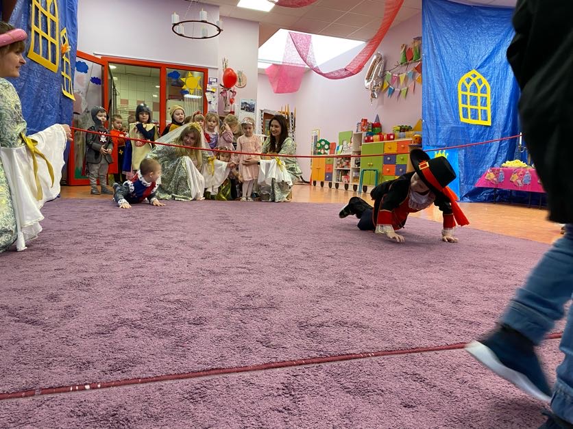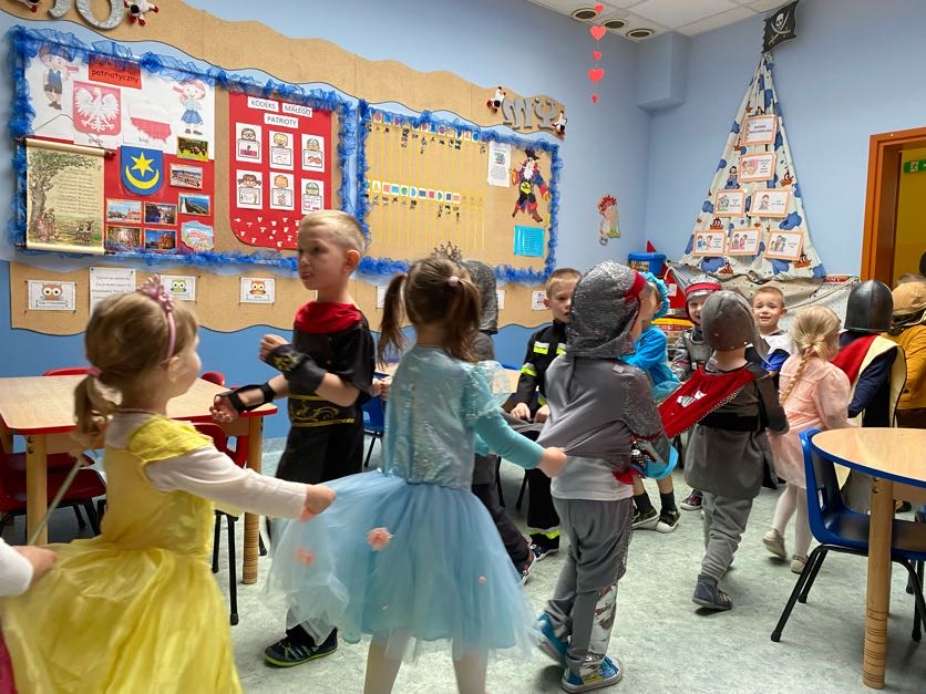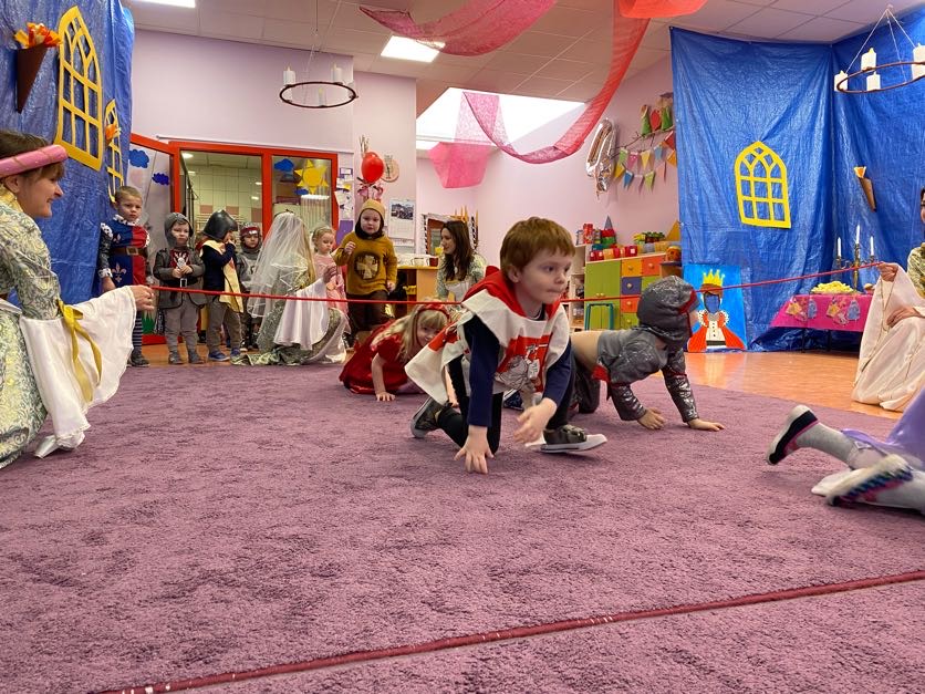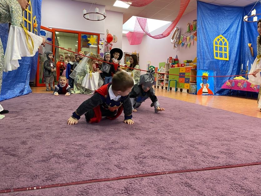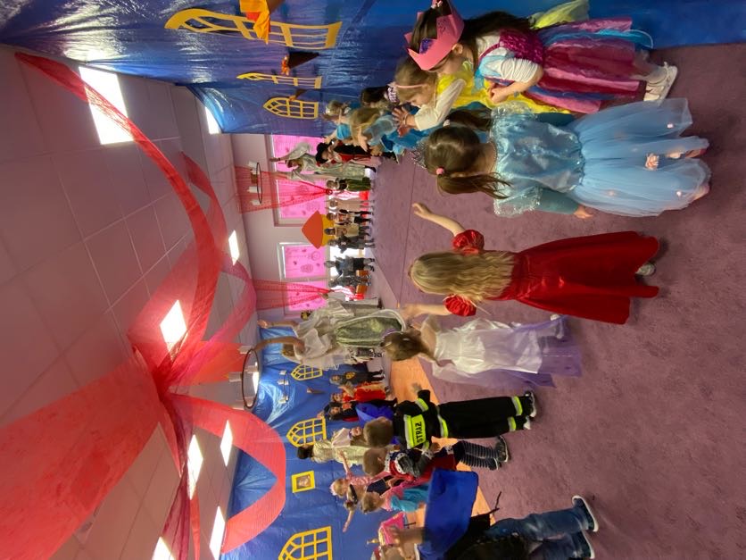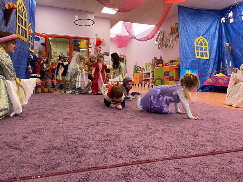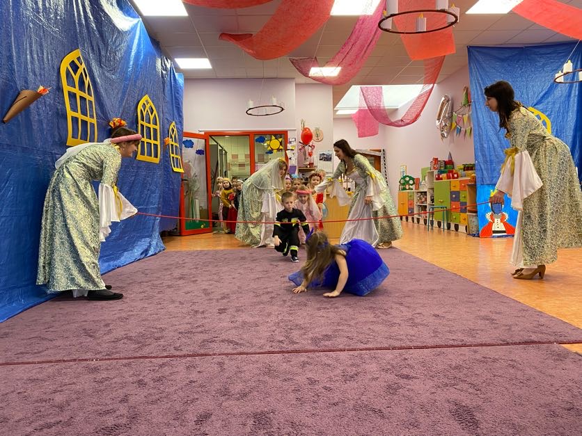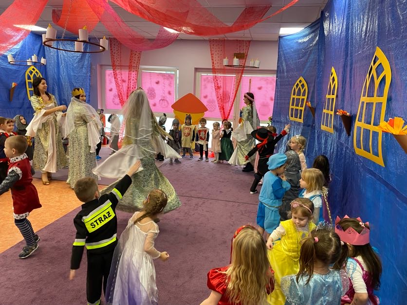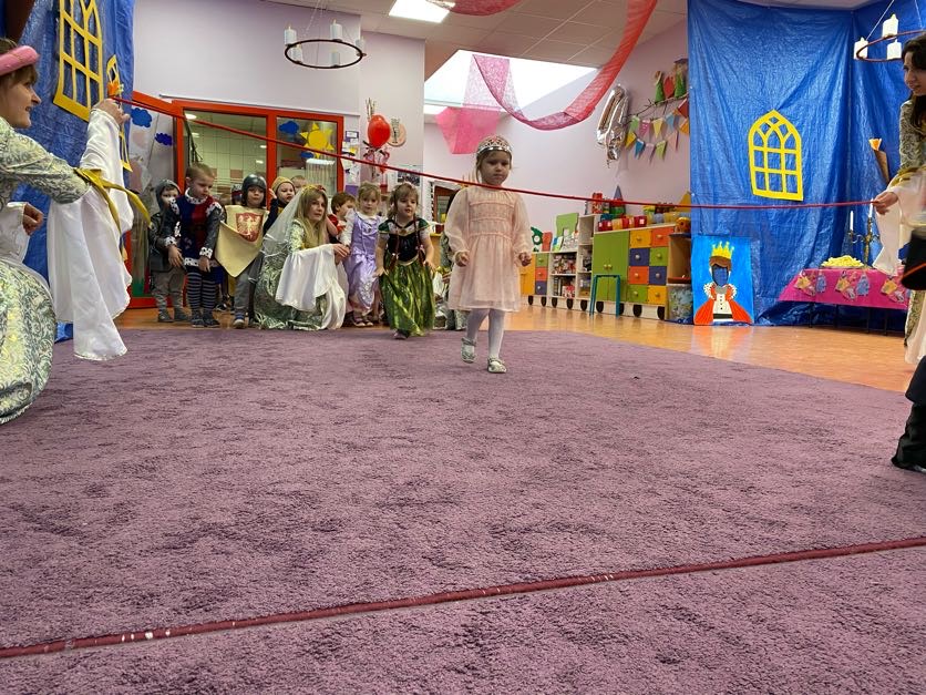 To był wyjątkowy bal, jak na królewską imprezkę przystało. Rozpoczął się od parady po moście zwodzonym, na którym wszyscy zebrani goście prezentowali swoje piękne stroje i po którym wkraczali na zamkową salę balową. Nie zabrakło wśród nich cudnych księżniczek, dzielnych rycerzy i innych mieszkańców z zamku królowej Jadwigi. Potem przyszedł czas na wspólne zabawy, tańce i konkursy, w tym: wyścigi rycerzy na koniach, księżniczek w przenoszeniu ciasteczek na tacy, czy przechodzenia pod liną. Był także „taniec zamrażaniec”, barwne pociągi i korowody, tańce w parach, kołach i inne wygibasy. Wszystkim gościom dopisywały wyborne humorki i niegasnący entuzjazm do zabawy. Bal zakończył się wspaniałą ucztą, za zorganizowanie której bardzo dziękujemy rodzicom. Dziekujemy także za pozytywny odzew w sprawie strojów na bal. Dzięki Wam mogłyśmy w pełni zrealizować naszą kanawałową wizję:).