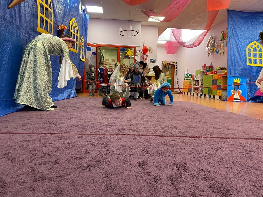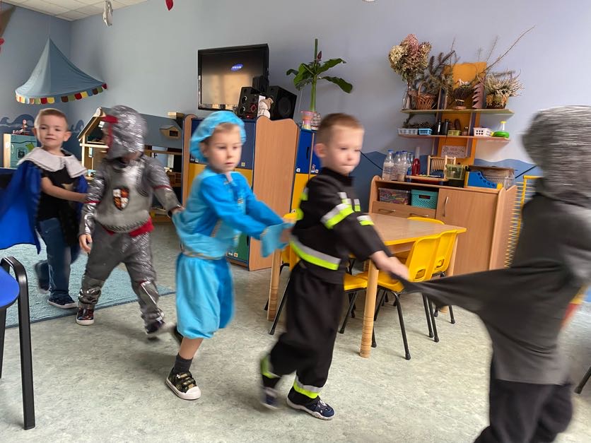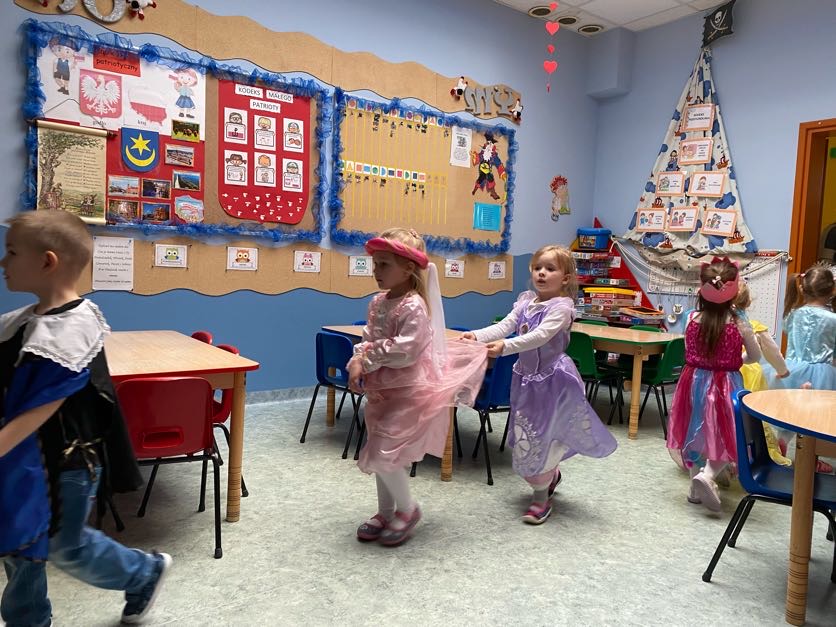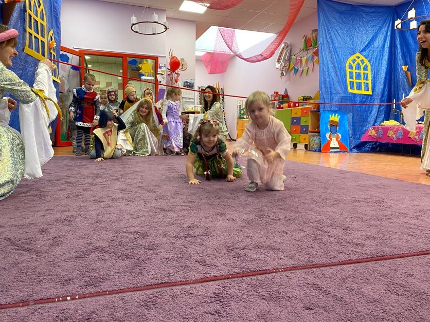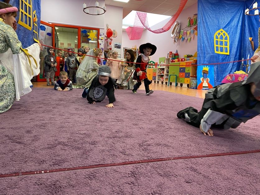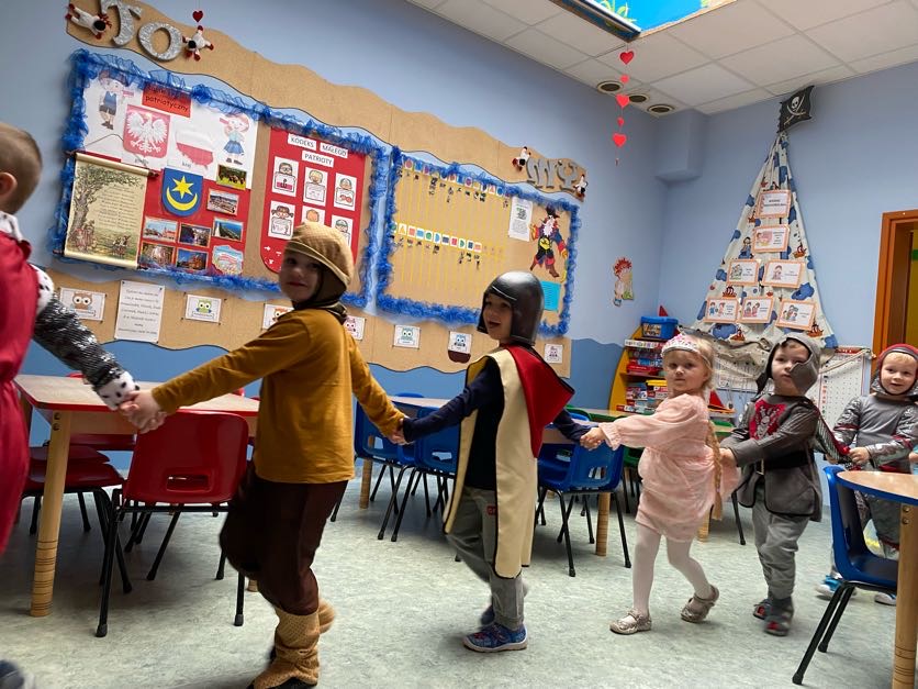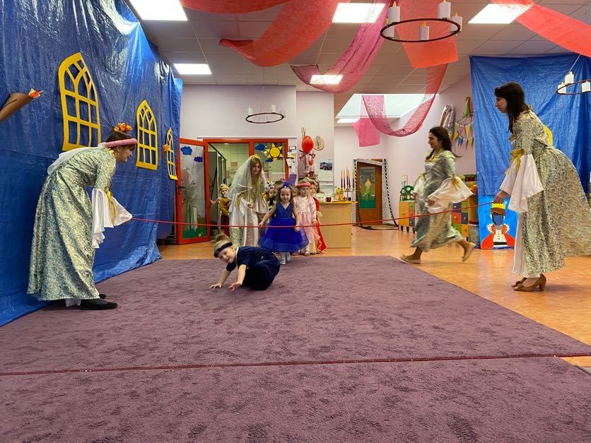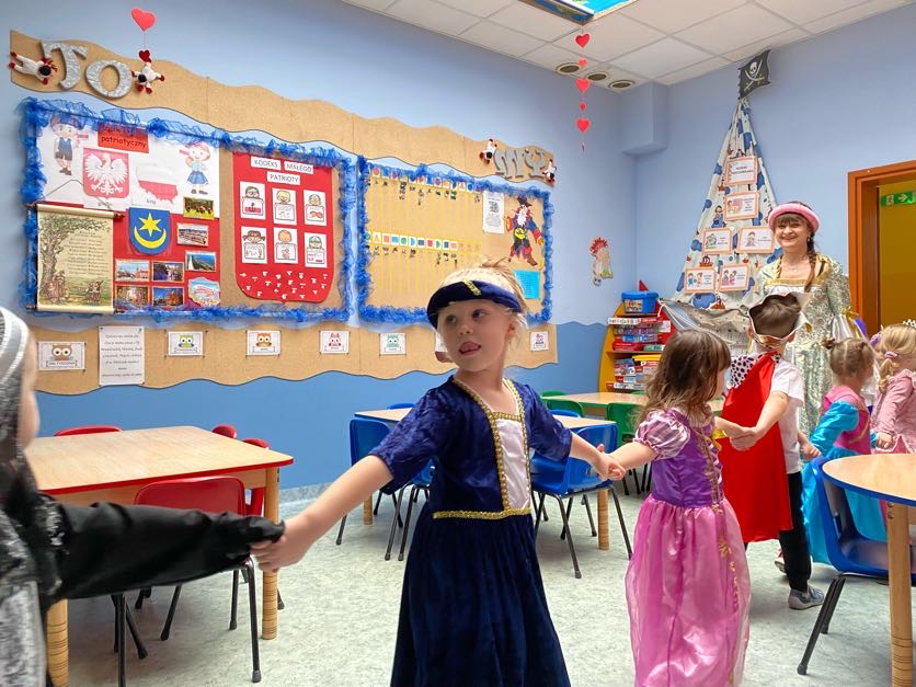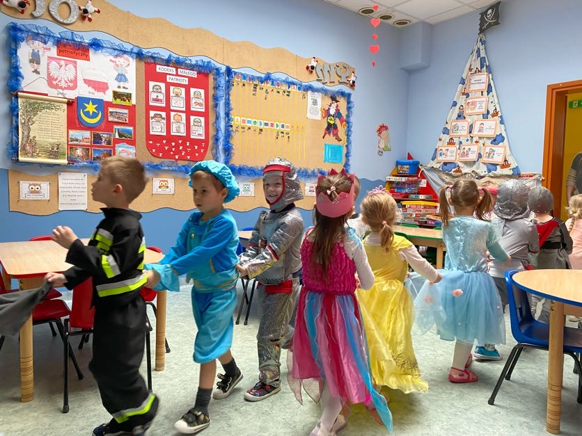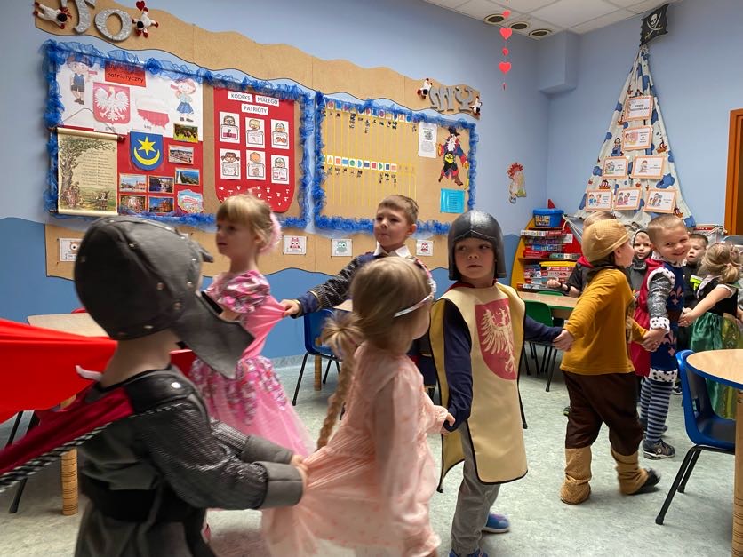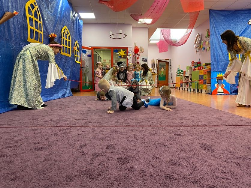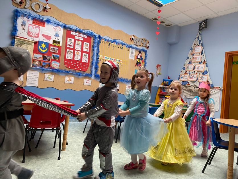To był wyjątkowy bal, jak na królewską imprezkę przystało. Rozpoczął się od parady po moście zwodzonym, na którym wszyscy zebrani goście prezentowali swoje piękne stroje i po którym wkraczali na zamkową salę balową. Nie zabrakło wśród nich cudnych księżniczek, dzielnych rycerzy i innych mieszkańców z zamku królowej Jadwigi. Potem przyszedł czas na wspólne zabawy, tańce i konkursy, w tym: wyścigi rycerzy na koniach, księżniczek w przenoszeniu ciasteczek na tacy, czy przechodzenia pod liną. Był także „taniec zamrażaniec”, barwne pociągi i korowody, tańce w parach, kołach i inne wygibasy. Wszystkim gościom dopisywały wyborne humorki i niegasnący entuzjazm do zabawy. Bal zakończył się wspaniałą ucztą, za zorganizowanie której bardzo dziękujemy rodzicom. Dziekujemy także za pozytywny odzew w sprawie strojów na bal. Dzięki Wam mogłyśmy w pełni zrealizować naszą kanawałową wizję:).