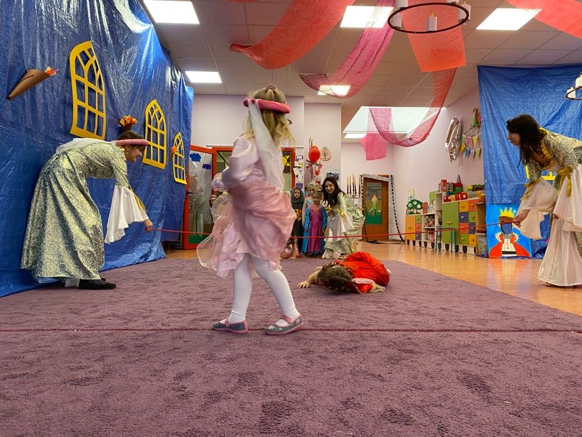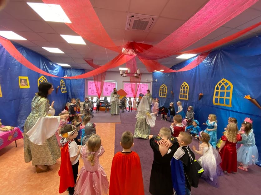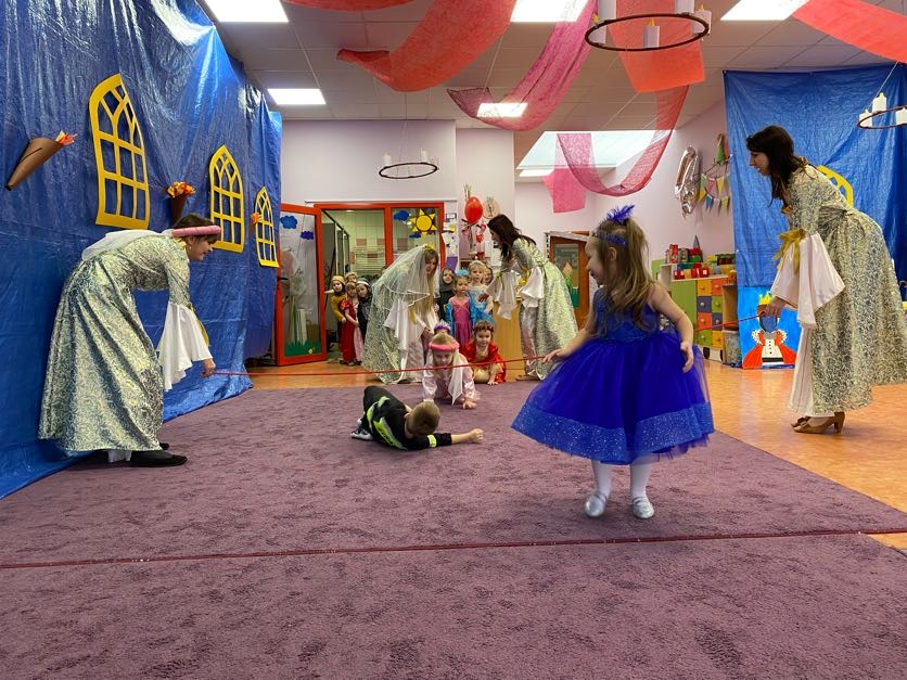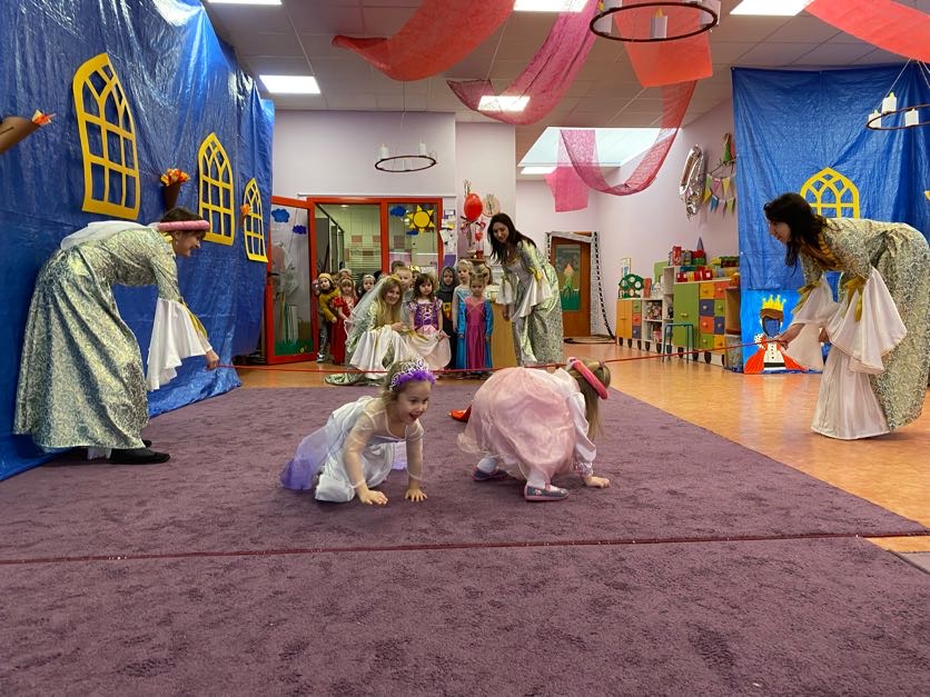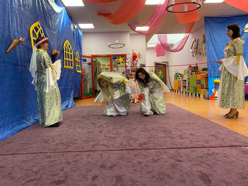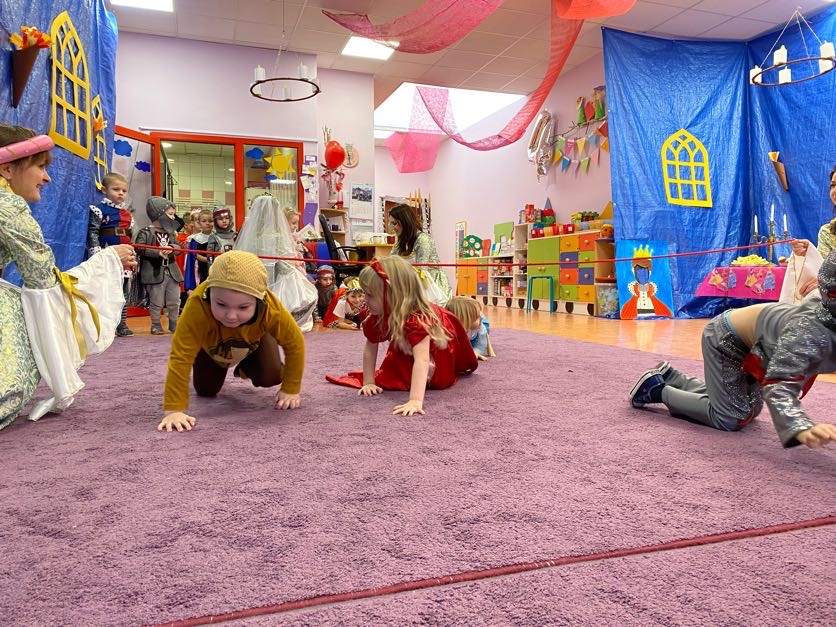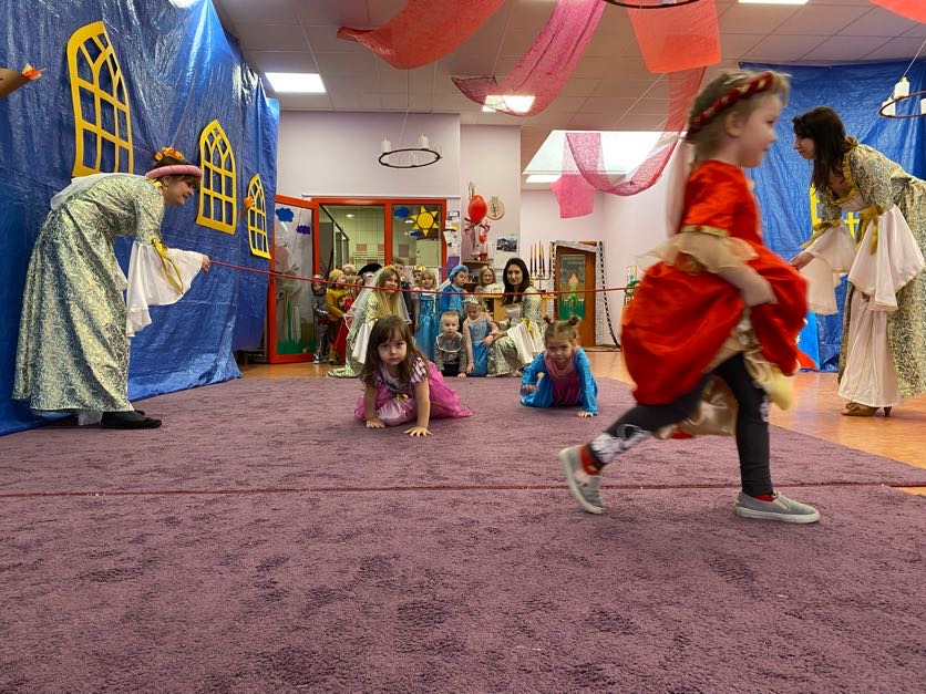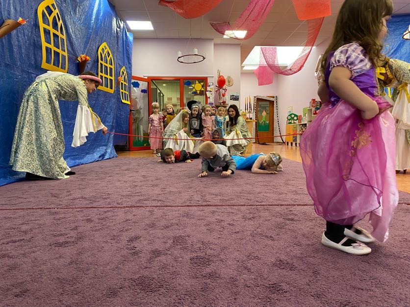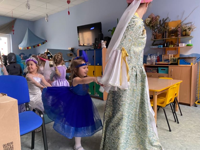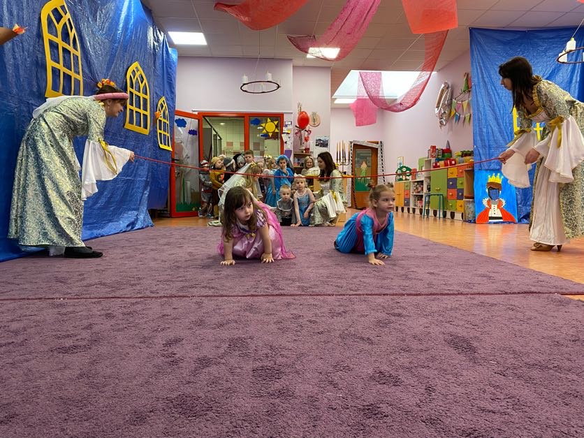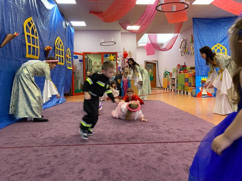 To był wyjątkowy bal, jak na królewską imprezkę przystało. Rozpoczął się od parady po moście zwodzonym, na którym wszyscy zebrani goście prezentowali swoje piękne stroje i po którym wkraczali na zamkową salę balową. Nie zabrakło wśród nich cudnych księżniczek, dzielnych rycerzy i innych mieszkańców z zamku królowej Jadwigi. Potem przyszedł czas na wspólne zabawy, tańce i konkursy, w tym: wyścigi rycerzy na koniach, księżniczek w przenoszeniu ciasteczek na tacy, czy przechodzenia pod liną. Był także „taniec zamrażaniec”, barwne pociągi i korowody, tańce w parach, kołach i inne wygibasy. Wszystkim gościom dopisywały wyborne humorki i niegasnący entuzjazm do zabawy. Bal zakończył się wspaniałą ucztą, za zorganizowanie której bardzo dziękujemy rodzicom. Dziekujemy także za pozytywny odzew w sprawie strojów na bal. Dzięki Wam mogłyśmy w pełni zrealizować naszą kanawałową wizję:).