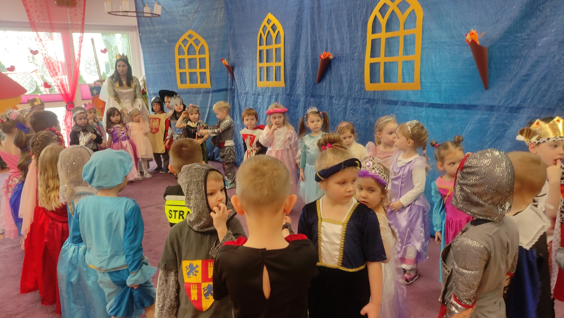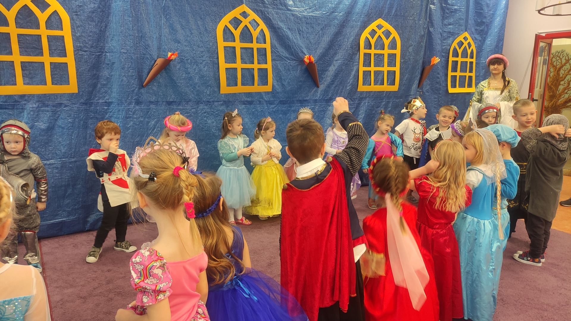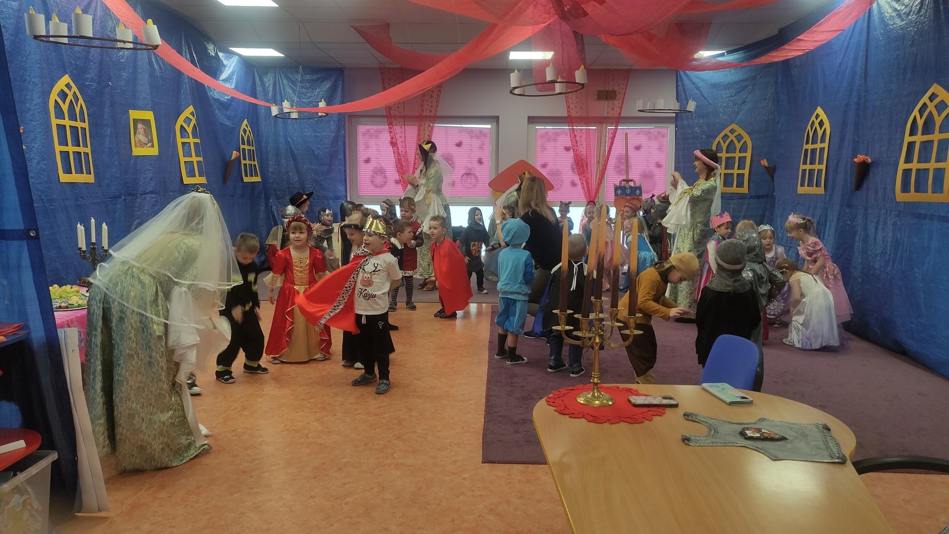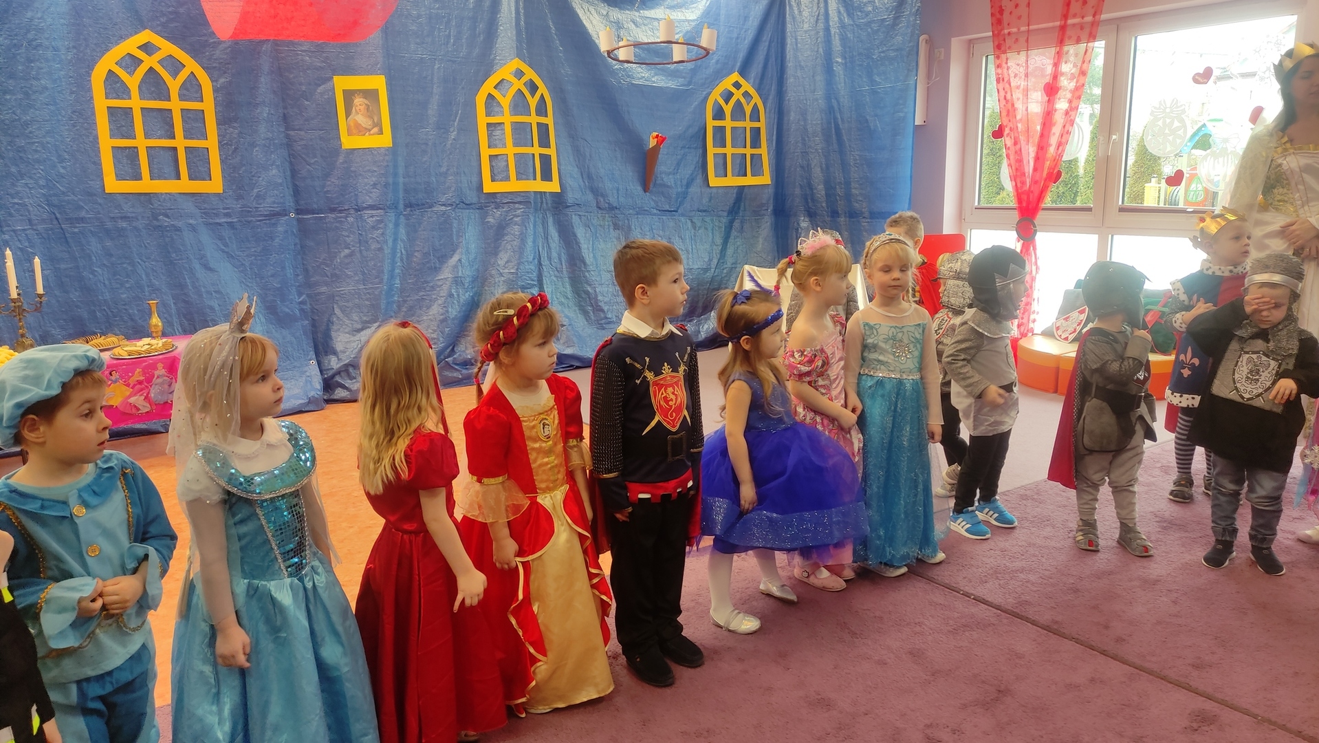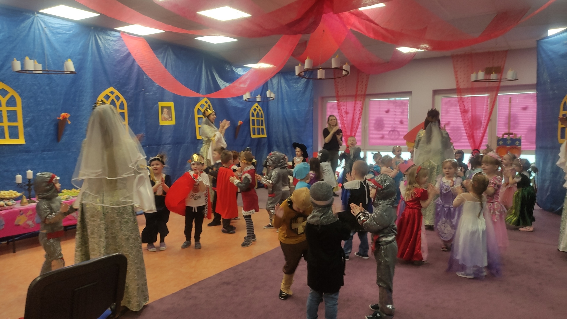 To był wyjątkowy bal, jak na królewską imprezkę przystało. Rozpoczął się od parady po moście zwodzonym, na którym wszyscy zebrani goście prezentowali swoje piękne stroje i po którym wkraczali na zamkową salę balową. Nie zabrakło wśród nich cudnych księżniczek, dzielnych rycerzy i innych mieszkańców z zamku królowej Jadwigi. Potem przyszedł czas na wspólne zabawy, tańce i konkursy, w tym: wyścigi rycerzy na koniach, księżniczek w przenoszeniu ciasteczek na tacy, czy przechodzenia pod liną. Był także „taniec zamrażaniec”, barwne pociągi i korowody, tańce w parach, kołach i inne wygibasy. Wszystkim gościom dopisywały wyborne humorki i niegasnący entuzjazm do zabawy. Bal zakończył się wspaniałą ucztą, za zorganizowanie której bardzo dziękujemy rodzicom. Dziekujemy także za pozytywny odzew w sprawie strojów na bal. Dzięki Wam mogłyśmy w pełni zrealizować naszą kanawałową wizję:).