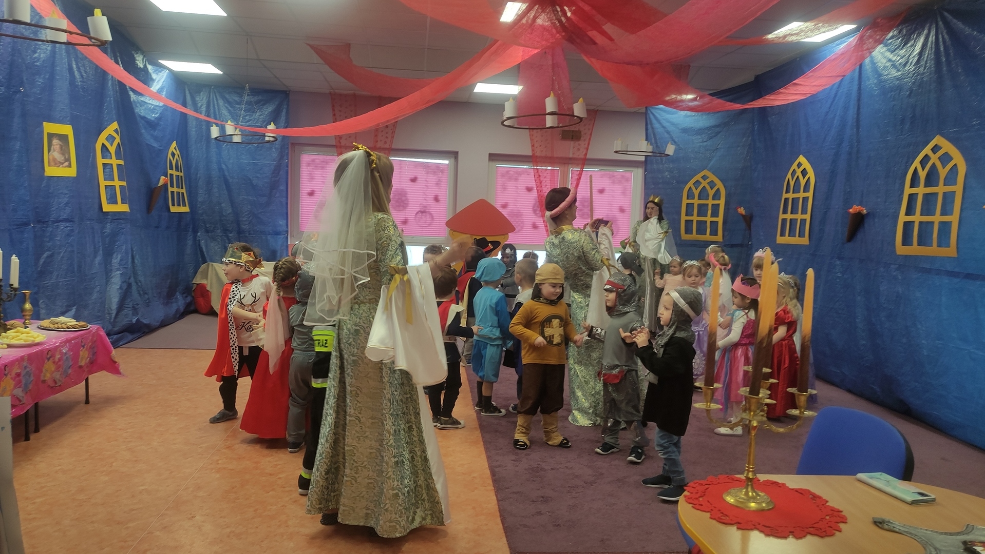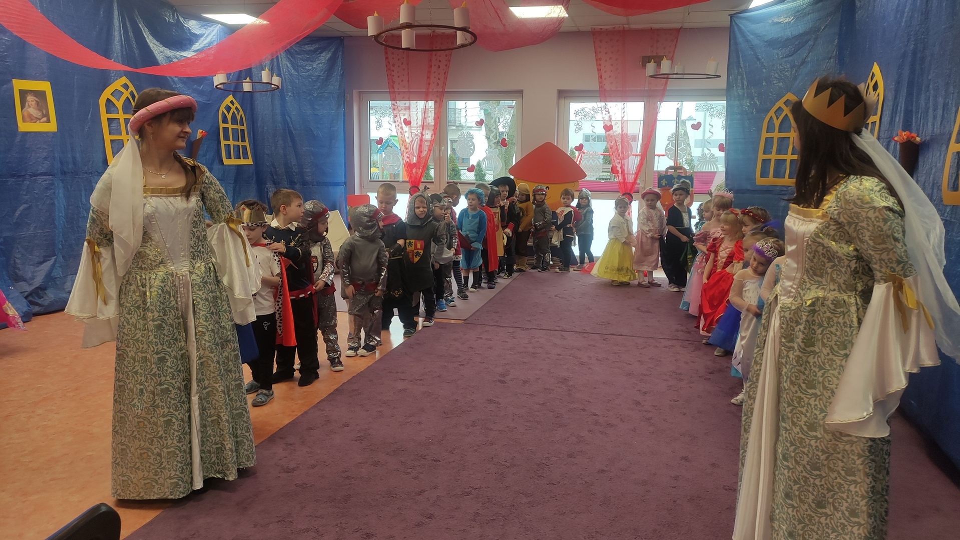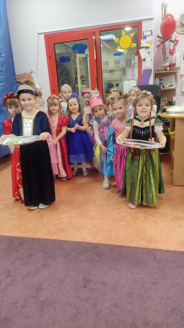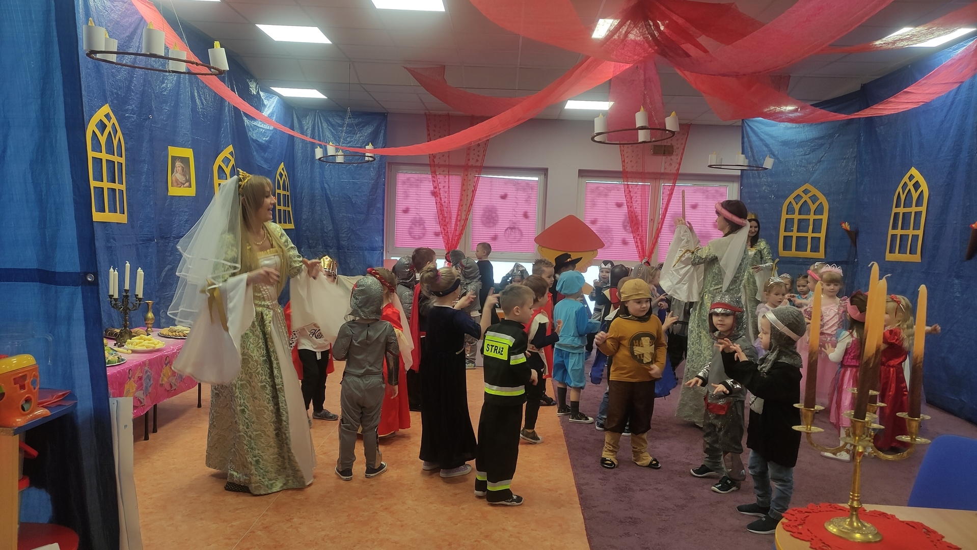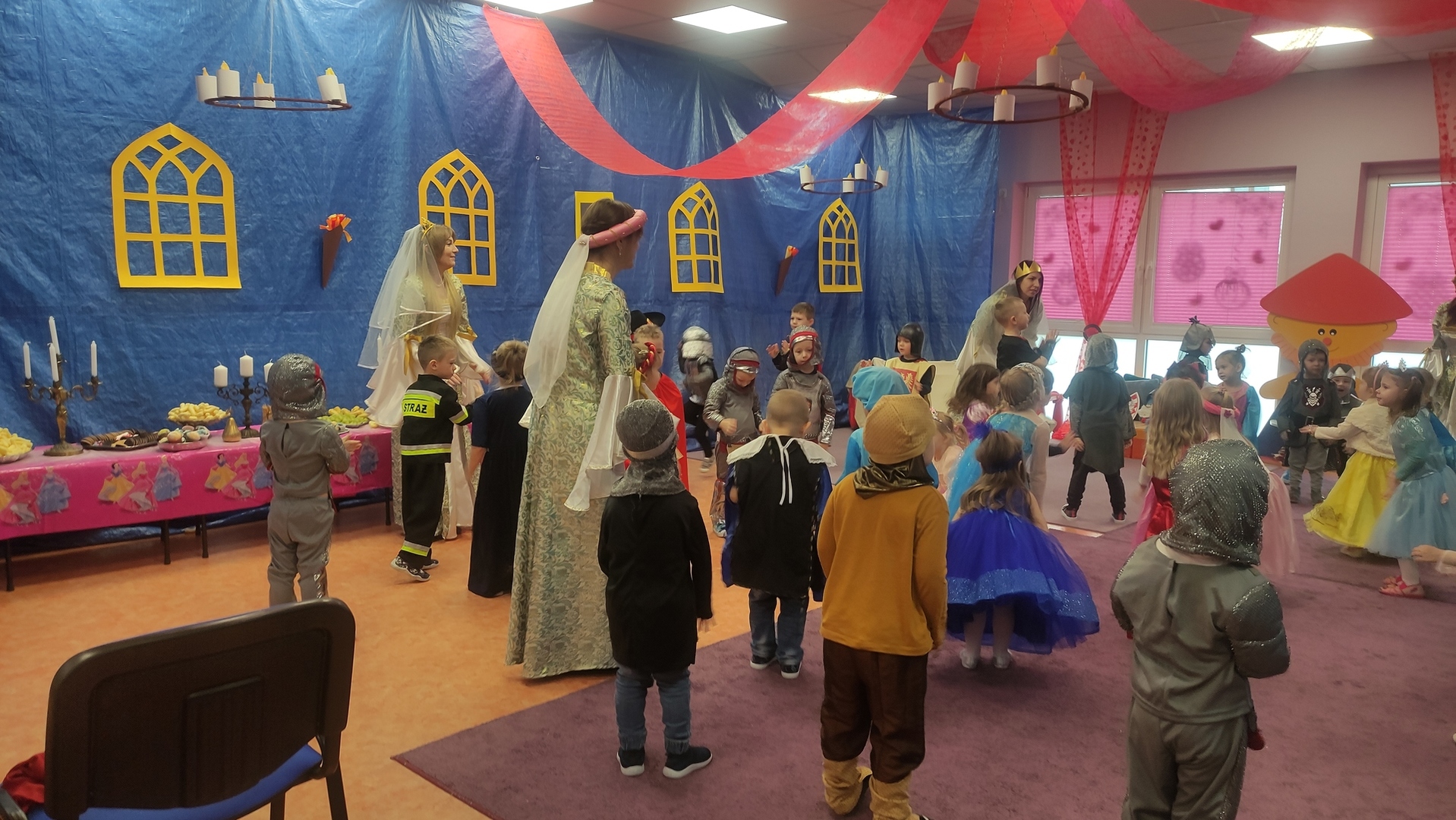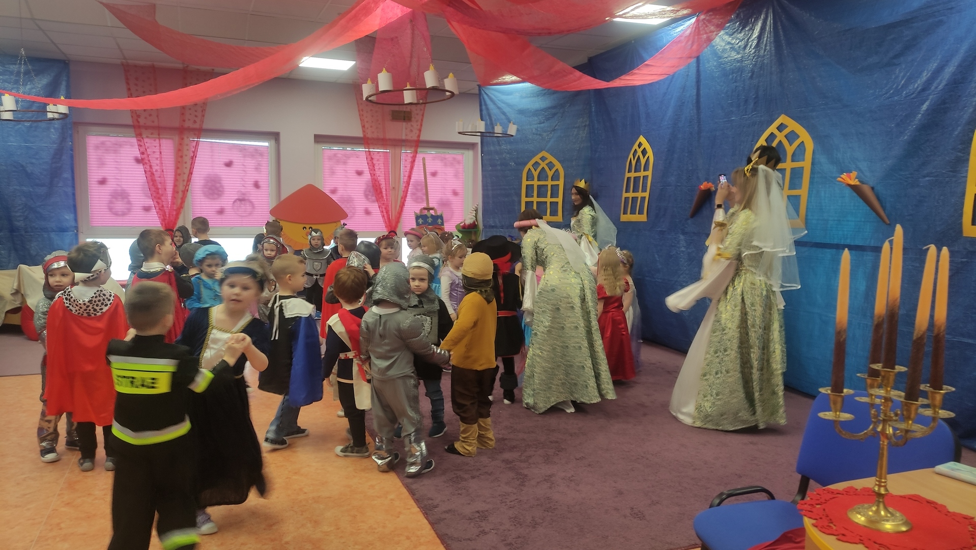 To był wyjątkowy bal, jak na królewską imprezkę przystało. Rozpoczął się od parady po moście zwodzonym, na którym wszyscy zebrani goście prezentowali swoje piękne stroje i po którym wkraczali na zamkową salę balową. Nie zabrakło wśród nich cudnych księżniczek, dzielnych rycerzy i innych mieszkańców z zamku królowej Jadwigi. Potem przyszedł czas na wspólne zabawy, tańce i konkursy, w tym: wyścigi rycerzy na koniach, księżniczek w przenoszeniu ciasteczek na tacy, czy przechodzenia pod liną. Był także „taniec zamrażaniec”, barwne pociągi i korowody, tańce w parach, kołach i inne wygibasy. Wszystkim gościom dopisywały wyborne humorki i niegasnący entuzjazm do zabawy. Bal zakończył się wspaniałą ucztą, za zorganizowanie której bardzo dziękujemy rodzicom. Dziekujemy także za pozytywny odzew w sprawie strojów na bal. Dzięki Wam mogłyśmy w pełni zrealizować naszą kanawałową wizję:).