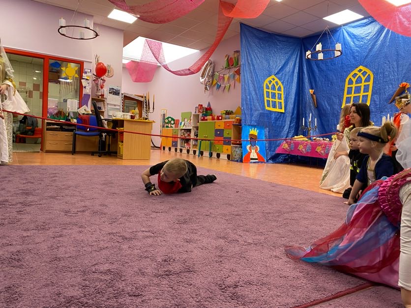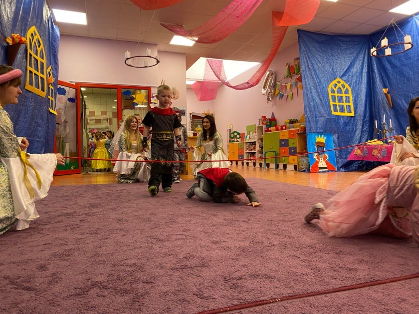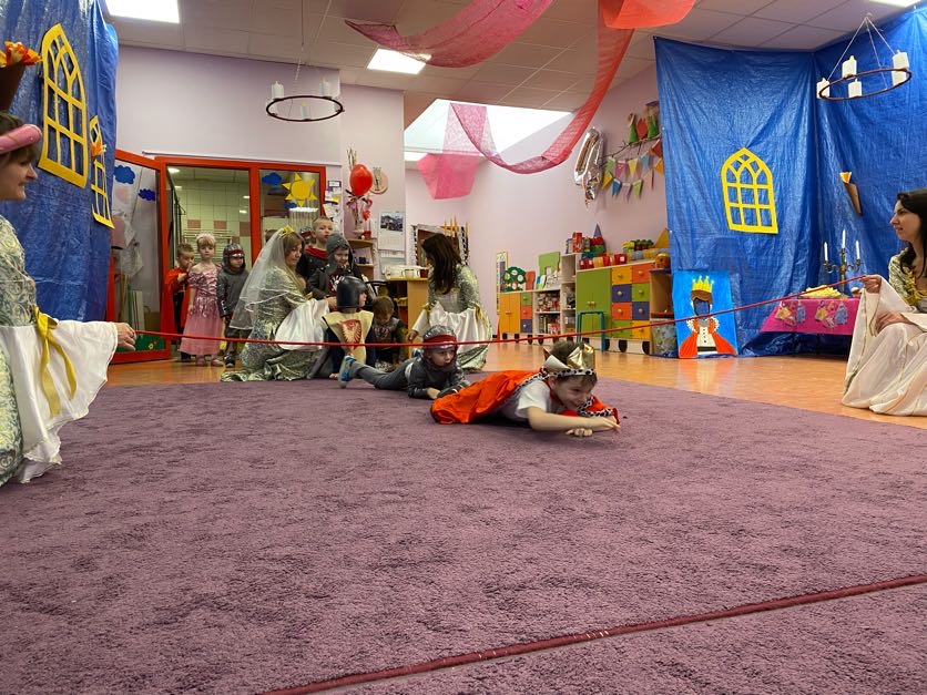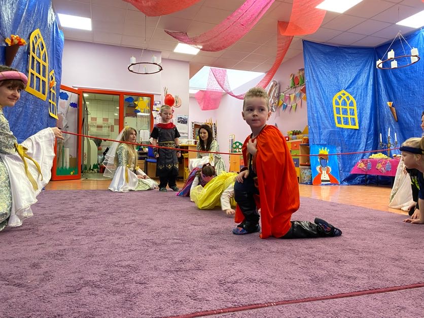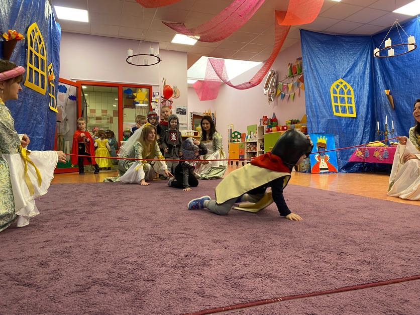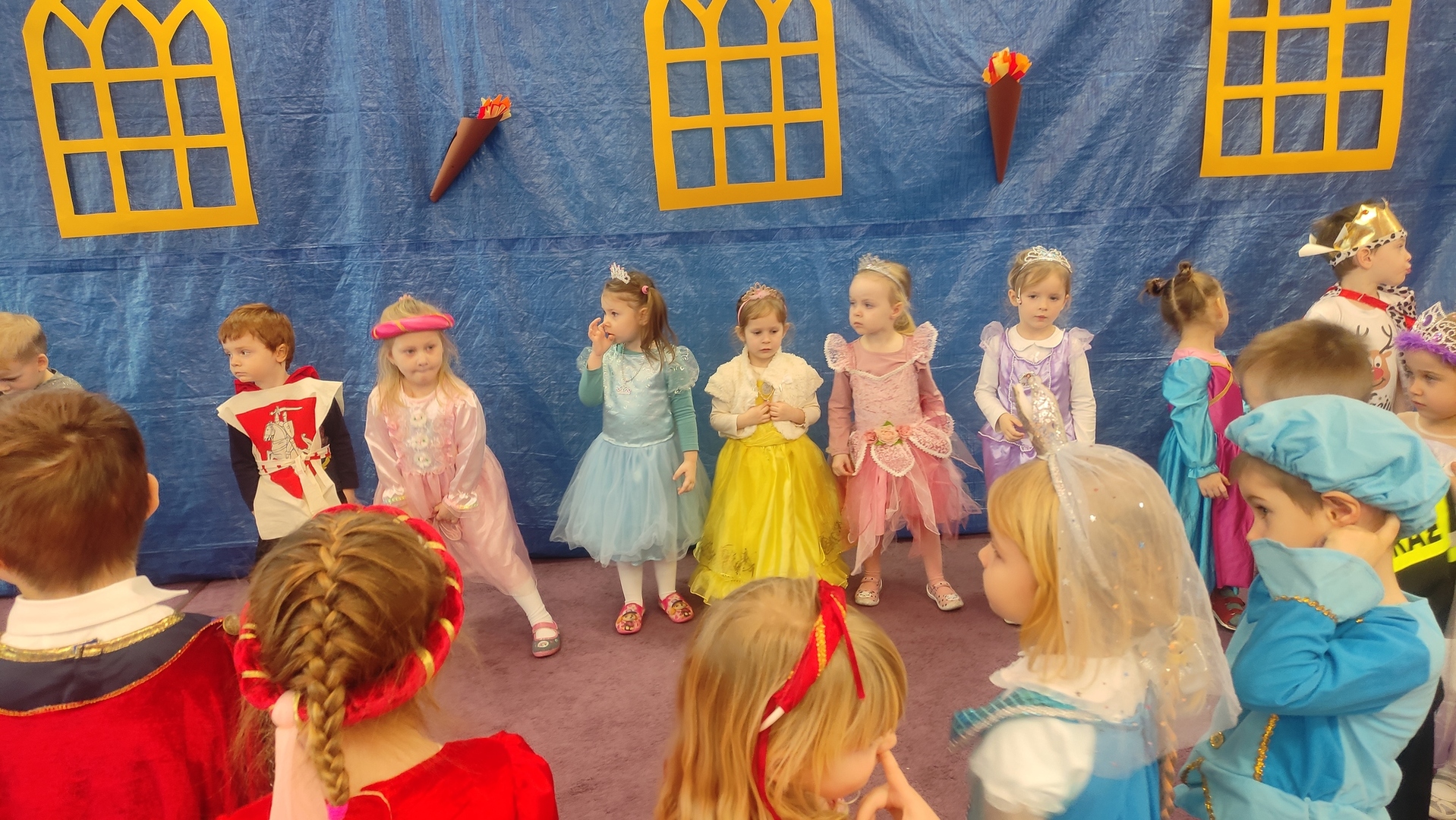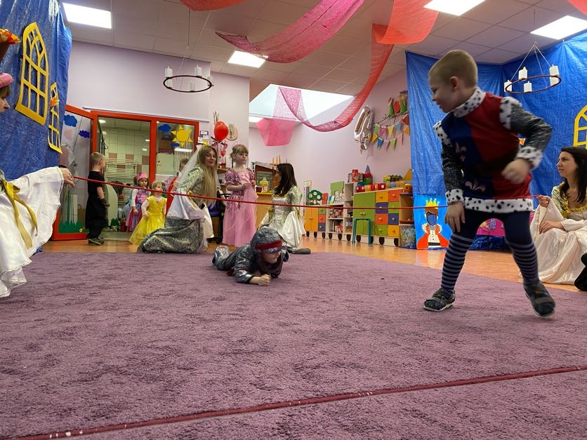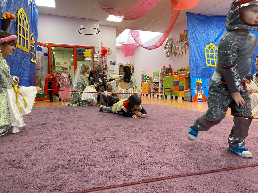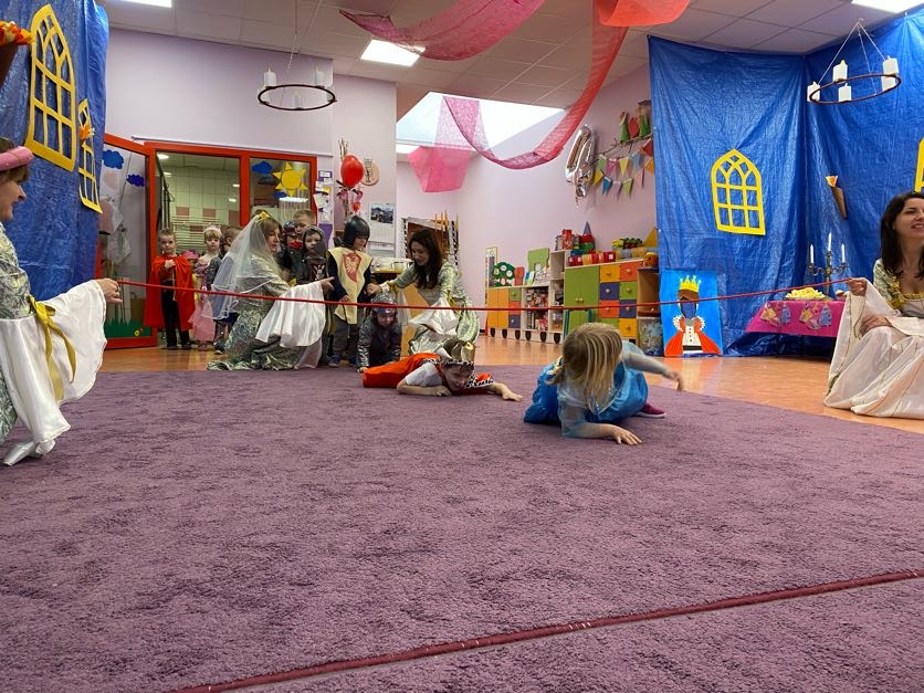 To był wyjątkowy bal, jak na królewską imprezkę przystało. Rozpoczął się od parady po moście zwodzonym, na którym wszyscy zebrani goście prezentowali swoje piękne stroje i po którym wkraczali na zamkową salę balową. Nie zabrakło wśród nich cudnych księżniczek, dzielnych rycerzy i innych mieszkańców z zamku królowej Jadwigi. Potem przyszedł czas na wspólne zabawy, tańce i konkursy, w tym: wyścigi rycerzy na koniach, księżniczek w przenoszeniu ciasteczek na tacy, czy przechodzenia pod liną. Był także „taniec zamrażaniec”, barwne pociągi i korowody, tańce w parach, kołach i inne wygibasy. Wszystkim gościom dopisywały wyborne humorki i niegasnący entuzjazm do zabawy. Bal zakończył się wspaniałą ucztą, za zorganizowanie której bardzo dziękujemy rodzicom. Dziekujemy także za pozytywny odzew w sprawie strojów na bal. Dzięki Wam mogłyśmy w pełni zrealizować naszą kanawałową wizję:).