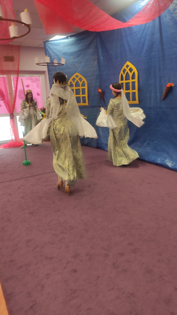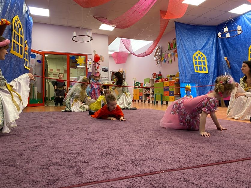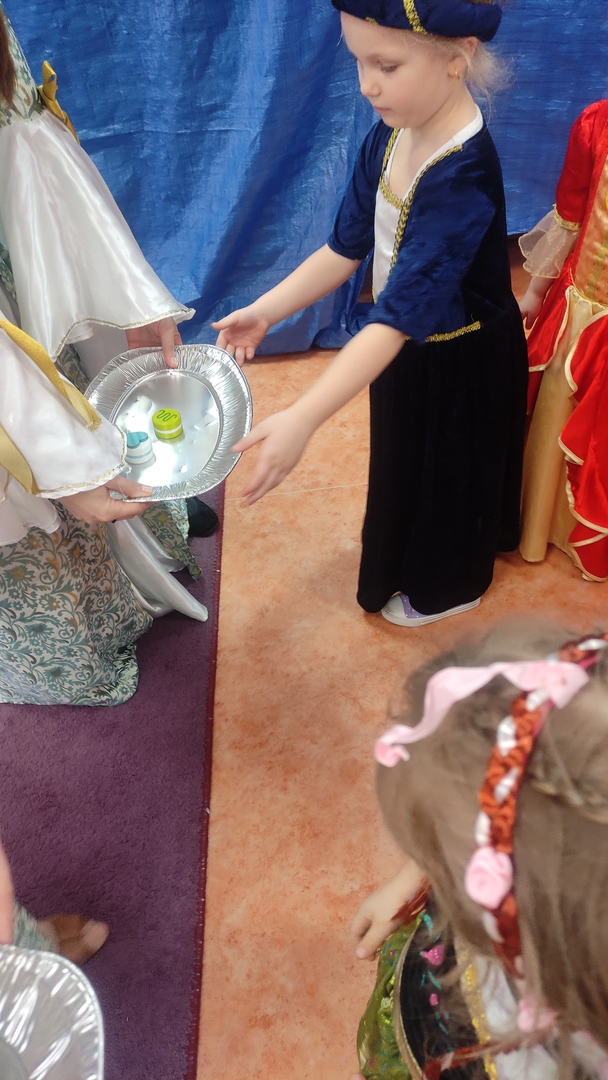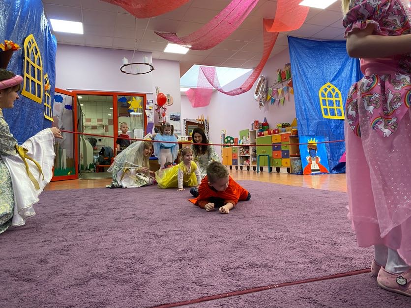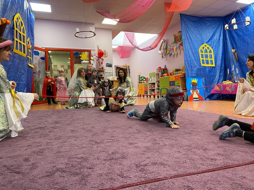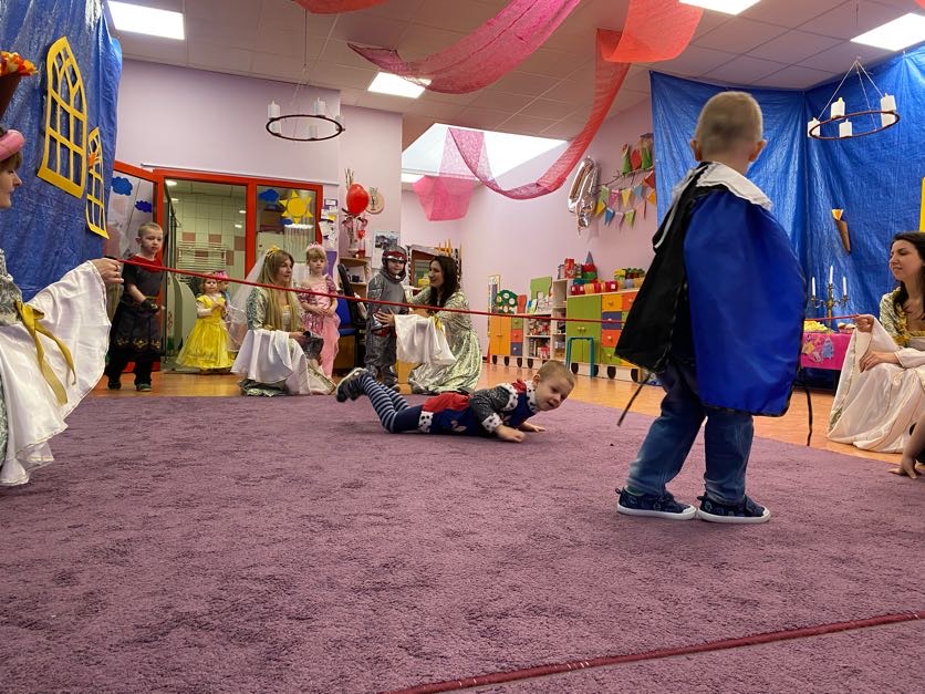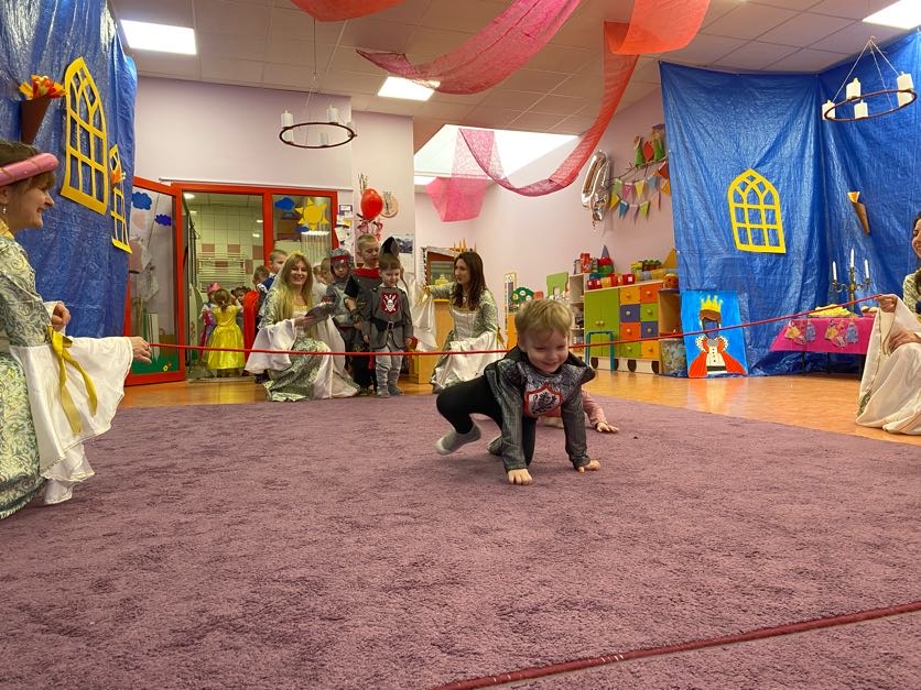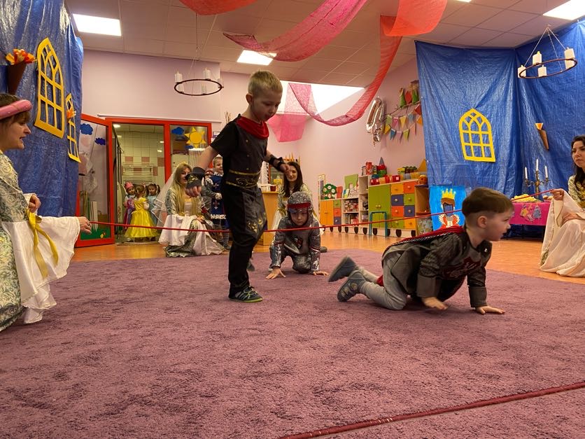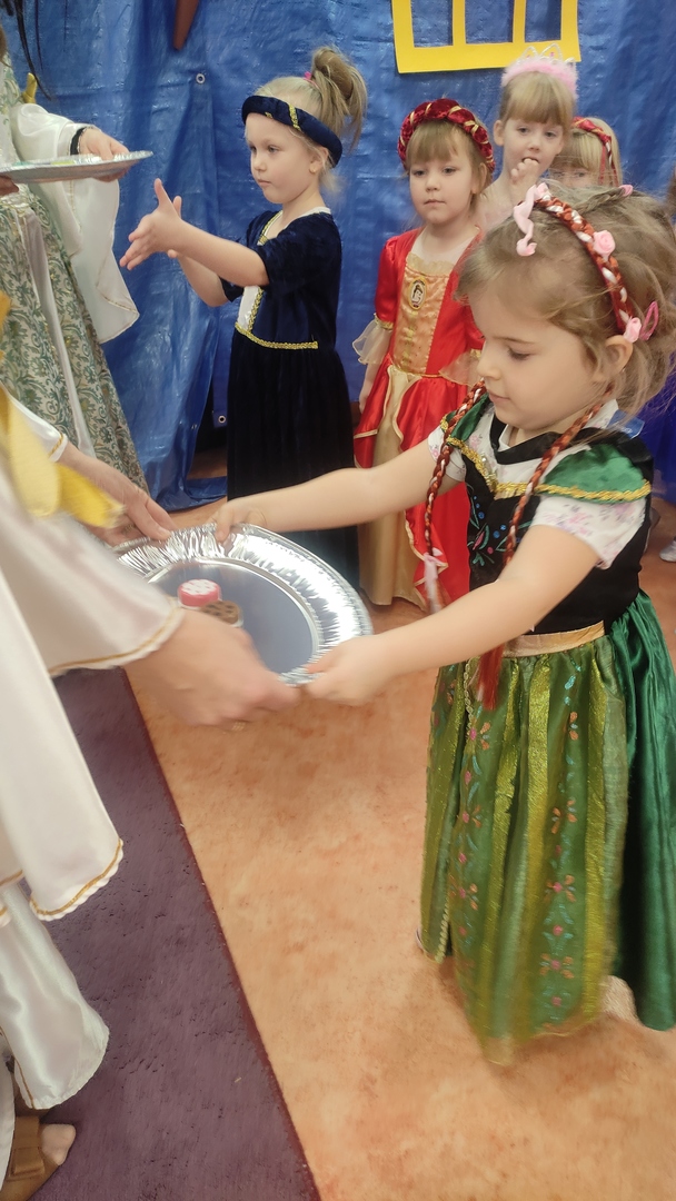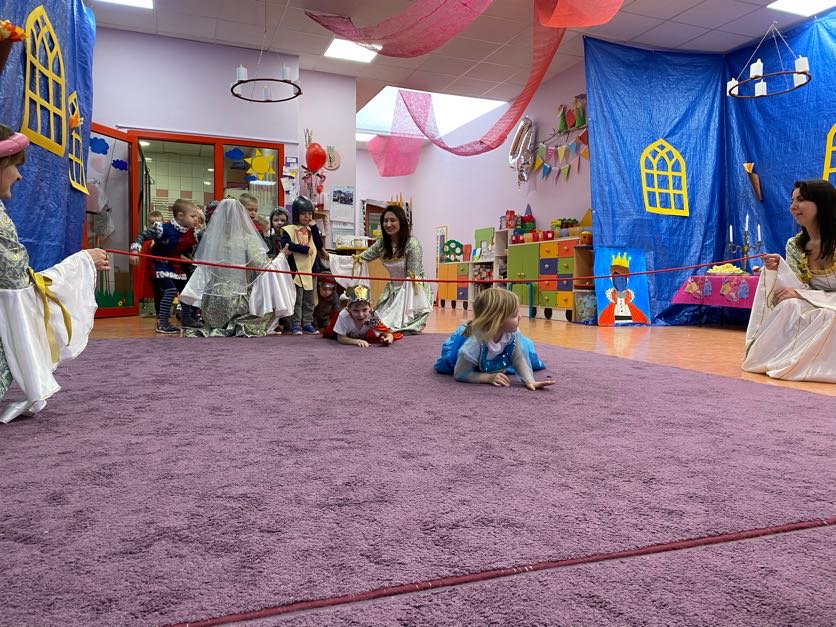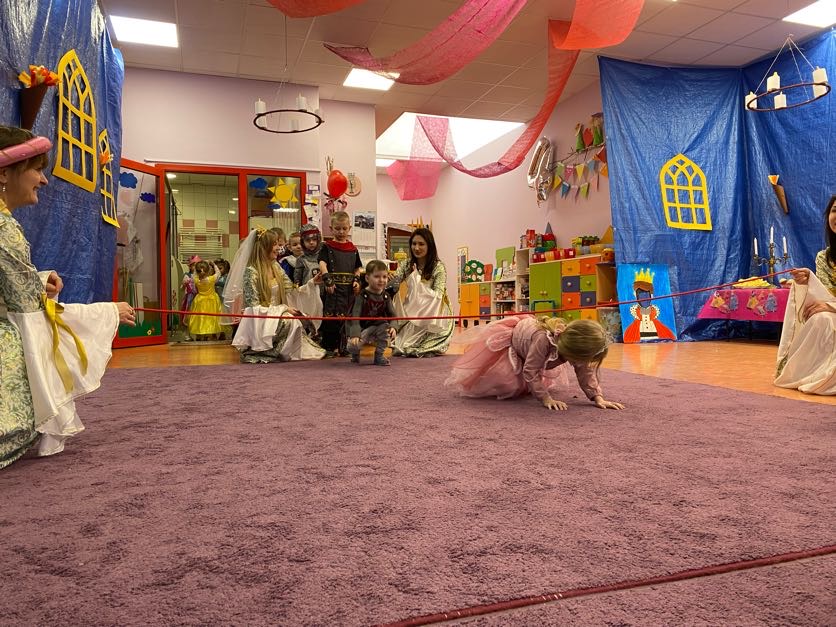 To był wyjątkowy bal, jak na królewską imprezkę przystało. Rozpoczął się od parady po moście zwodzonym, na którym wszyscy zebrani goście prezentowali swoje piękne stroje i po którym wkraczali na zamkową salę balową. Nie zabrakło wśród nich cudnych księżniczek, dzielnych rycerzy i innych mieszkańców z zamku królowej Jadwigi. Potem przyszedł czas na wspólne zabawy, tańce i konkursy, w tym: wyścigi rycerzy na koniach, księżniczek w przenoszeniu ciasteczek na tacy, czy przechodzenia pod liną. Był także „taniec zamrażaniec”, barwne pociągi i korowody, tańce w parach, kołach i inne wygibasy. Wszystkim gościom dopisywały wyborne humorki i niegasnący entuzjazm do zabawy. Bal zakończył się wspaniałą ucztą, za zorganizowanie której bardzo dziękujemy rodzicom. Dziekujemy także za pozytywny odzew w sprawie strojów na bal. Dzięki Wam mogłyśmy w pełni zrealizować naszą kanawałową wizję:).