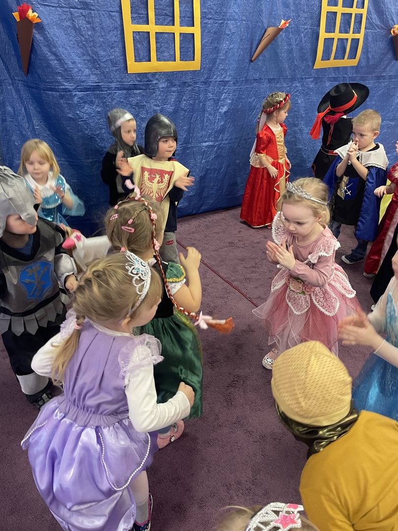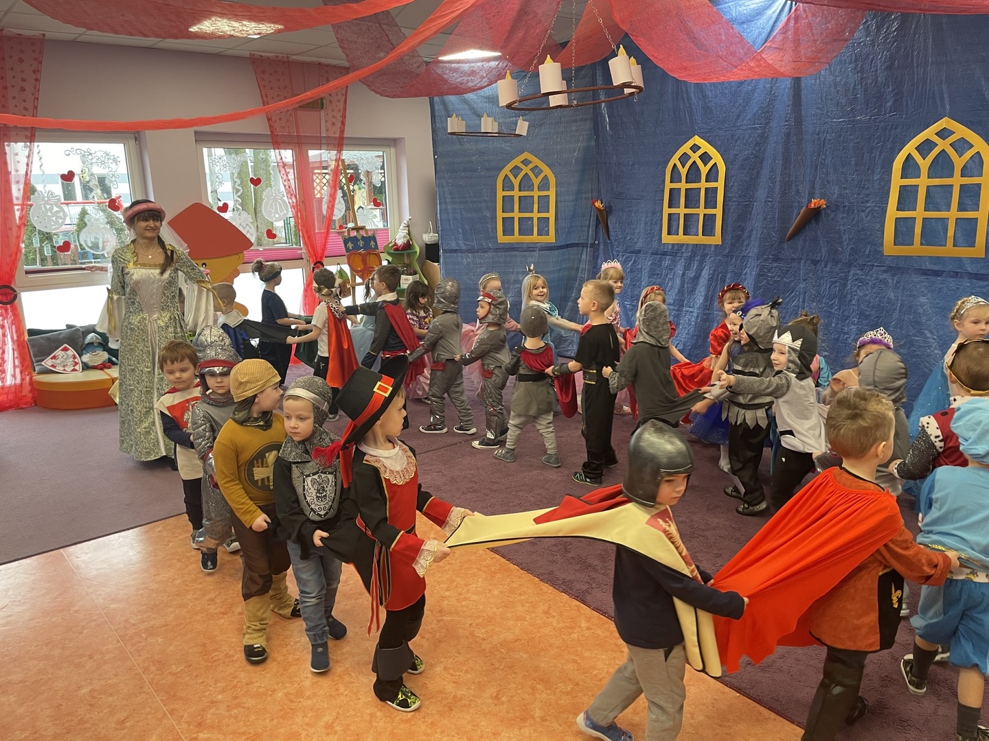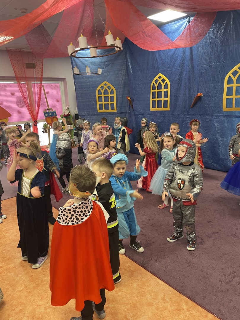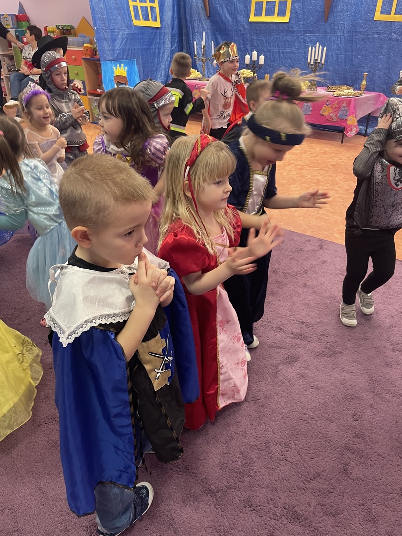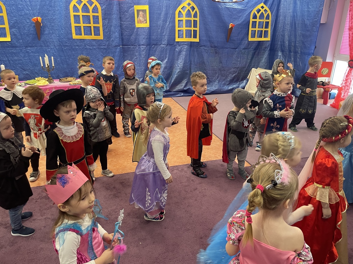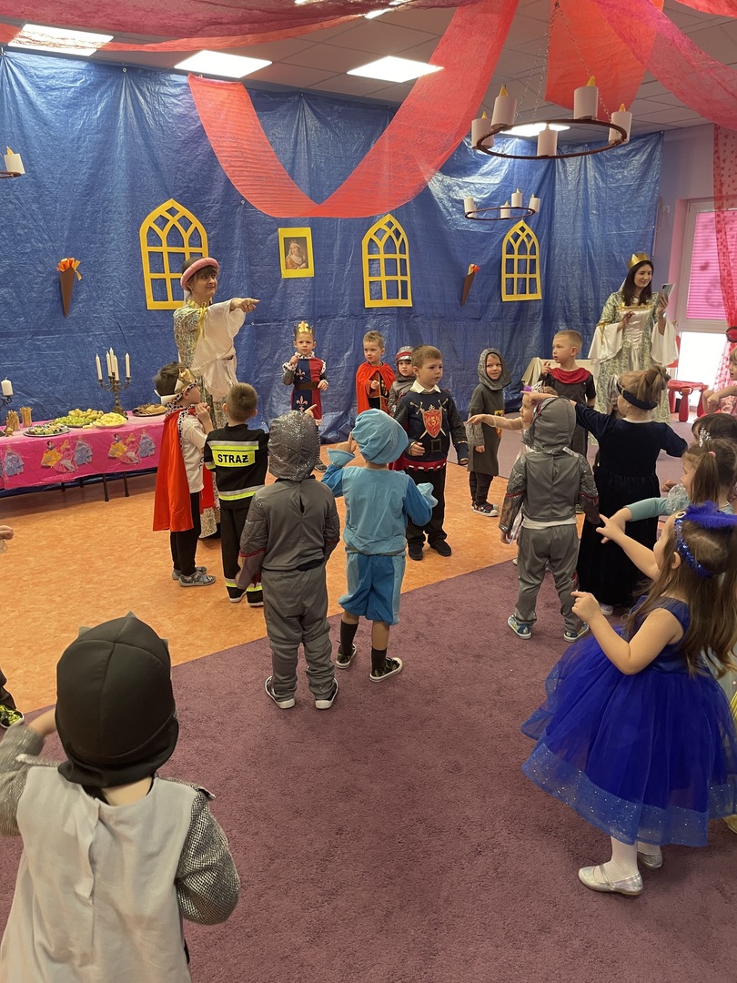 To był wyjątkowy bal, jak na królewską imprezkę przystało. Rozpoczął się od parady po moście zwodzonym, na którym wszyscy zebrani goście prezentowali swoje piękne stroje i po którym wkraczali na zamkową salę balową. Nie zabrakło wśród nich cudnych księżniczek, dzielnych rycerzy i innych mieszkańców z zamku królowej Jadwigi. Potem przyszedł czas na wspólne zabawy, tańce i konkursy, w tym: wyścigi rycerzy na koniach, księżniczek w przenoszeniu ciasteczek na tacy, czy przechodzenia pod liną. Był także „taniec zamrażaniec”, barwne pociągi i korowody, tańce w parach, kołach i inne wygibasy. Wszystkim gościom dopisywały wyborne humorki i niegasnący entuzjazm do zabawy. Bal zakończył się wspaniałą ucztą, za zorganizowanie której bardzo dziękujemy rodzicom. Dziekujemy także za pozytywny odzew w sprawie strojów na bal. Dzięki Wam mogłyśmy w pełni zrealizować naszą kanawałową wizję:).