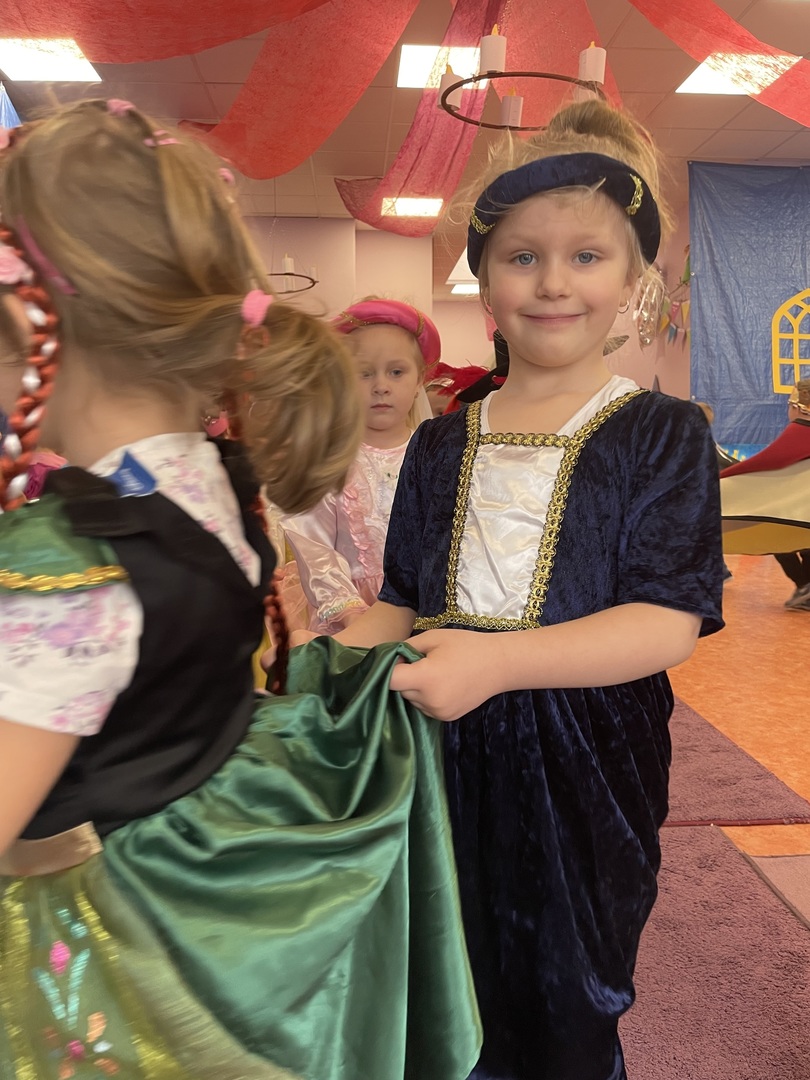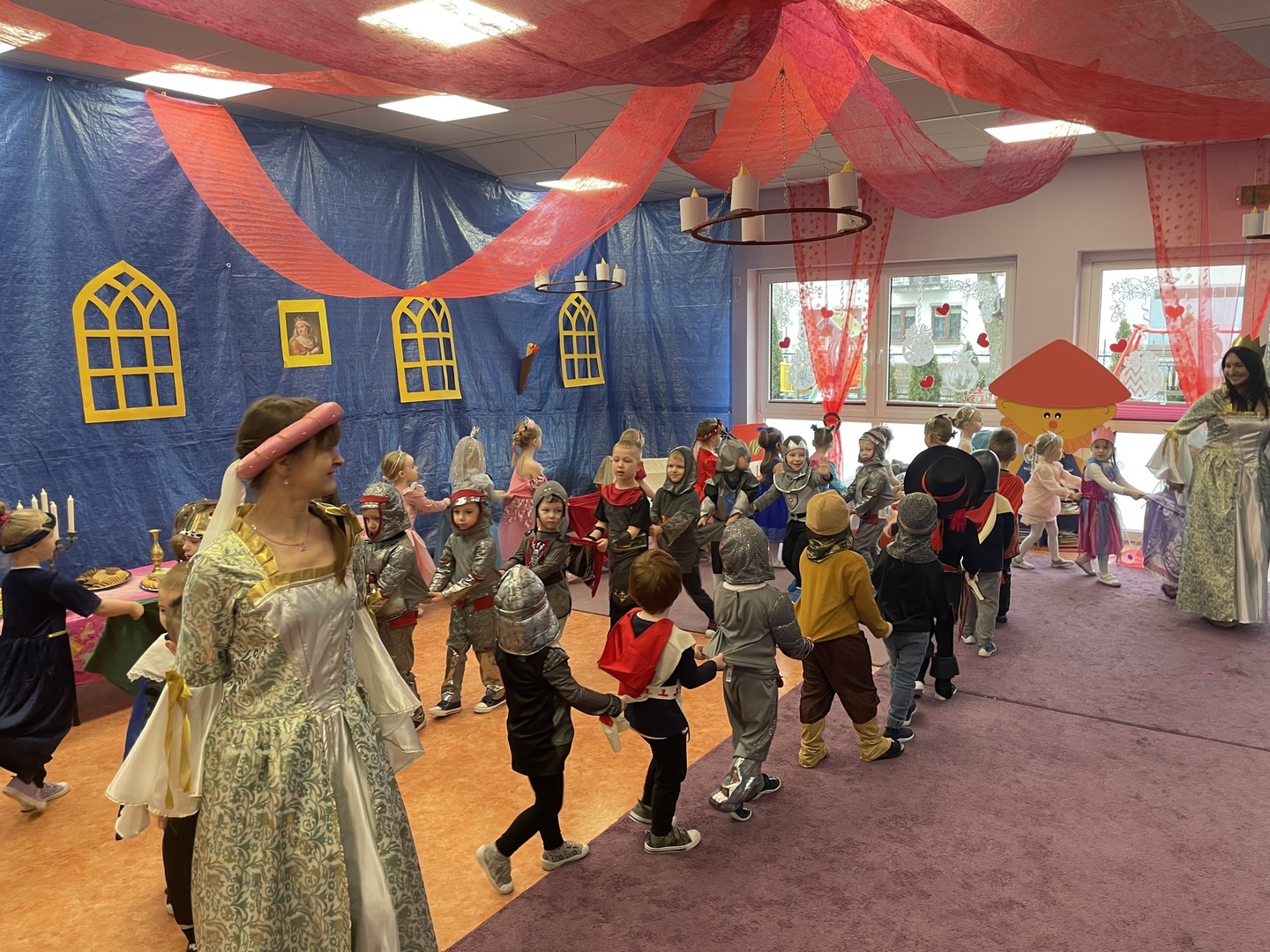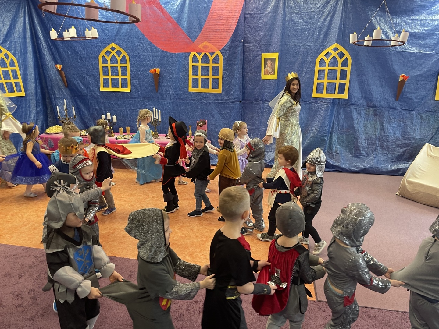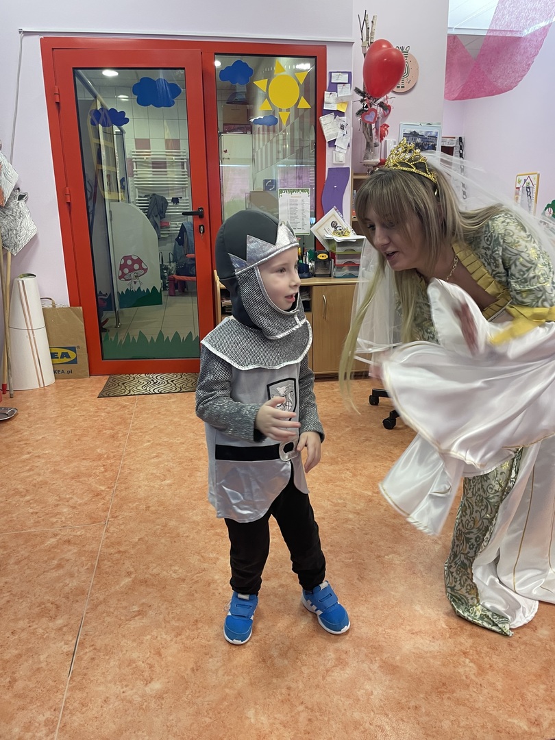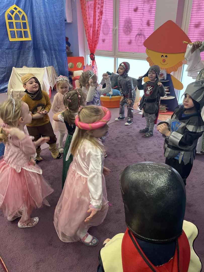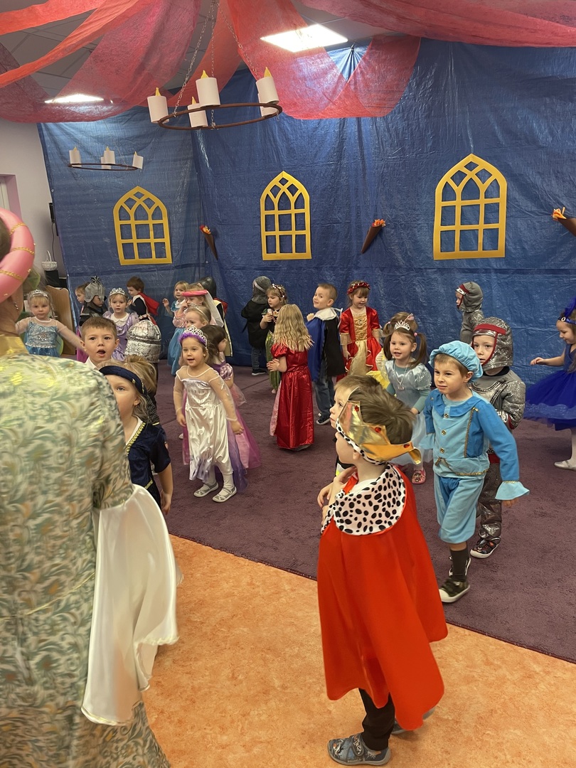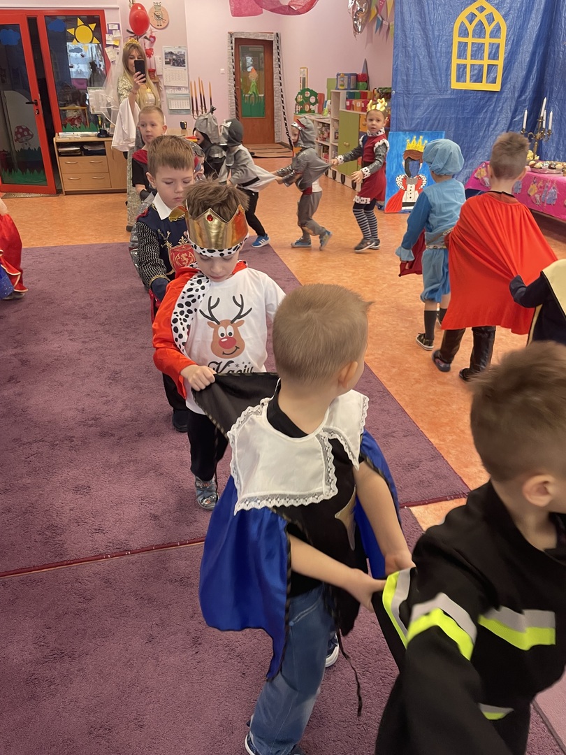 To był wyjątkowy bal, jak na królewską imprezkę przystało. Rozpoczął się od parady po moście zwodzonym, na którym wszyscy zebrani goście prezentowali swoje piękne stroje i po którym wkraczali na zamkową salę balową. Nie zabrakło wśród nich cudnych księżniczek, dzielnych rycerzy i innych mieszkańców z zamku królowej Jadwigi. Potem przyszedł czas na wspólne zabawy, tańce i konkursy, w tym: wyścigi rycerzy na koniach, księżniczek w przenoszeniu ciasteczek na tacy, czy przechodzenia pod liną. Był także „taniec zamrażaniec”, barwne pociągi i korowody, tańce w parach, kołach i inne wygibasy. Wszystkim gościom dopisywały wyborne humorki i niegasnący entuzjazm do zabawy. Bal zakończył się wspaniałą ucztą, za zorganizowanie której bardzo dziękujemy rodzicom. Dziekujemy także za pozytywny odzew w sprawie strojów na bal. Dzięki Wam mogłyśmy w pełni zrealizować naszą kanawałową wizję:).