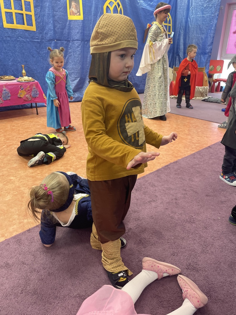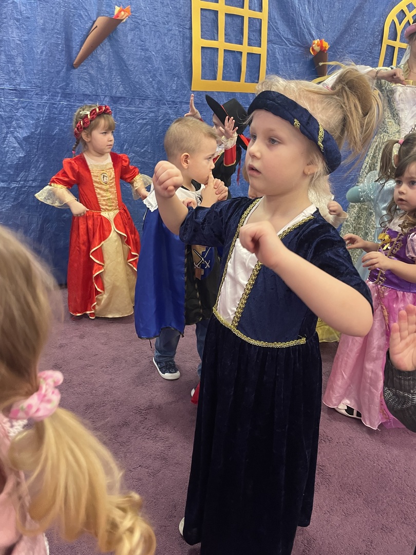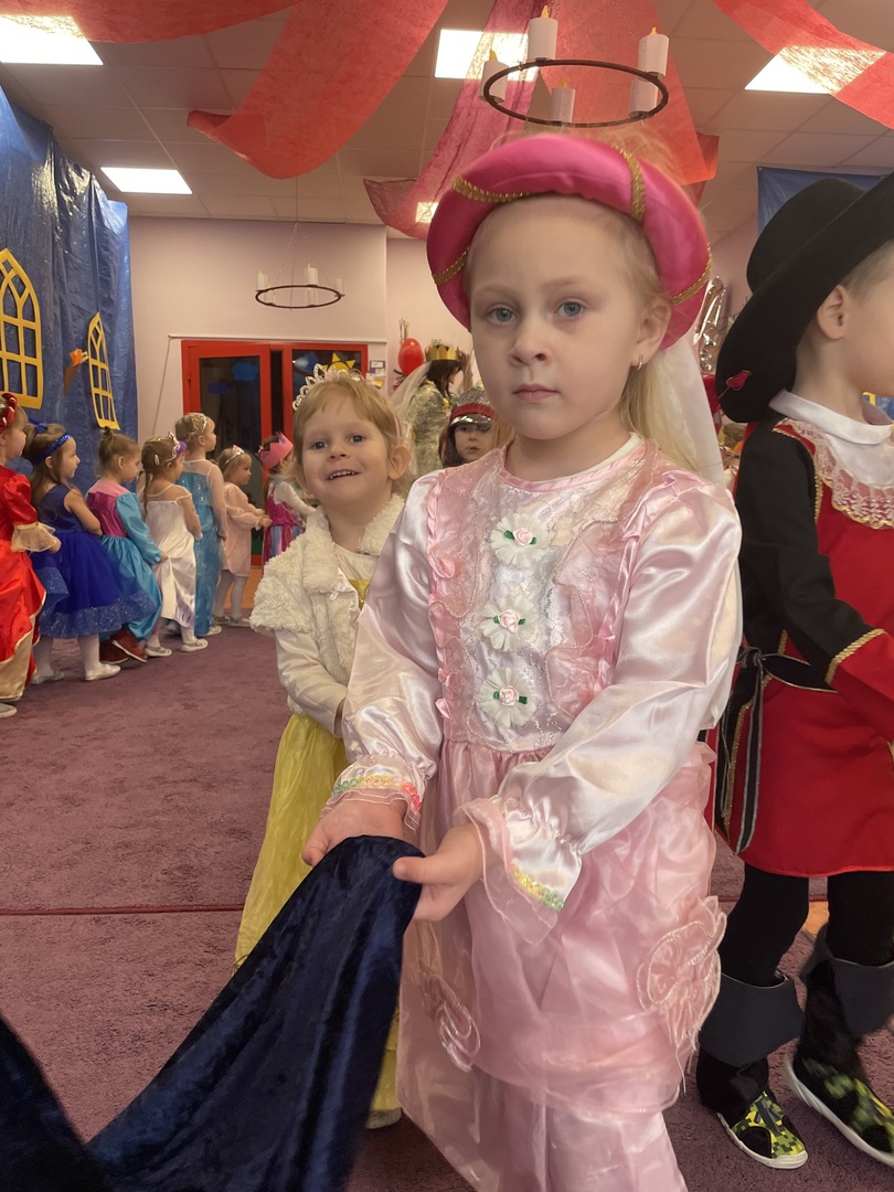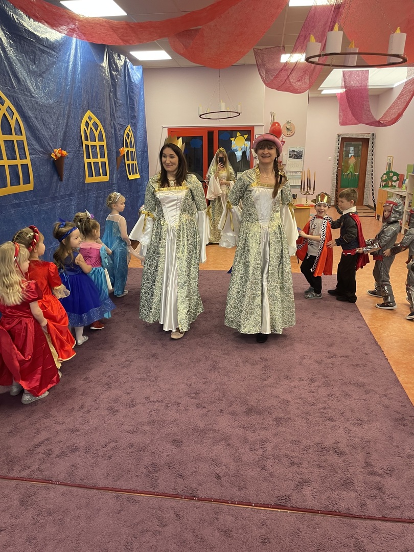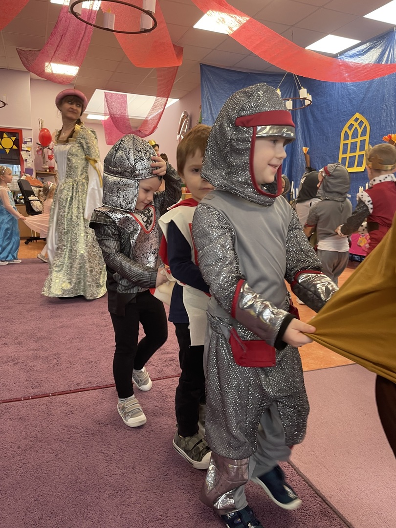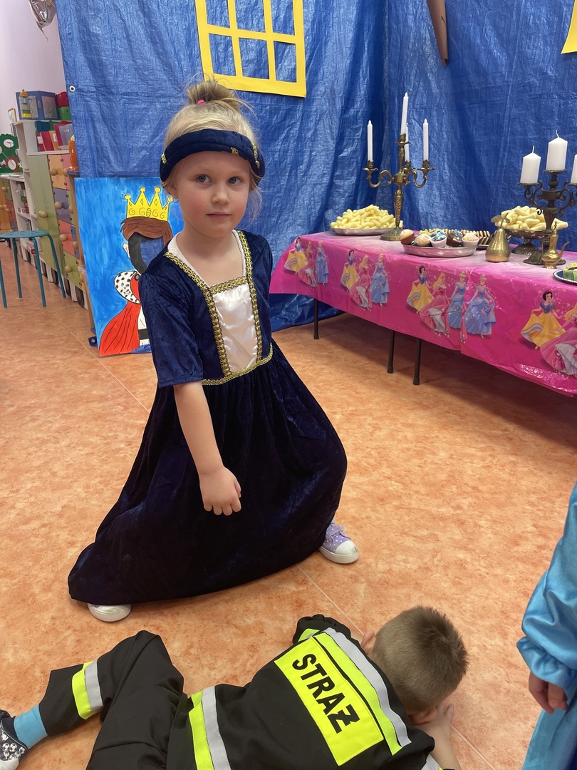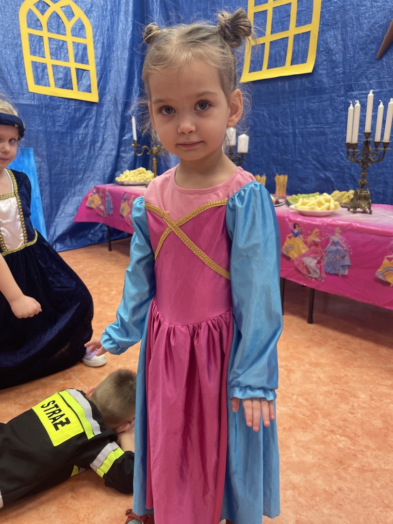 To był wyjątkowy bal, jak na królewską imprezkę przystało. Rozpoczął się od parady po moście zwodzonym, na którym wszyscy zebrani goście prezentowali swoje piękne stroje i po którym wkraczali na zamkową salę balową. Nie zabrakło wśród nich cudnych księżniczek, dzielnych rycerzy i innych mieszkańców z zamku królowej Jadwigi. Potem przyszedł czas na wspólne zabawy, tańce i konkursy, w tym: wyścigi rycerzy na koniach, księżniczek w przenoszeniu ciasteczek na tacy, czy przechodzenia pod liną. Był także „taniec zamrażaniec”, barwne pociągi i korowody, tańce w parach, kołach i inne wygibasy. Wszystkim gościom dopisywały wyborne humorki i niegasnący entuzjazm do zabawy. Bal zakończył się wspaniałą ucztą, za zorganizowanie której bardzo dziękujemy rodzicom. Dziekujemy także za pozytywny odzew w sprawie strojów na bal. Dzięki Wam mogłyśmy w pełni zrealizować naszą kanawałową wizję:).