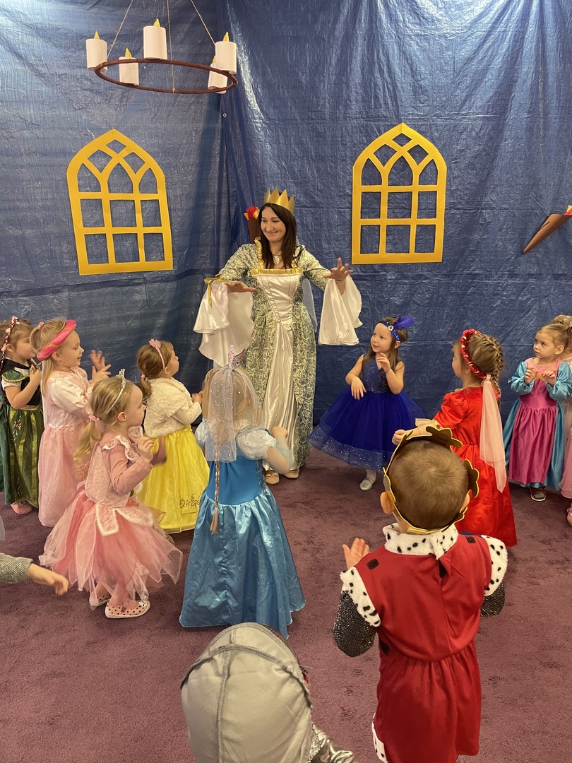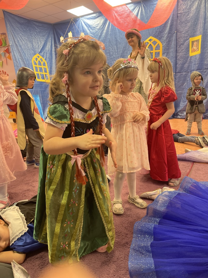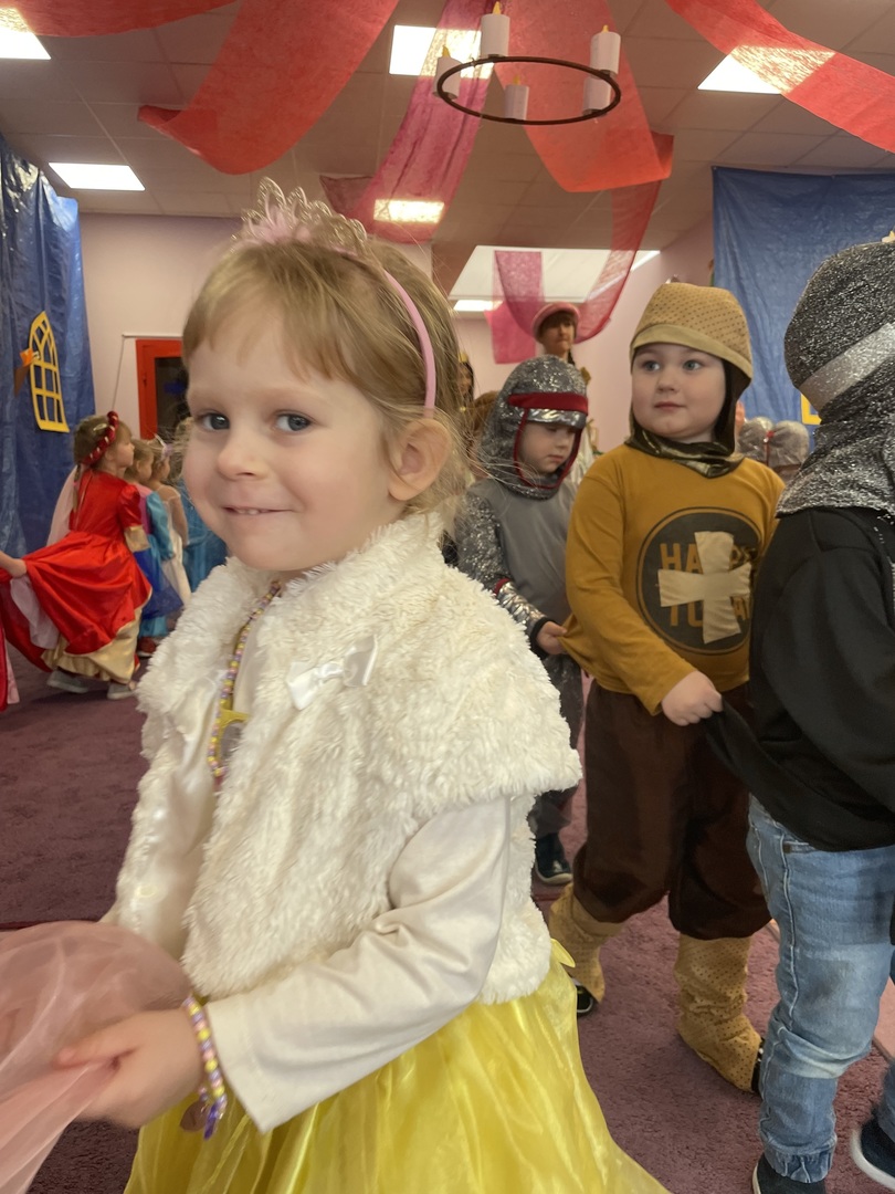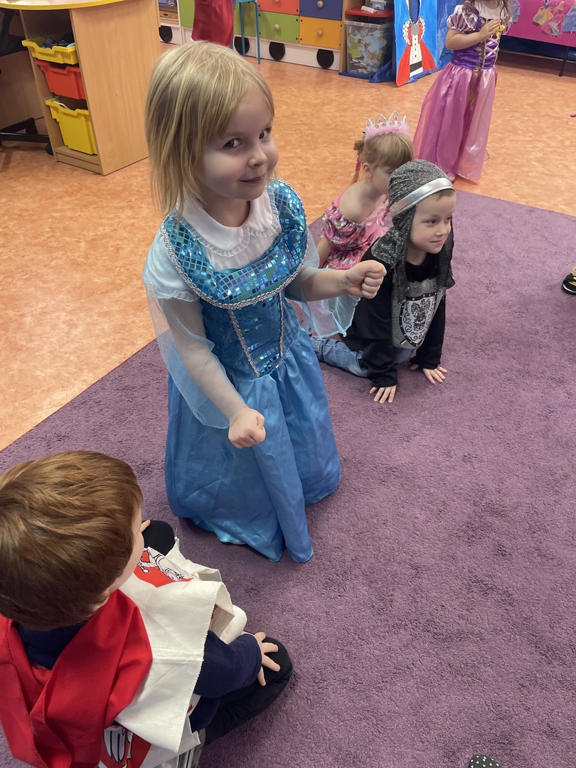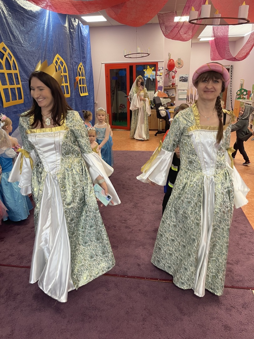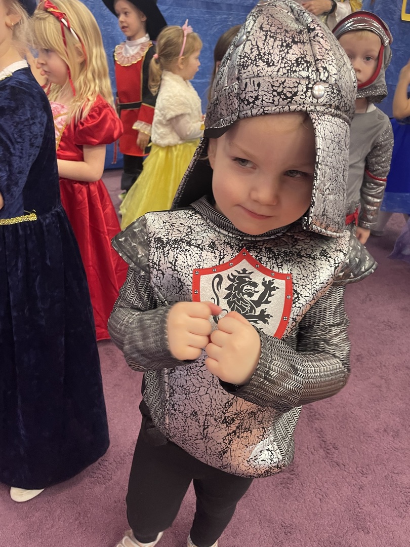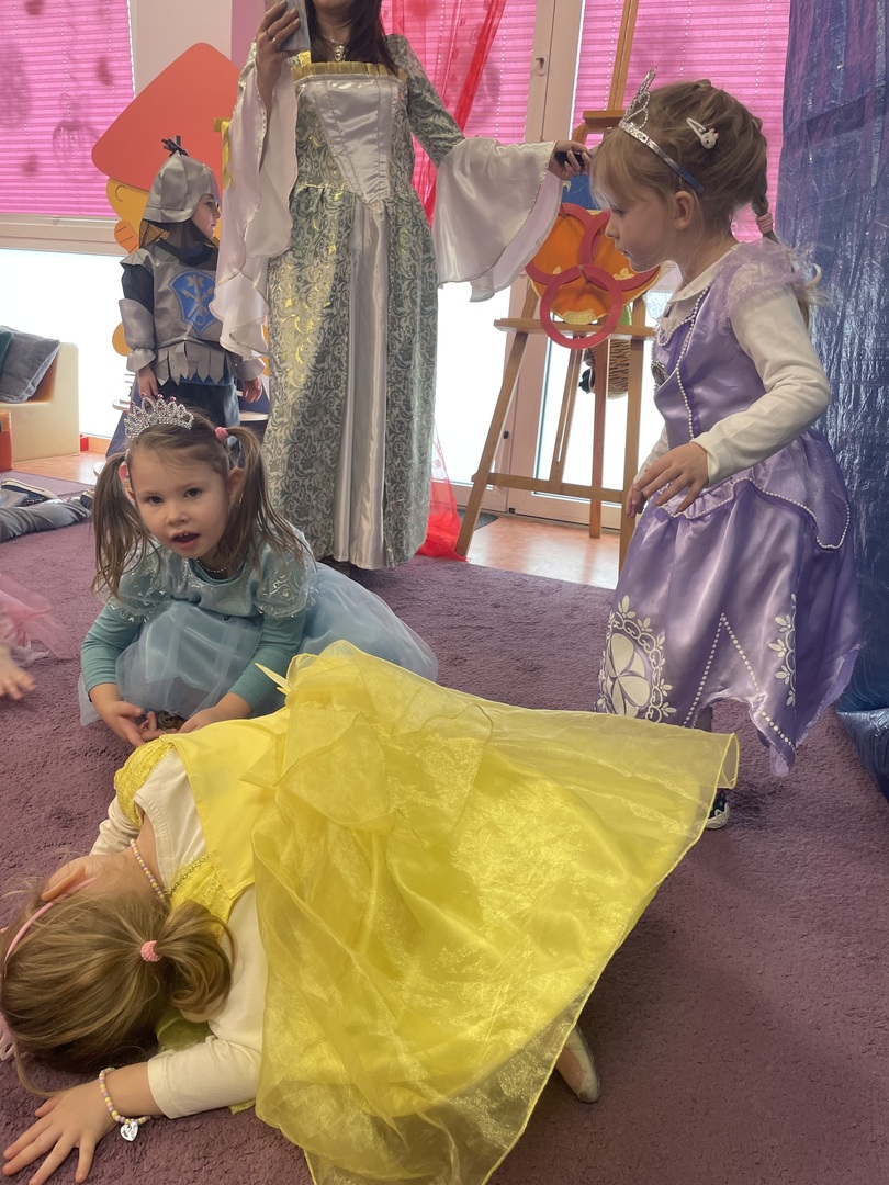 To był wyjątkowy bal, jak na królewską imprezkę przystało. Rozpoczął się od parady po moście zwodzonym, na którym wszyscy zebrani goście prezentowali swoje piękne stroje i po którym wkraczali na zamkową salę balową. Nie zabrakło wśród nich cudnych księżniczek, dzielnych rycerzy i innych mieszkańców z zamku królowej Jadwigi. Potem przyszedł czas na wspólne zabawy, tańce i konkursy, w tym: wyścigi rycerzy na koniach, księżniczek w przenoszeniu ciasteczek na tacy, czy przechodzenia pod liną. Był także „taniec zamrażaniec”, barwne pociągi i korowody, tańce w parach, kołach i inne wygibasy. Wszystkim gościom dopisywały wyborne humorki i niegasnący entuzjazm do zabawy. Bal zakończył się wspaniałą ucztą, za zorganizowanie której bardzo dziękujemy rodzicom. Dziekujemy także za pozytywny odzew w sprawie strojów na bal. Dzięki Wam mogłyśmy w pełni zrealizować naszą kanawałową wizję:).