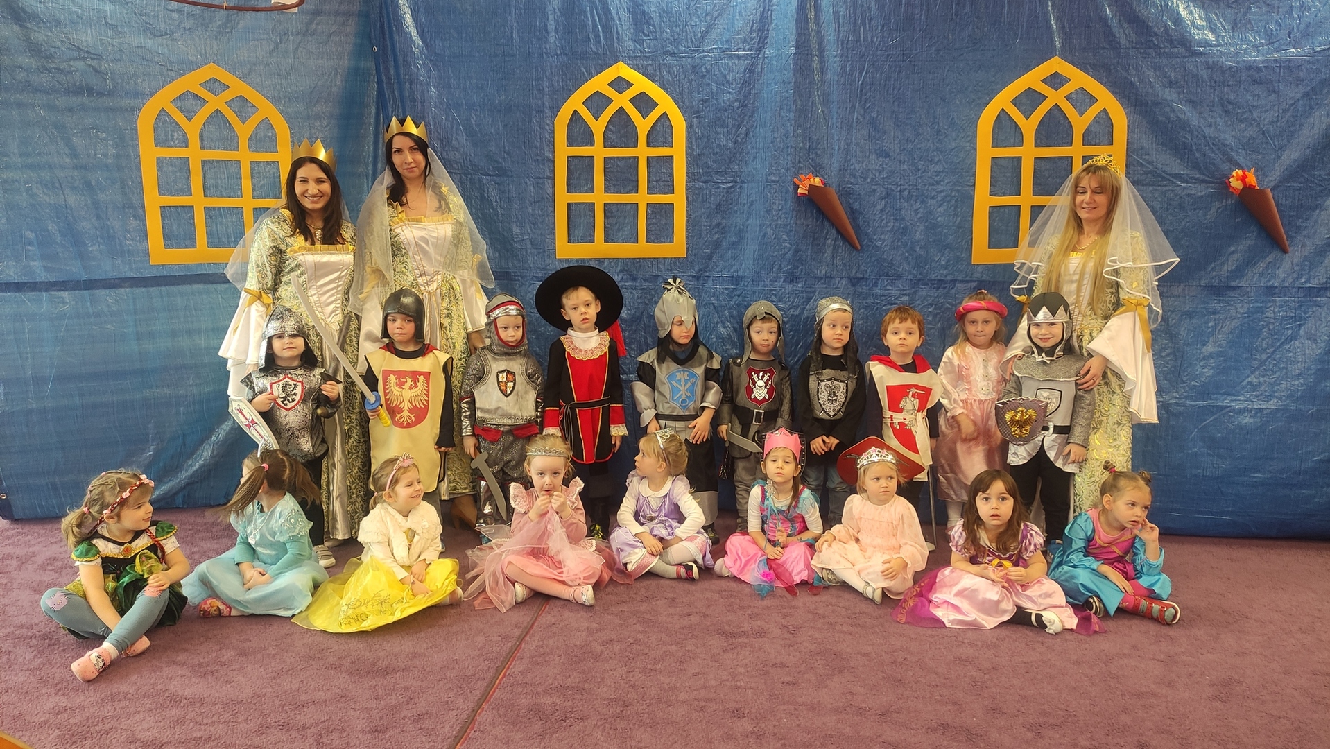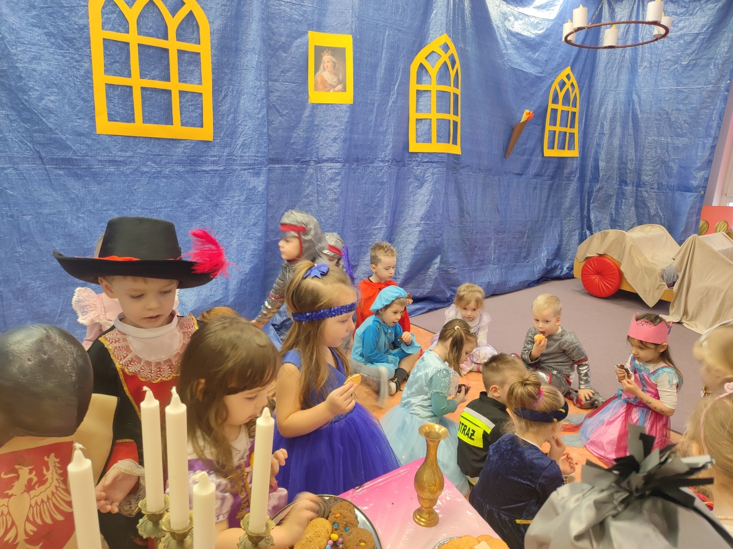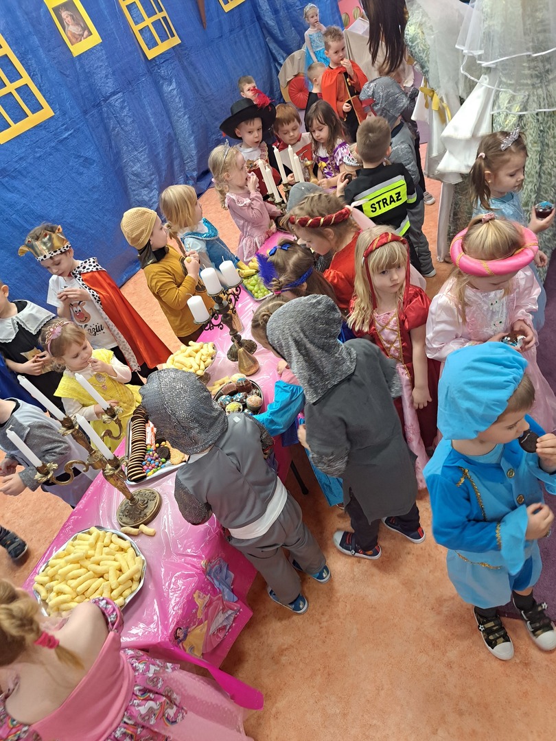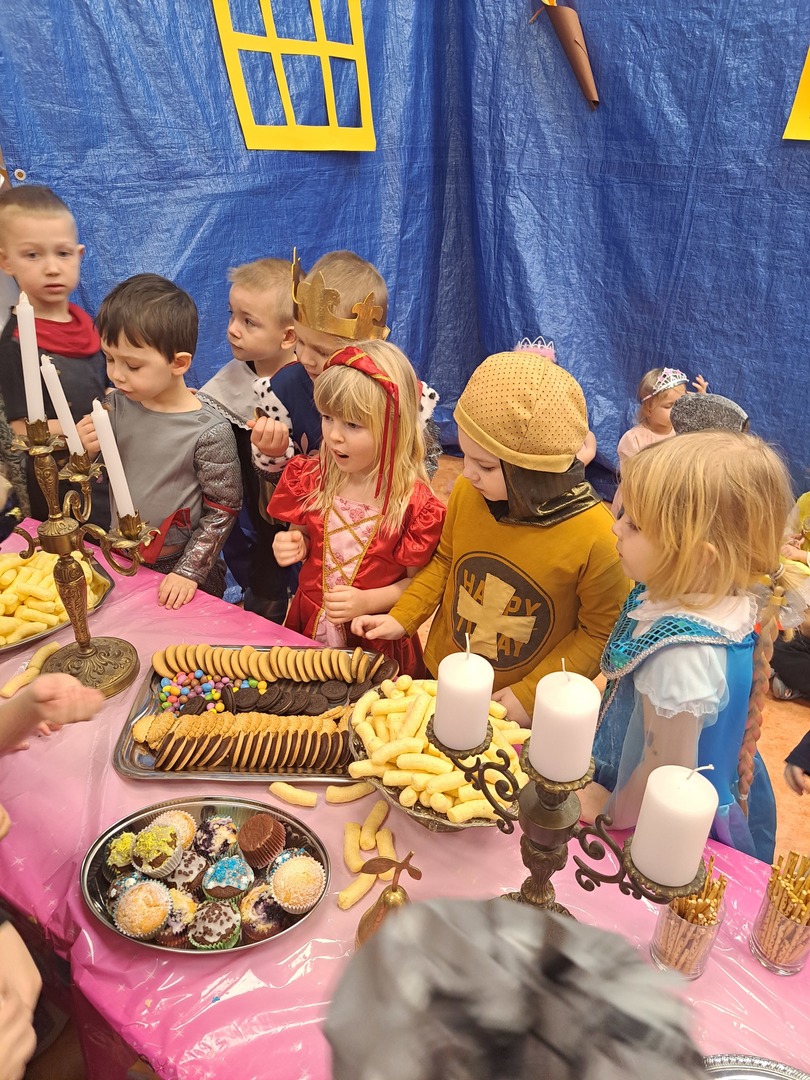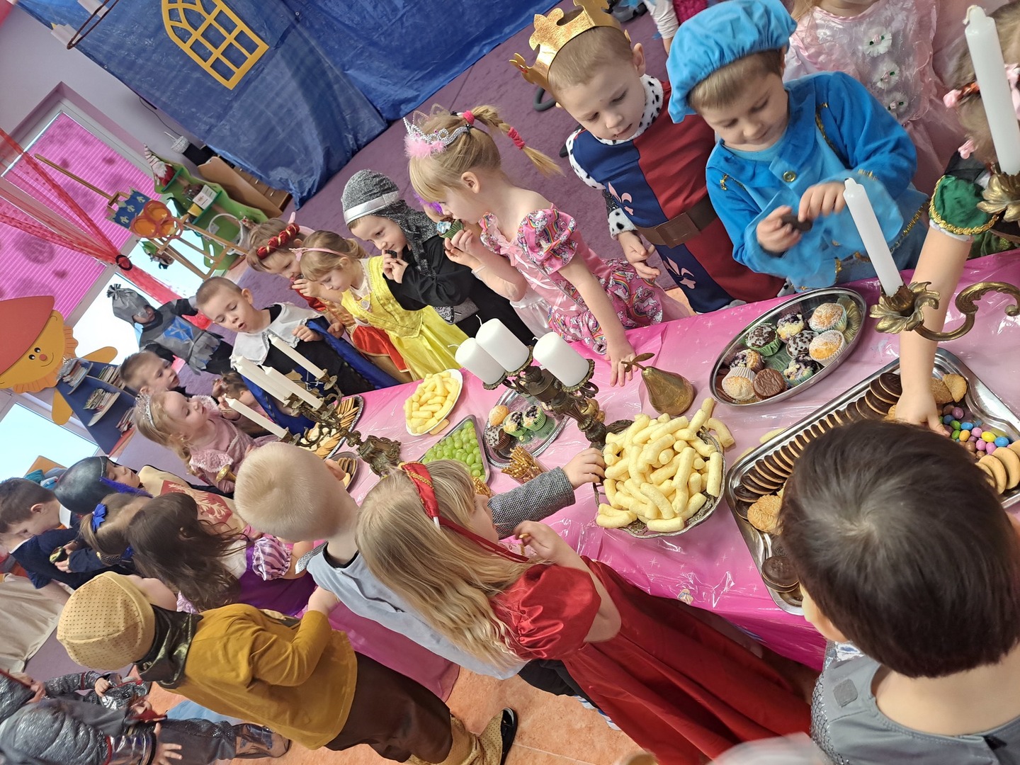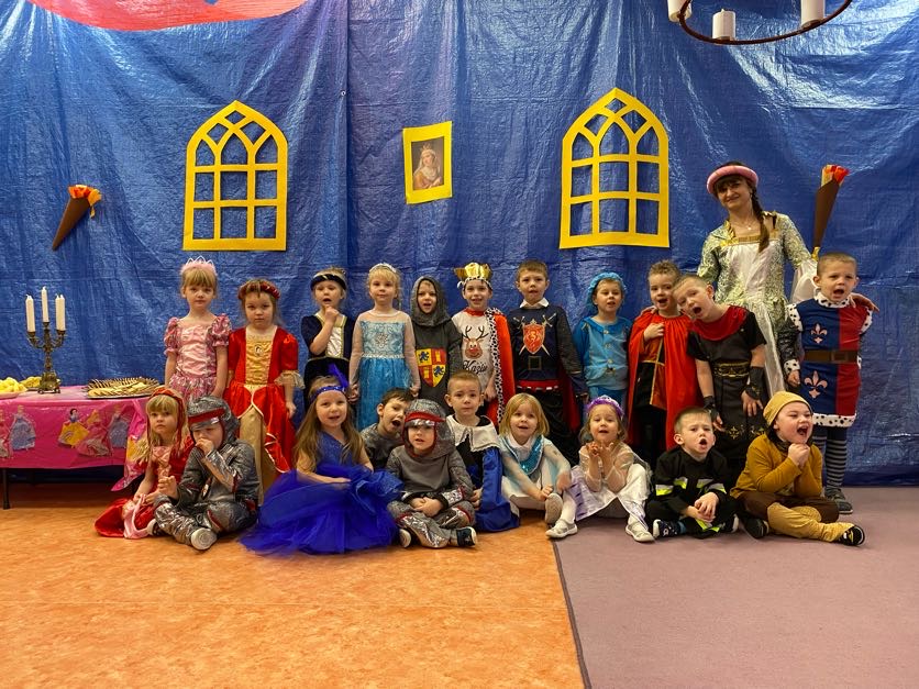 To był wyjątkowy bal, jak na królewską imprezkę przystało. Rozpoczął się od parady po moście zwodzonym, na którym wszyscy zebrani goście prezentowali swoje piękne stroje i po którym wkraczali na zamkową salę balową. Nie zabrakło wśród nich cudnych księżniczek, dzielnych rycerzy i innych mieszkańców z zamku królowej Jadwigi. Potem przyszedł czas na wspólne zabawy, tańce i konkursy, w tym: wyścigi rycerzy na koniach, księżniczek w przenoszeniu ciasteczek na tacy, czy przechodzenia pod liną. Był także „taniec zamrażaniec”, barwne pociągi i korowody, tańce w parach, kołach i inne wygibasy. Wszystkim gościom dopisywały wyborne humorki i niegasnący entuzjazm do zabawy. Bal zakończył się wspaniałą ucztą, za zorganizowanie której bardzo dziękujemy rodzicom. Dziekujemy także za pozytywny odzew w sprawie strojów na bal. Dzięki Wam mogłyśmy w pełni zrealizować naszą kanawałową wizję:).