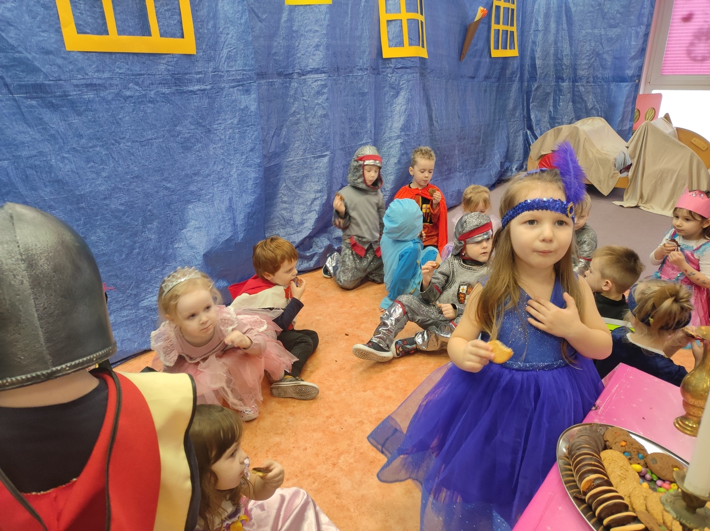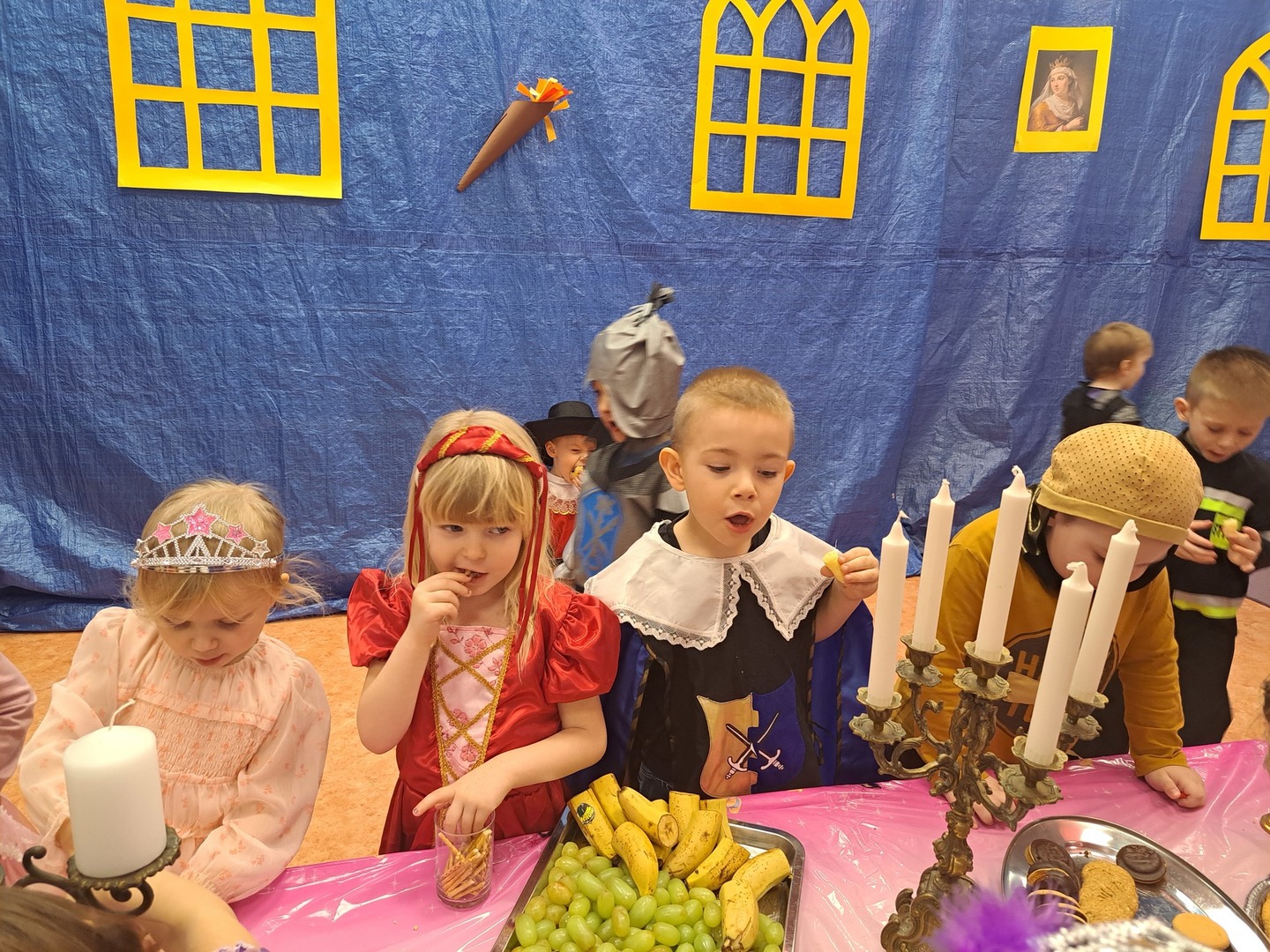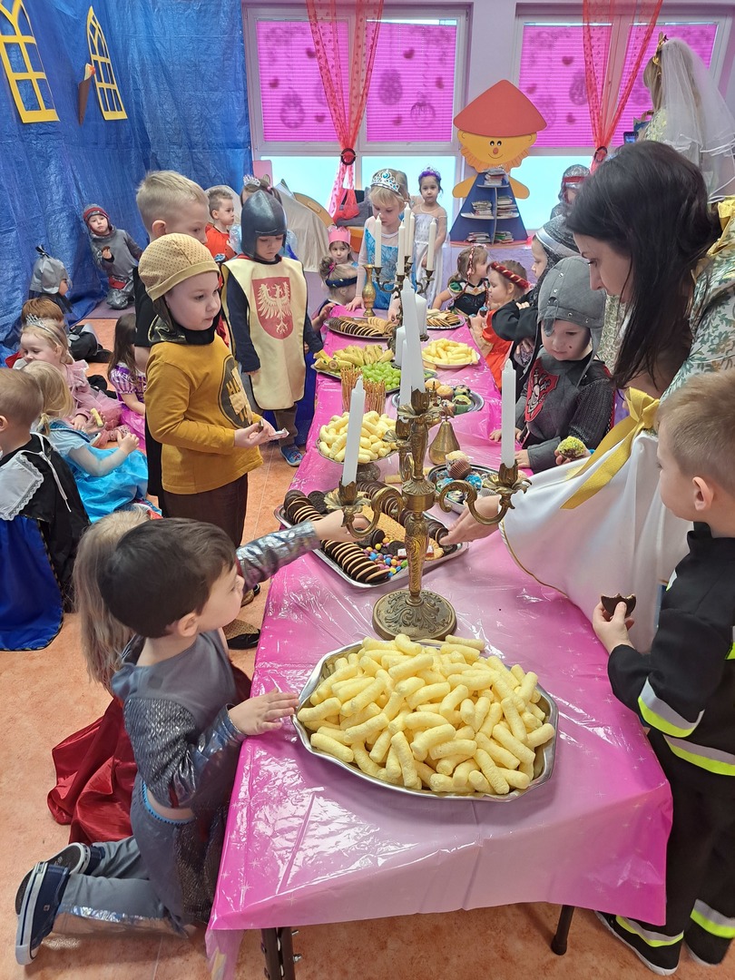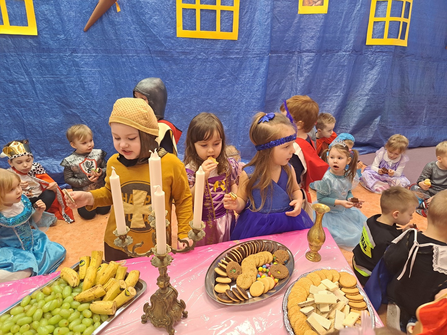 To był wyjątkowy bal, jak na królewską imprezkę przystało. Rozpoczął się od parady po moście zwodzonym, na którym wszyscy zebrani goście prezentowali swoje piękne stroje i po którym wkraczali na zamkową salę balową. Nie zabrakło wśród nich cudnych księżniczek, dzielnych rycerzy i innych mieszkańców z zamku królowej Jadwigi. Potem przyszedł czas na wspólne zabawy, tańce i konkursy, w tym: wyścigi rycerzy na koniach, księżniczek w przenoszeniu ciasteczek na tacy, czy przechodzenia pod liną. Był także „taniec zamrażaniec”, barwne pociągi i korowody, tańce w parach, kołach i inne wygibasy. Wszystkim gościom dopisywały wyborne humorki i niegasnący entuzjazm do zabawy. Bal zakończył się wspaniałą ucztą, za zorganizowanie której bardzo dziękujemy rodzicom. Dziekujemy także za pozytywny odzew w sprawie strojów na bal. Dzięki Wam mogłyśmy w pełni zrealizować naszą kanawałową wizję:).