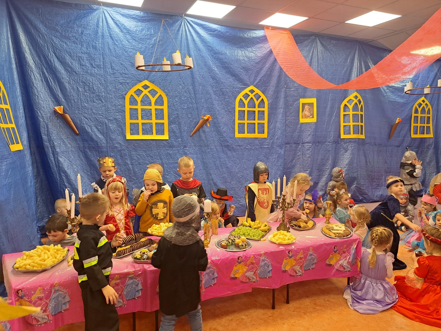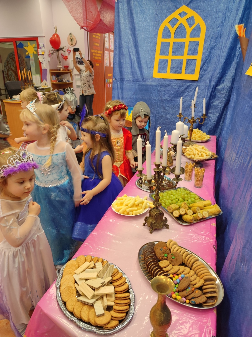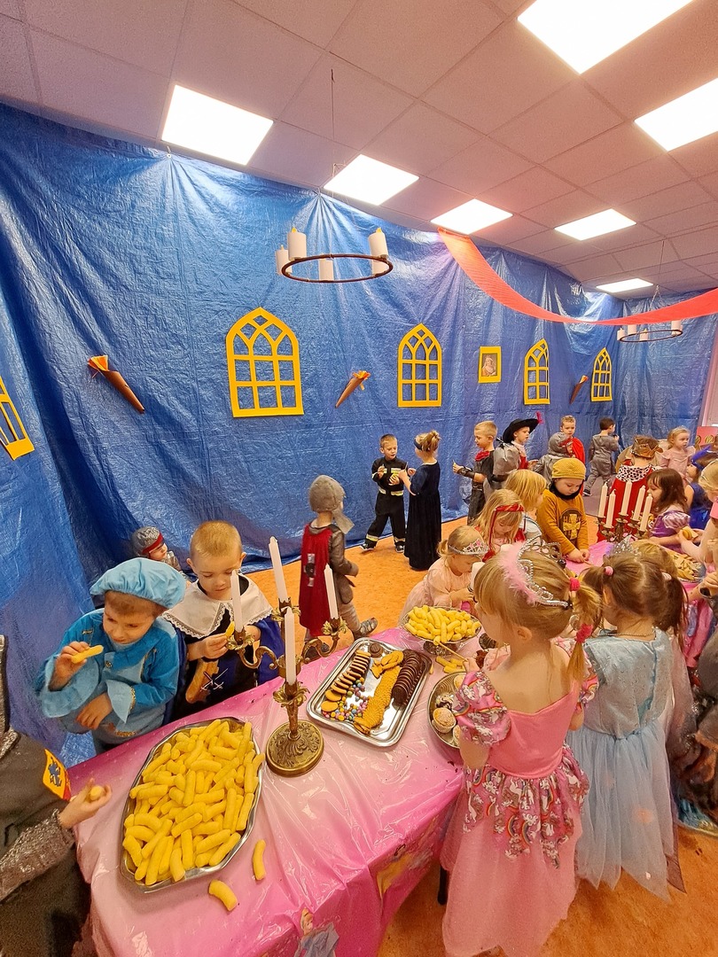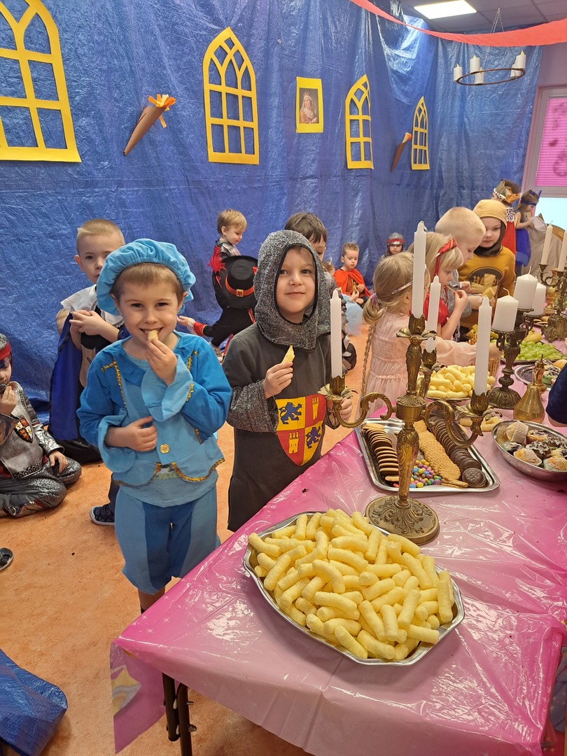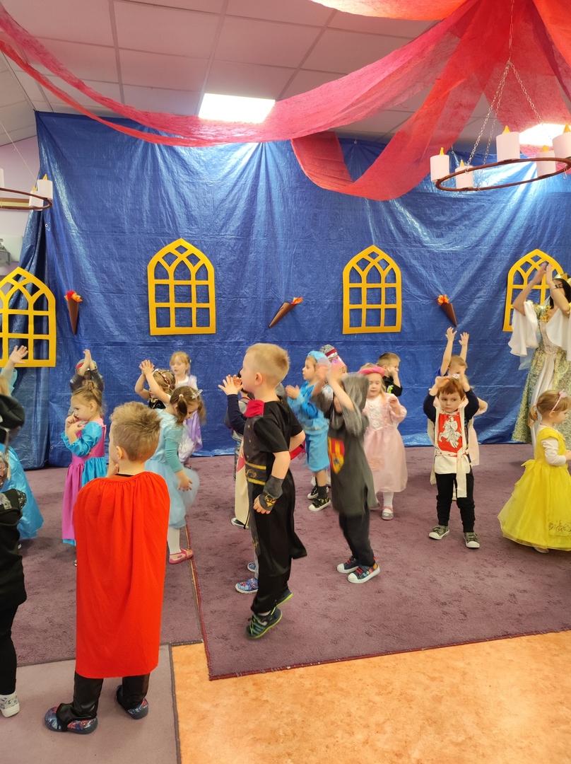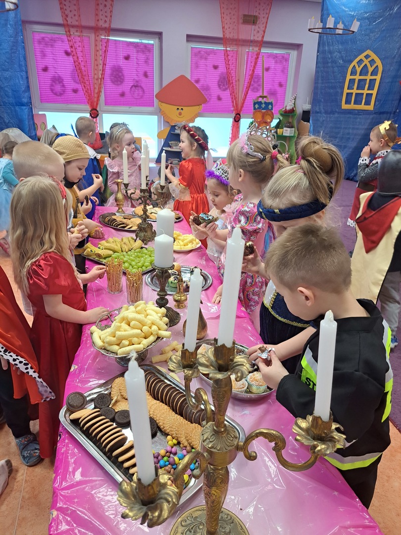To był wyjątkowy bal, jak na królewską imprezkę przystało. Rozpoczął się od parady po moście zwodzonym, na którym wszyscy zebrani goście prezentowali swoje piękne stroje i po którym wkraczali na zamkową salę balową. Nie zabrakło wśród nich cudnych księżniczek, dzielnych rycerzy i innych mieszkańców z zamku królowej Jadwigi. Potem przyszedł czas na wspólne zabawy, tańce i konkursy, w tym: wyścigi rycerzy na koniach, księżniczek w przenoszeniu ciasteczek na tacy, czy przechodzenia pod liną. Był także „taniec zamrażaniec”, barwne pociągi i korowody, tańce w parach, kołach i inne wygibasy. Wszystkim gościom dopisywały wyborne humorki i niegasnący entuzjazm do zabawy. Bal zakończył się wspaniałą ucztą, za zorganizowanie której bardzo dziękujemy rodzicom. Dziekujemy także za pozytywny odzew w sprawie strojów na bal. Dzięki Wam mogłyśmy w pełni zrealizować naszą kanawałową wizję:).