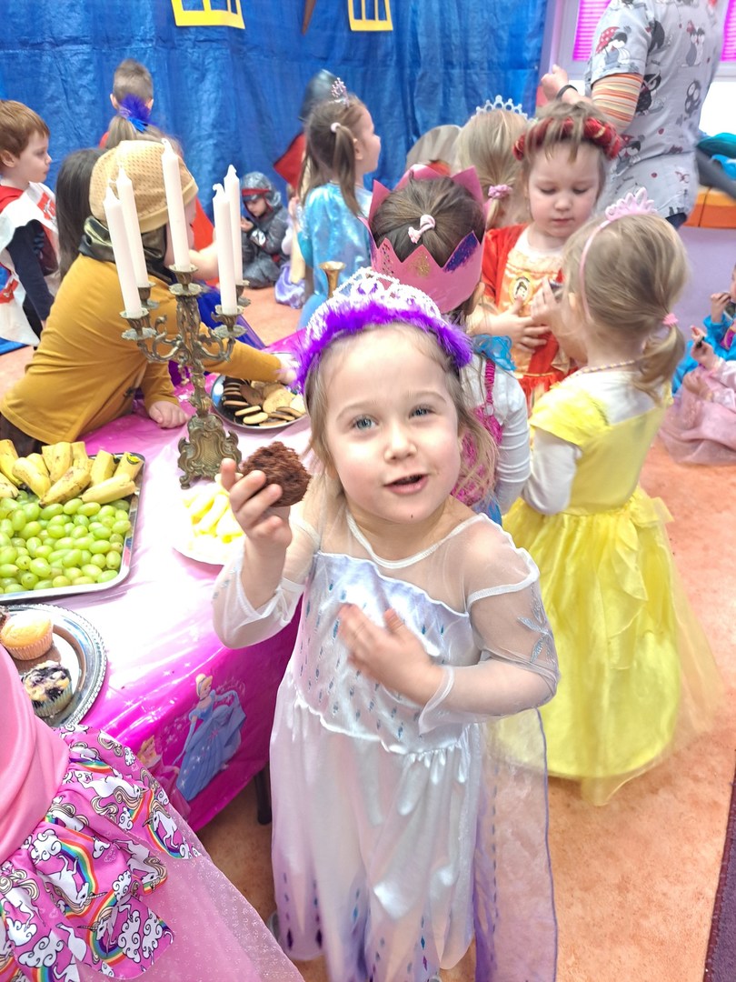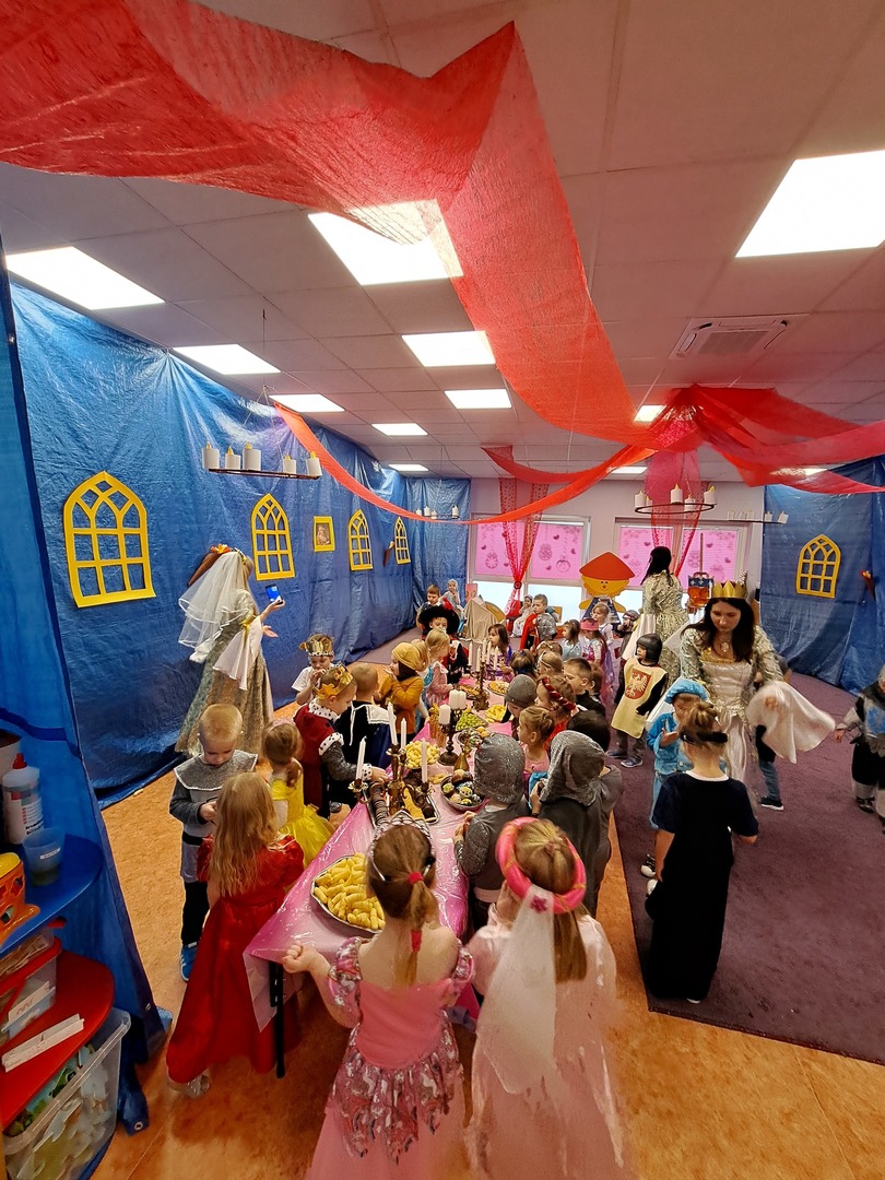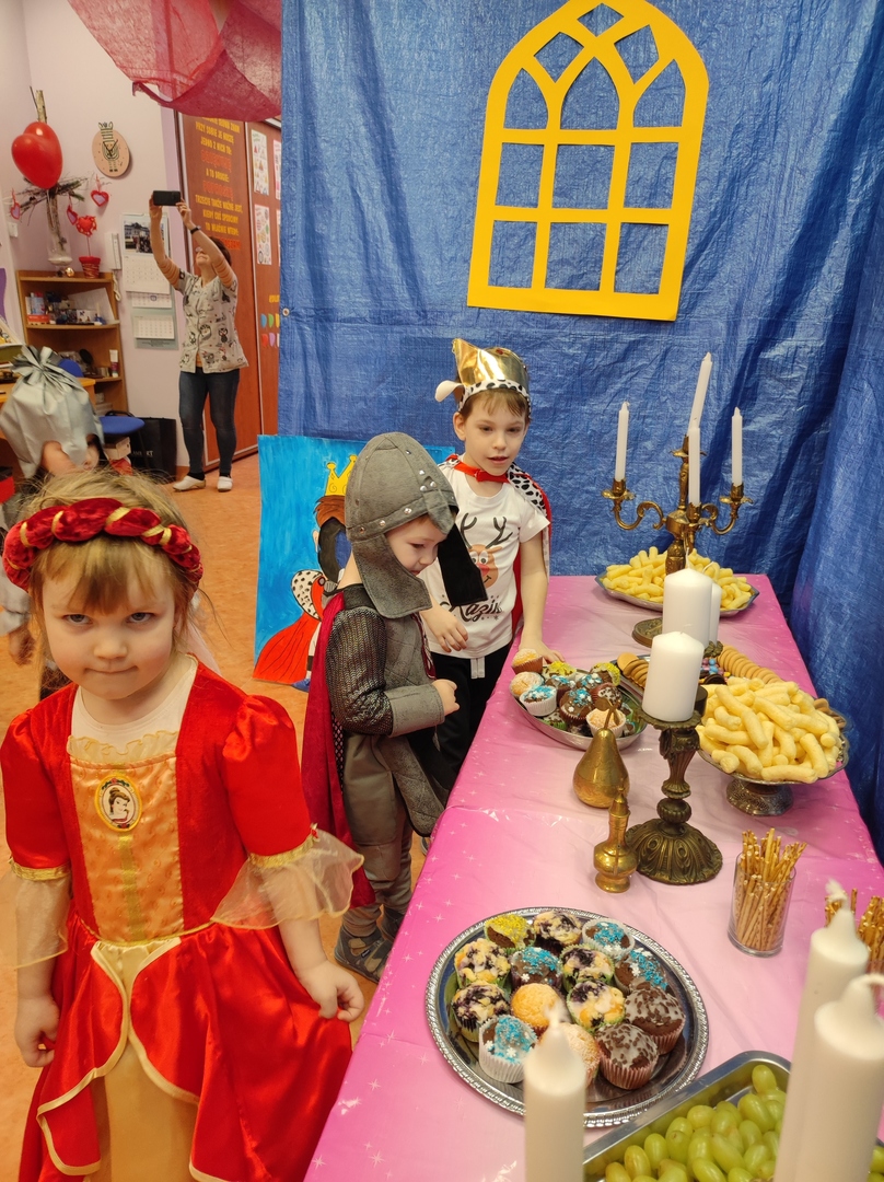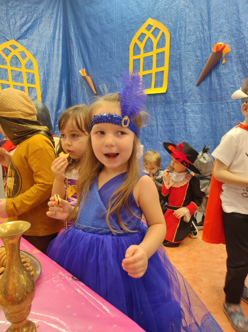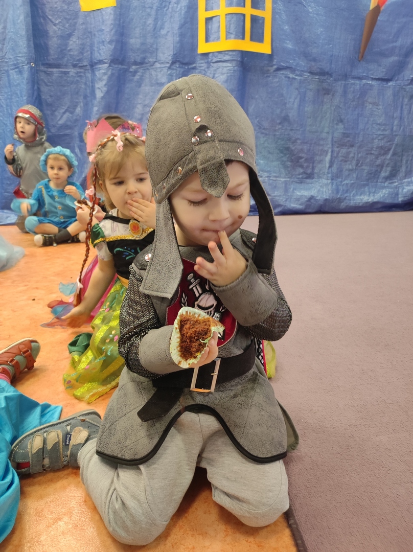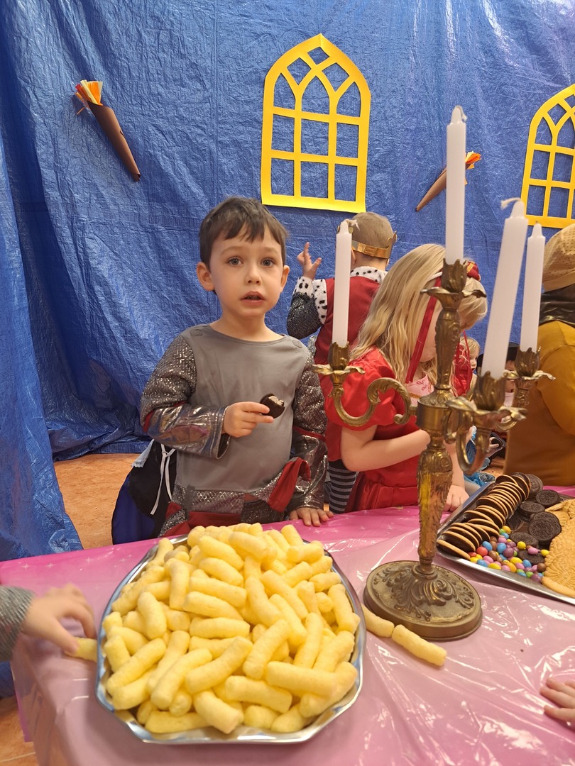 To był wyjątkowy bal, jak na królewską imprezkę przystało. Rozpoczął się od parady po moście zwodzonym, na którym wszyscy zebrani goście prezentowali swoje piękne stroje i po którym wkraczali na zamkową salę balową. Nie zabrakło wśród nich cudnych księżniczek, dzielnych rycerzy i innych mieszkańców z zamku królowej Jadwigi. Potem przyszedł czas na wspólne zabawy, tańce i konkursy, w tym: wyścigi rycerzy na koniach, księżniczek w przenoszeniu ciasteczek na tacy, czy przechodzenia pod liną. Był także „taniec zamrażaniec”, barwne pociągi i korowody, tańce w parach, kołach i inne wygibasy. Wszystkim gościom dopisywały wyborne humorki i niegasnący entuzjazm do zabawy. Bal zakończył się wspaniałą ucztą, za zorganizowanie której bardzo dziękujemy rodzicom. Dziekujemy także za pozytywny odzew w sprawie strojów na bal. Dzięki Wam mogłyśmy w pełni zrealizować naszą kanawałową wizję:).