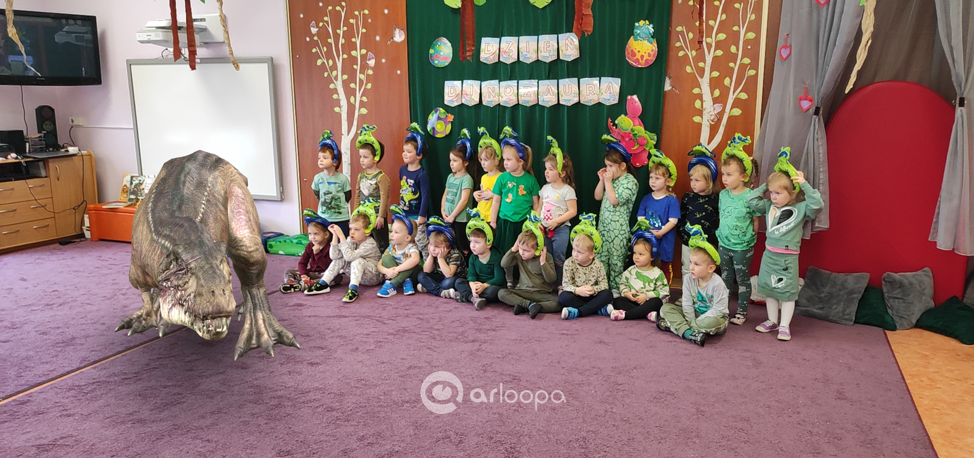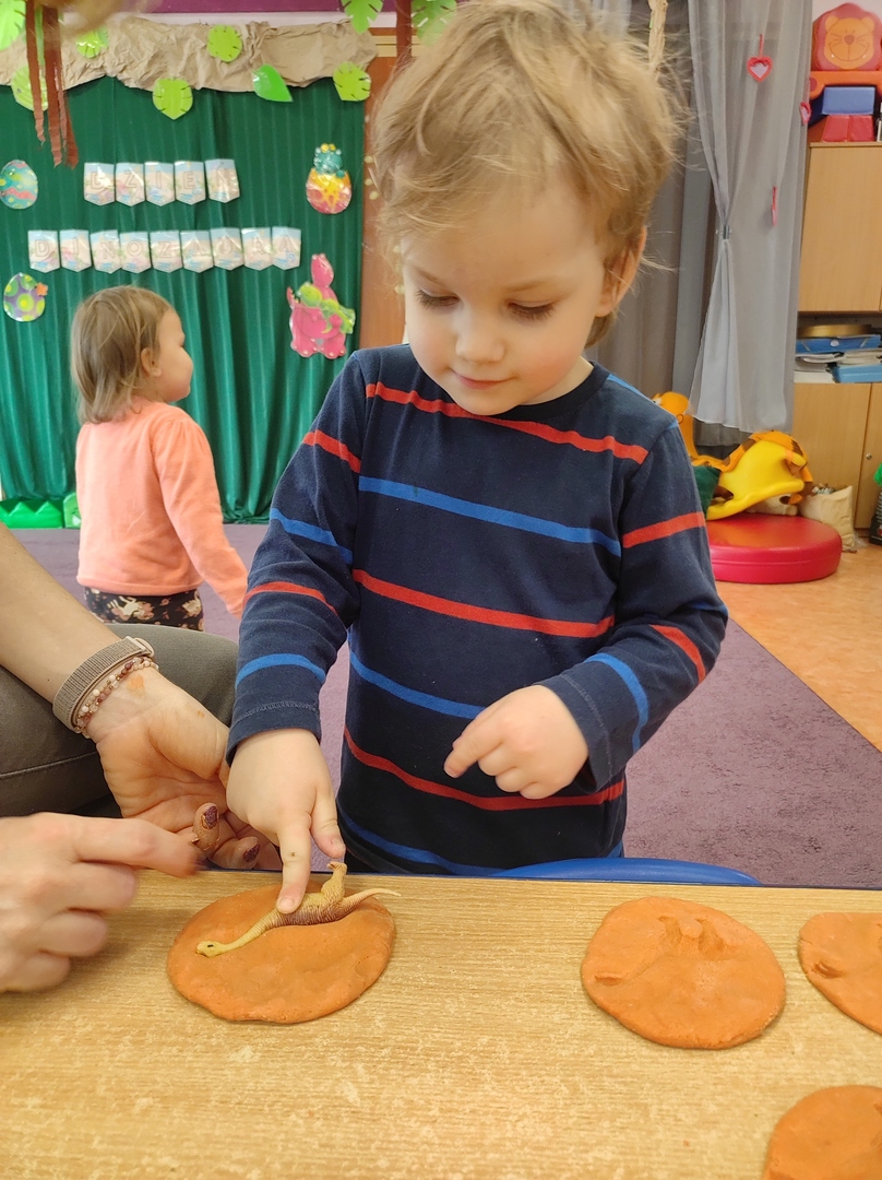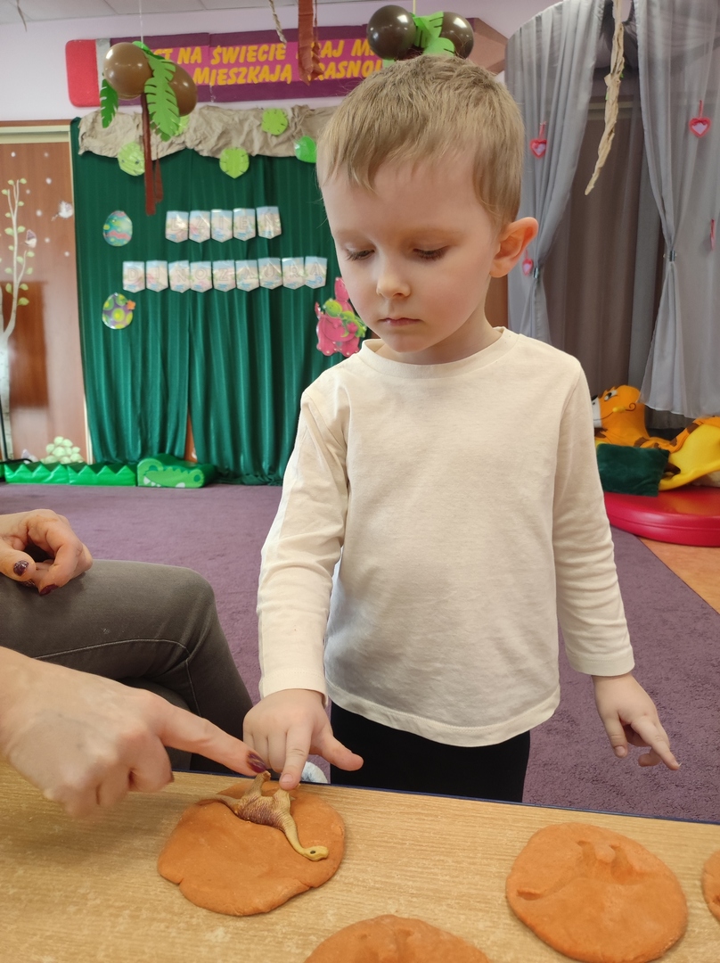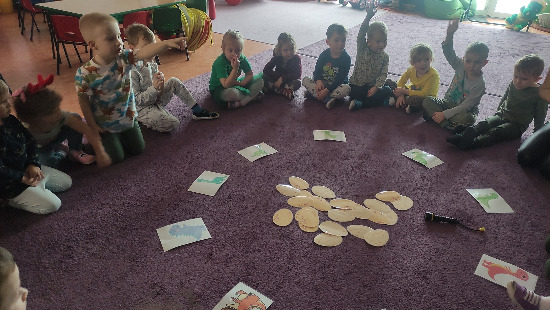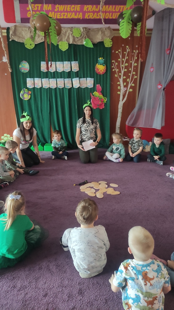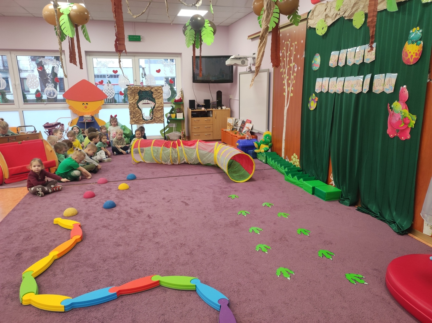 24 lutego w najmłodszej grupie obchodzono Dzień Dinozaura. Te stworzenia fascynują dzieci, kryją wiele tajemnic, zaskakują swoim wyglądem i wielkością. Dlatego też przedszkolaki poznały historię dinozaurów, dowiedziały się jak wyglądały, czym się żywiły oraz jak wyginęły - wykonując proste doświadczenie. Na początku podglądały jakie dinozaury znajdują się w niewyklutych jeszcze jajach, po czym przydzielały je do konkretnej dinozaurowej mamy. Nie zabrakło tego dnia zabaw ruchowych oraz sensorycznych. Ponadto.... przedszkolaków odwiedzili goście specjalni, a mianowicie Triceratops i T-rex, którzy pozowali razem z dziećmi do zdjęć :) Na zakończenie na małych Dinoznawców czekał słodki poczęstunek, przygotowany przez rodziców, za który serdecznie dziękujemy. Był to szczególny dzień, pełen radosnych wrażeń.