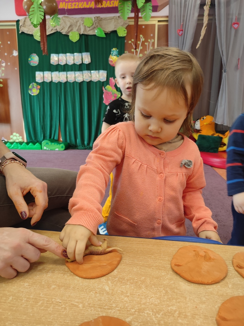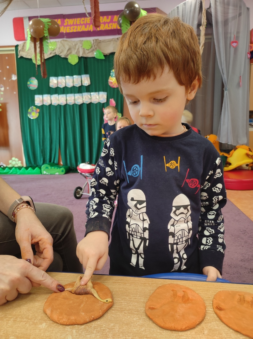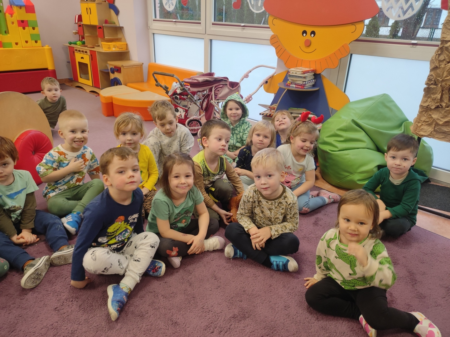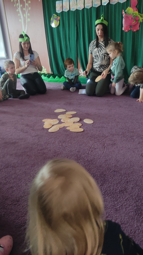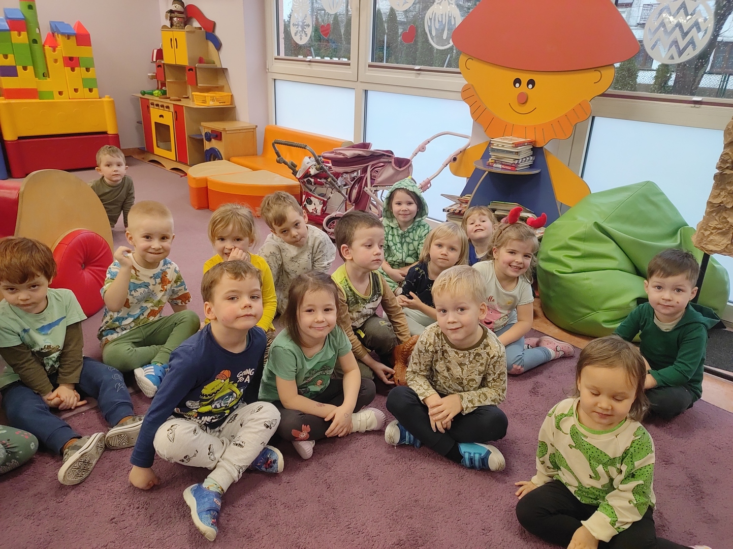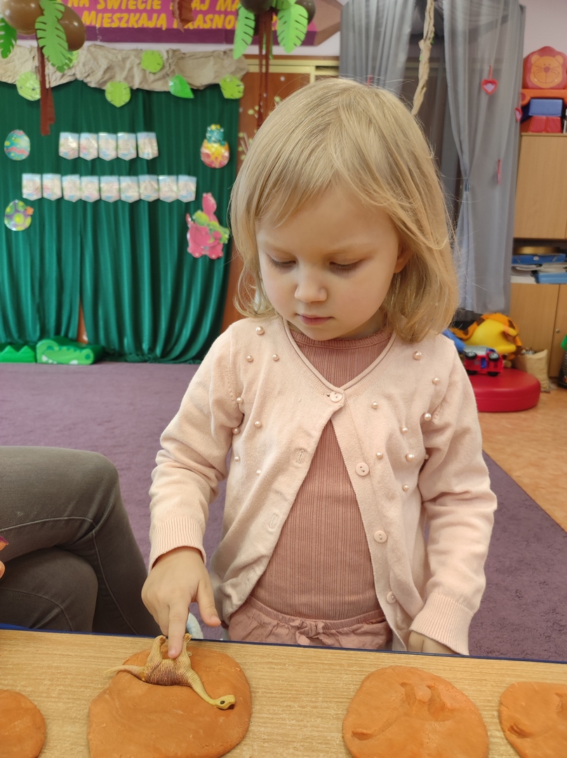 24 lutego w najmłodszej grupie obchodzono Dzień Dinozaura. Te stworzenia fascynują dzieci, kryją wiele tajemnic, zaskakują swoim wyglądem i wielkością. Dlatego też przedszkolaki poznały historię dinozaurów, dowiedziały się jak wyglądały, czym się żywiły oraz jak wyginęły - wykonując proste doświadczenie. Na początku podglądały jakie dinozaury znajdują się w niewyklutych jeszcze jajach, po czym przydzielały je do konkretnej dinozaurowej mamy. Nie zabrakło tego dnia zabaw ruchowych oraz sensorycznych. Ponadto.... przedszkolaków odwiedzili goście specjalni, a mianowicie Triceratops i T-rex, którzy pozowali razem z dziećmi do zdjęć :) Na zakończenie na małych Dinoznawców czekał słodki poczęstunek, przygotowany przez rodziców, za który serdecznie dziękujemy. Był to szczególny dzień, pełen radosnych wrażeń.