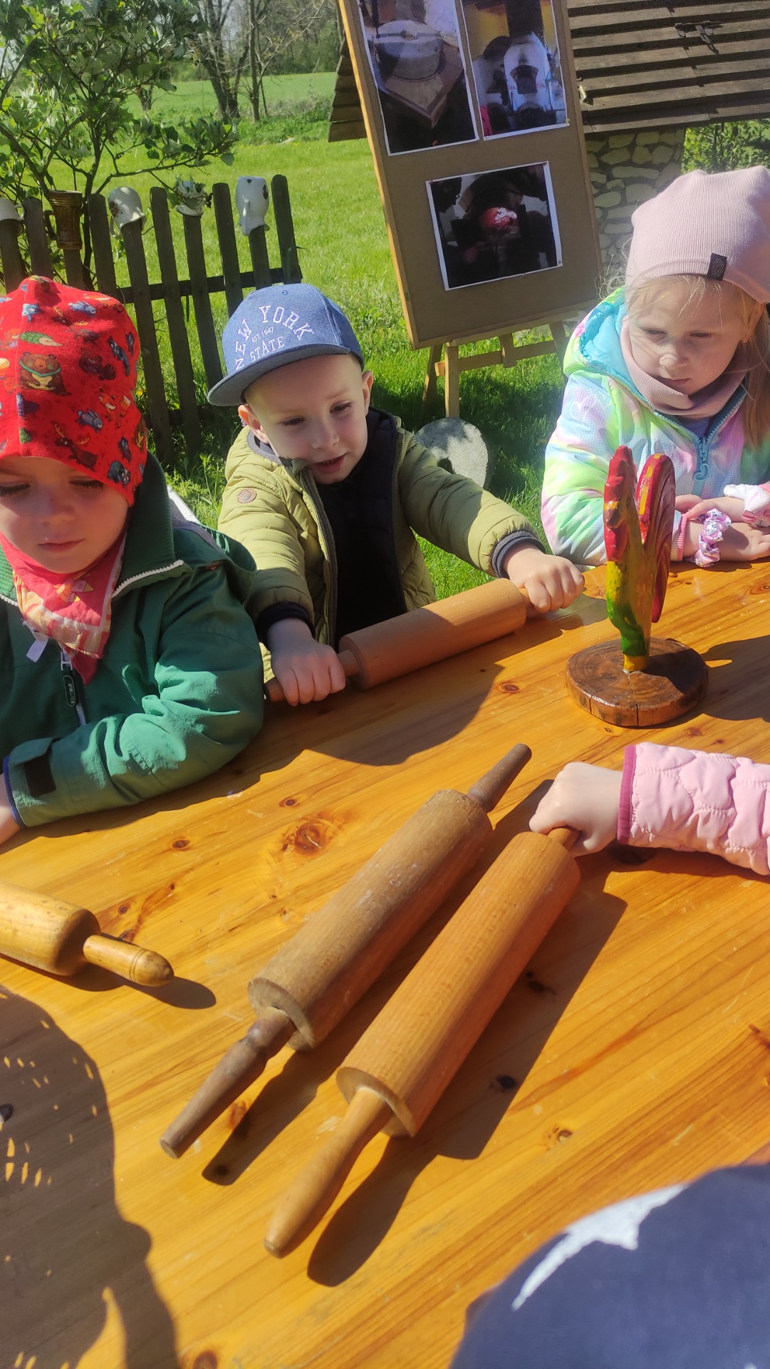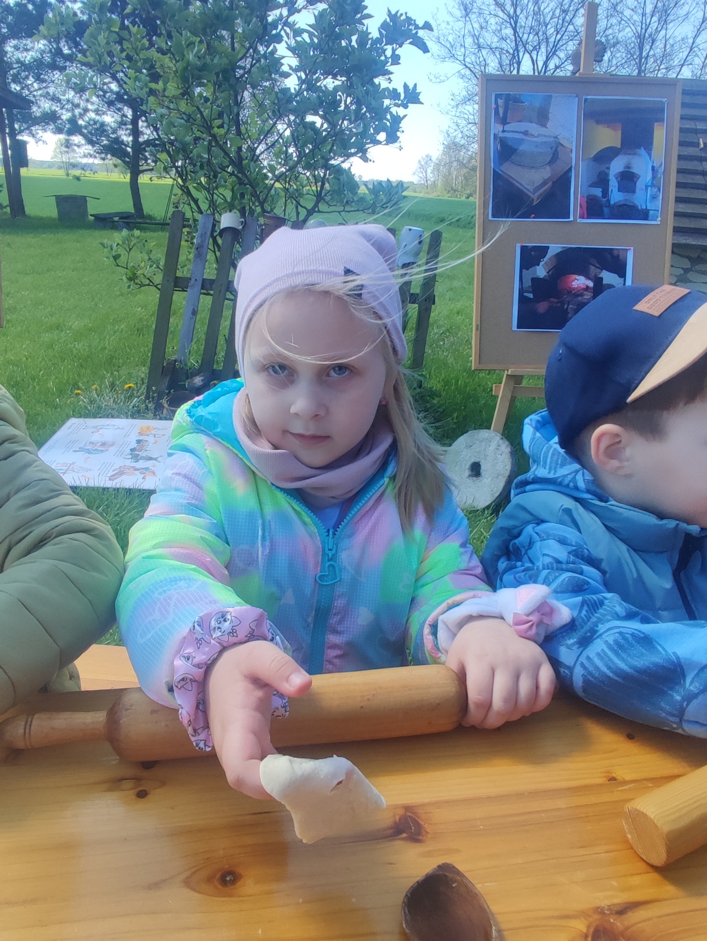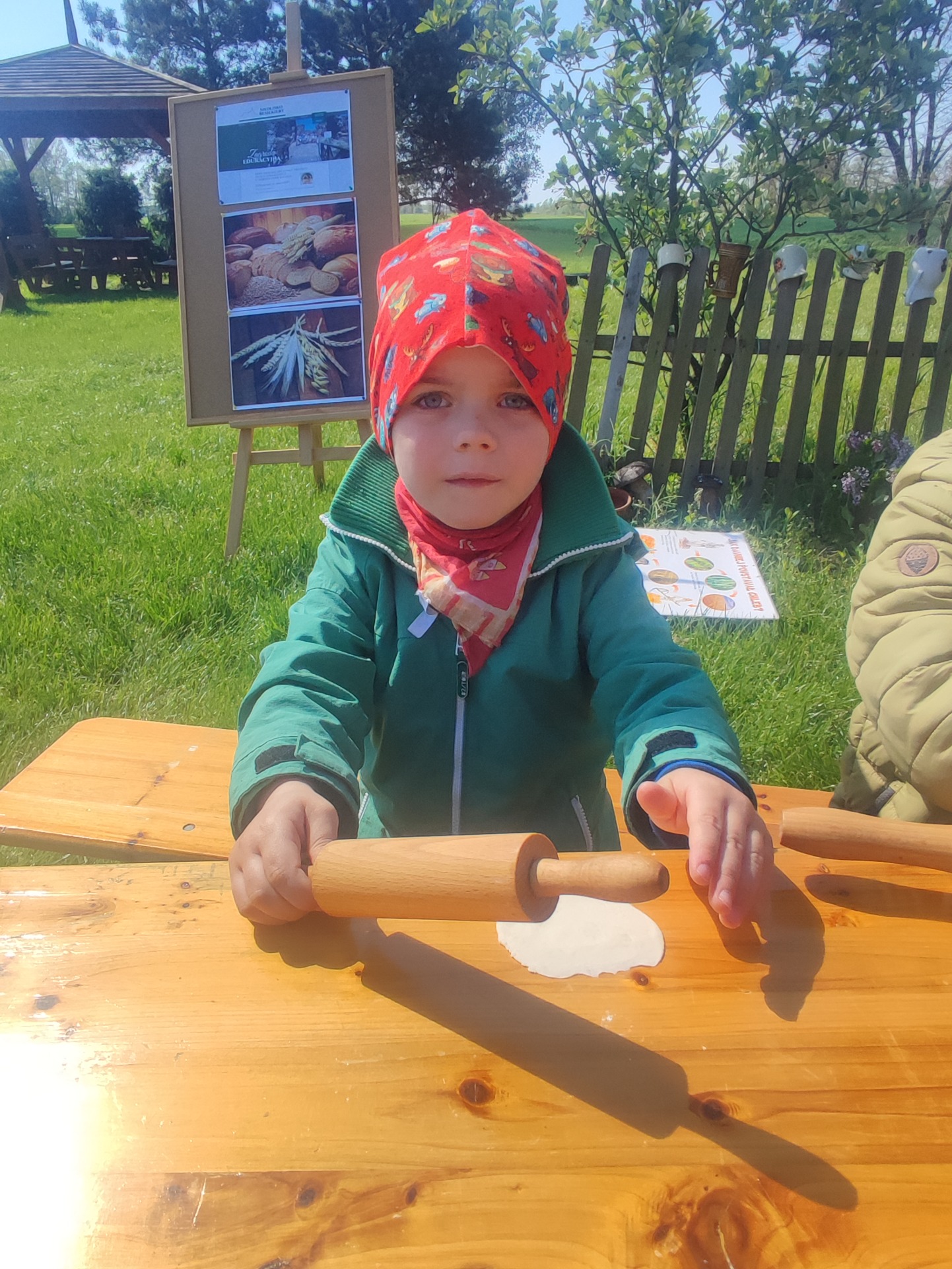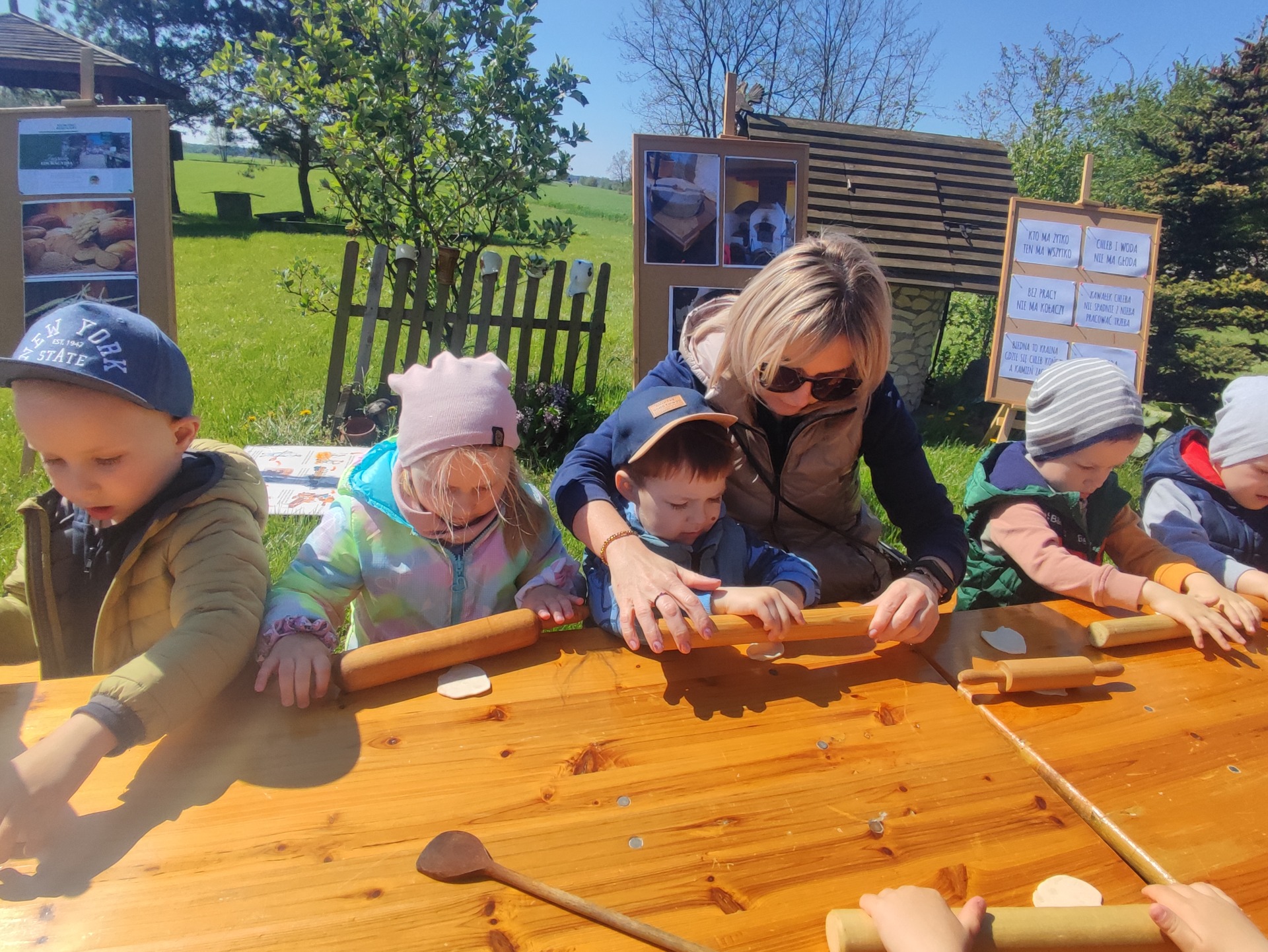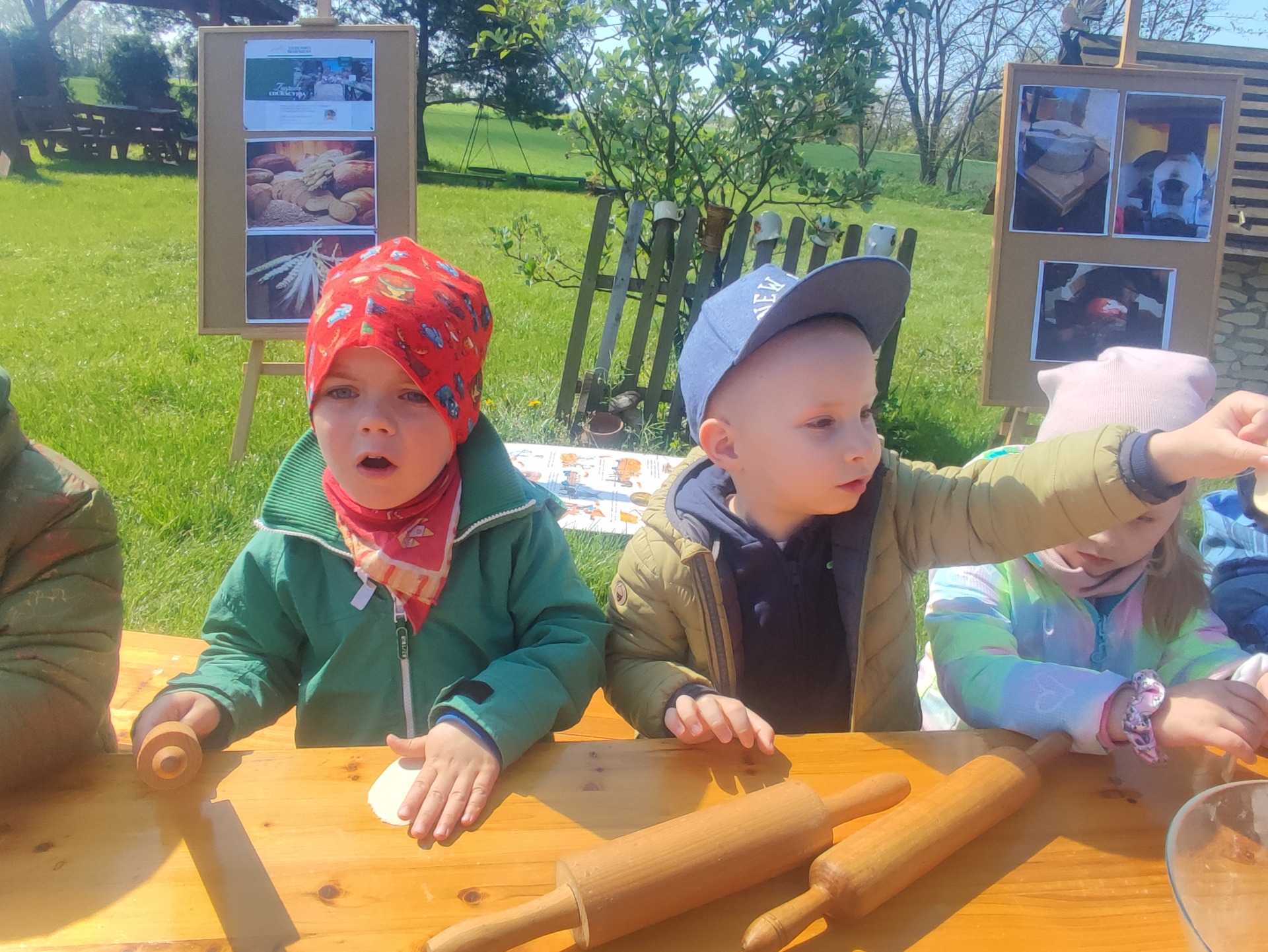 9 maja grupa Krasnali wybrała się na wycieczkę do Siedliska przy zamku w Besiekierach. Dzieci poznały proces pozyskiwania mąki w dawnych czasach i dziś, a następnie przygotowały własnoręcznie podpłomyki, które zostały upieczone przez panie na piecu i zjedzone ze smakiem przez dzieci w wybranej przez siebie formie (suchy, z masłem, z miodem lub pełen zestaw :). Odbył się piknik na świeżym powietrzu. Następnym punktem naszej wycieczki był udział w zabawie tropiącej podczas której maluchy miały okazję poznać legendę związaną z zamkiem oraz z diabłem Borutą. Następnie przedszkolaki sprawdziły swoje siły w różnych konkurencjach sportowych w pobliżu zamku, w tym, w: przeciąganiu liny, sadzeniu ziemniaków, rzucaniu wianuszkiem na kołeczek, przenoszeniu kukurydzy na drewnianej łyżce, czy wyścigach do palika. Nie zabrakło również spaceru wokół ruin i opowieści go dotyczących. Miejsce zaczarowało nas swoim urokiem :)