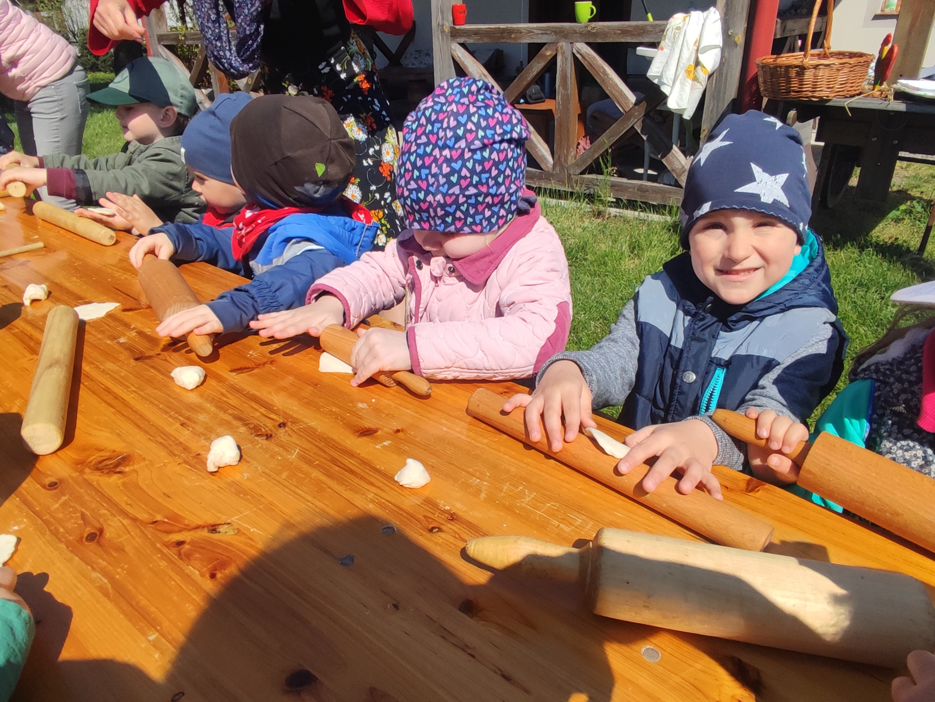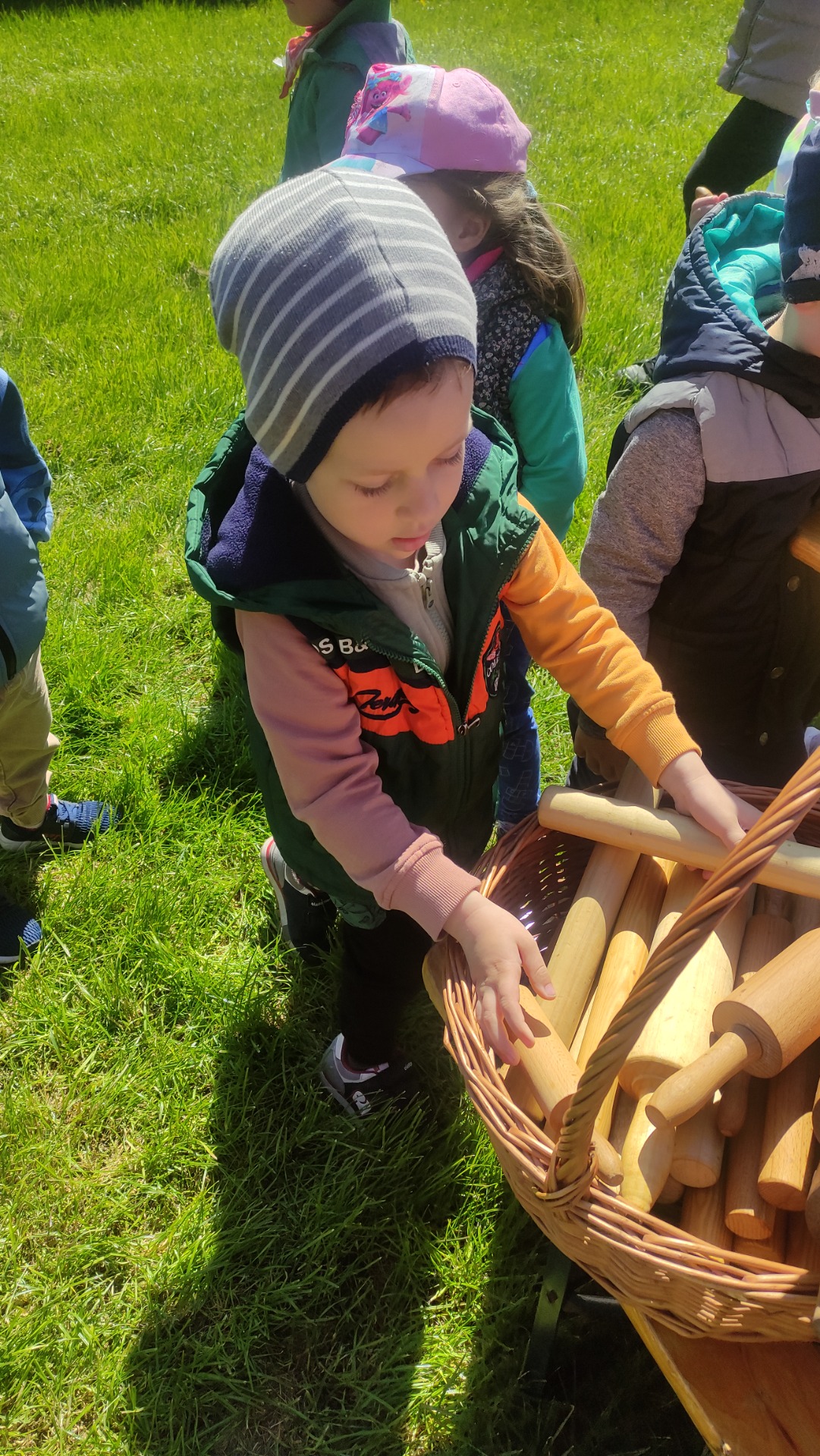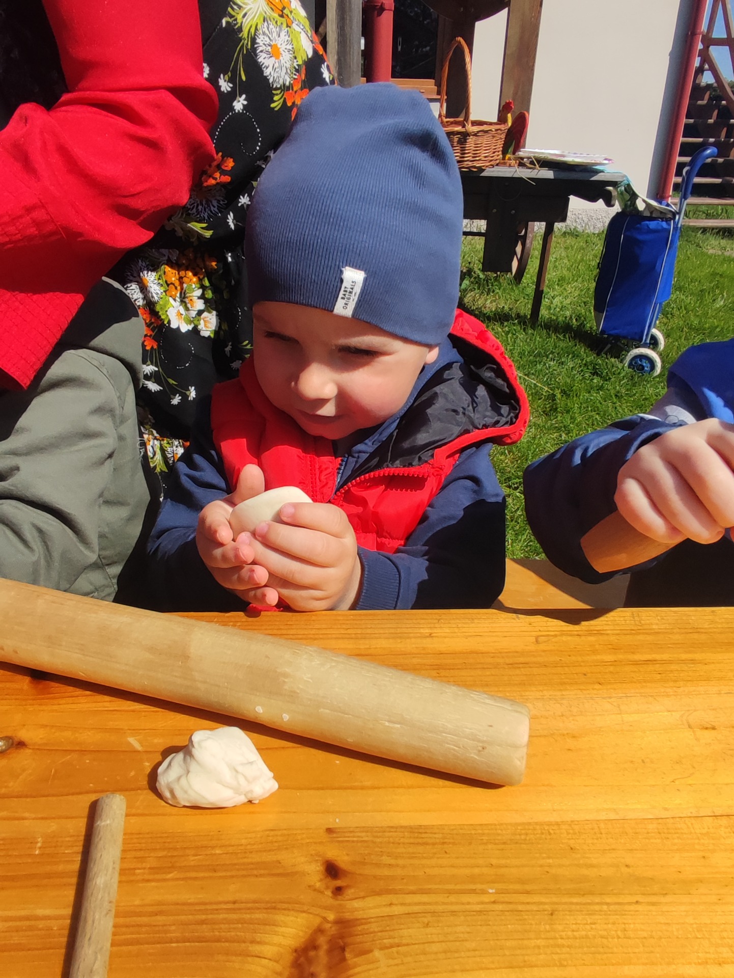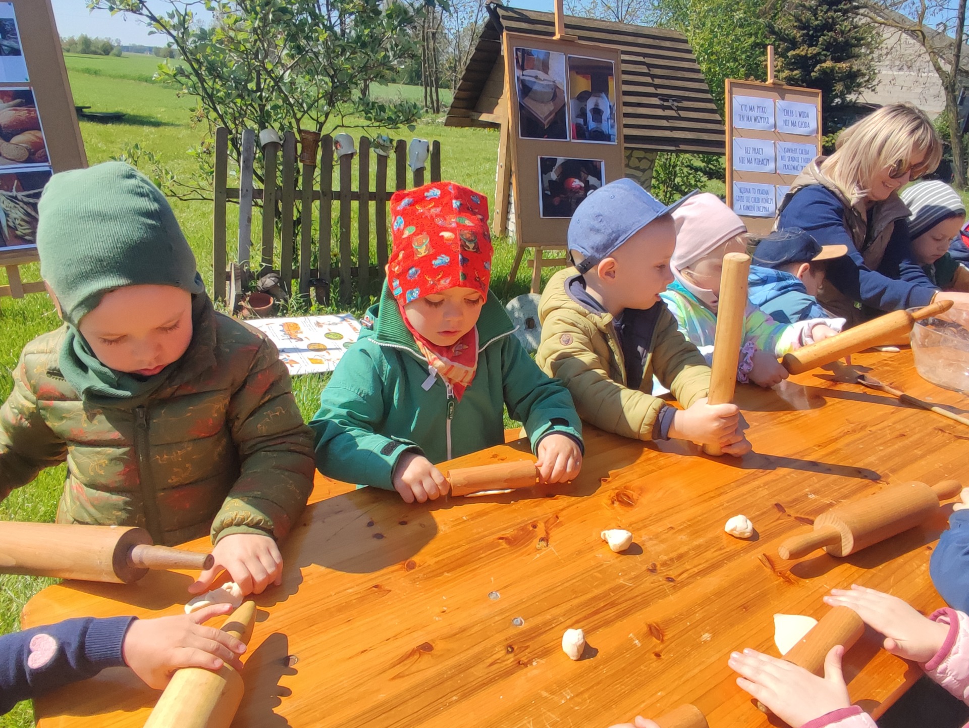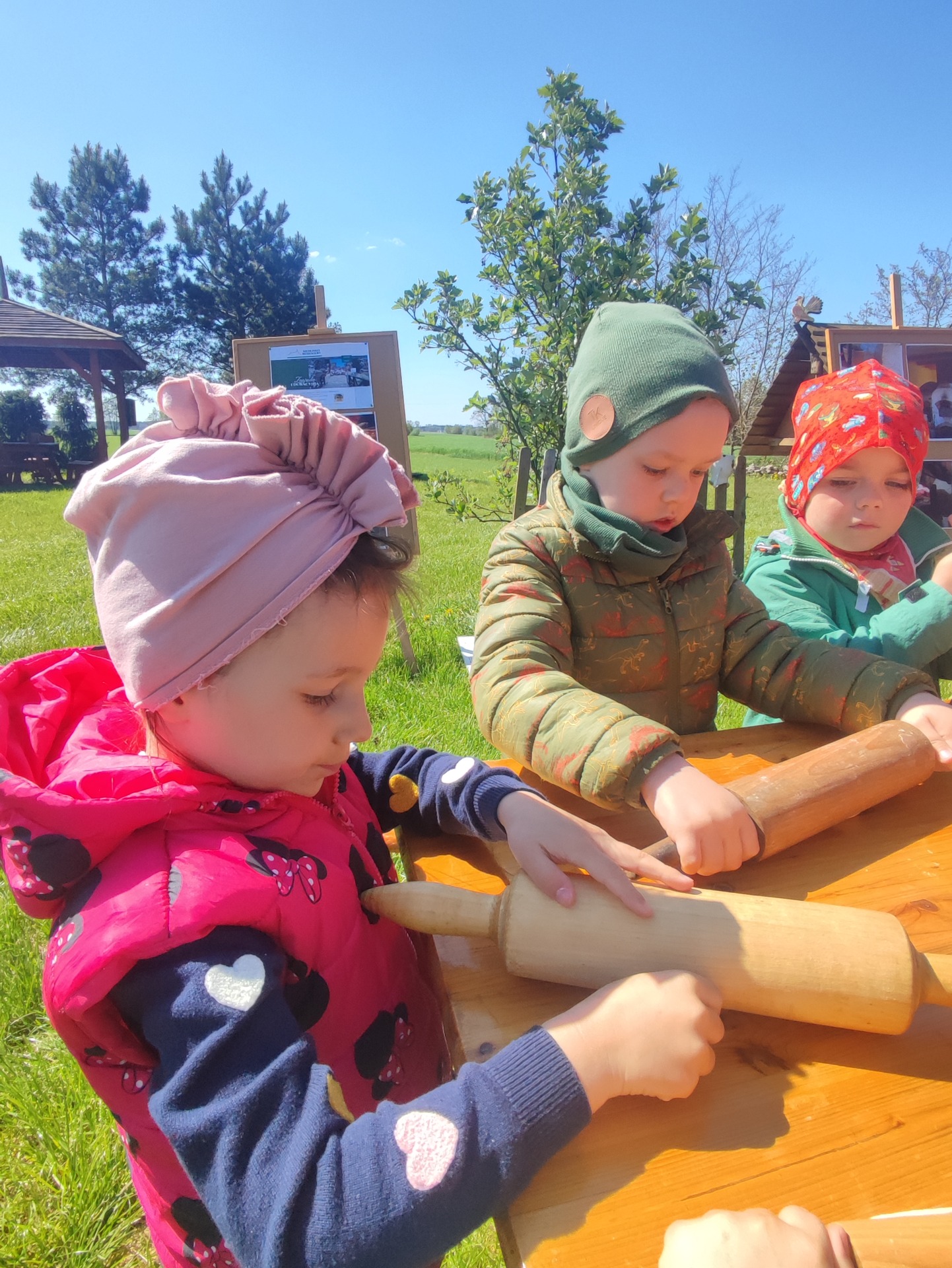9 maja grupa Krasnali wybrała się na wycieczkę do Siedliska przy zamku w Besiekierach. Dzieci poznały proces pozyskiwania mąki w dawnych czasach i dziś, a następnie przygotowały własnoręcznie podpłomyki, które zostały upieczone przez panie na piecu i zjedzone ze smakiem przez dzieci w wybranej przez siebie formie (suchy, z masłem, z miodem lub pełen zestaw :). Odbył się piknik na świeżym powietrzu. Następnym punktem naszej wycieczki był udział w zabawie tropiącej podczas której maluchy miały okazję poznać legendę związaną z zamkiem oraz z diabłem Borutą. Następnie przedszkolaki sprawdziły swoje siły w różnych konkurencjach sportowych w pobliżu zamku, w tym, w: przeciąganiu liny, sadzeniu ziemniaków, rzucaniu wianuszkiem na kołeczek, przenoszeniu kukurydzy na drewnianej łyżce, czy wyścigach do palika. Nie zabrakło również spaceru wokół ruin i opowieści go dotyczących. Miejsce zaczarowało nas swoim urokiem :)