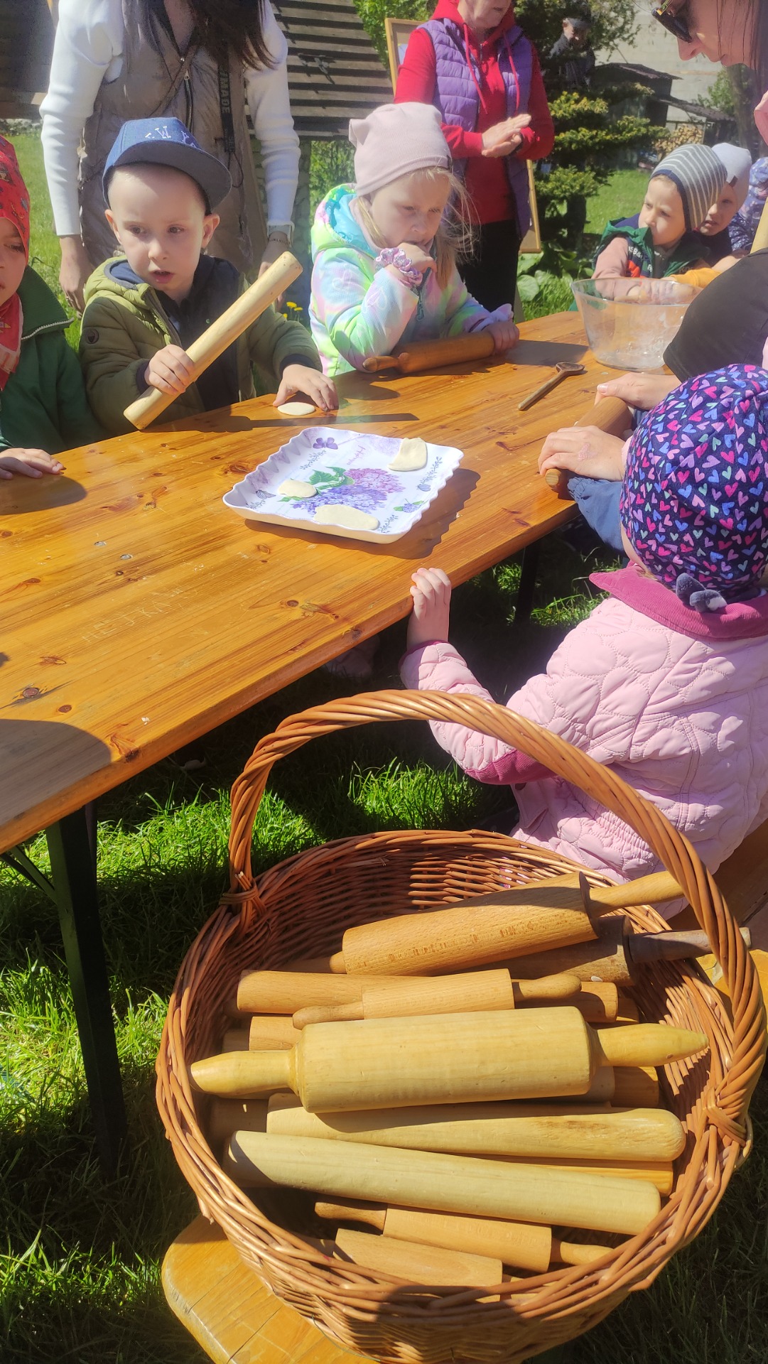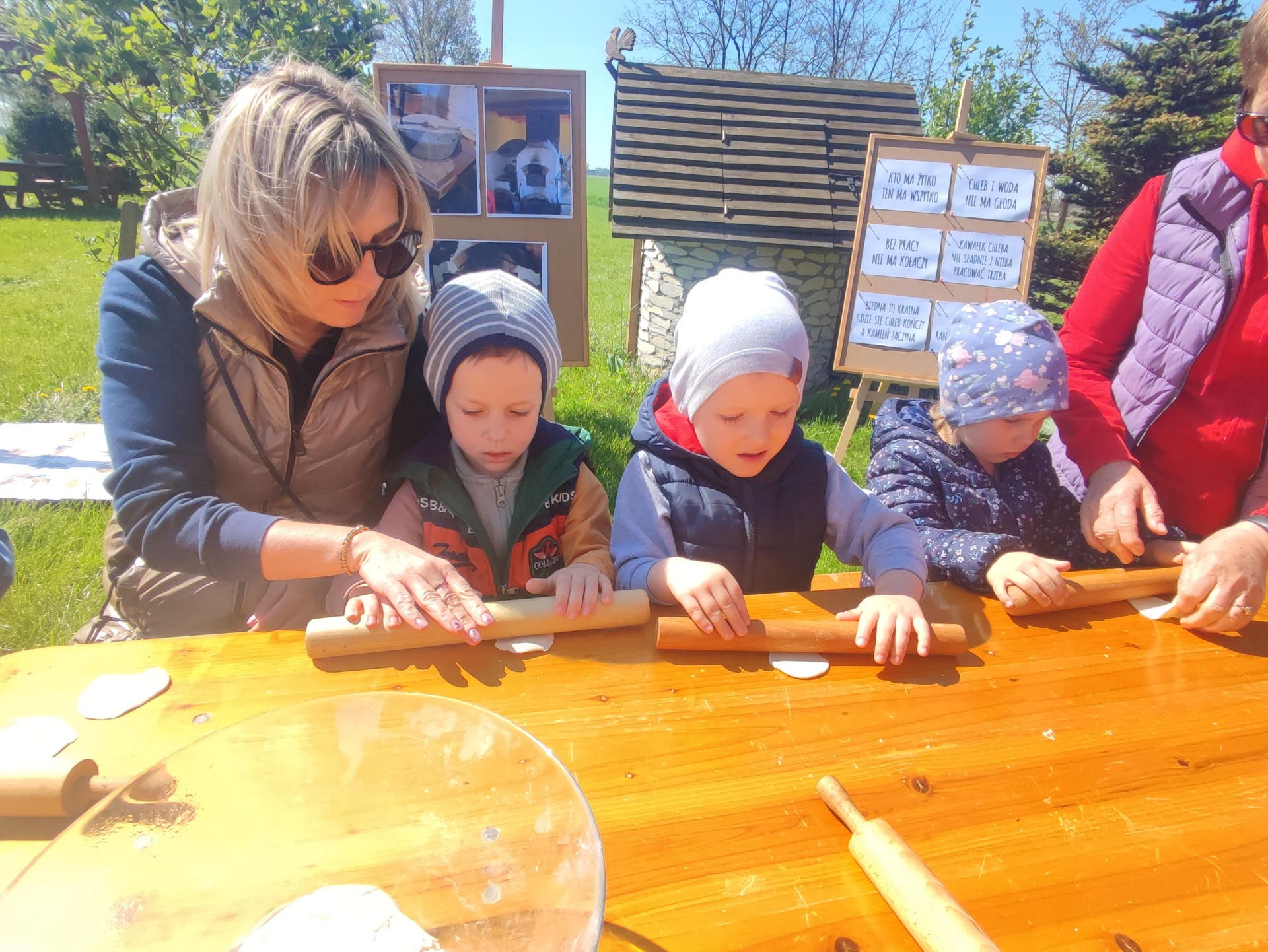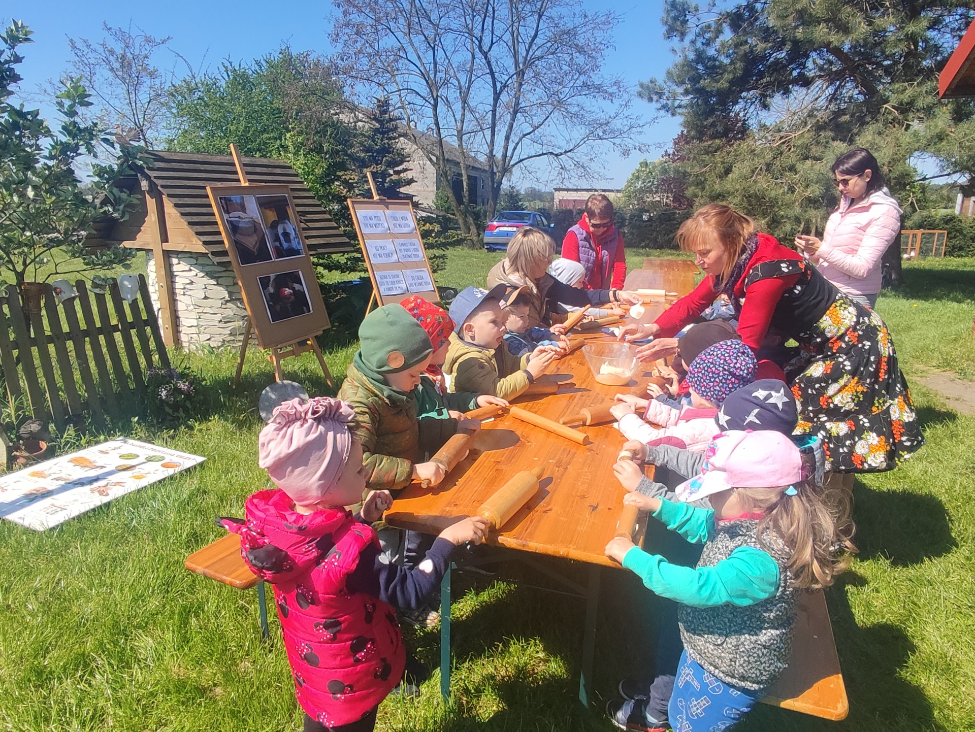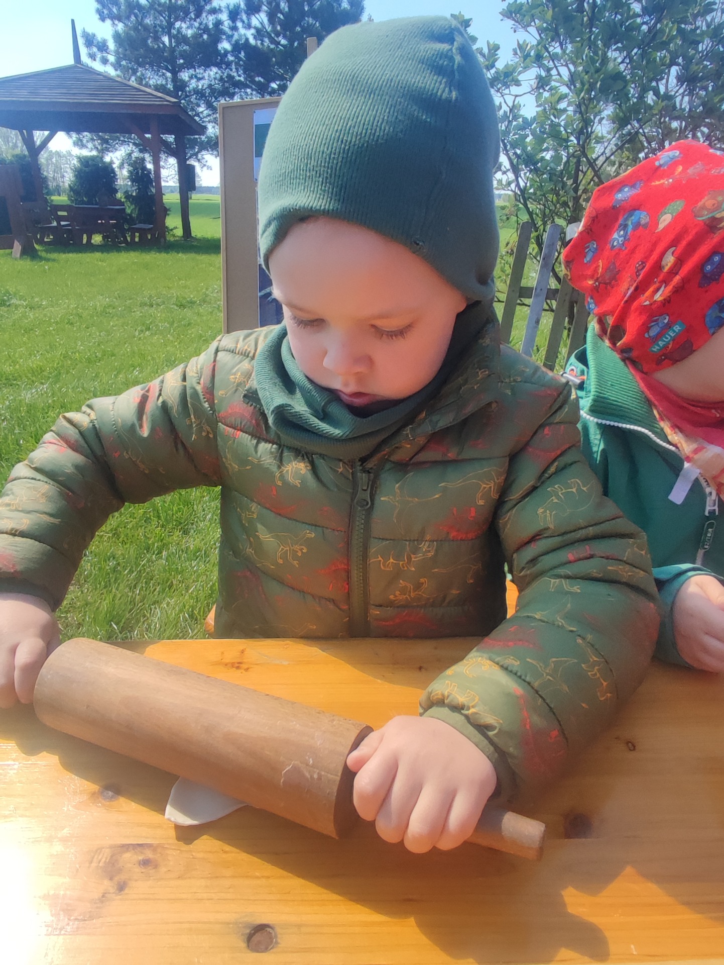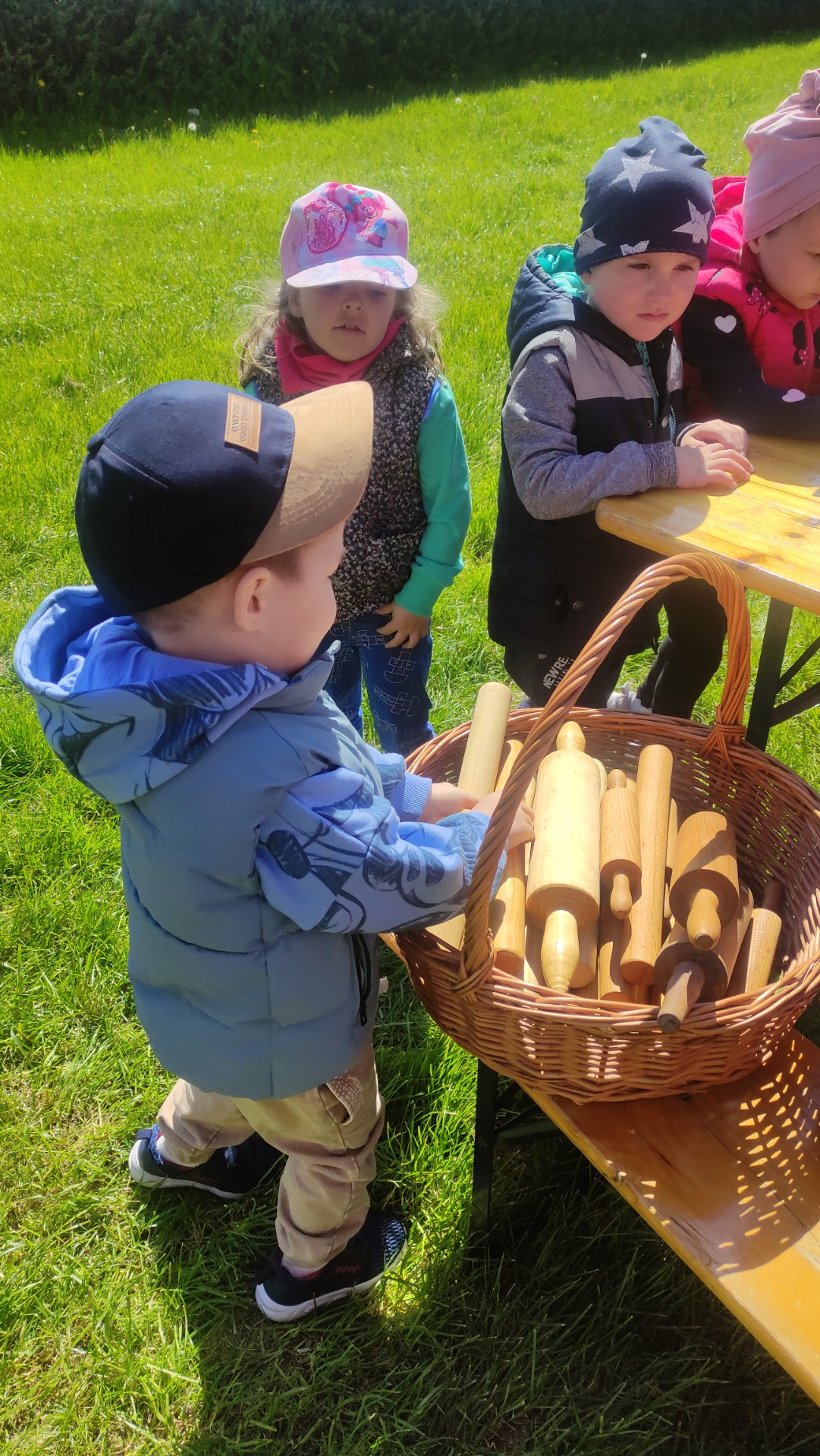 9 maja grupa Krasnali wybrała się na wycieczkę do Siedliska przy zamku w Besiekierach. Dzieci poznały proces pozyskiwania mąki w dawnych czasach i dziś, a następnie przygotowały własnoręcznie podpłomyki, które zostały upieczone przez panie na piecu i zjedzone ze smakiem przez dzieci w wybranej przez siebie formie (suchy, z masłem, z miodem lub pełen zestaw :). Odbył się piknik na świeżym powietrzu. Następnym punktem naszej wycieczki był udział w zabawie tropiącej podczas której maluchy miały okazję poznać legendę związaną z zamkiem oraz z diabłem Borutą. Następnie przedszkolaki sprawdziły swoje siły w różnych konkurencjach sportowych w pobliżu zamku, w tym, w: przeciąganiu liny, sadzeniu ziemniaków, rzucaniu wianuszkiem na kołeczek, przenoszeniu kukurydzy na drewnianej łyżce, czy wyścigach do palika. Nie zabrakło również spaceru wokół ruin i opowieści go dotyczących. Miejsce zaczarowało nas swoim urokiem :)