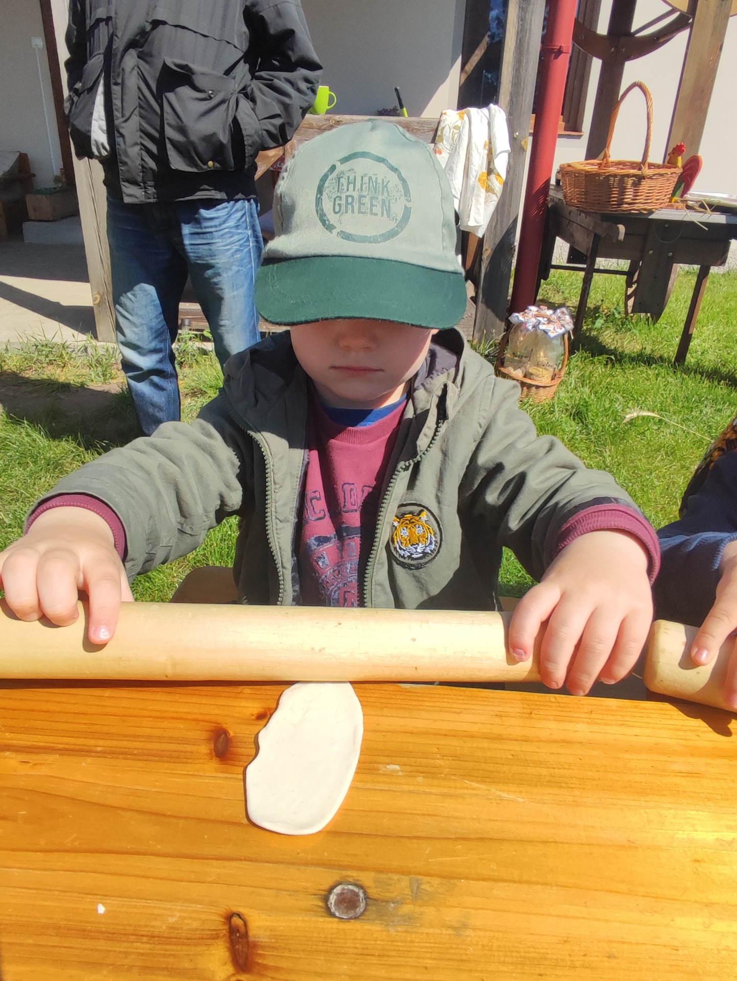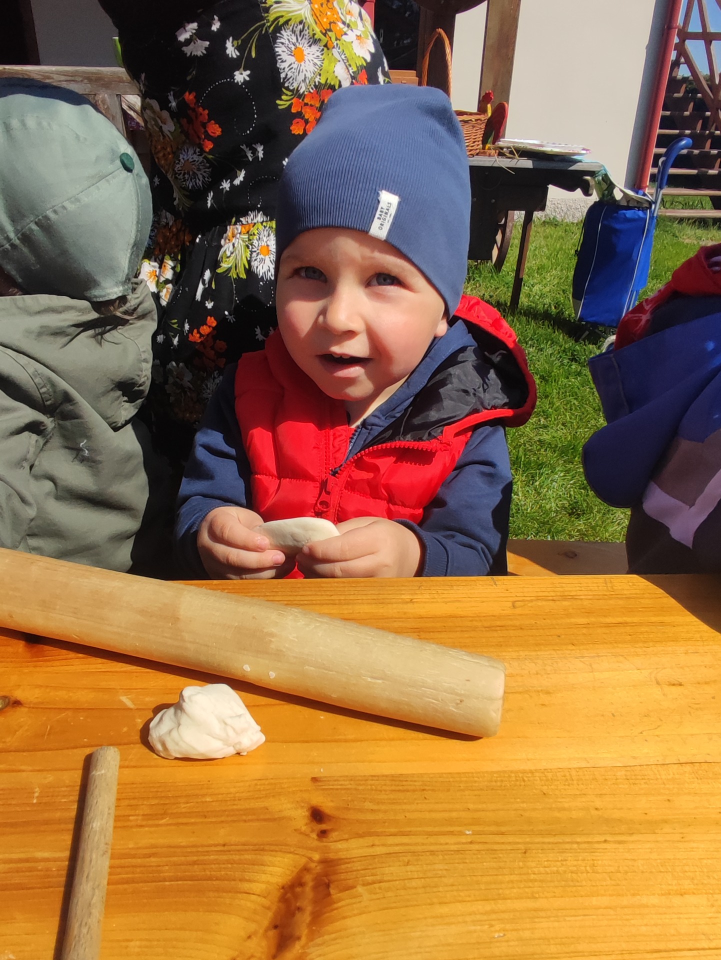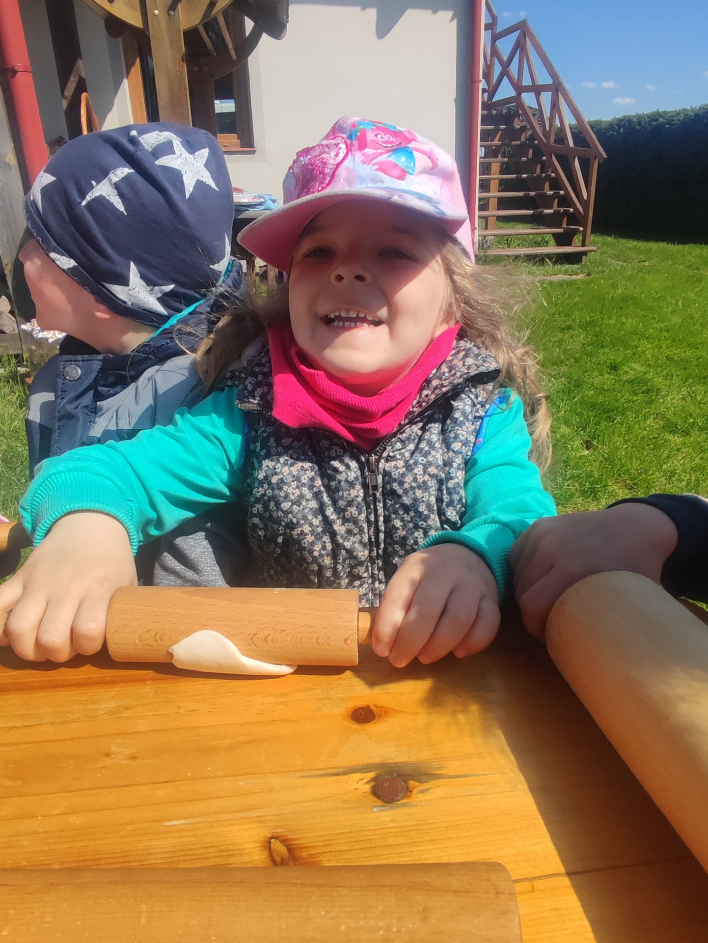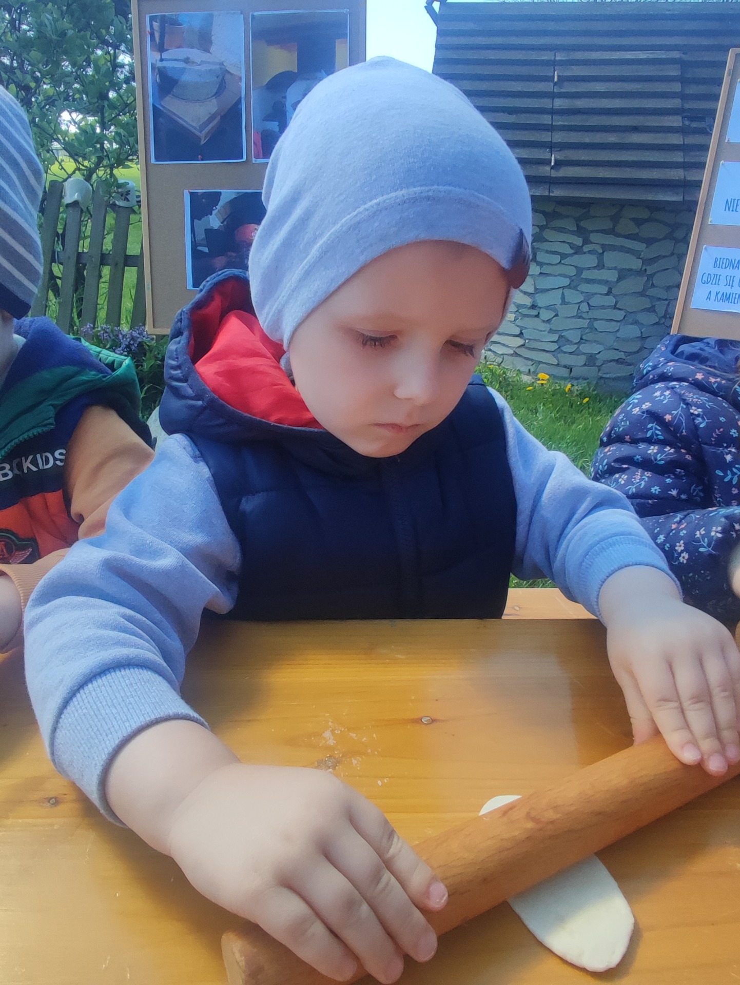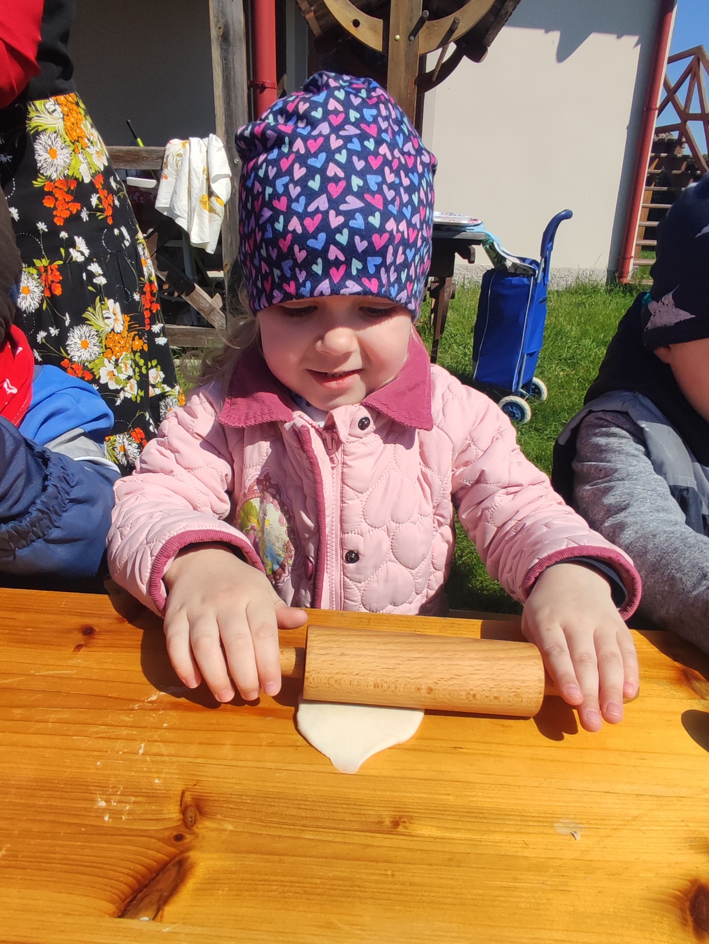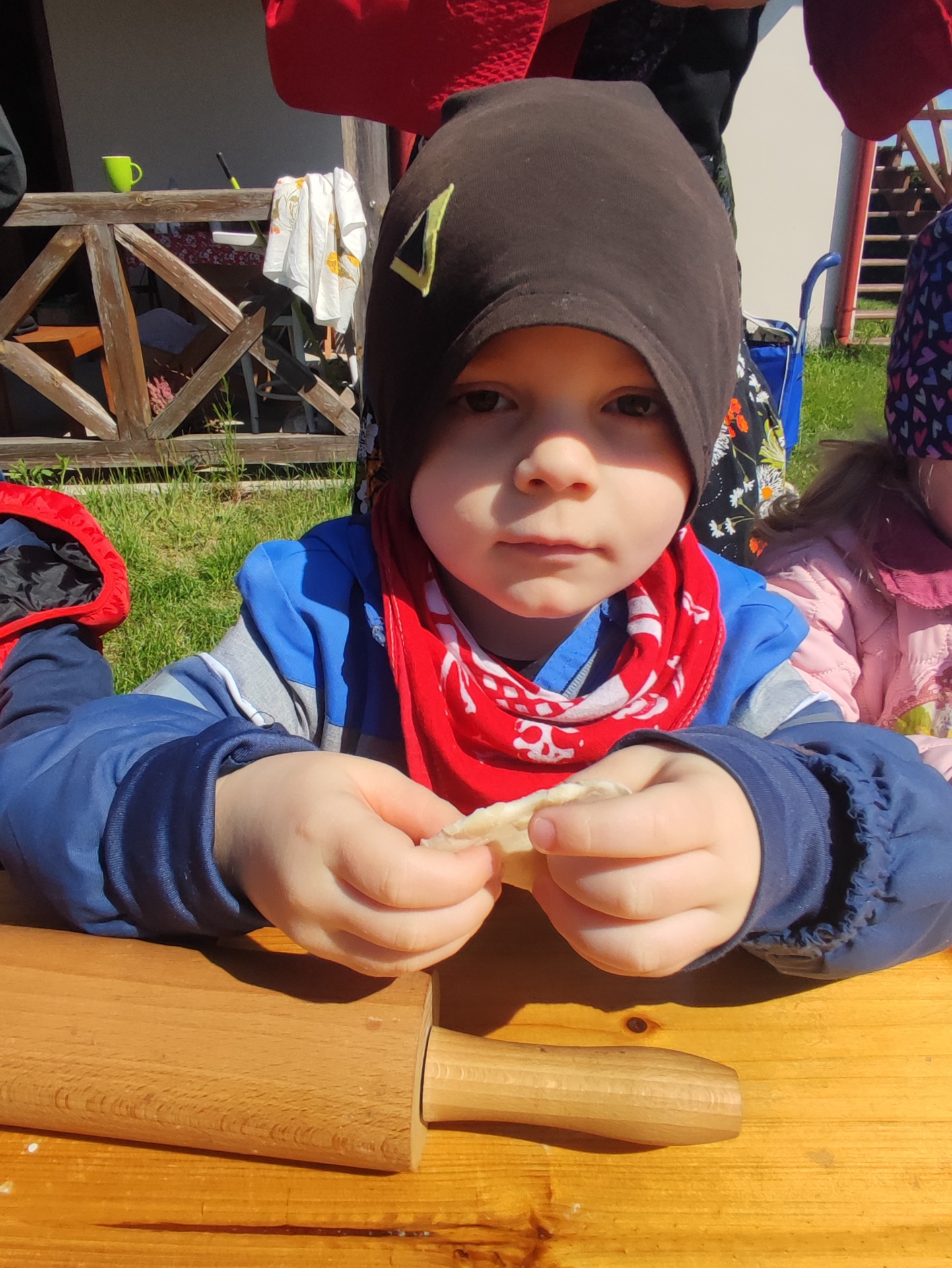9 maja grupa Krasnali wybrała się na wycieczkę do Siedliska przy zamku w Besiekierach. Dzieci poznały proces pozyskiwania mąki w dawnych czasach i dziś, a następnie przygotowały własnoręcznie podpłomyki, które zostały upieczone przez panie na piecu i zjedzone ze smakiem przez dzieci w wybranej przez siebie formie (suchy, z masłem, z miodem lub pełen zestaw :). Odbył się piknik na świeżym powietrzu. Następnym punktem naszej wycieczki był udział w zabawie tropiącej podczas której maluchy miały okazję poznać legendę związaną z zamkiem oraz z diabłem Borutą. Następnie przedszkolaki sprawdziły swoje siły w różnych konkurencjach sportowych w pobliżu zamku, w tym, w: przeciąganiu liny, sadzeniu ziemniaków, rzucaniu wianuszkiem na kołeczek, przenoszeniu kukurydzy na drewnianej łyżce, czy wyścigach do palika. Nie zabrakło również spaceru wokół ruin i opowieści go dotyczących. Miejsce zaczarowało nas swoim urokiem :)