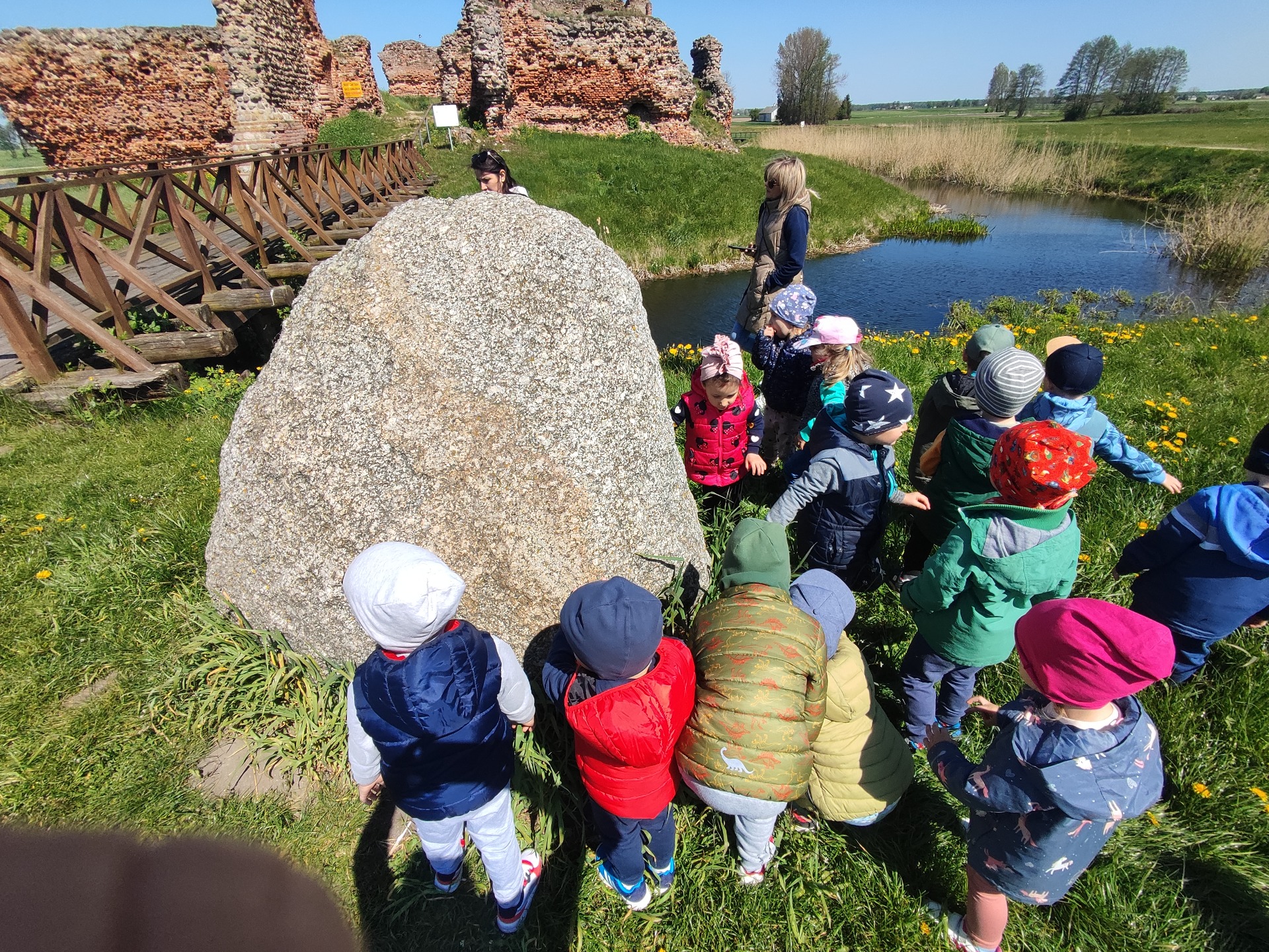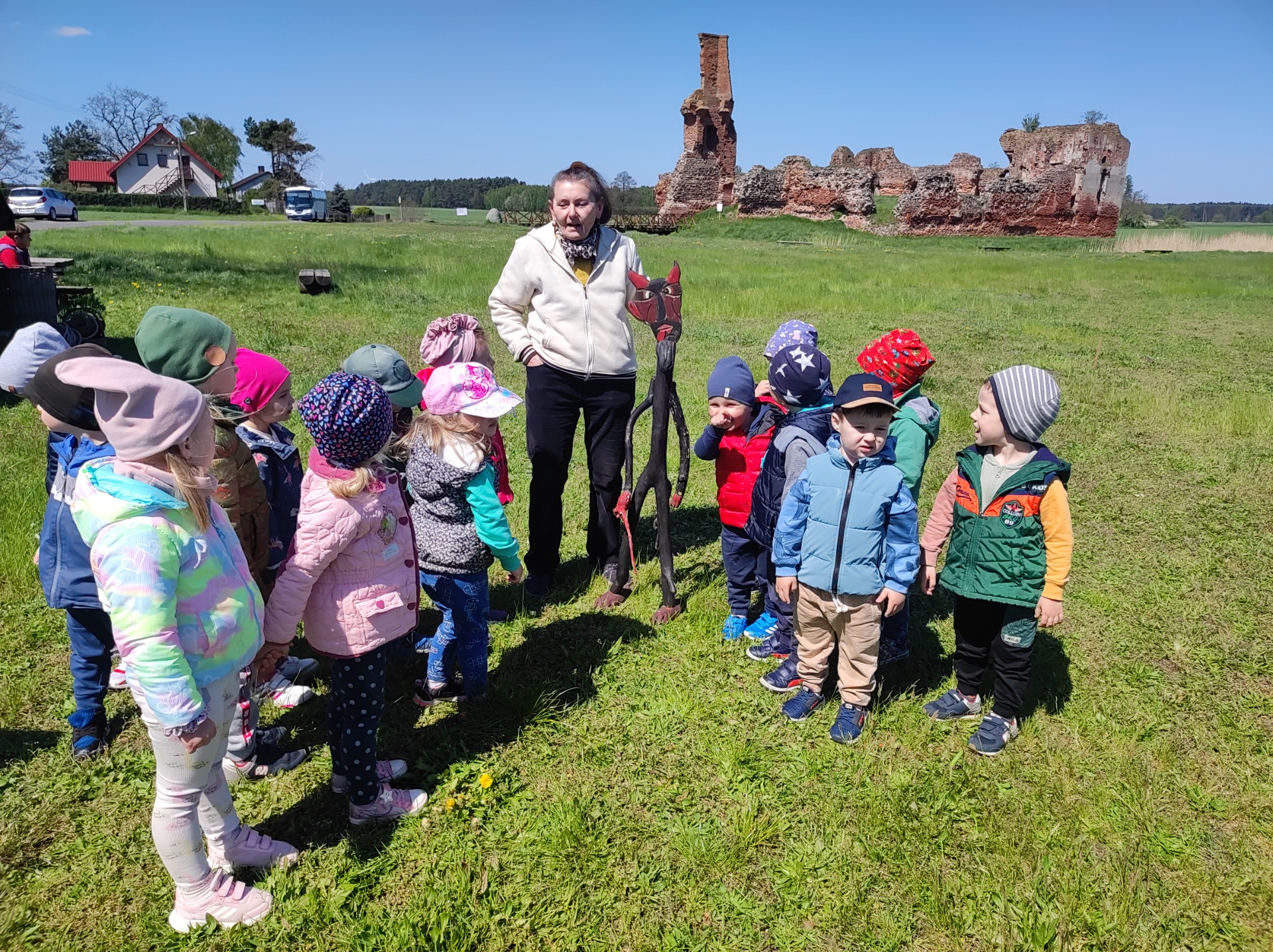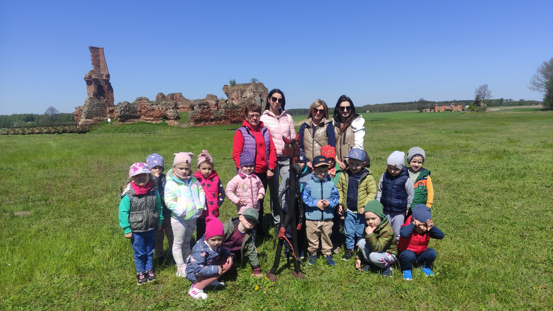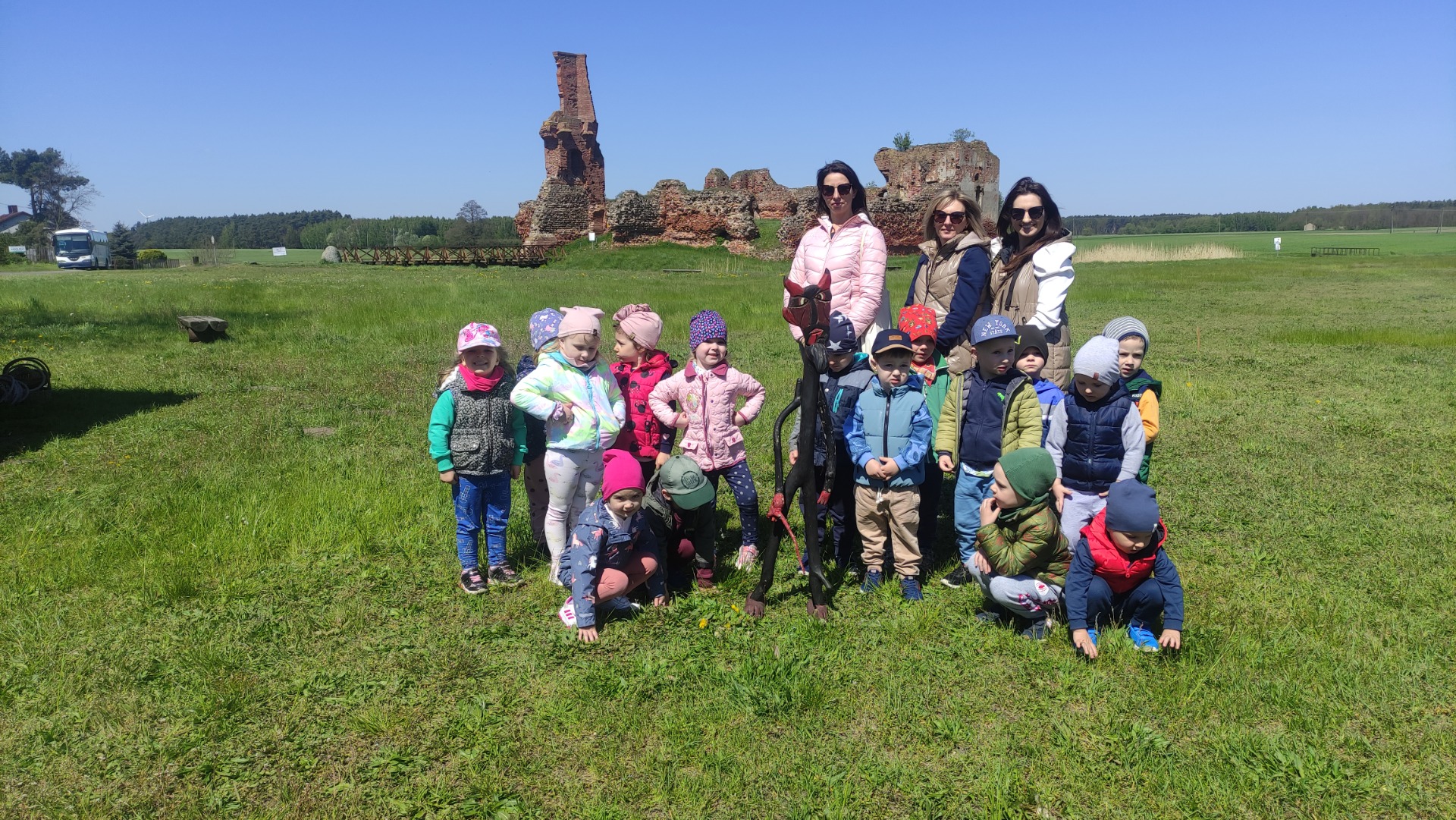 9 maja grupa Krasnali wybrała się na wycieczkę do Siedliska przy zamku w Besiekierach. Dzieci poznały proces pozyskiwania mąki w dawnych czasach i dziś, a następnie przygotowały własnoręcznie podpłomyki, które zostały upieczone przez panie na piecu i zjedzone ze smakiem przez dzieci w wybranej przez siebie formie (suchy, z masłem, z miodem lub pełen zestaw :). Odbył się piknik na świeżym powietrzu. Następnym punktem naszej wycieczki był udział w zabawie tropiącej podczas której maluchy miały okazję poznać legendę związaną z zamkiem oraz z diabłem Borutą. Następnie przedszkolaki sprawdziły swoje siły w różnych konkurencjach sportowych w pobliżu zamku, w tym, w: przeciąganiu liny, sadzeniu ziemniaków, rzucaniu wianuszkiem na kołeczek, przenoszeniu kukurydzy na drewnianej łyżce, czy wyścigach do palika. Nie zabrakło również spaceru wokół ruin i opowieści go dotyczących. Miejsce zaczarowało nas swoim urokiem :)