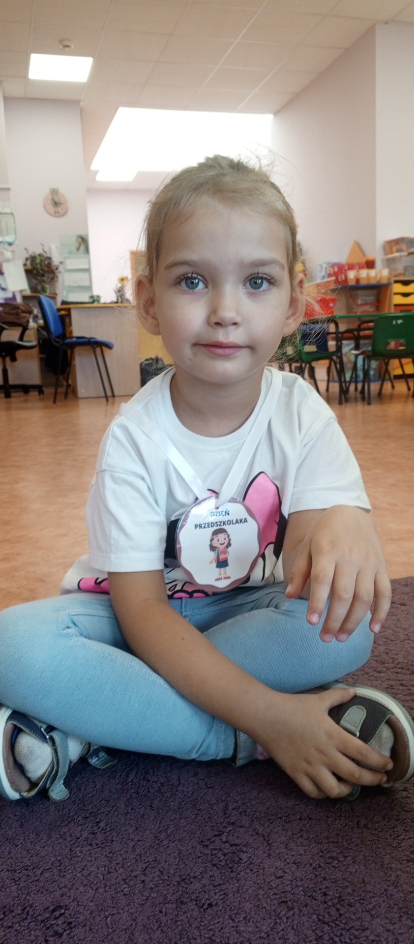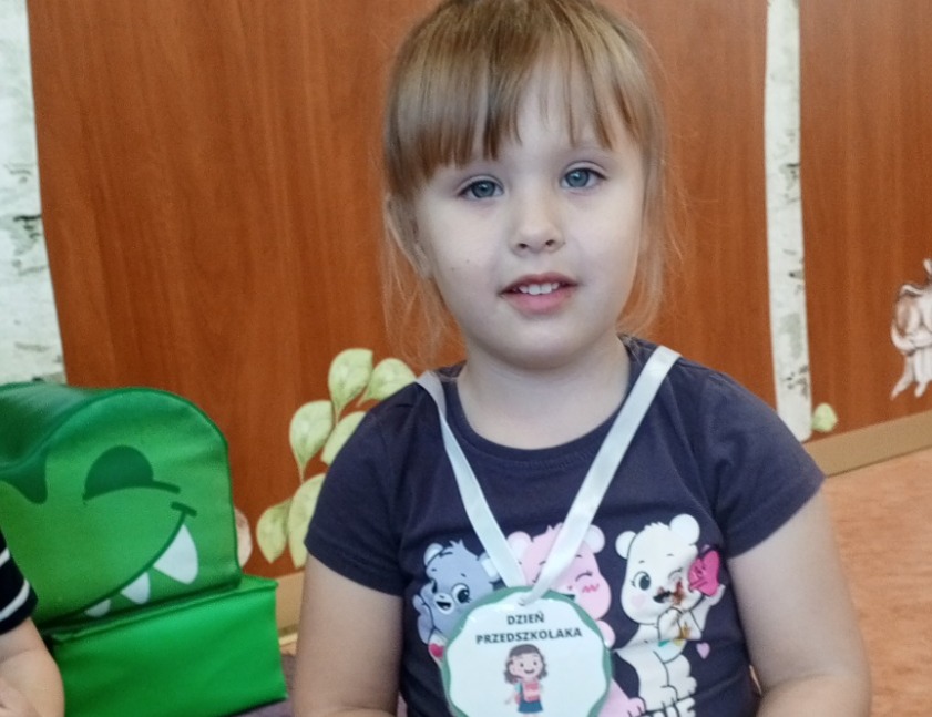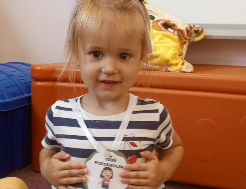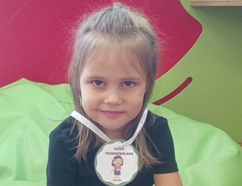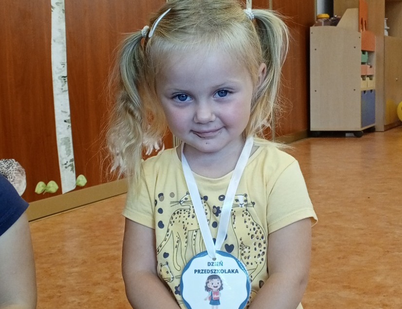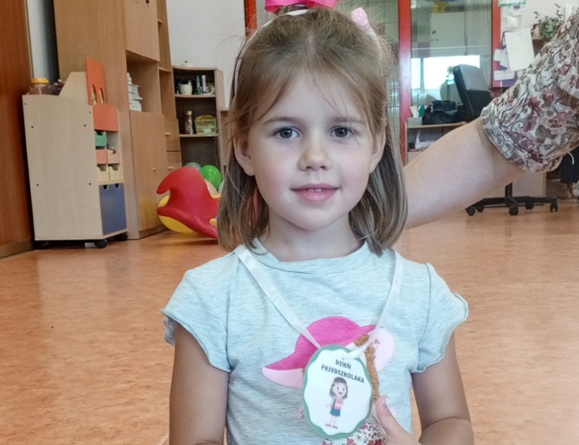 Marysia z medalem z okazji Dnia Przedszkolaka