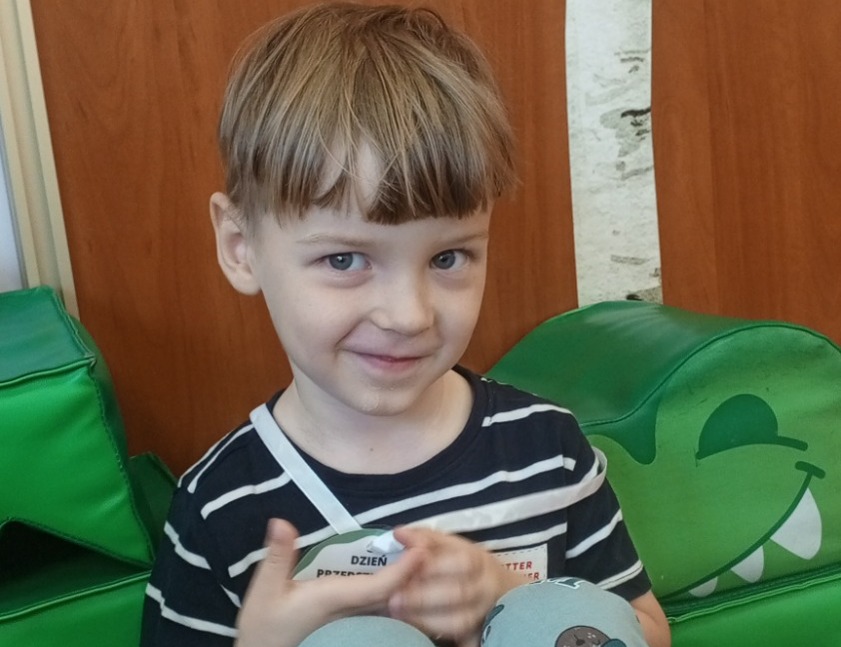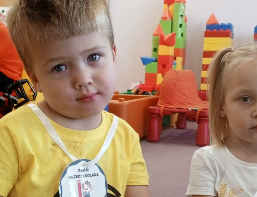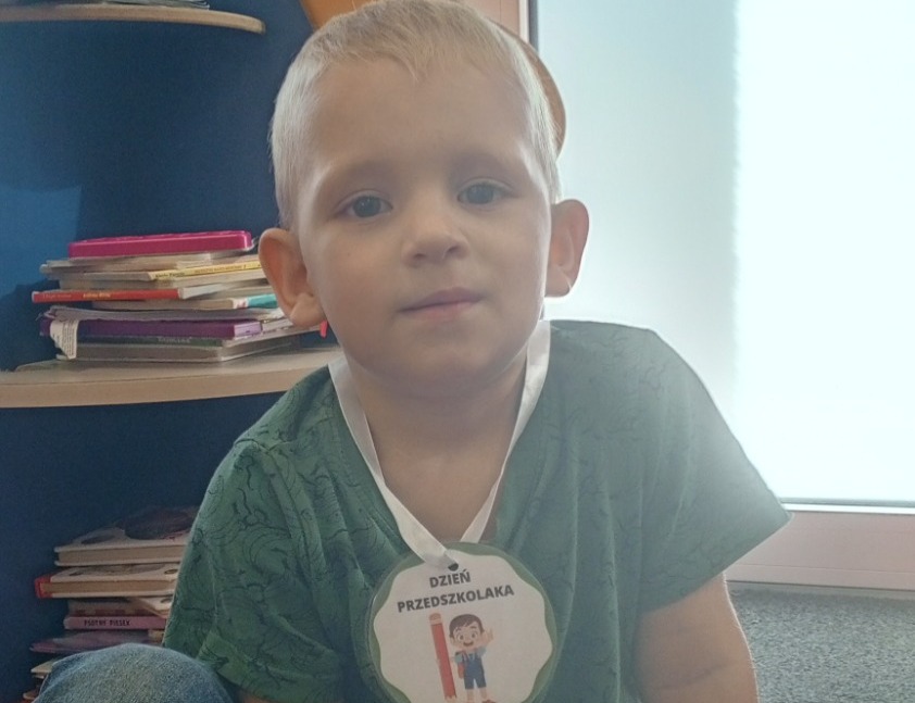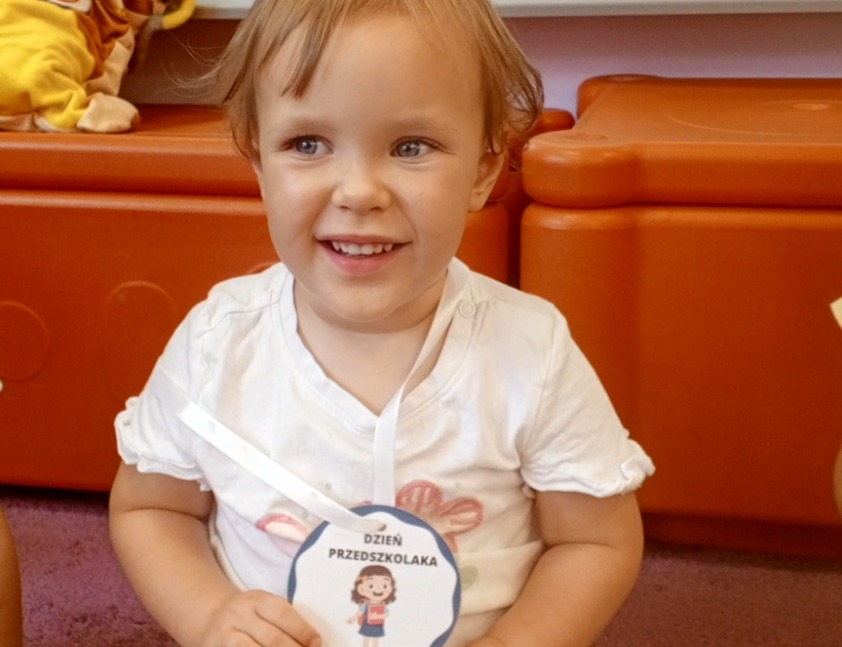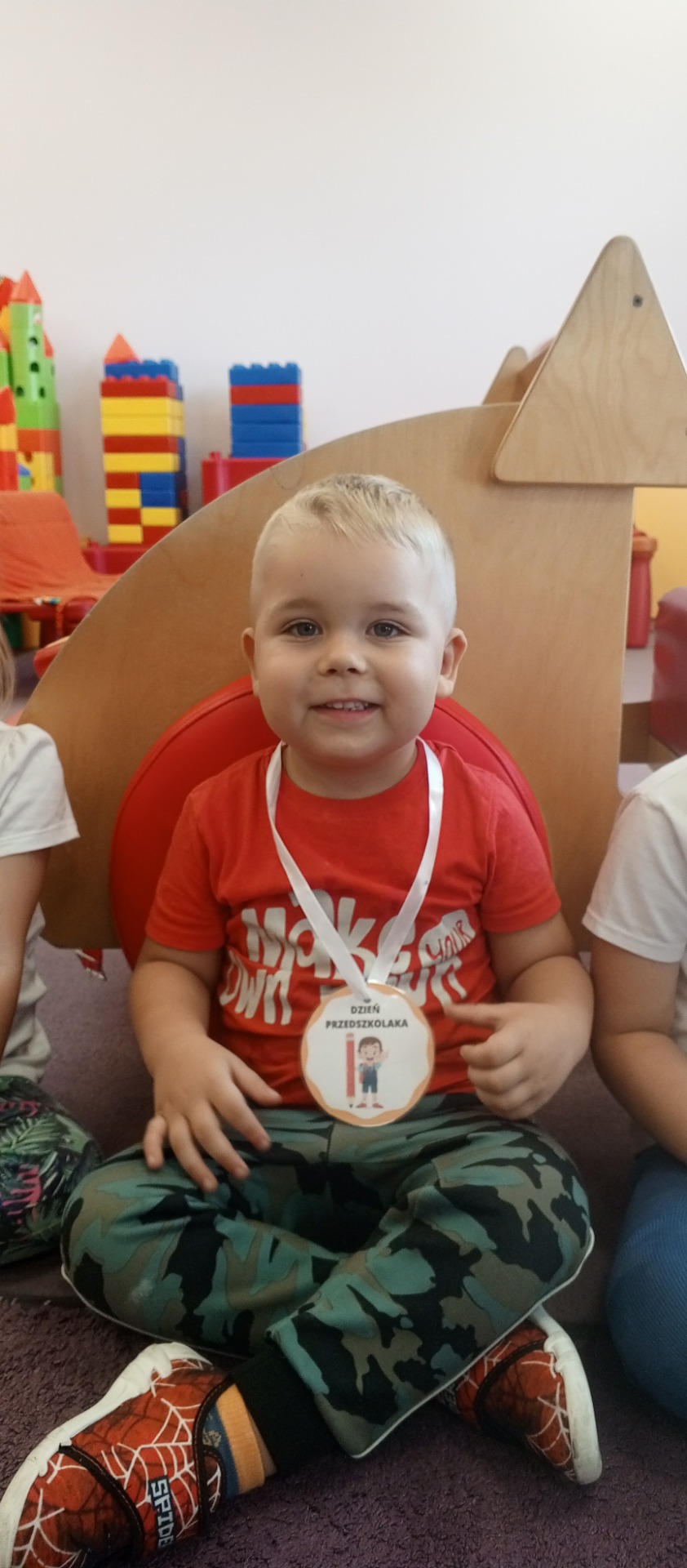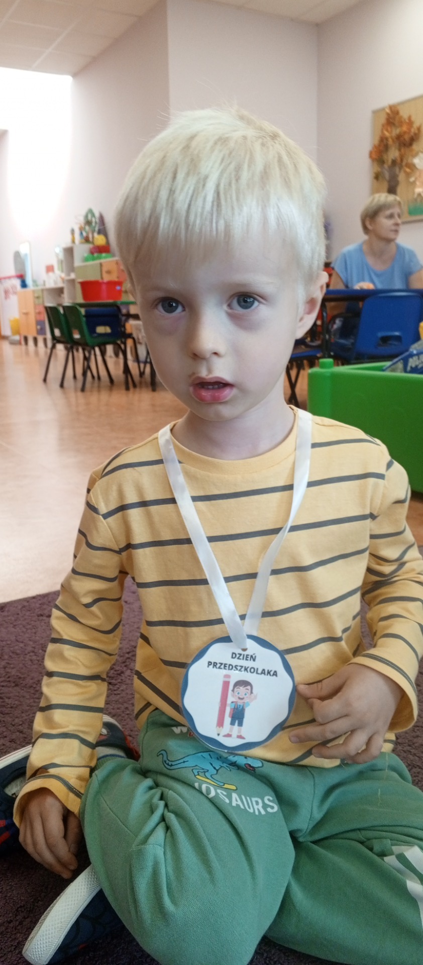 Piotrek z medalem z okazji Dnia Przedszkolaka