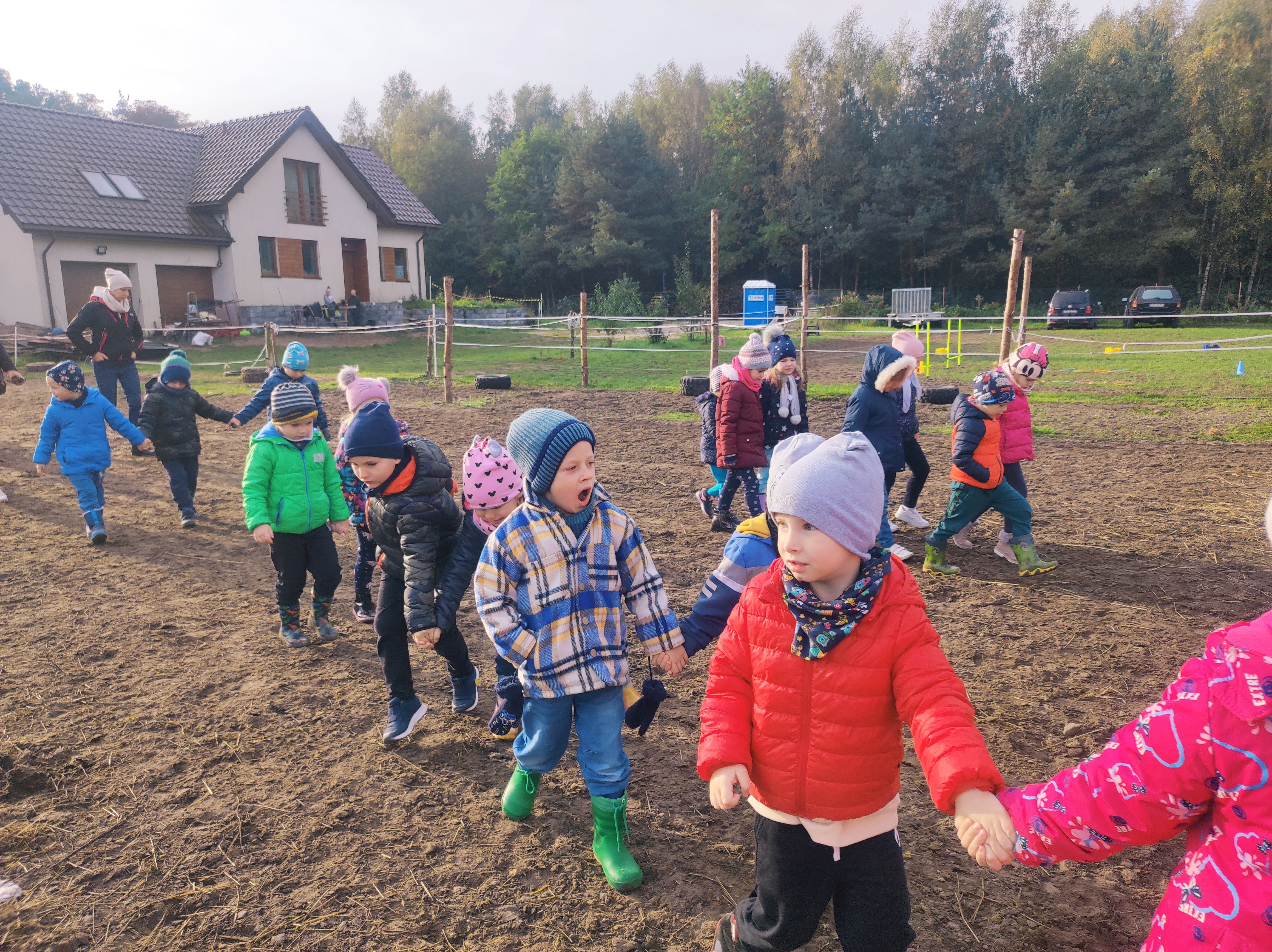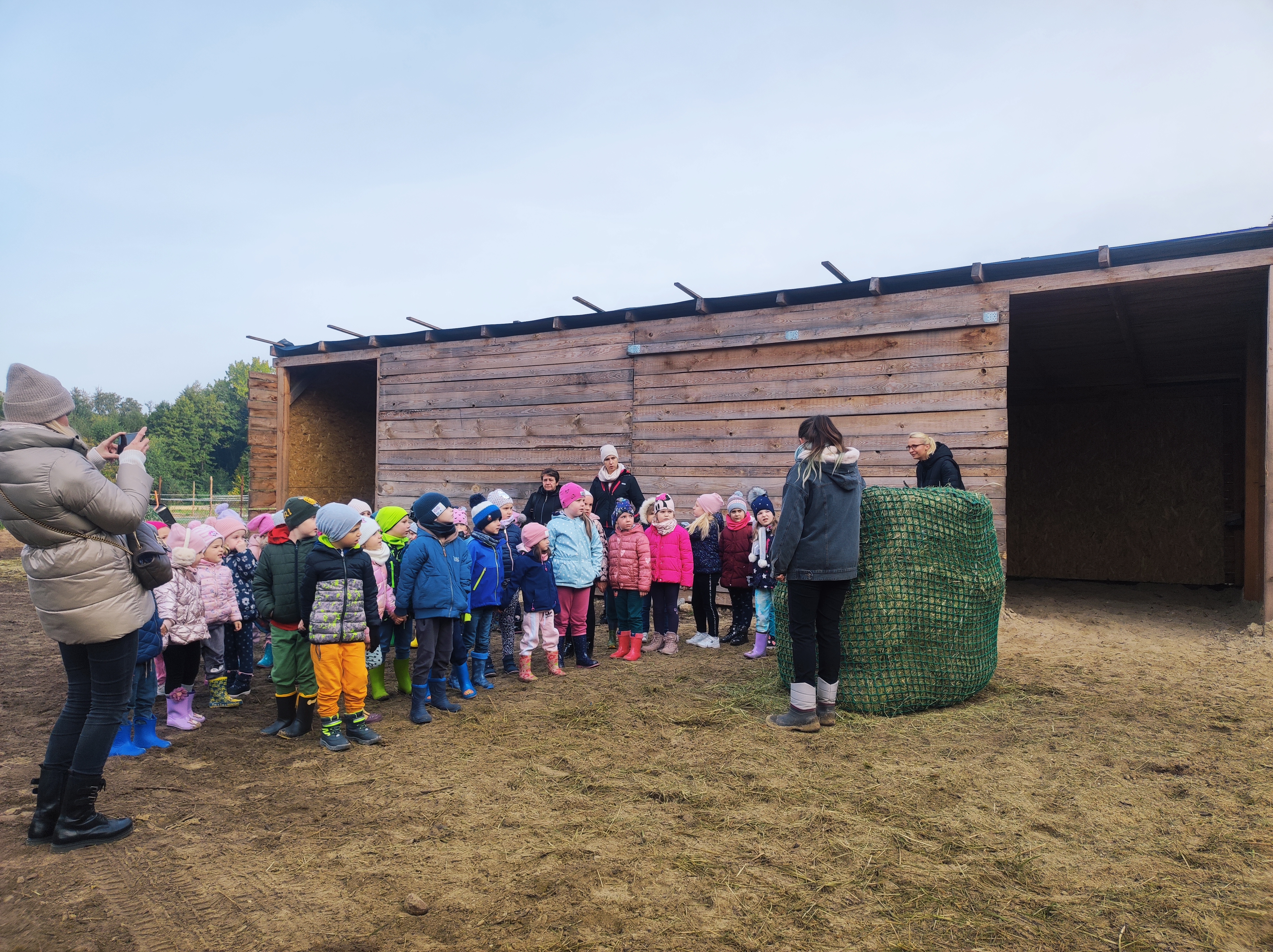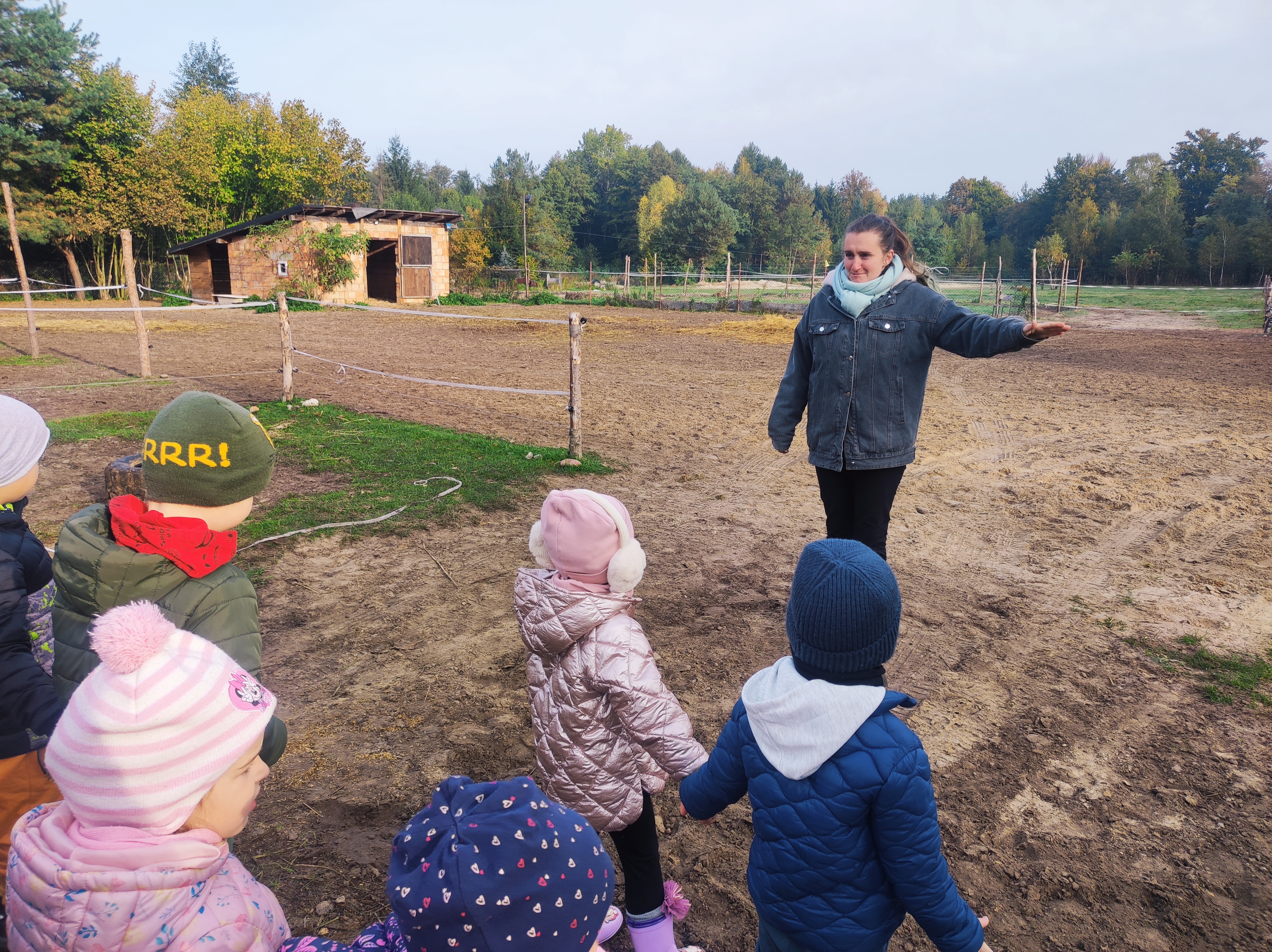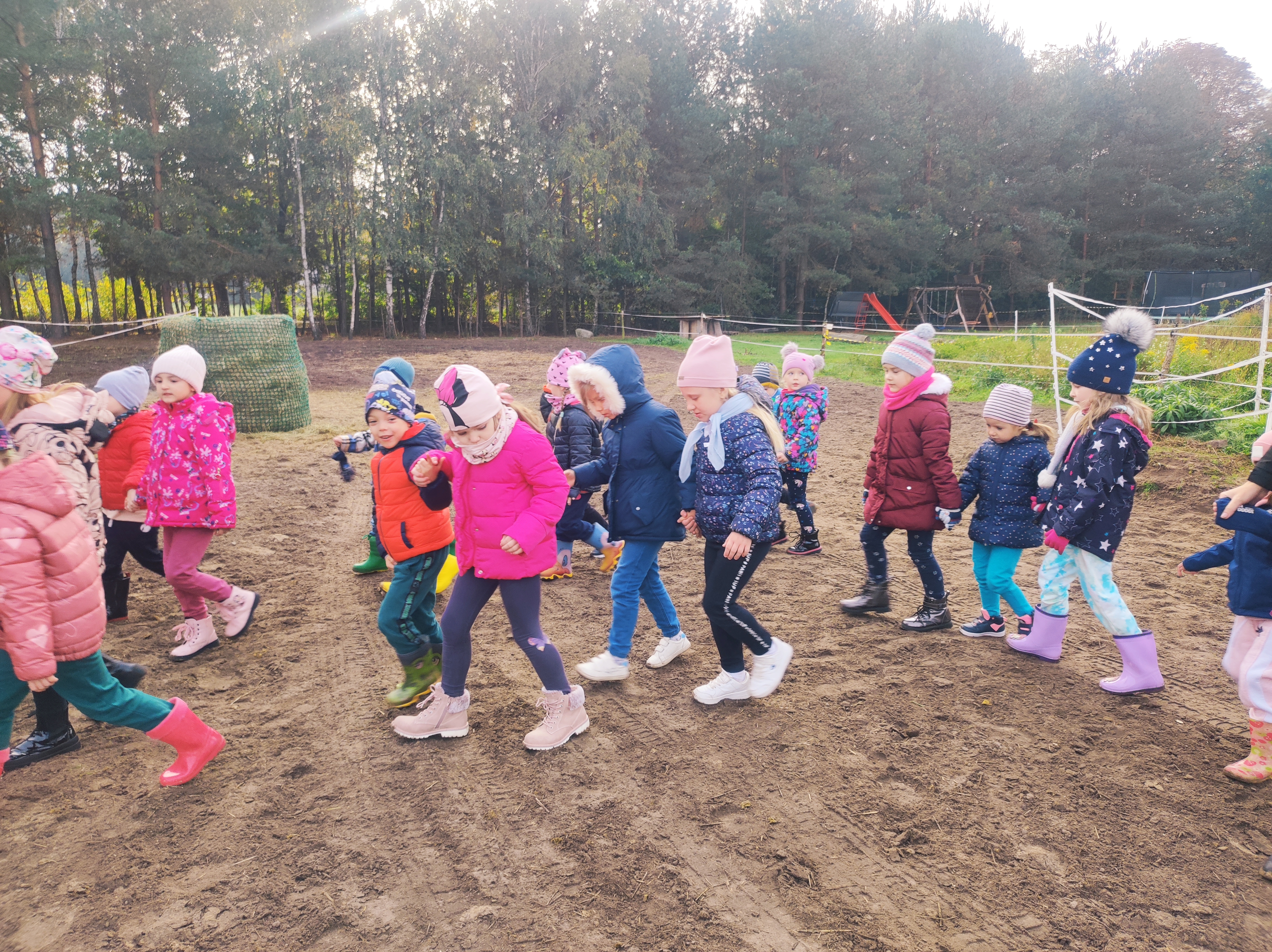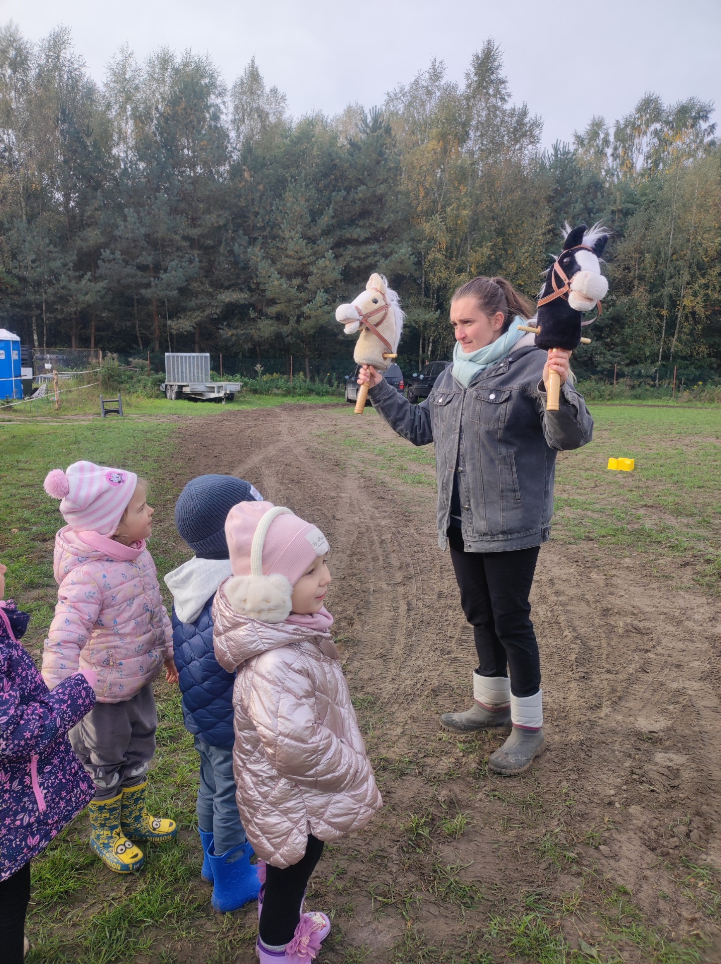 19 października grupa Podróżników odwiedziła Stajnię Freedom w Dąbrówce Wielkiej. Pani Kamila serdecznie przywitała przedszkolaków i oprowadziła po stajni. Dzieci dowiedziały się co to jest kupaczka (narzędzia do zbierania końskich odchodów) , lizawka (sól którą liżą konie), poidło oraz co lubią jeść konie:)) Chętni Podróżnicy wyczesali oraz pogłaskali konia Doratkę, kucyka Basię, a niektórzy nawet odważyli się wsiąść i obejść małą rundkę na Doratce i Chmurce. Nie zabrakło również aktywności ruchowej… dzieci pokonały przygotowany tor przeszkód w ramach sportowej rywalizacji "Hobby Horse" . Na koniec dzieci wybrały się na pastwisko po trawę dla koni, do którego prowadziła krótka leśna ścieżka. Ponadto mieszkańcami gospodarstwa były króliki, kaczki oraz gęsi, które również zostały nakarmione. To była prawdziwa końska dawka przygody!!:))