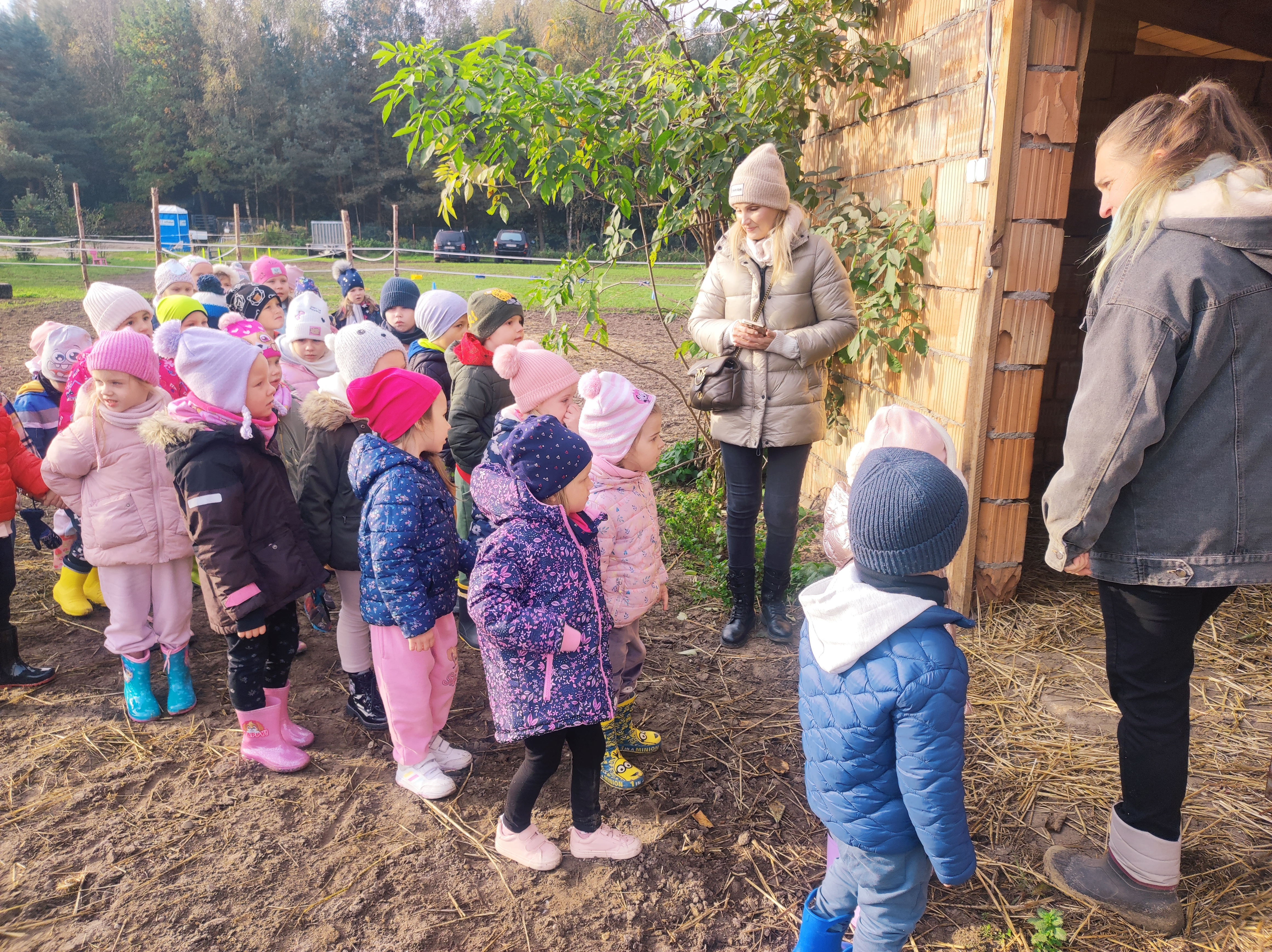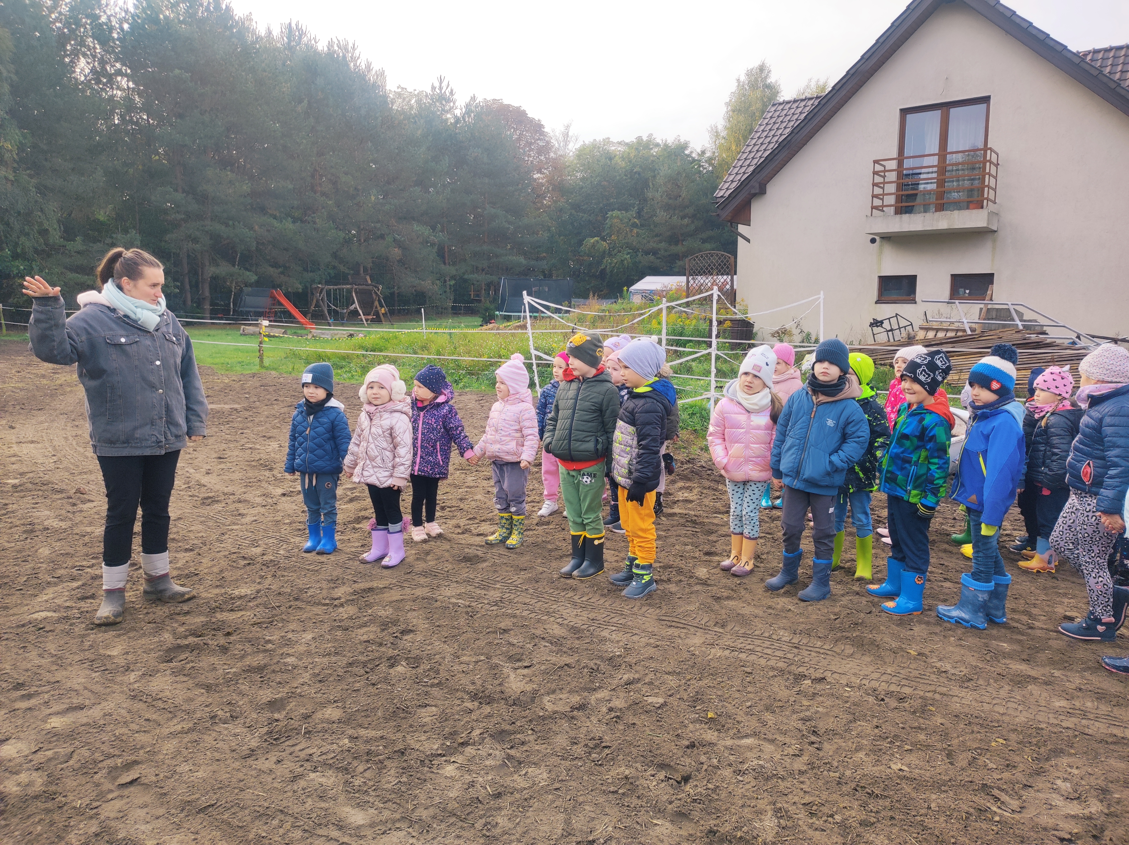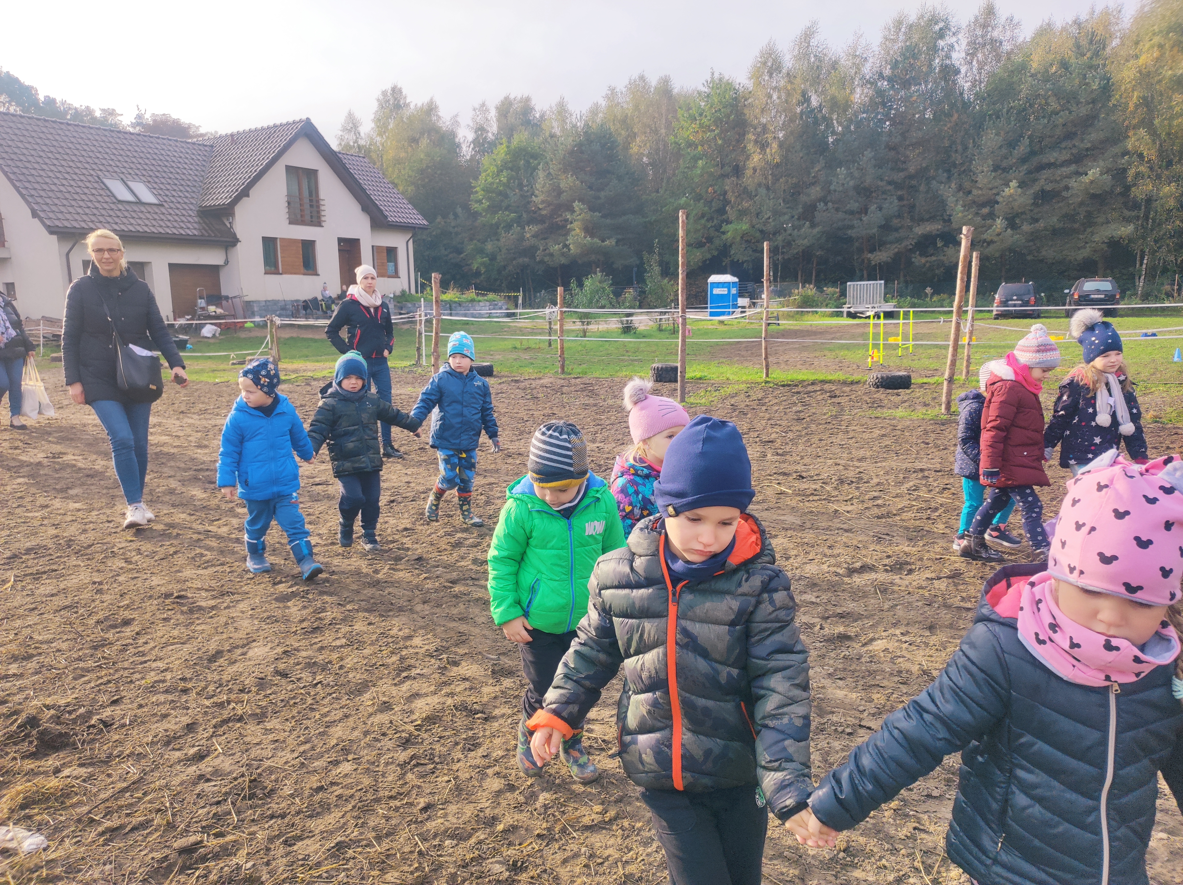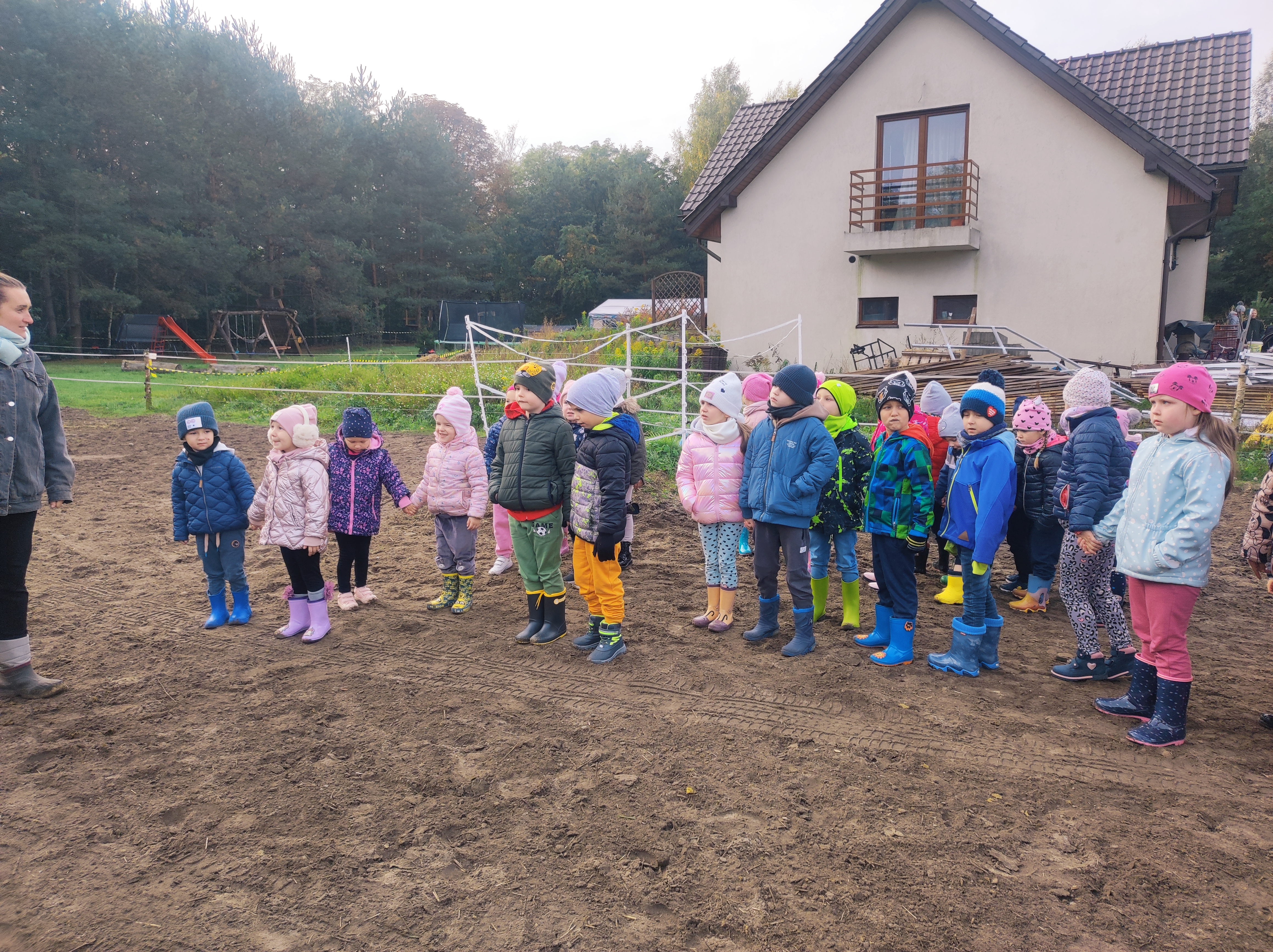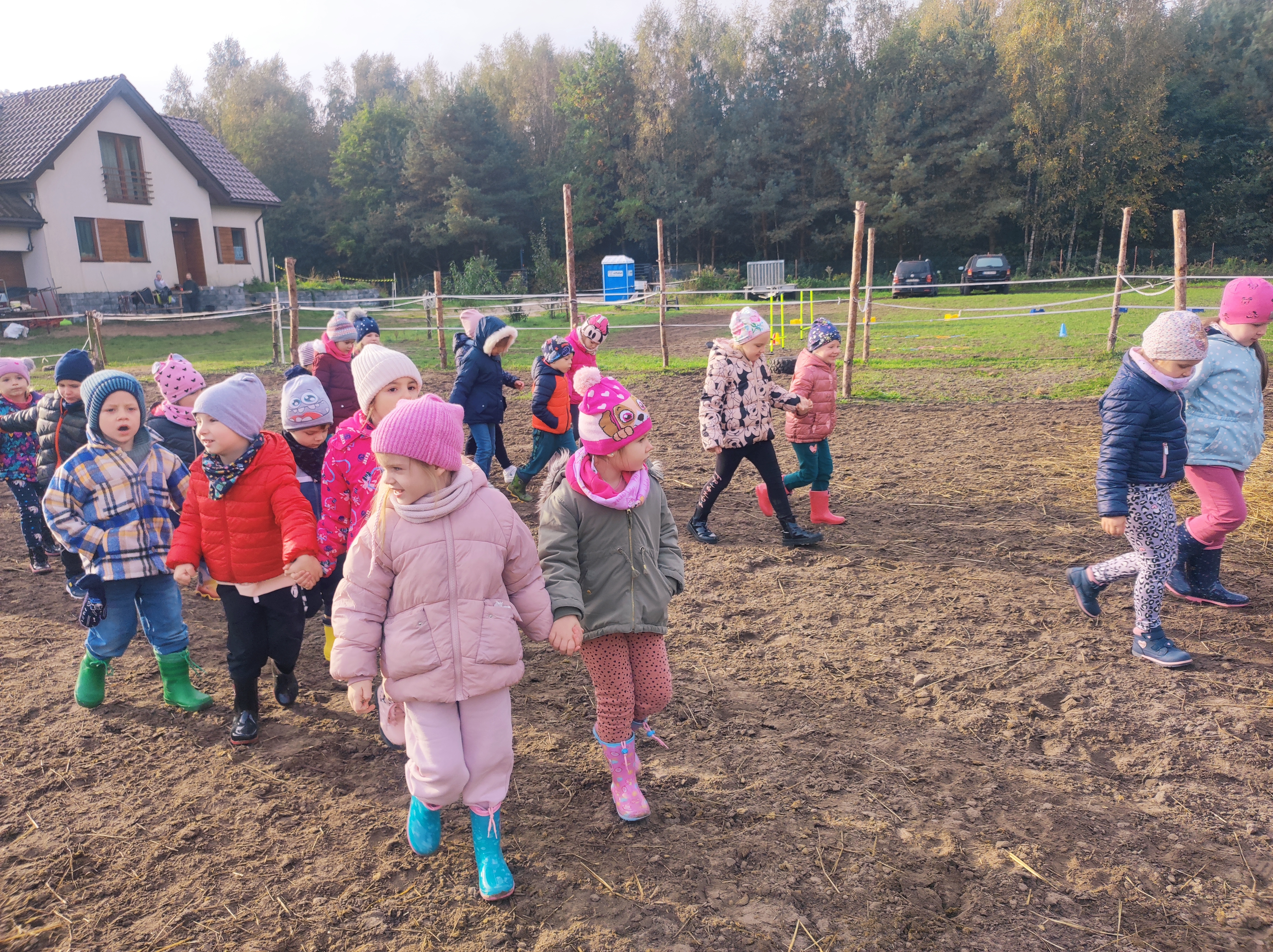 19 października grupa Podróżników odwiedziła Stajnię Freedom w Dąbrówce Wielkiej. Pani Kamila serdecznie przywitała przedszkolaków i oprowadziła po stajni. Dzieci dowiedziały się co to jest kupaczka (narzędzia do zbierania końskich odchodów) , lizawka (sól którą liżą konie), poidło oraz co lubią jeść konie:)) Chętni Podróżnicy wyczesali oraz pogłaskali konia Doratkę, kucyka Basię, a niektórzy nawet odważyli się wsiąść i obejść małą rundkę na Doratce i Chmurce. Nie zabrakło również aktywności ruchowej… dzieci pokonały przygotowany tor przeszkód w ramach sportowej rywalizacji "Hobby Horse" . Na koniec dzieci wybrały się na pastwisko po trawę dla koni, do którego prowadziła krótka leśna ścieżka. Ponadto mieszkańcami gospodarstwa były króliki, kaczki oraz gęsi, które również zostały nakarmione. To była prawdziwa końska dawka przygody!!:))