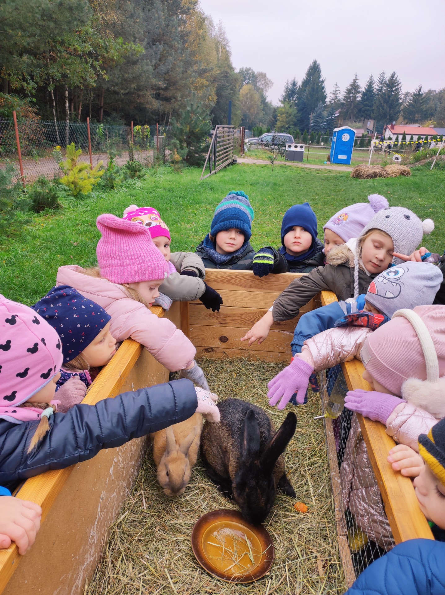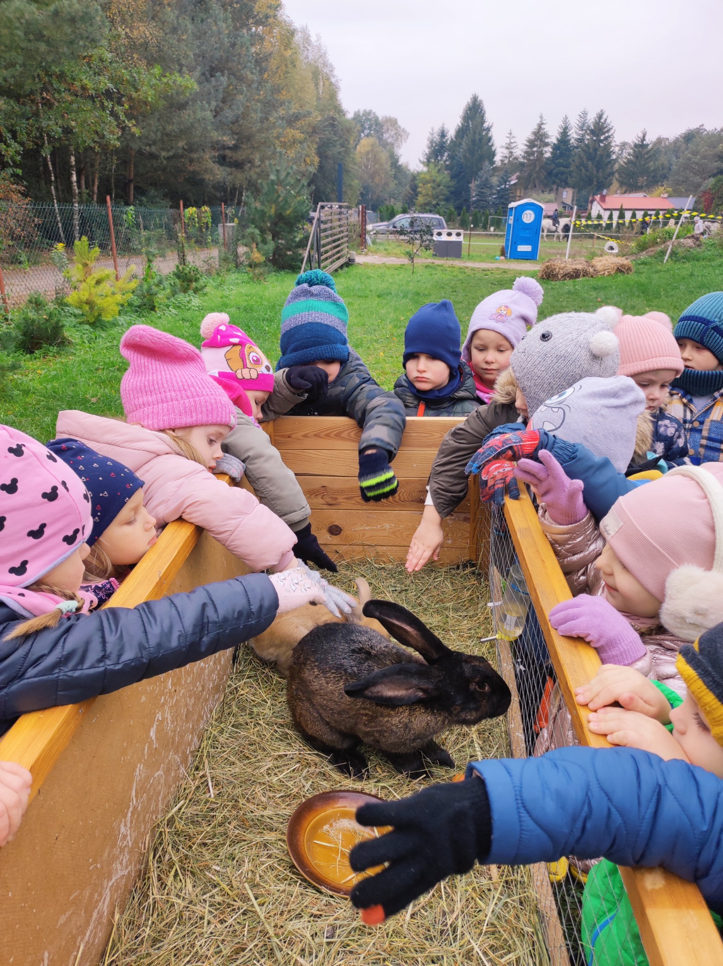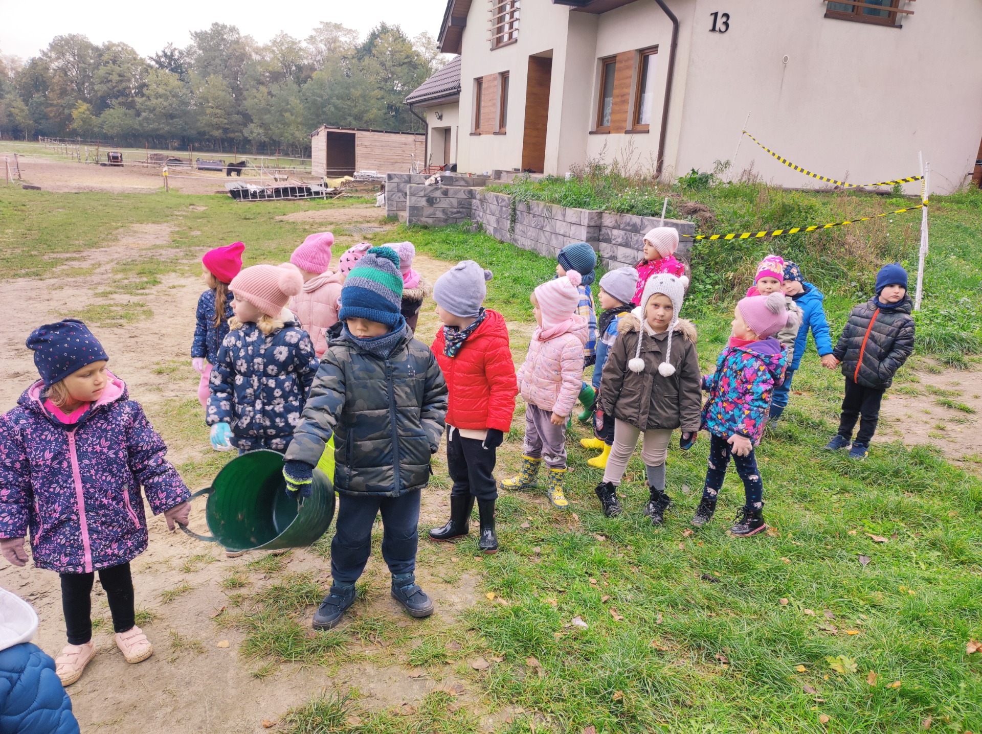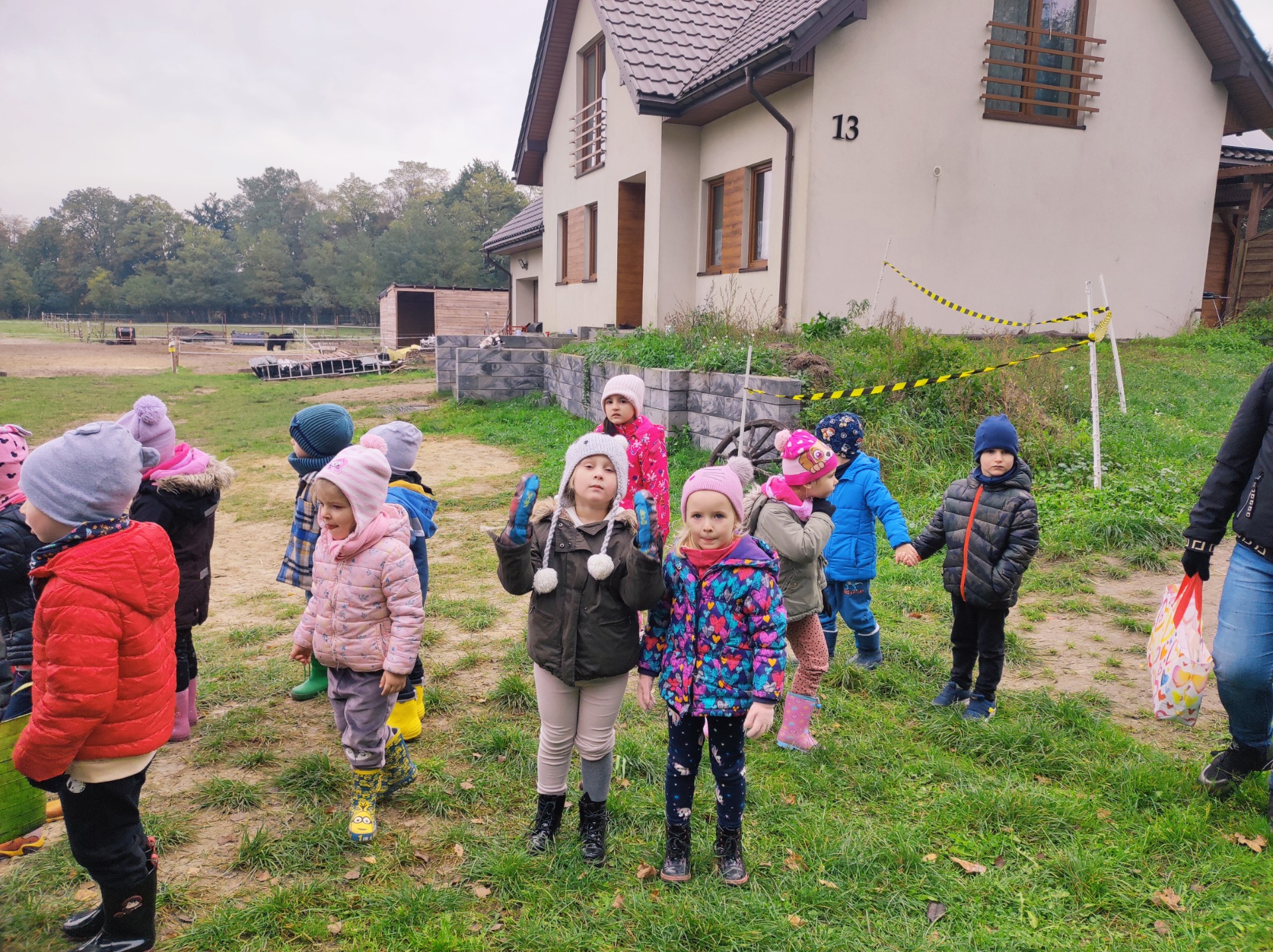 19 października grupa Podróżników odwiedziła Stajnię Freedom w Dąbrówce Wielkiej. Pani Kamila serdecznie przywitała przedszkolaków i oprowadziła po stajni. Dzieci dowiedziały się co to jest kupaczka (narzędzia do zbierania końskich odchodów) , lizawka (sól którą liżą konie), poidło oraz co lubią jeść konie:)) Chętni Podróżnicy wyczesali oraz pogłaskali konia Doratkę, kucyka Basię, a niektórzy nawet odważyli się wsiąść i obejść małą rundkę na Doratce i Chmurce. Nie zabrakło również aktywności ruchowej… dzieci pokonały przygotowany tor przeszkód w ramach sportowej rywalizacji "Hobby Horse" . Na koniec dzieci wybrały się na pastwisko po trawę dla koni, do którego prowadziła krótka leśna ścieżka. Ponadto mieszkańcami gospodarstwa były króliki, kaczki oraz gęsi, które również zostały nakarmione. To była prawdziwa końska dawka przygody!!:))