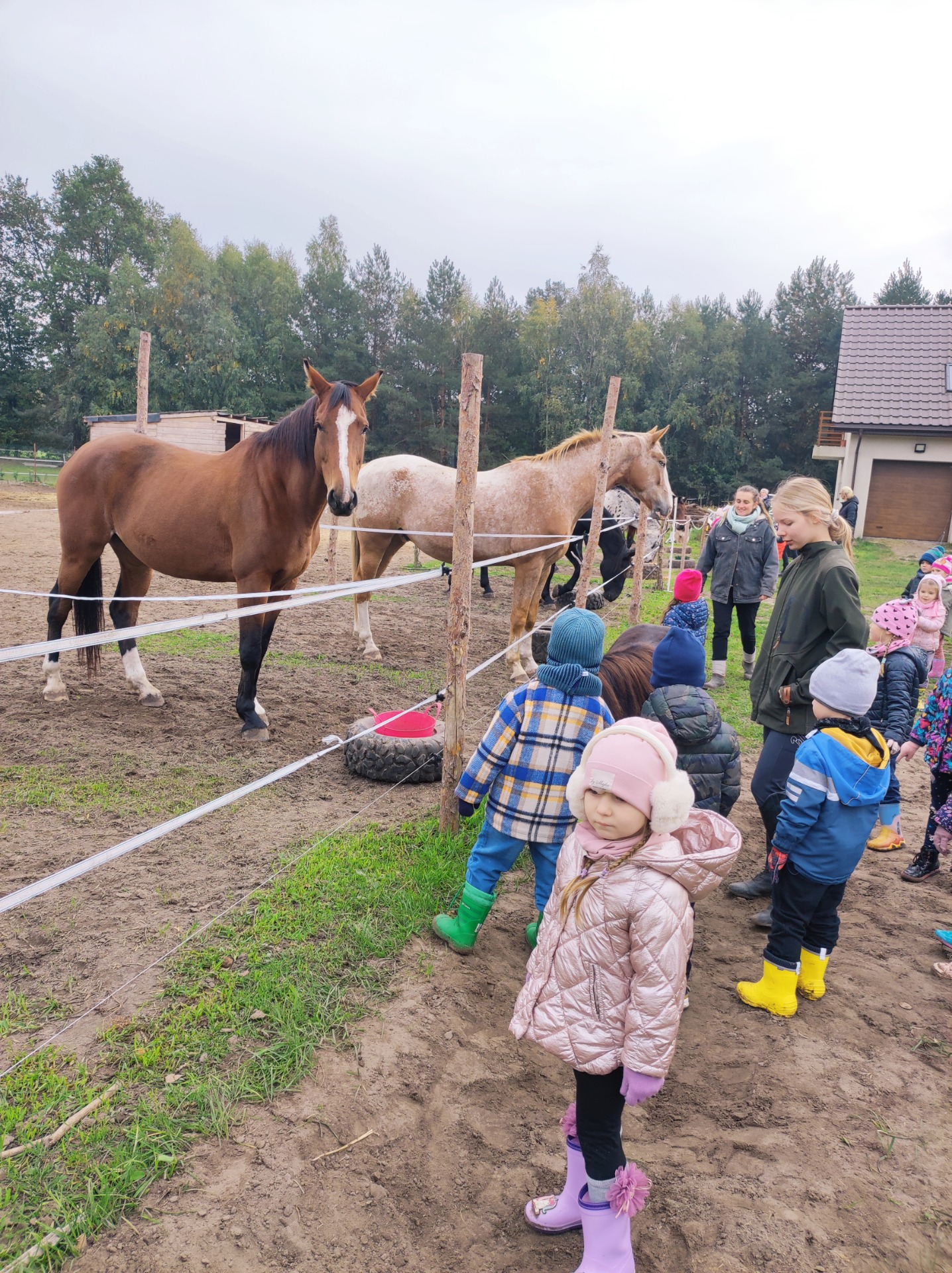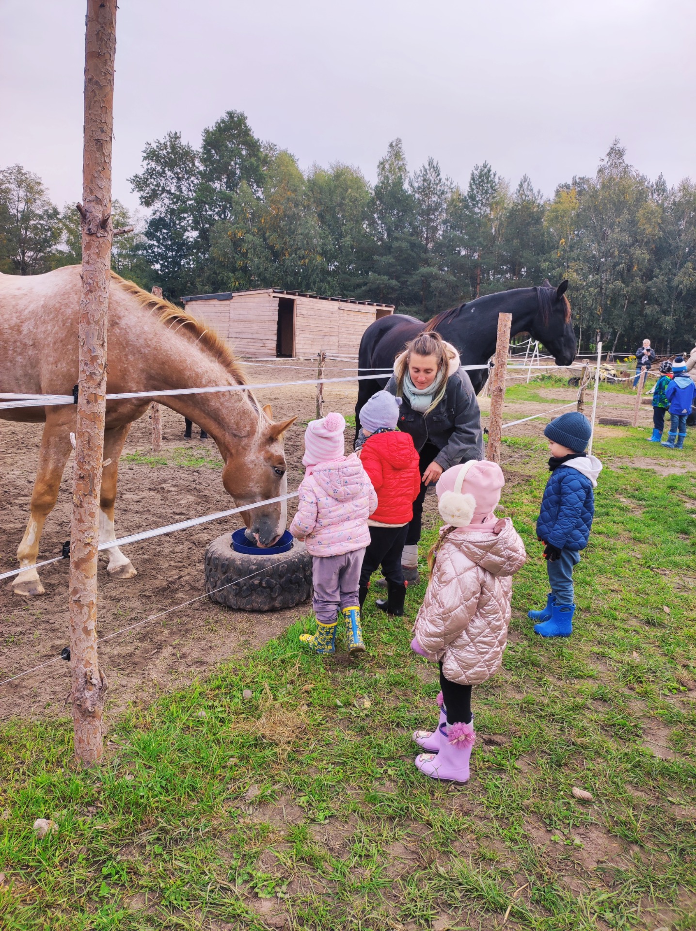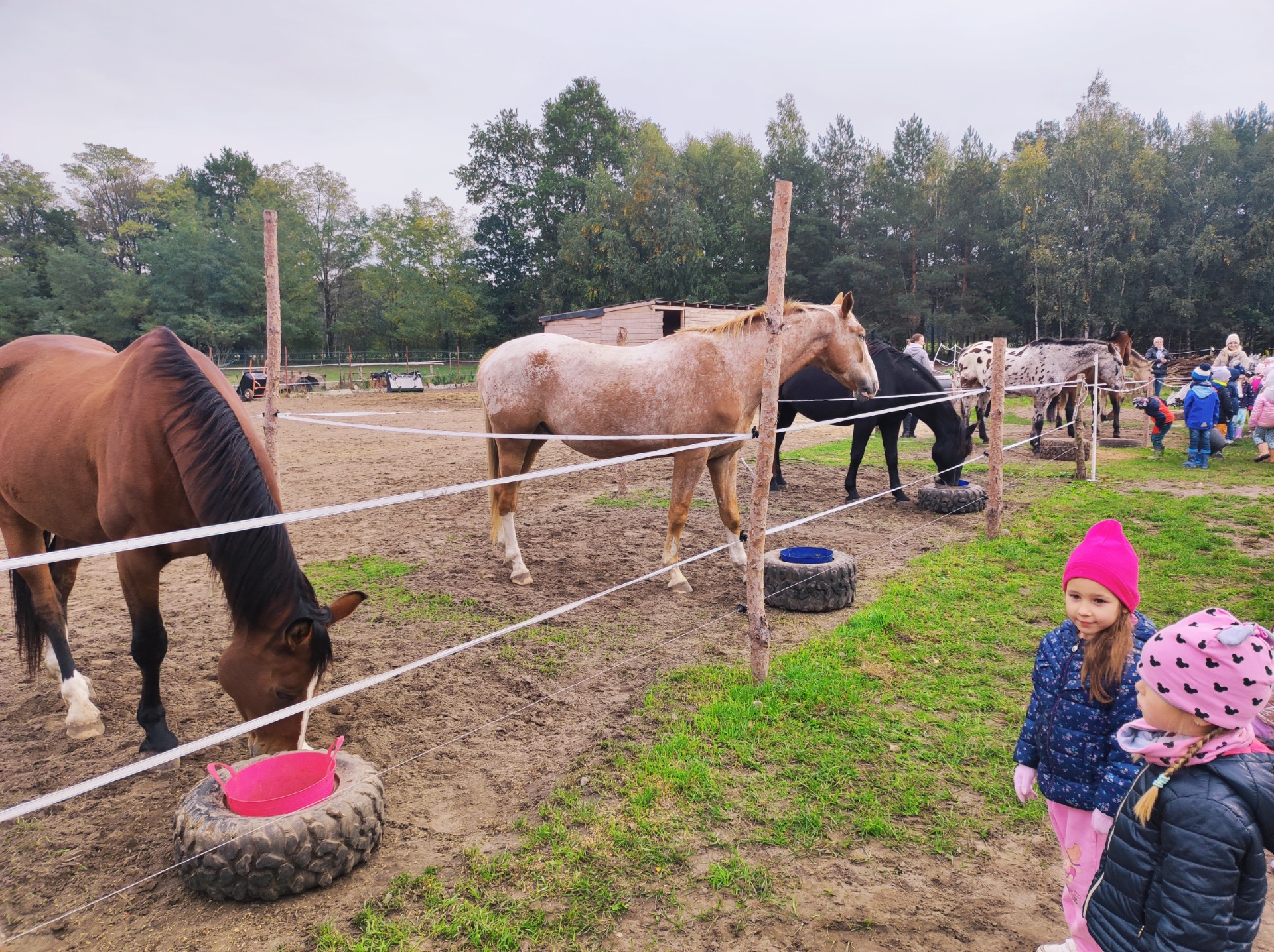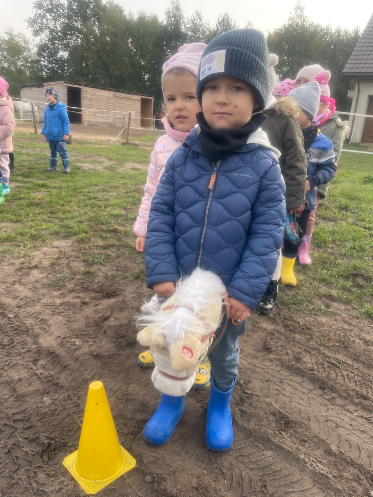 19 października grupa Podróżników odwiedziła Stajnię Freedom w Dąbrówce Wielkiej. Pani Kamila serdecznie przywitała przedszkolaków i oprowadziła po stajni. Dzieci dowiedziały się co to jest kupaczka (narzędzia do zbierania końskich odchodów) , lizawka (sól którą liżą konie), poidło oraz co lubią jeść konie:)) Chętni Podróżnicy wyczesali oraz pogłaskali konia Doratkę, kucyka Basię, a niektórzy nawet odważyli się wsiąść i obejść małą rundkę na Doratce i Chmurce. Nie zabrakło również aktywności ruchowej… dzieci pokonały przygotowany tor przeszkód w ramach sportowej rywalizacji "Hobby Horse" . Na koniec dzieci wybrały się na pastwisko po trawę dla koni, do którego prowadziła krótka leśna ścieżka. Ponadto mieszkańcami gospodarstwa były króliki, kaczki oraz gęsi, które również zostały nakarmione. To była prawdziwa końska dawka przygody!!:))
