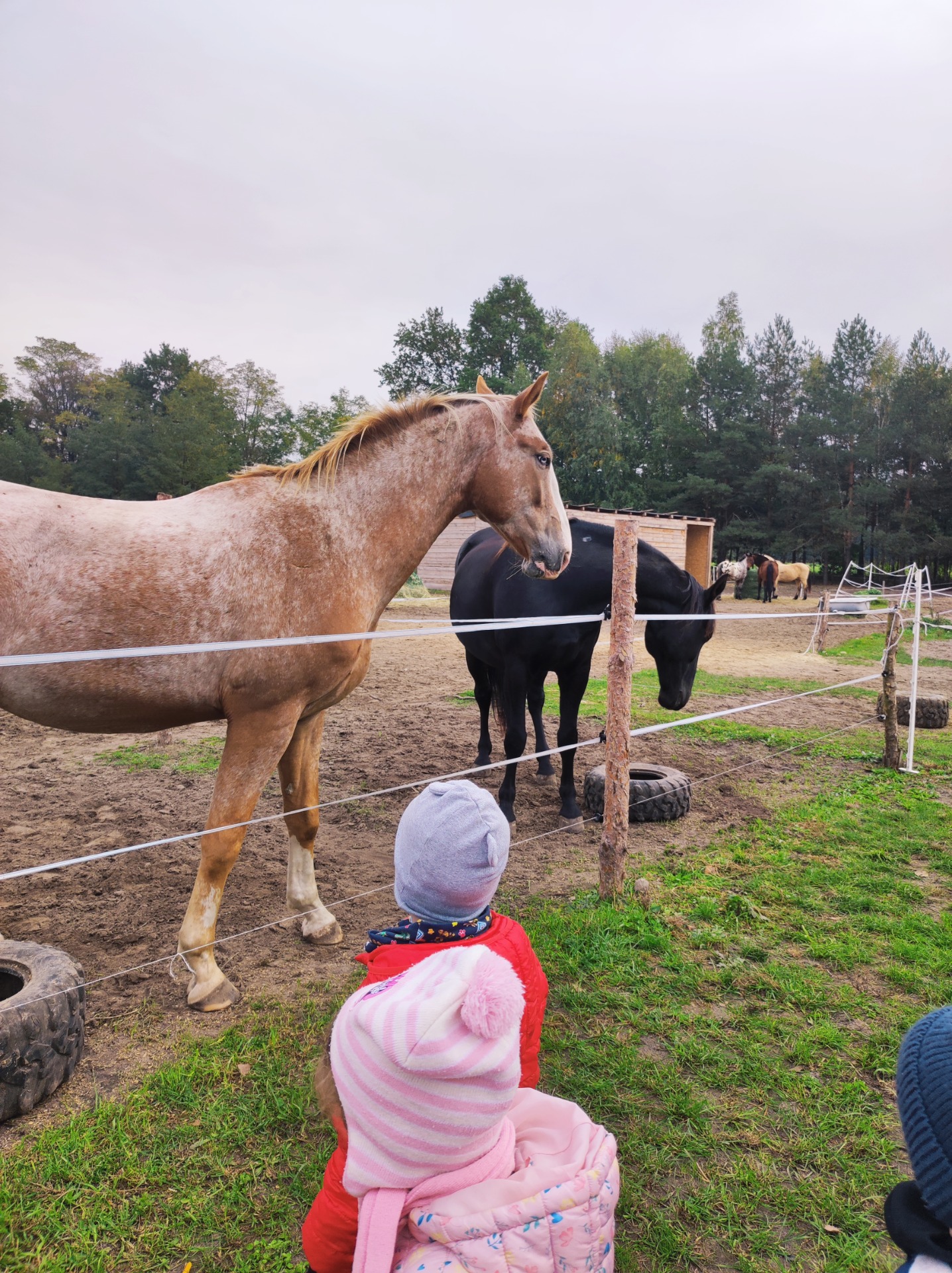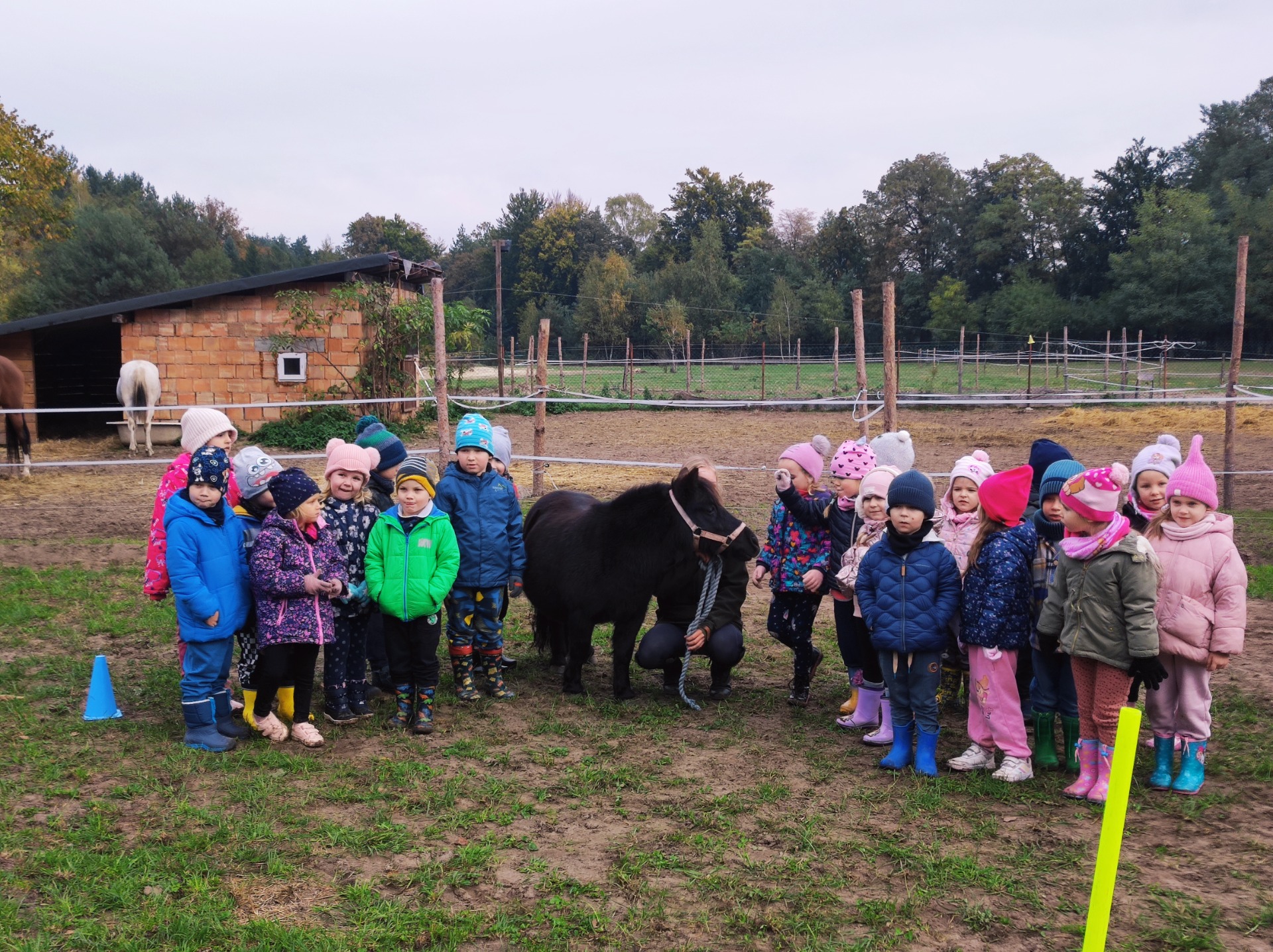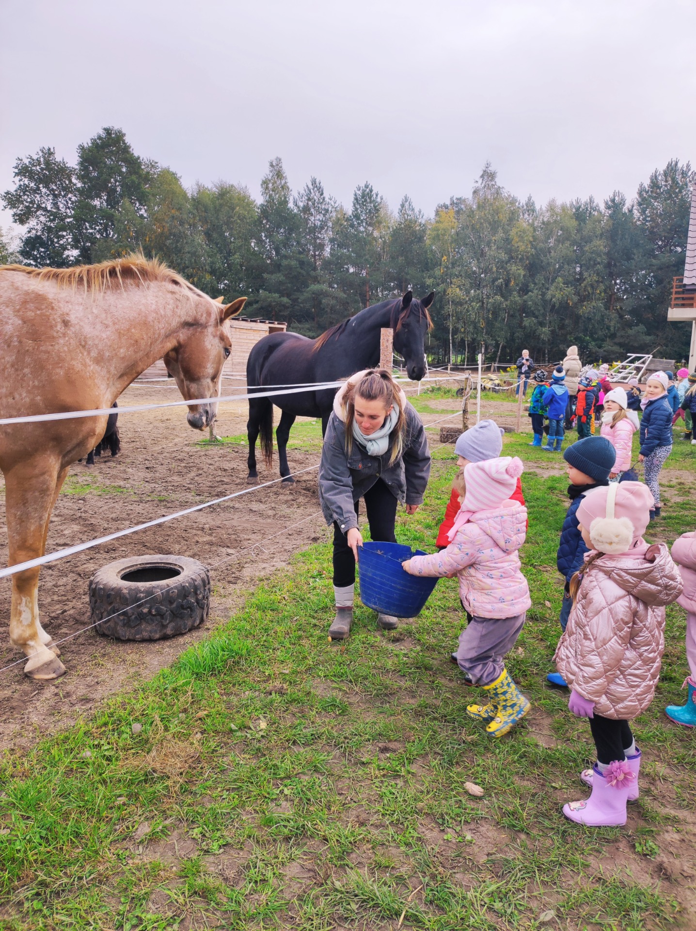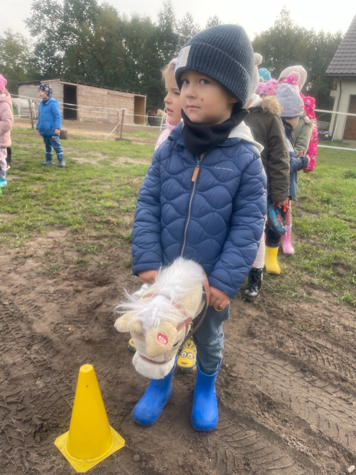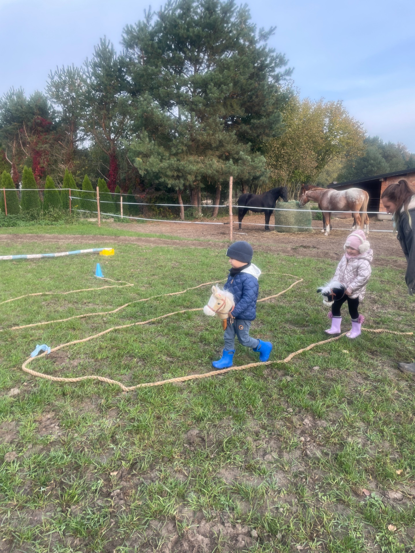 19 października grupa Podróżników odwiedziła Stajnię Freedom w Dąbrówce Wielkiej. Pani Kamila serdecznie przywitała przedszkolaków i oprowadziła po stajni. Dzieci dowiedziały się co to jest kupaczka (narzędzia do zbierania końskich odchodów) , lizawka (sól którą liżą konie), poidło oraz co lubią jeść konie:)) Chętni Podróżnicy wyczesali oraz pogłaskali konia Doratkę, kucyka Basię, a niektórzy nawet odważyli się wsiąść i obejść małą rundkę na Doratce i Chmurce. Nie zabrakło również aktywności ruchowej… dzieci pokonały przygotowany tor przeszkód w ramach sportowej rywalizacji "Hobby Horse" . Na koniec dzieci wybrały się na pastwisko po trawę dla koni, do którego prowadziła krótka leśna ścieżka. Ponadto mieszkańcami gospodarstwa były króliki, kaczki oraz gęsi, które również zostały nakarmione. To była prawdziwa końska dawka przygody!!:))
