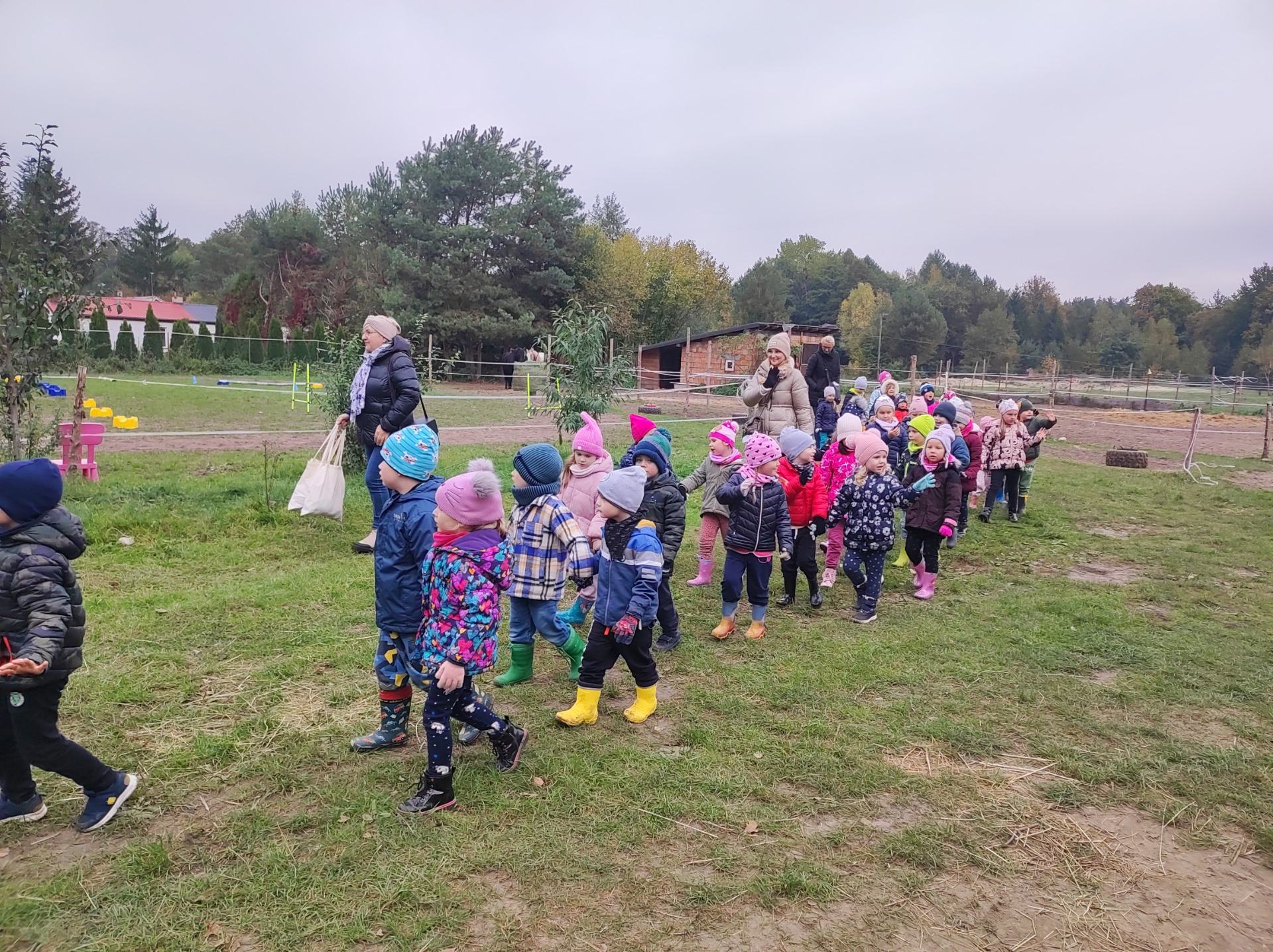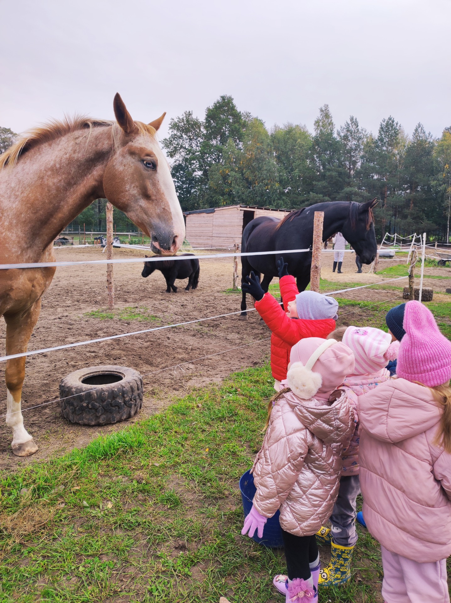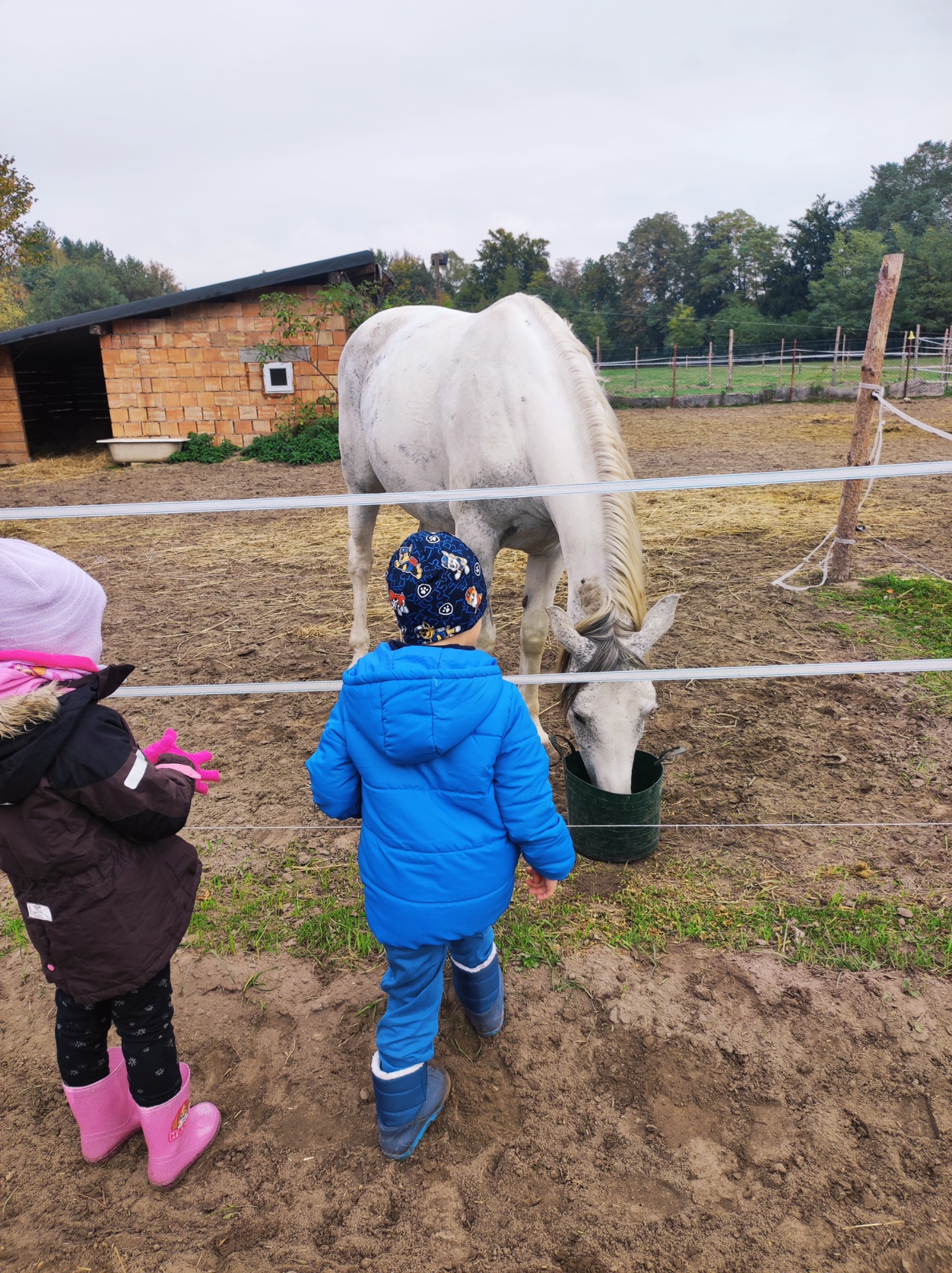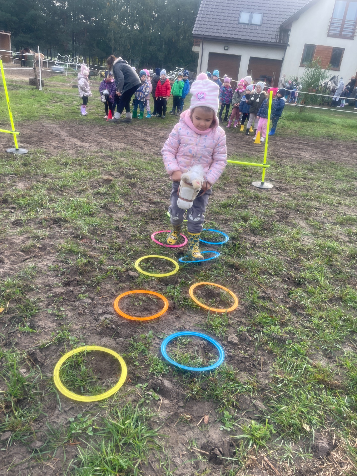 19 października grupa Podróżników odwiedziła Stajnię Freedom w Dąbrówce Wielkiej. Pani Kamila serdecznie przywitała przedszkolaków i oprowadziła po stajni. Dzieci dowiedziały się co to jest kupaczka (narzędzia do zbierania końskich odchodów) , lizawka (sól którą liżą konie), poidło oraz co lubią jeść konie:)) Chętni Podróżnicy wyczesali oraz pogłaskali konia Doratkę, kucyka Basię, a niektórzy nawet odważyli się wsiąść i obejść małą rundkę na Doratce i Chmurce. Nie zabrakło również aktywności ruchowej… dzieci pokonały przygotowany tor przeszkód w ramach sportowej rywalizacji "Hobby Horse" . Na koniec dzieci wybrały się na pastwisko po trawę dla koni, do którego prowadziła krótka leśna ścieżka. Ponadto mieszkańcami gospodarstwa były króliki, kaczki oraz gęsi, które również zostały nakarmione. To była prawdziwa końska dawka przygody!!:))
