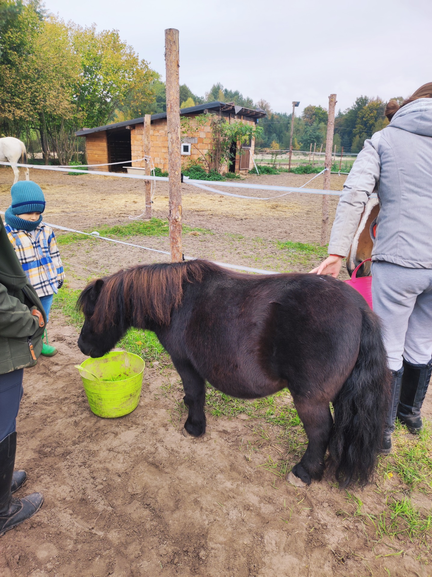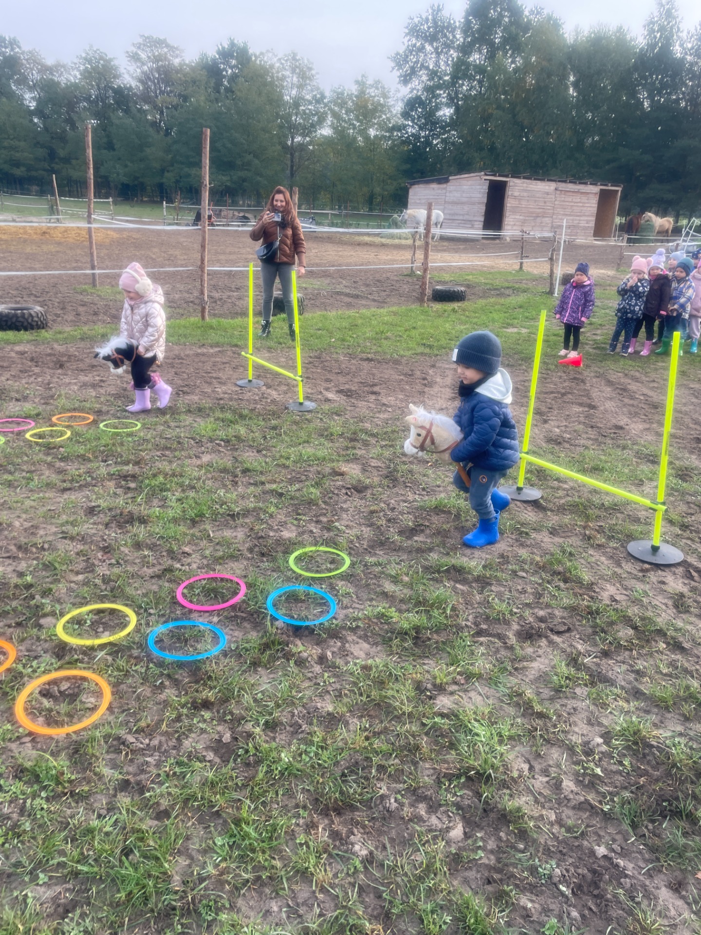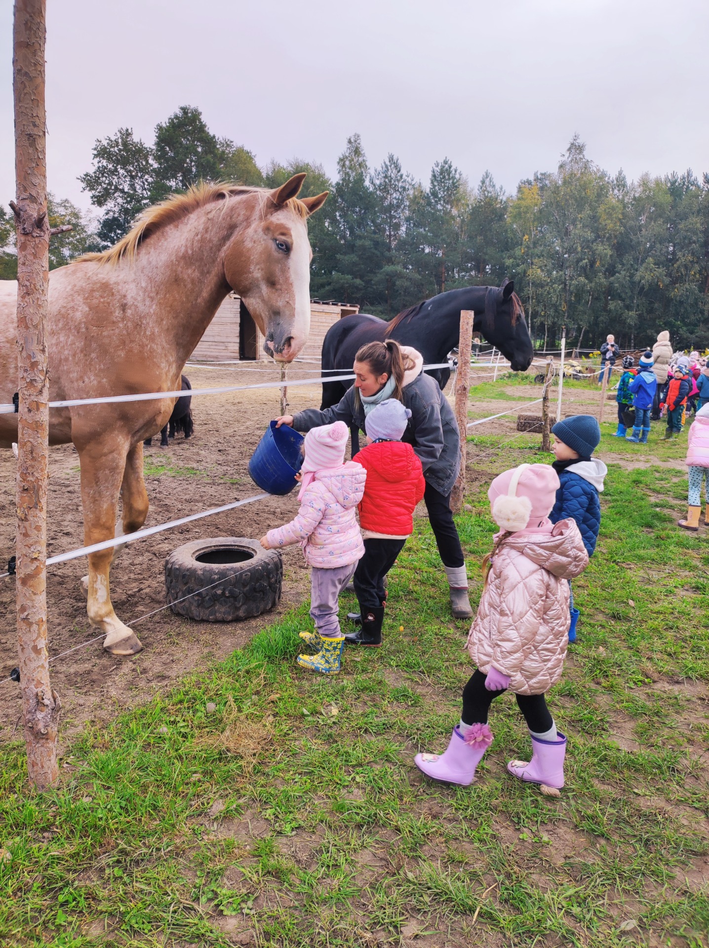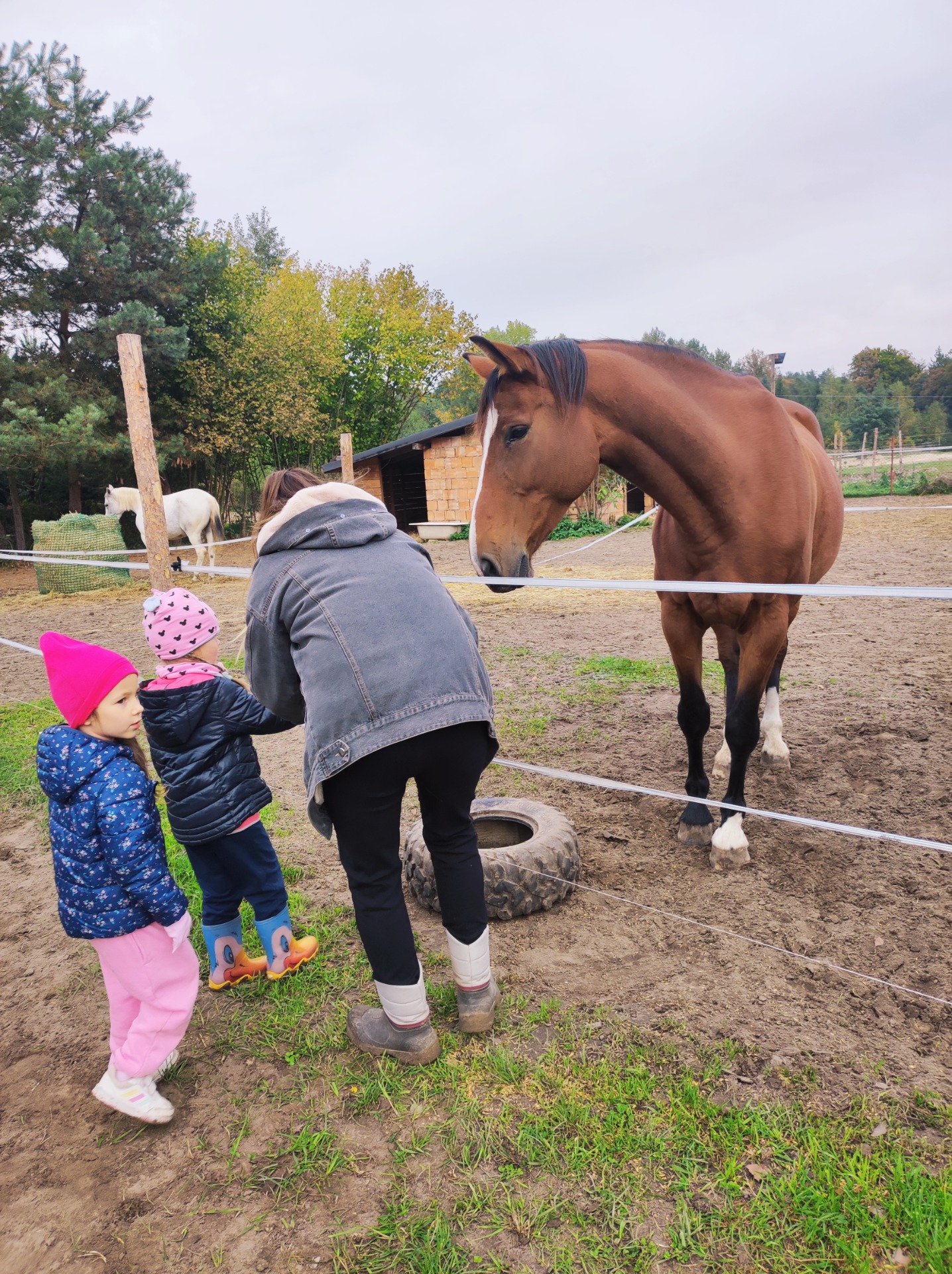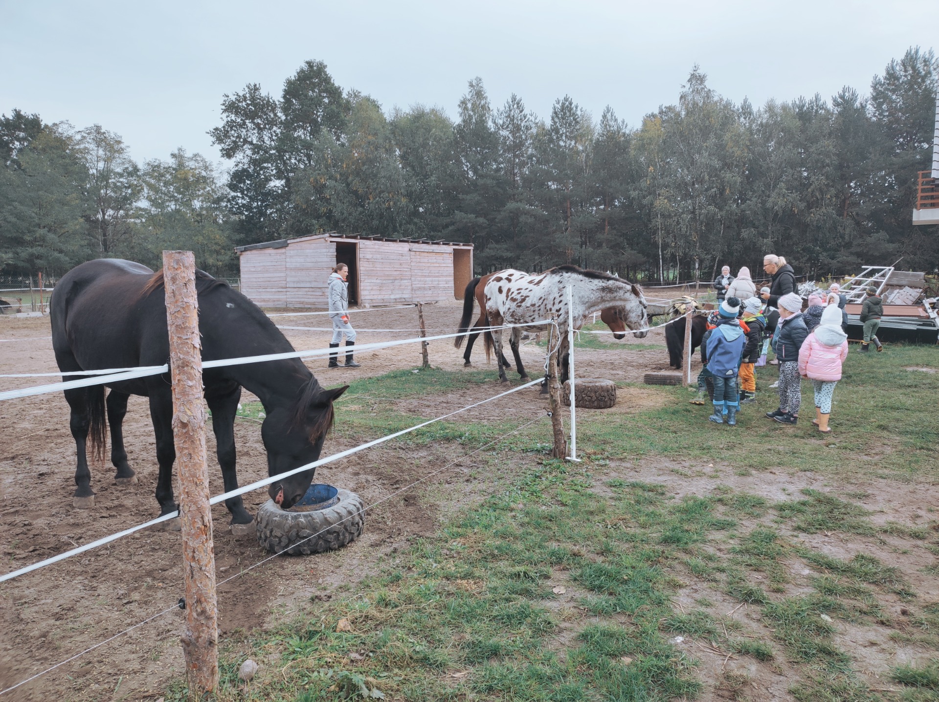 19 października grupa Podróżników odwiedziła Stajnię Freedom w Dąbrówce Wielkiej. Pani Kamila serdecznie przywitała przedszkolaków i oprowadziła po stajni. Dzieci dowiedziały się co to jest kupaczka (narzędzia do zbierania końskich odchodów) , lizawka (sól którą liżą konie), poidło oraz co lubią jeść konie:)) Chętni Podróżnicy wyczesali oraz pogłaskali konia Doratkę, kucyka Basię, a niektórzy nawet odważyli się wsiąść i obejść małą rundkę na Doratce i Chmurce. Nie zabrakło również aktywności ruchowej… dzieci pokonały przygotowany tor przeszkód w ramach sportowej rywalizacji "Hobby Horse" . Na koniec dzieci wybrały się na pastwisko po trawę dla koni, do którego prowadziła krótka leśna ścieżka. Ponadto mieszkańcami gospodarstwa były króliki, kaczki oraz gęsi, które również zostały nakarmione. To była prawdziwa końska dawka przygody!!:))