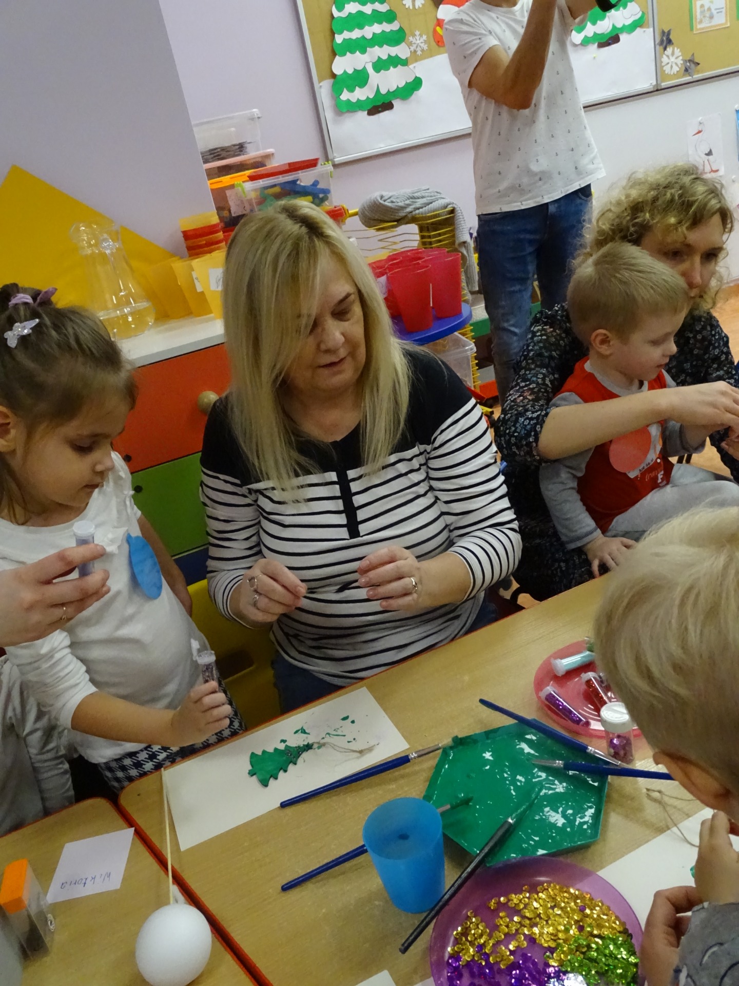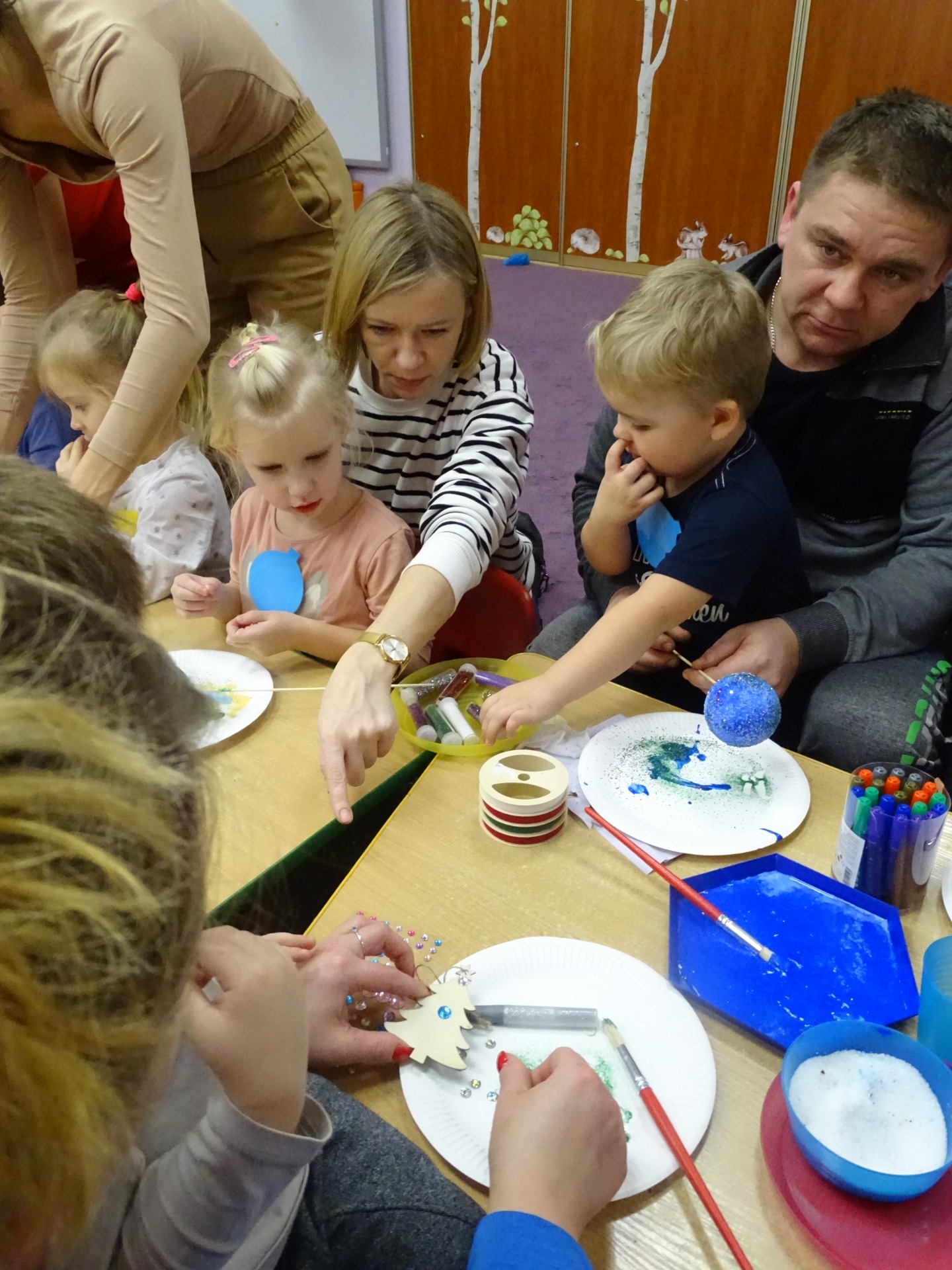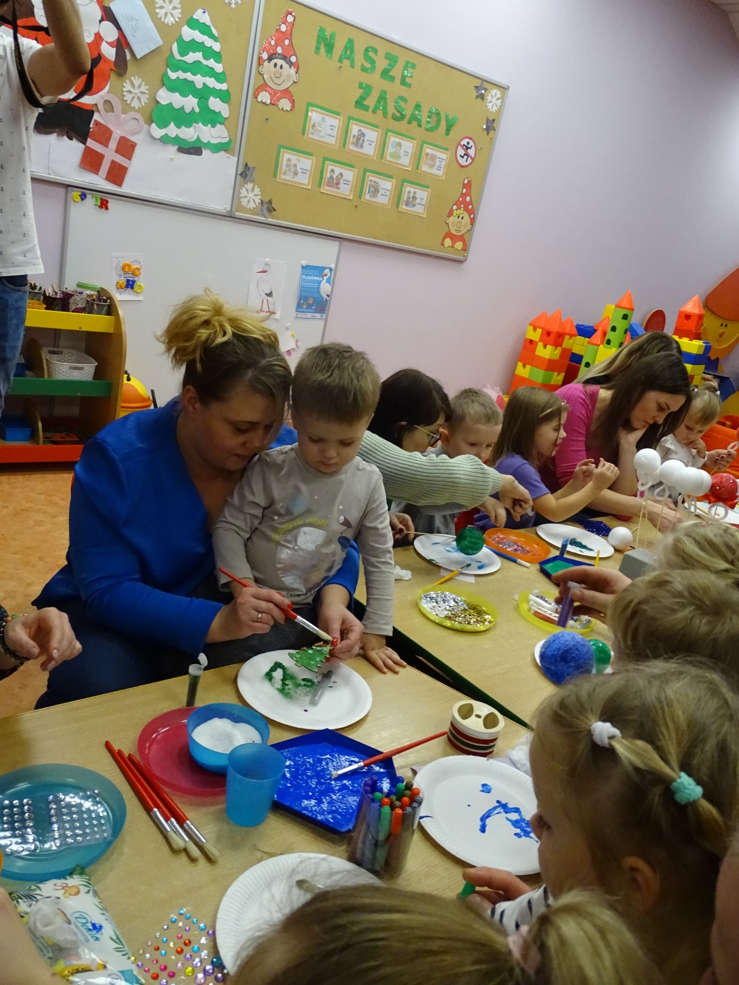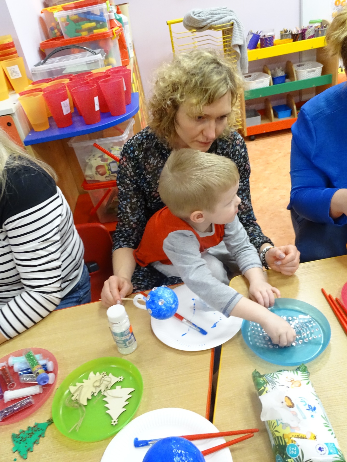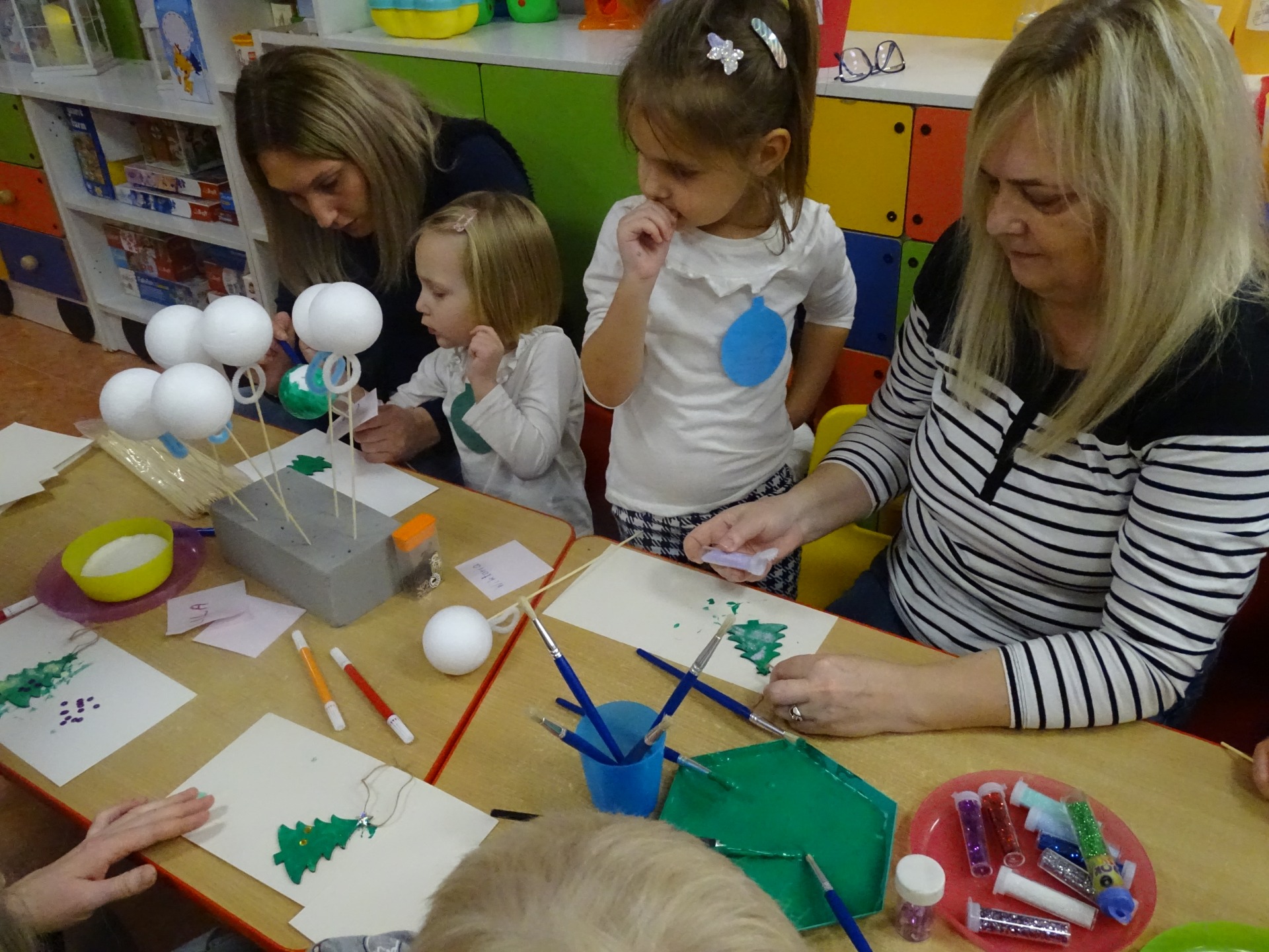 W dniu 13 grudnia dzieci i rodzice z grupy Krasnale spotkali się, by wspólnie bawić się w świątecznej atmosferze. Częścią zajęć były warsztaty plastyczne. Każde dziecko wykonało z pomocą rodzica choinkowe ozdoby. Był to bardzo miło spędzony czas.