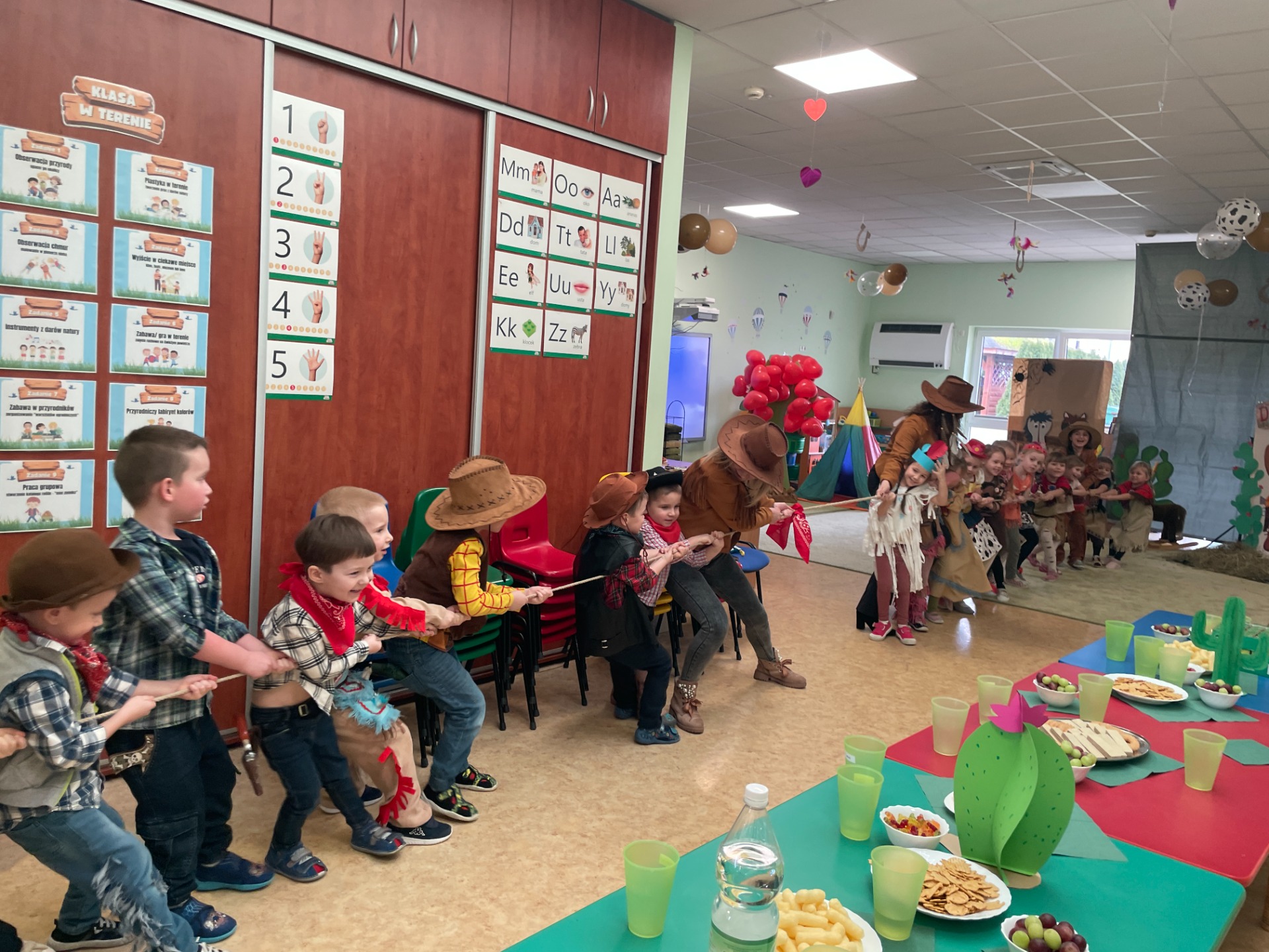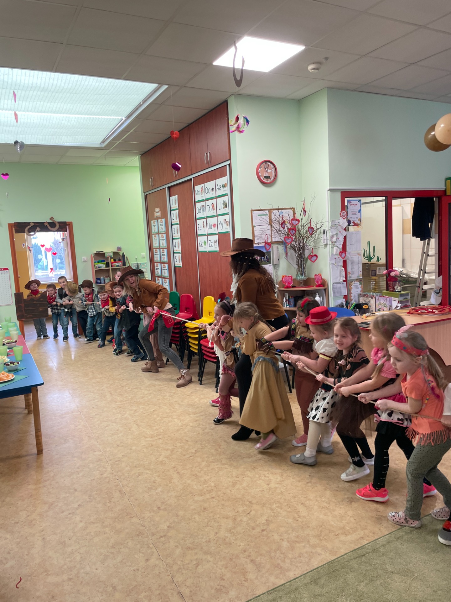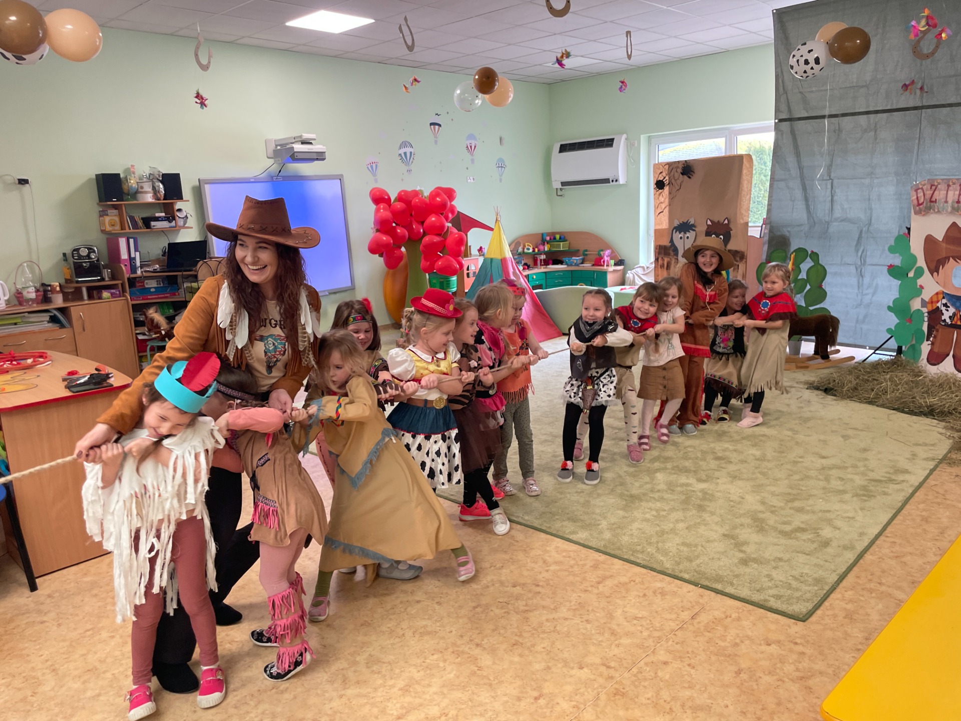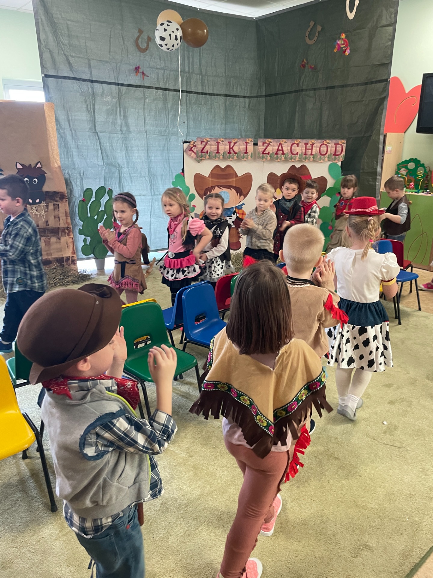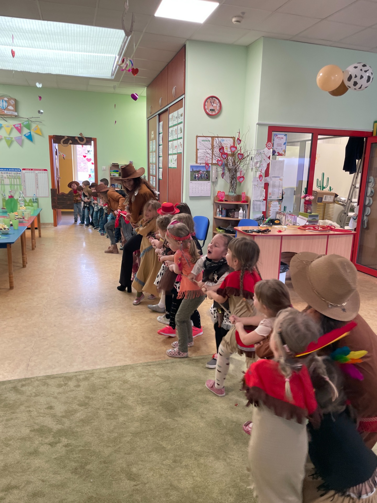 Karnawa艂 to czas pe艂en rado艣ci i zabaw, a jego najbardziej oczekiwanym dniem jest Bal Karnawa艂owy. 13.02.2024r.dzieci z grupy Podr贸偶nik贸w przenios艂y si臋 na Dziki Zach贸d馃, gdzie odbywa艂 si臋 tegoroczny bal pod takim has艂em. Zabawy i konkursy by艂y tematycznie zwi膮zane z Dzikim Zachodem. Natomiast muzyka wprawia艂a w taneczny nastr贸j dzieci oraz ciocie kowbojki. Wszystkie Indianki, Indianie, Kowbojki, Kowboje i Szeryfowie bawili si臋 znakomicie. Podczas przerwy dzieci otrzyma艂y soki oraz s艂odko艣ci, aby zregenerowa膰 si艂y. Bal by艂 udany, a dzieci zadowolone. Z niecierpliwo艣ci膮 czekamy na nast臋pny rok!