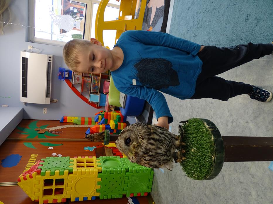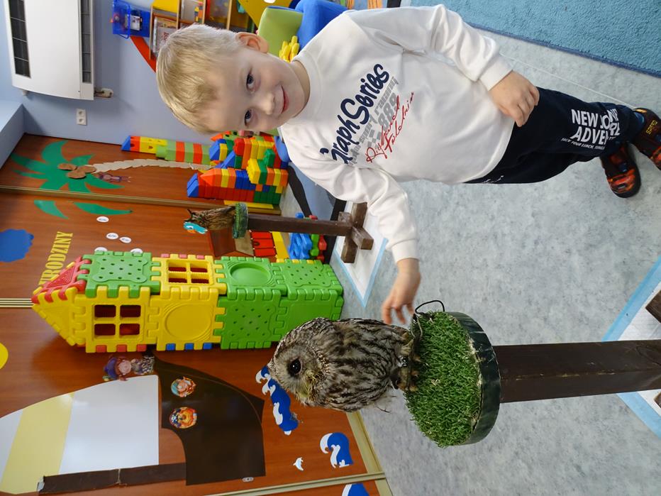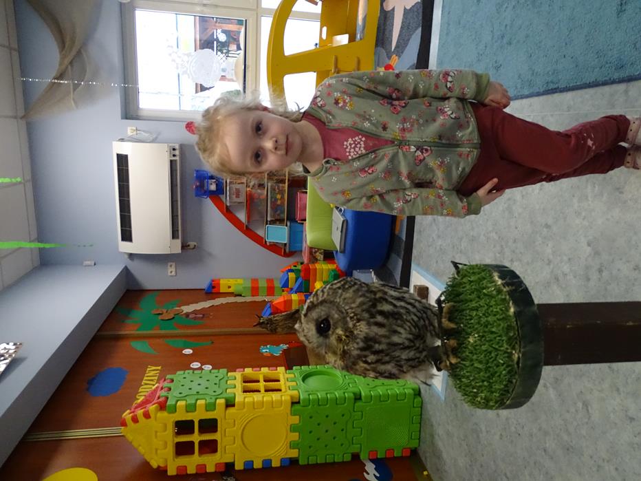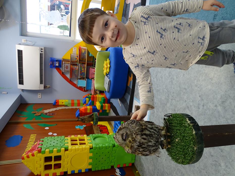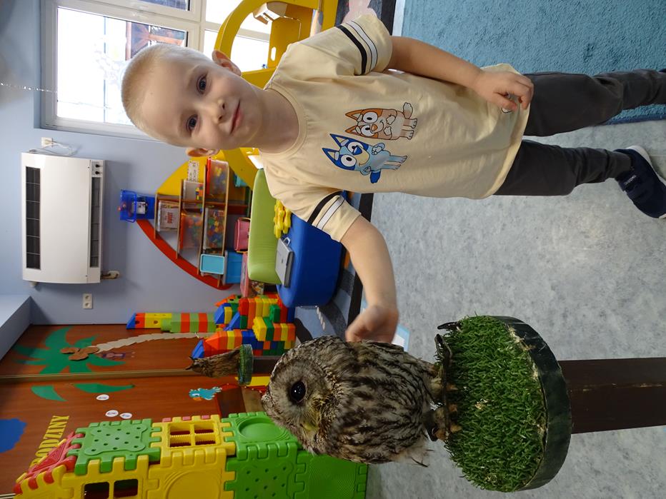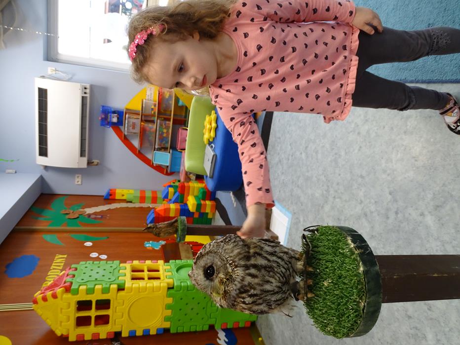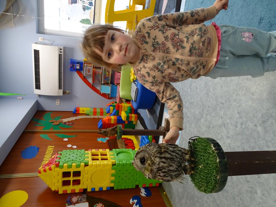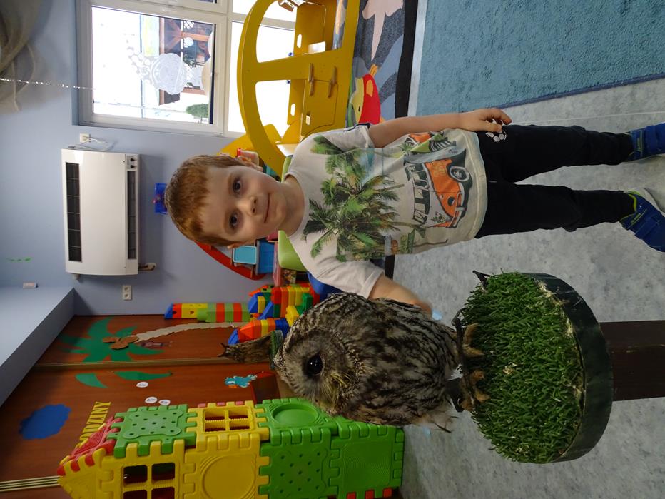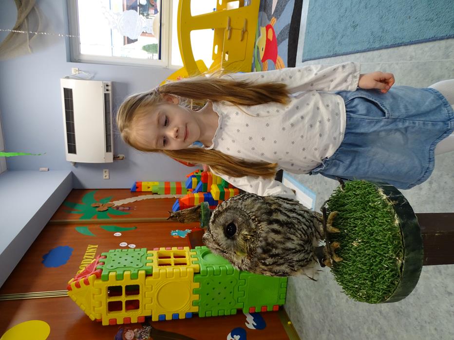 28 lutego w przedszkolu zjawili się niezwykli goście-sowa, puszczyk i płomykówka. Podczas „Odlotowego pokazu” dzieci dowiedziały się min. co lubią jeść, gdzie mieszkają, że latają bezszelestnie i jak można się nimi opiekować. Poznały podział ptaków na: nocne i dzienne, a także ze względu na wielkość: małe, średnie i duże. Jako ciekawostkę prowadzący powiedział, że duża sowa upoluje nawet sarenkę, czy lisa. Jest w stanie unieść łup ważący 18 kg. Po krótkiej prelekcji dzieci miały okazję dotknąć sówkę i zrobić sobie z nią pamiątkowe zdjęcie.