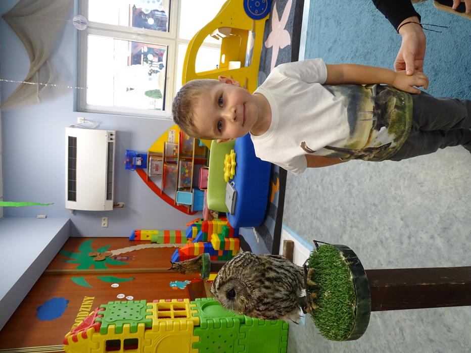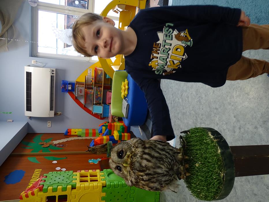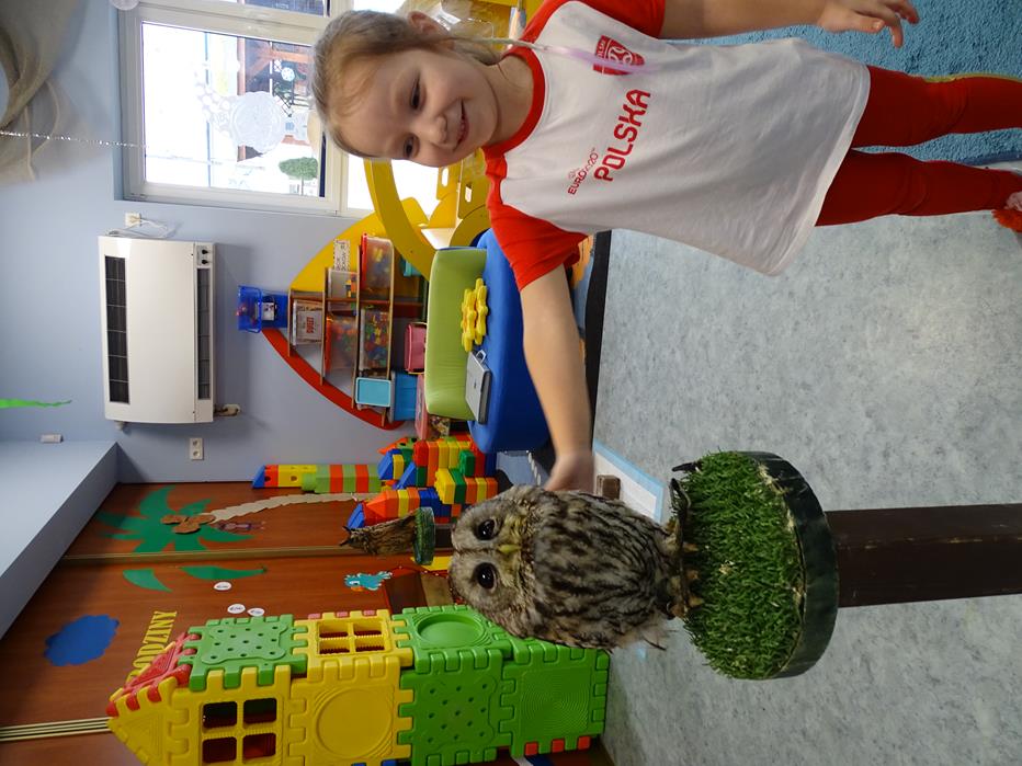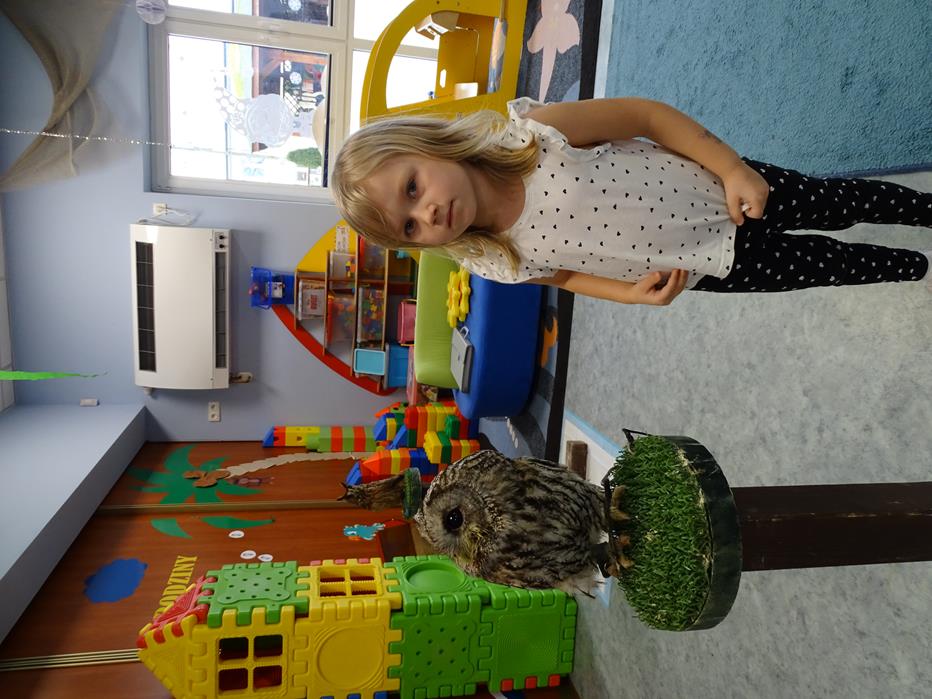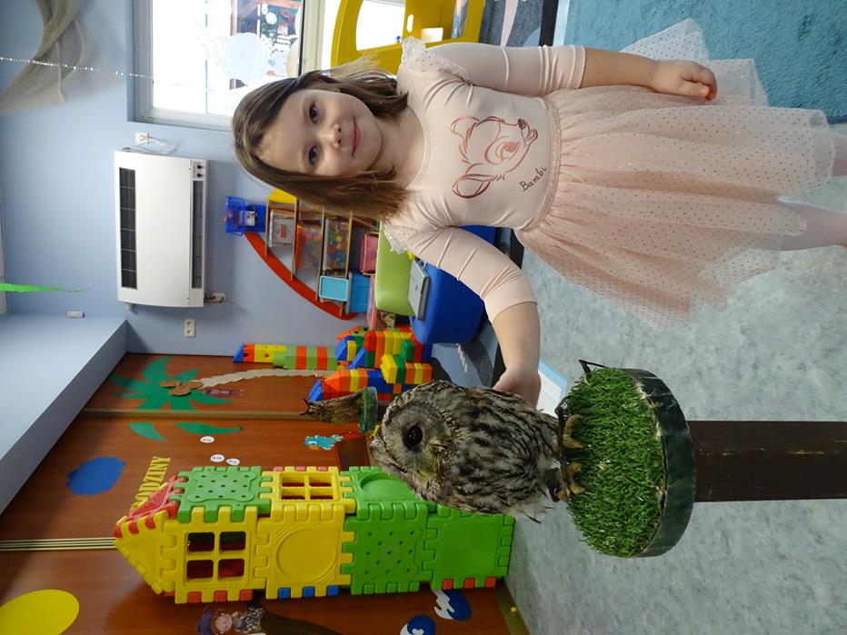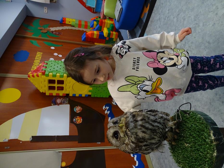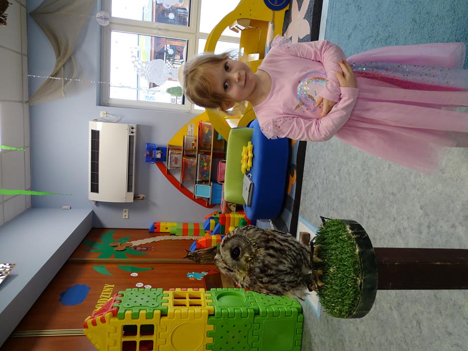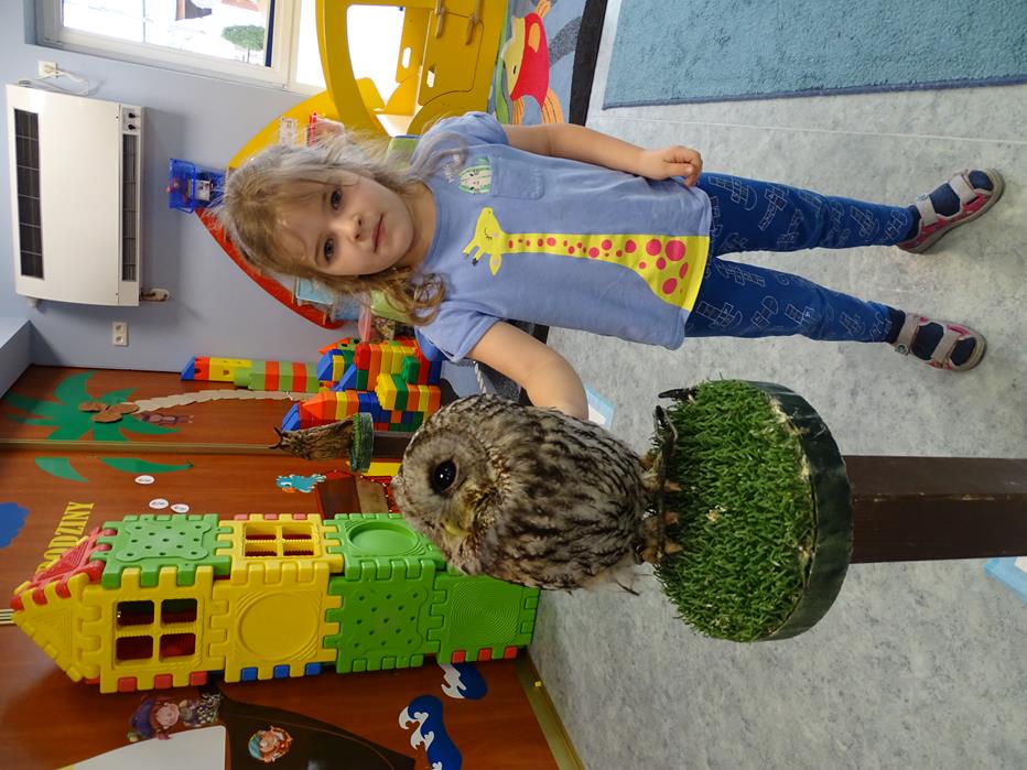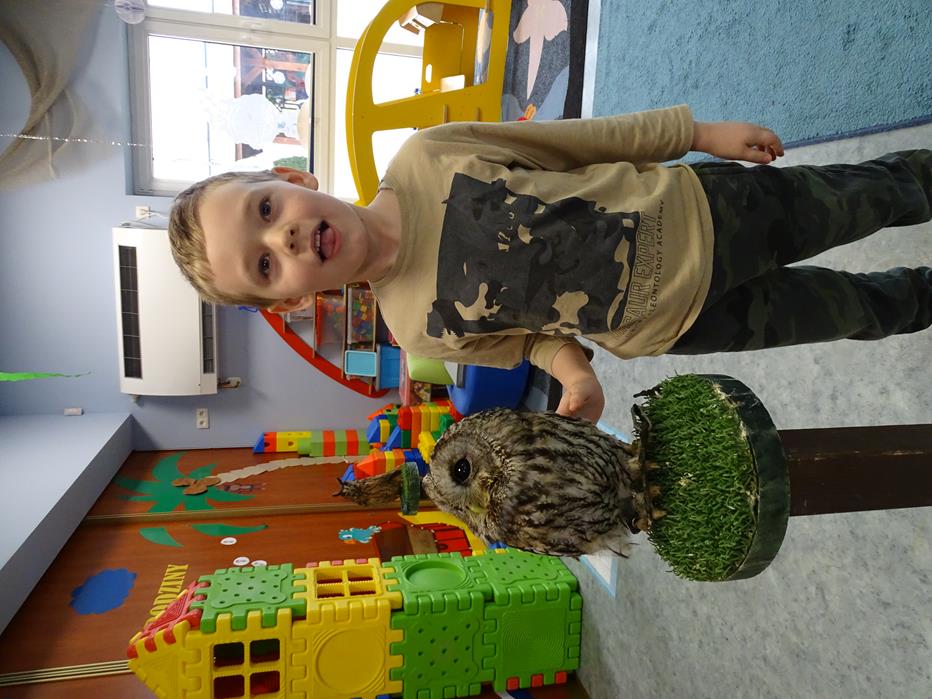 28 lutego w przedszkolu zjawili się niezwykli goście-sowa, puszczyk i płomykówka. Podczas „Odlotowego pokazu” dzieci dowiedziały się min. co lubią jeść, gdzie mieszkają, że latają bezszelestnie i jak można się nimi opiekować. Poznały podział ptaków na: nocne i dzienne, a także ze względu na wielkość: małe, średnie i duże. Jako ciekawostkę prowadzący powiedział, że duża sowa upoluje nawet sarenkę, czy lisa. Jest w stanie unieść łup ważący 18 kg. Po krótkiej prelekcji dzieci miały okazję dotknąć sówkę i zrobić sobie z nią pamiątkowe zdjęcie.