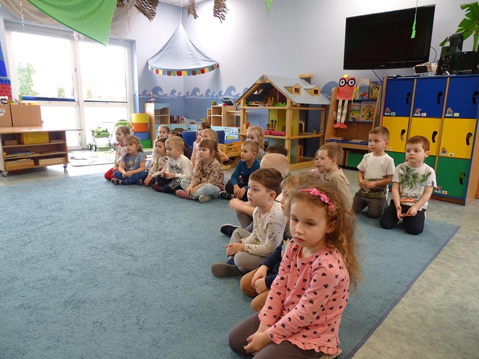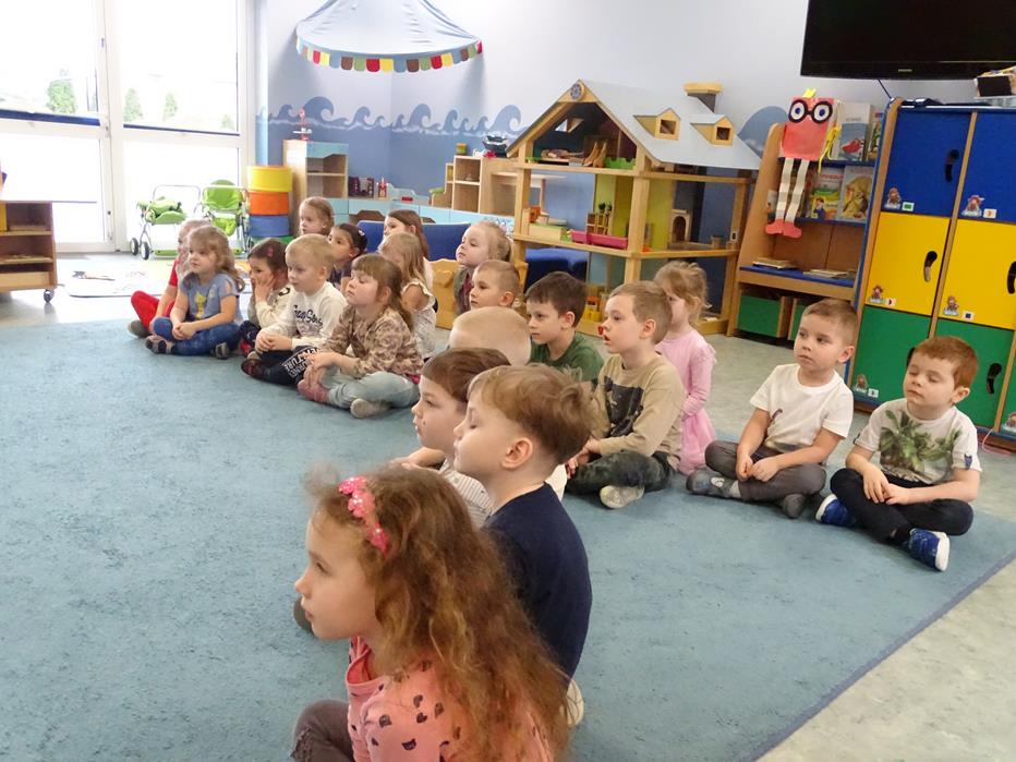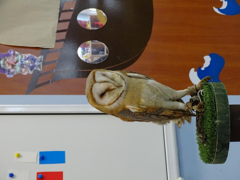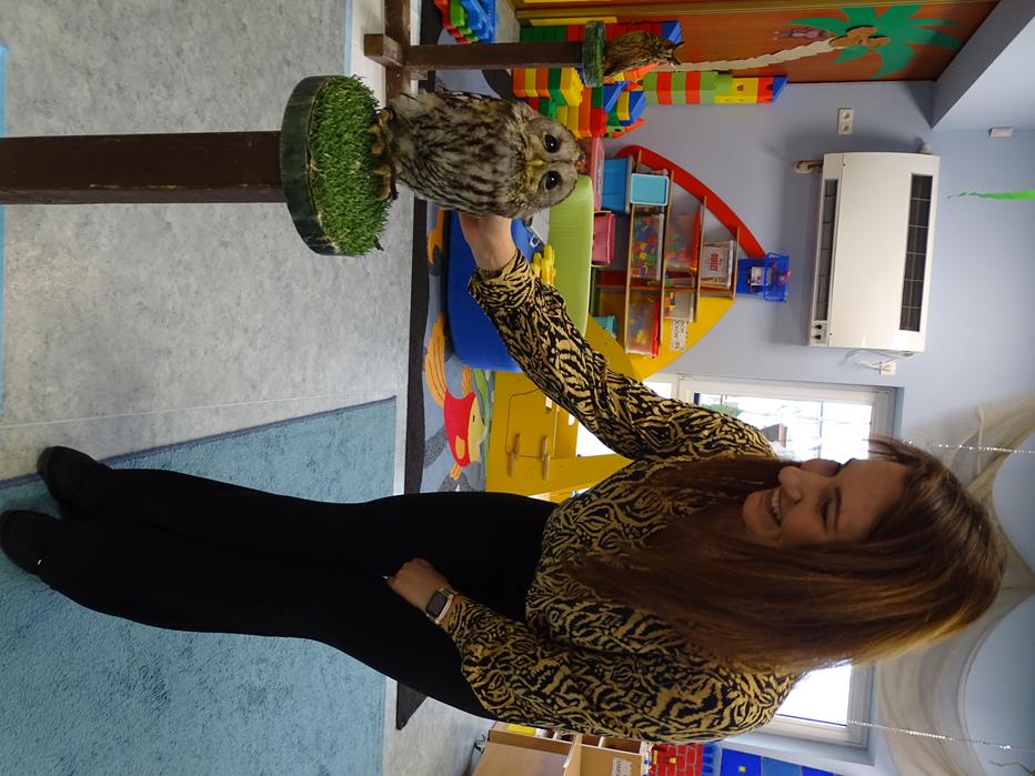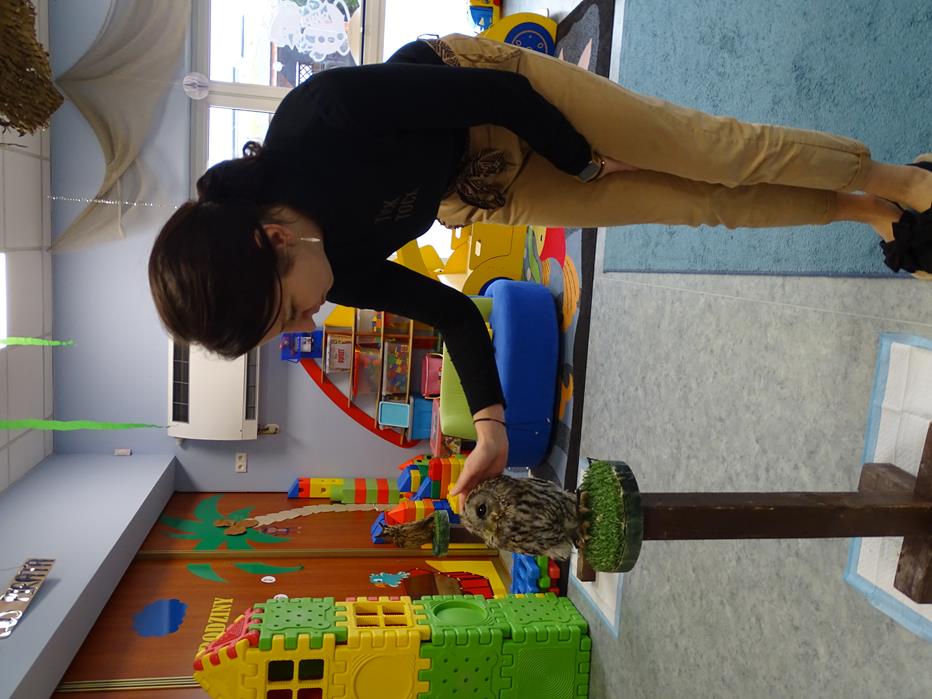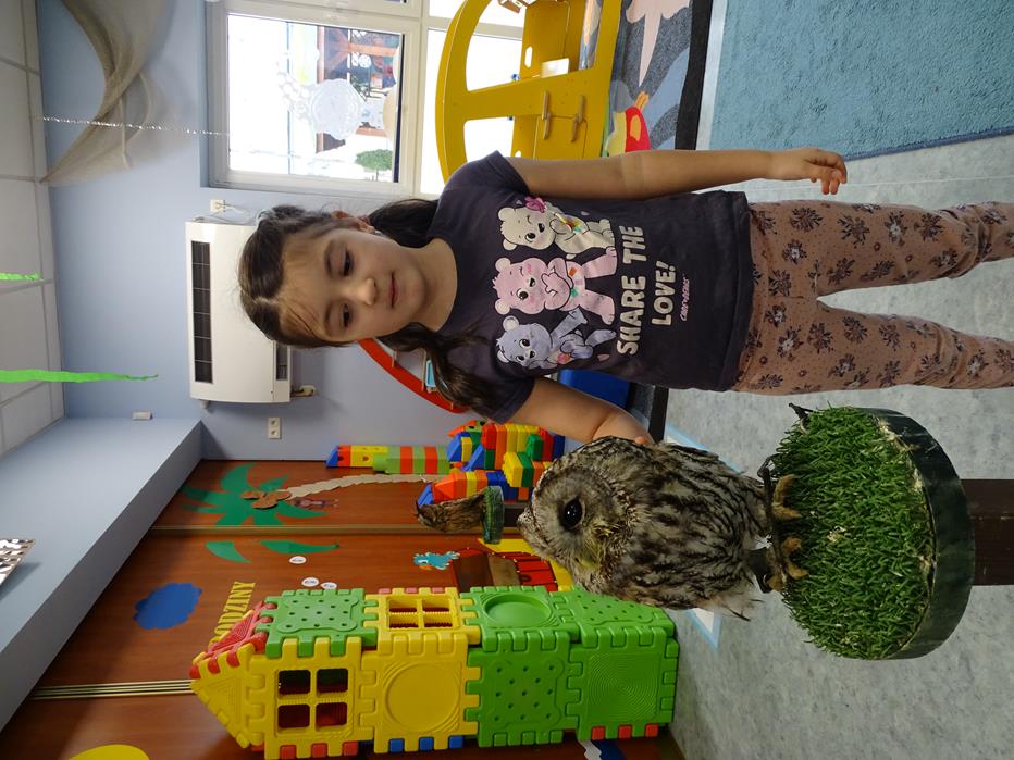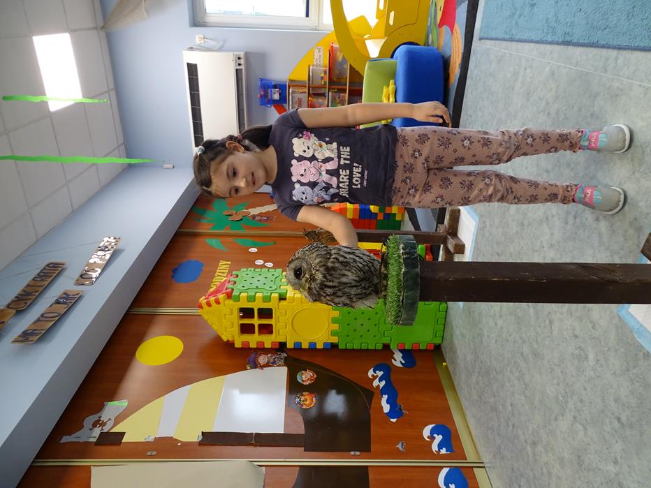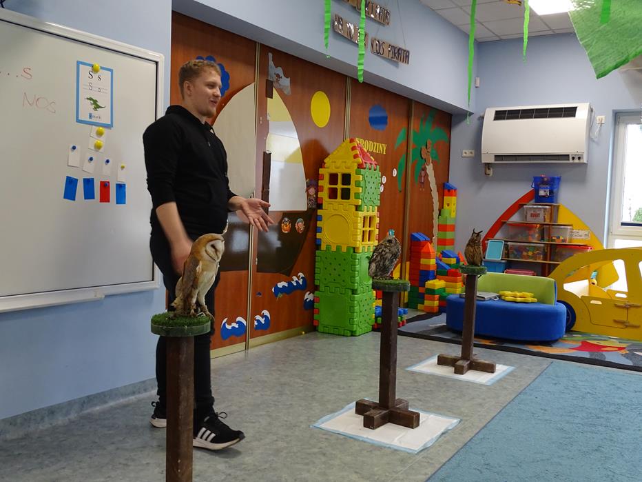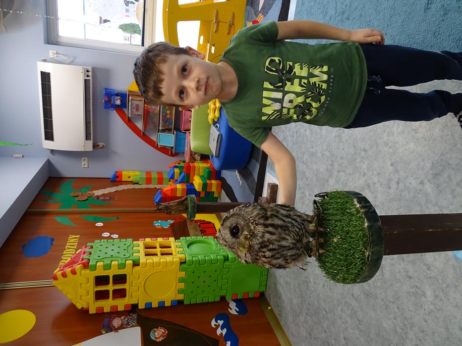 28 lutego w przedszkolu zjawili się niezwykli goście-sowa, puszczyk i płomykówka. Podczas „Odlotowego pokazu” dzieci dowiedziały się min. co lubią jeść, gdzie mieszkają, że latają bezszelestnie i jak można się nimi opiekować. Poznały podział ptaków na: nocne i dzienne, a także ze względu na wielkość: małe, średnie i duże. Jako ciekawostkę prowadzący powiedział, że duża sowa upoluje nawet sarenkę, czy lisa. Jest w stanie unieść łup ważący 18 kg. Po krótkiej prelekcji dzieci miały okazję dotknąć sówkę i zrobić sobie z nią pamiątkowe zdjęcie.