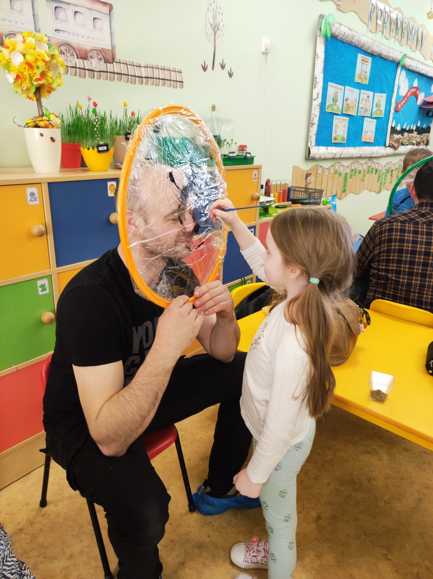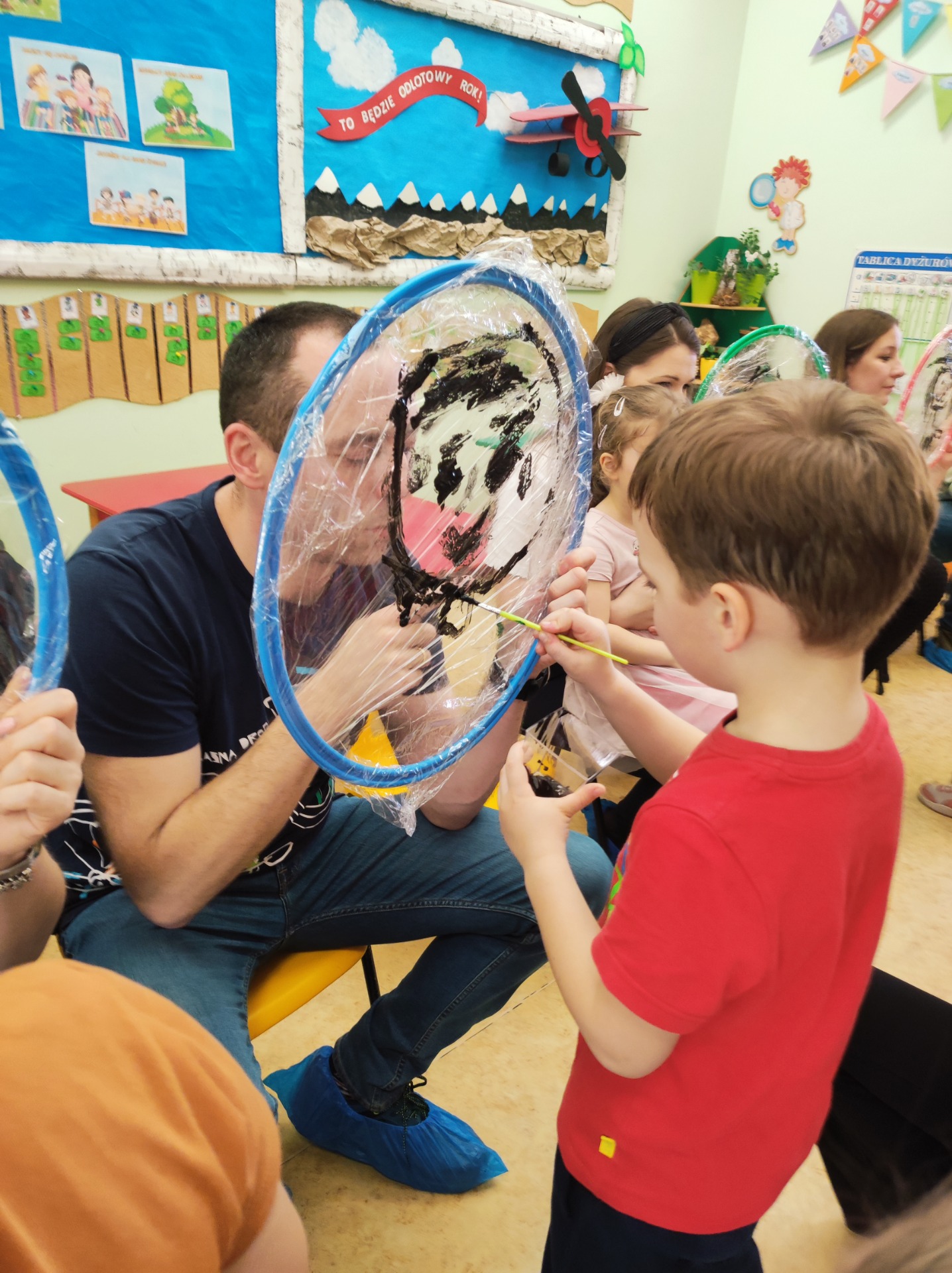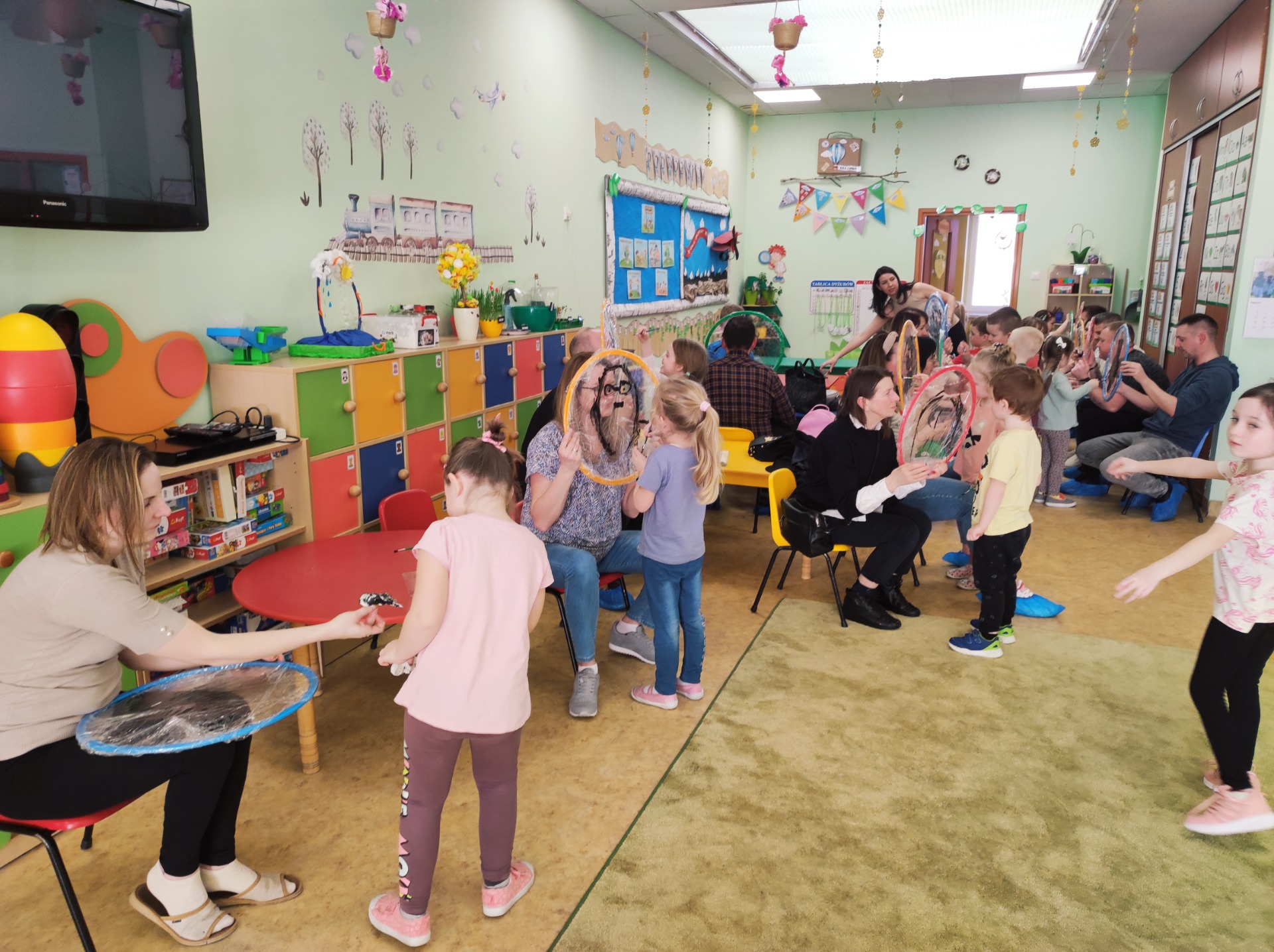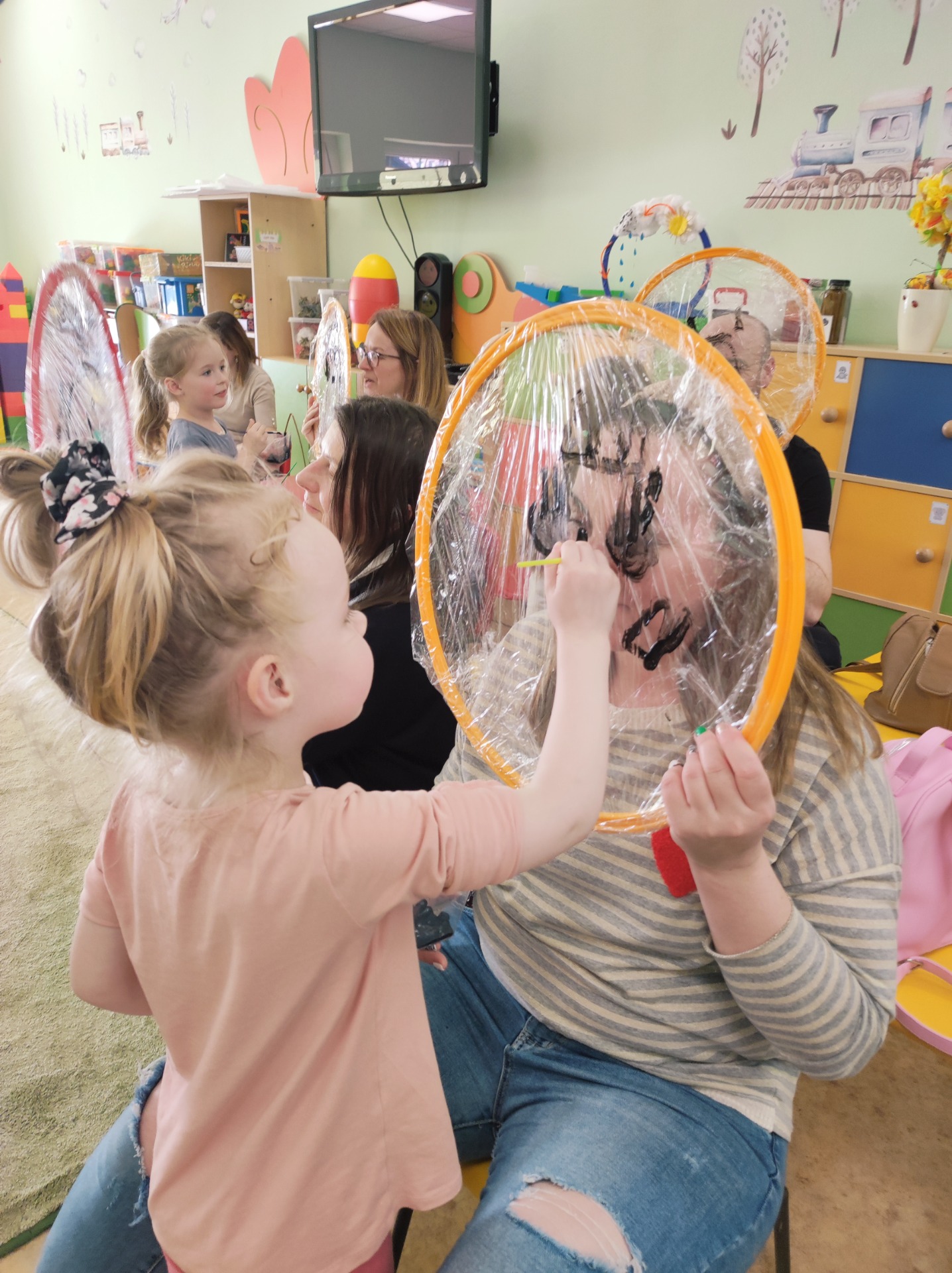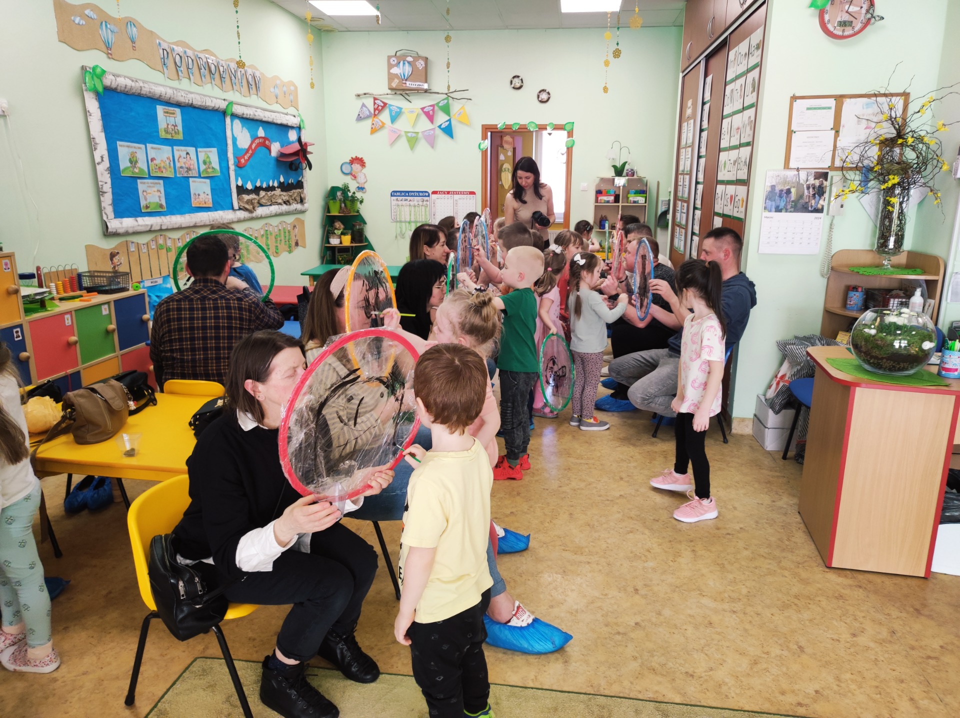 26 marca w grupie Podróżników odbyło się spotkanie świąteczne z rodzicami. Dzieci z niecierpliwością czekały godz.15.00, aby powitać swoich rodziców i wspólnie spędzić z nimi popołudnie w przedszkolu. Na samym początku, dzieci wybierały karty przedstawiające symbole wielkanocne, które wybieramy do koszyczka wielkanocnego. Później każdy z nich musiał skompletować swój koszyczek i odnaleźć 9 różnych elementów. Rodzice czujnie nadzorowali działanie dzieci 😊 Rozmawialiśmy również jakie czynności wykonujemy w okresie przedświątecznym… oczywiście dzieci świetnie wykazały się tą wiedzą 😊 Zbliżające się święta to gorący czas🔥 czas sprzątania oraz gotowania. Tak więc i my imitowaliśmy to w naszej sali, a pomogła nam w tym zabawa „Praczka” oraz zabawa Klanzy „Ciasto”. Dzieci miały okazję również wcielić się w rolę mamy i ubijały pianę z białek😁 Na zakończenie dzieci mogły wykazać się swoimi zdolnościami plastycznymi i wykonać portret swojego rodzica. A pomogła im w tym obręcz owinięta folią stretch. To było bardzo wesołe i miłe popołudnie 😊