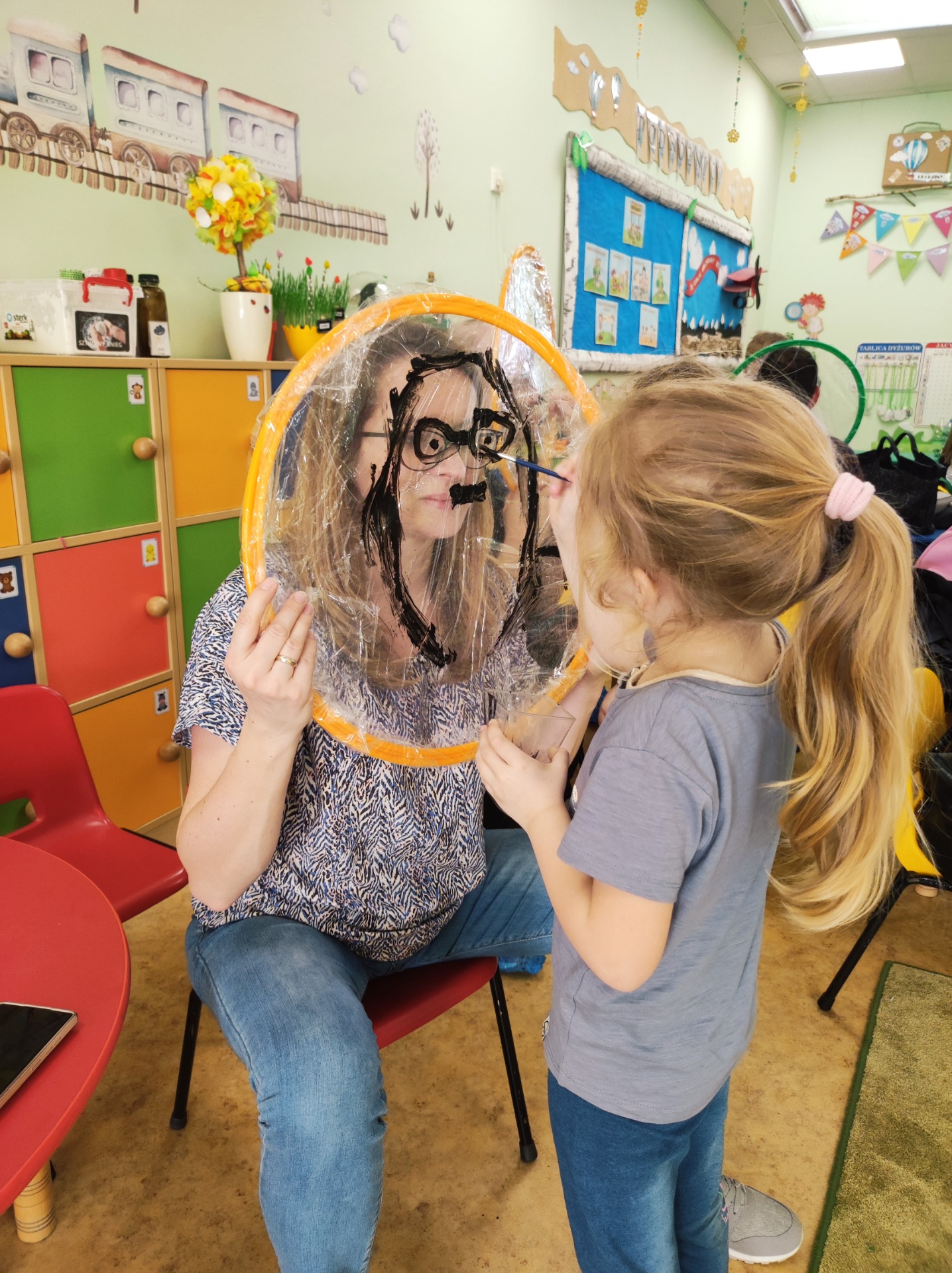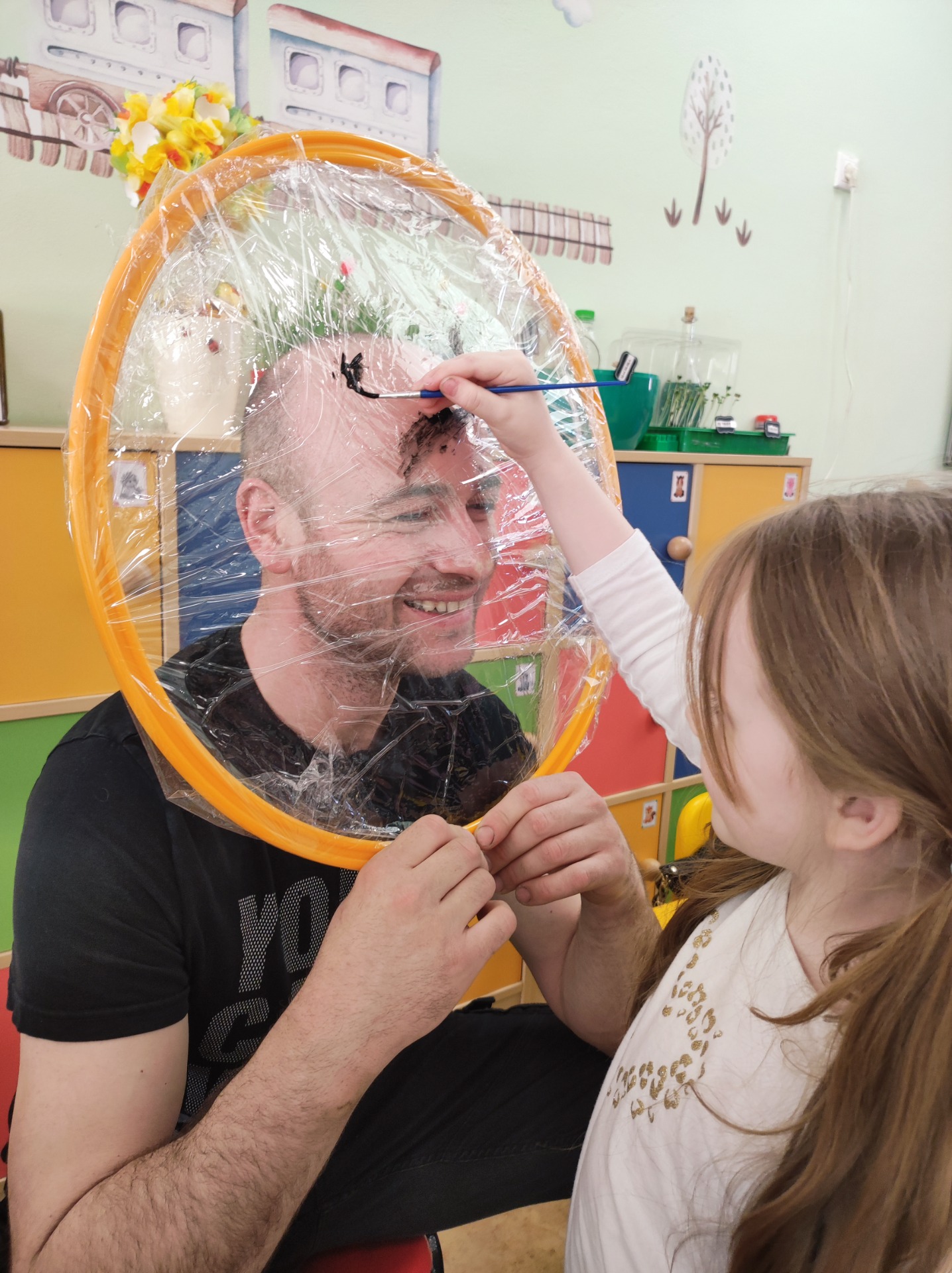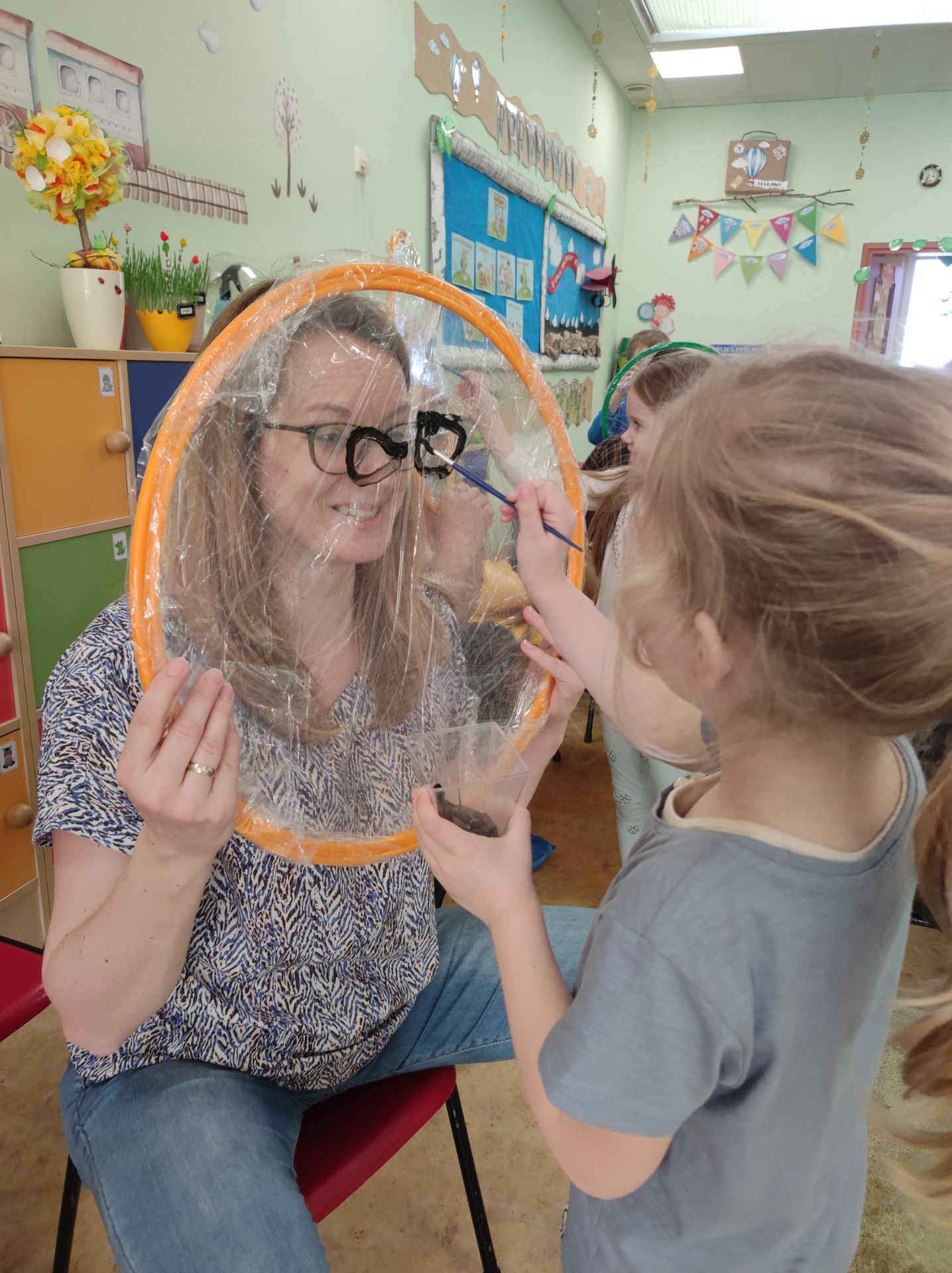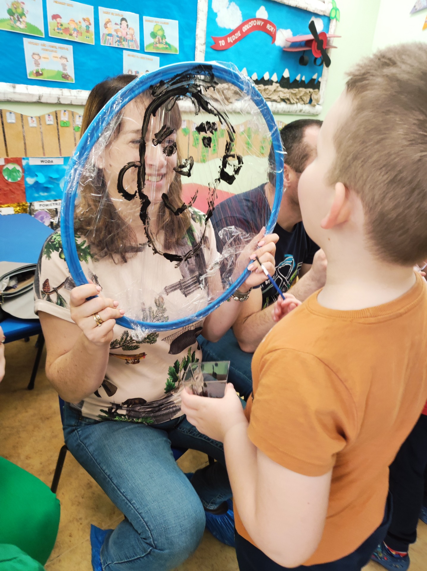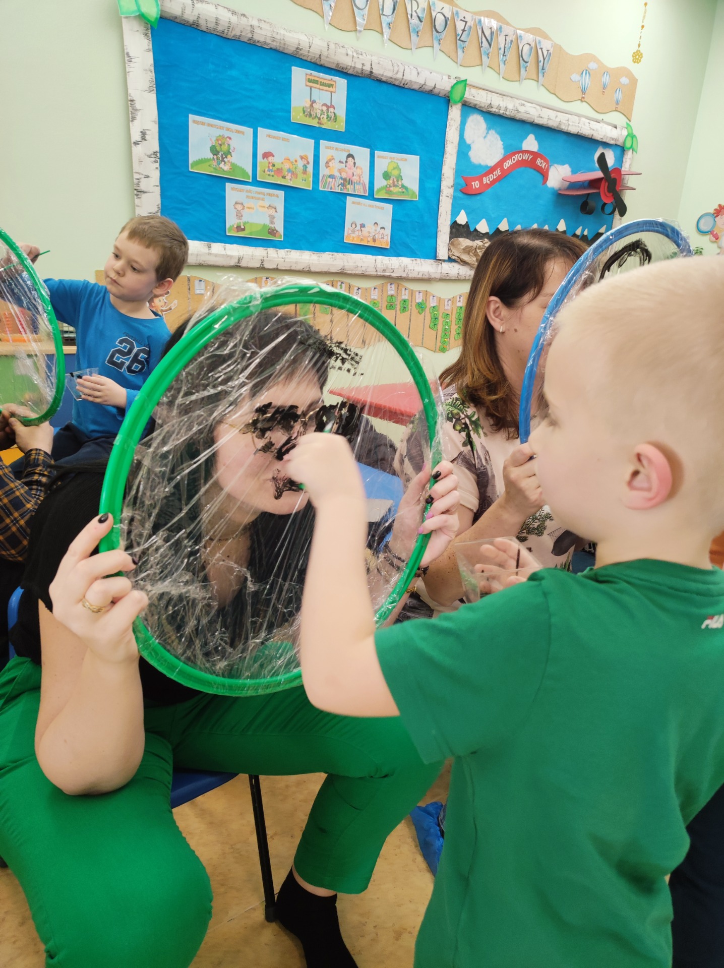 26 marca w grupie Podróżników odbyło się spotkanie świąteczne z rodzicami. Dzieci z niecierpliwością czekały godz.15.00, aby powitać swoich rodziców i wspólnie spędzić z nimi popołudnie w przedszkolu. Na samym początku, dzieci wybierały karty przedstawiające symbole wielkanocne, które wybieramy do koszyczka wielkanocnego. Później każdy z nich musiał skompletować swój koszyczek i odnaleźć 9 różnych elementów. Rodzice czujnie nadzorowali działanie dzieci 😊 Rozmawialiśmy również jakie czynności wykonujemy w okresie przedświątecznym… oczywiście dzieci świetnie wykazały się tą wiedzą 😊 Zbliżające się święta to gorący czas🔥 czas sprzątania oraz gotowania. Tak więc i my imitowaliśmy to w naszej sali, a pomogła nam w tym zabawa „Praczka” oraz zabawa Klanzy „Ciasto”. Dzieci miały okazję również wcielić się w rolę mamy i ubijały pianę z białek😁 Na zakończenie dzieci mogły wykazać się swoimi zdolnościami plastycznymi i wykonać portret swojego rodzica. A pomogła im w tym obręcz owinięta folią stretch. To było bardzo wesołe i miłe popołudnie 😊